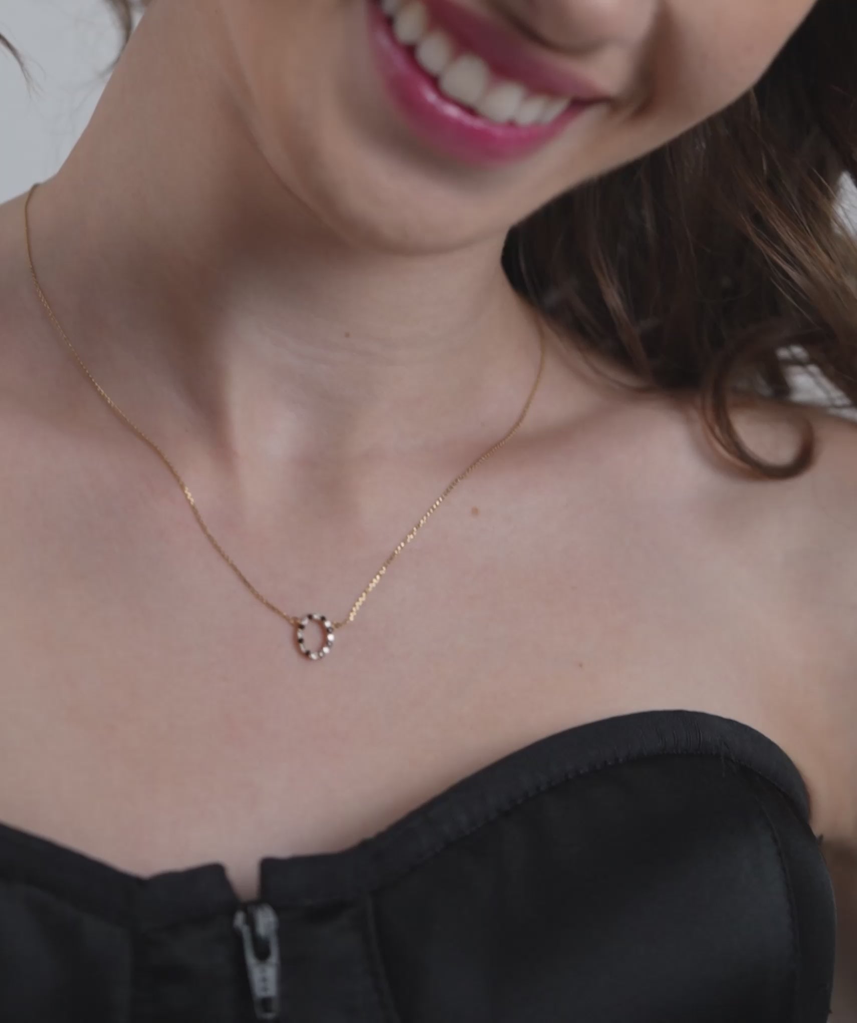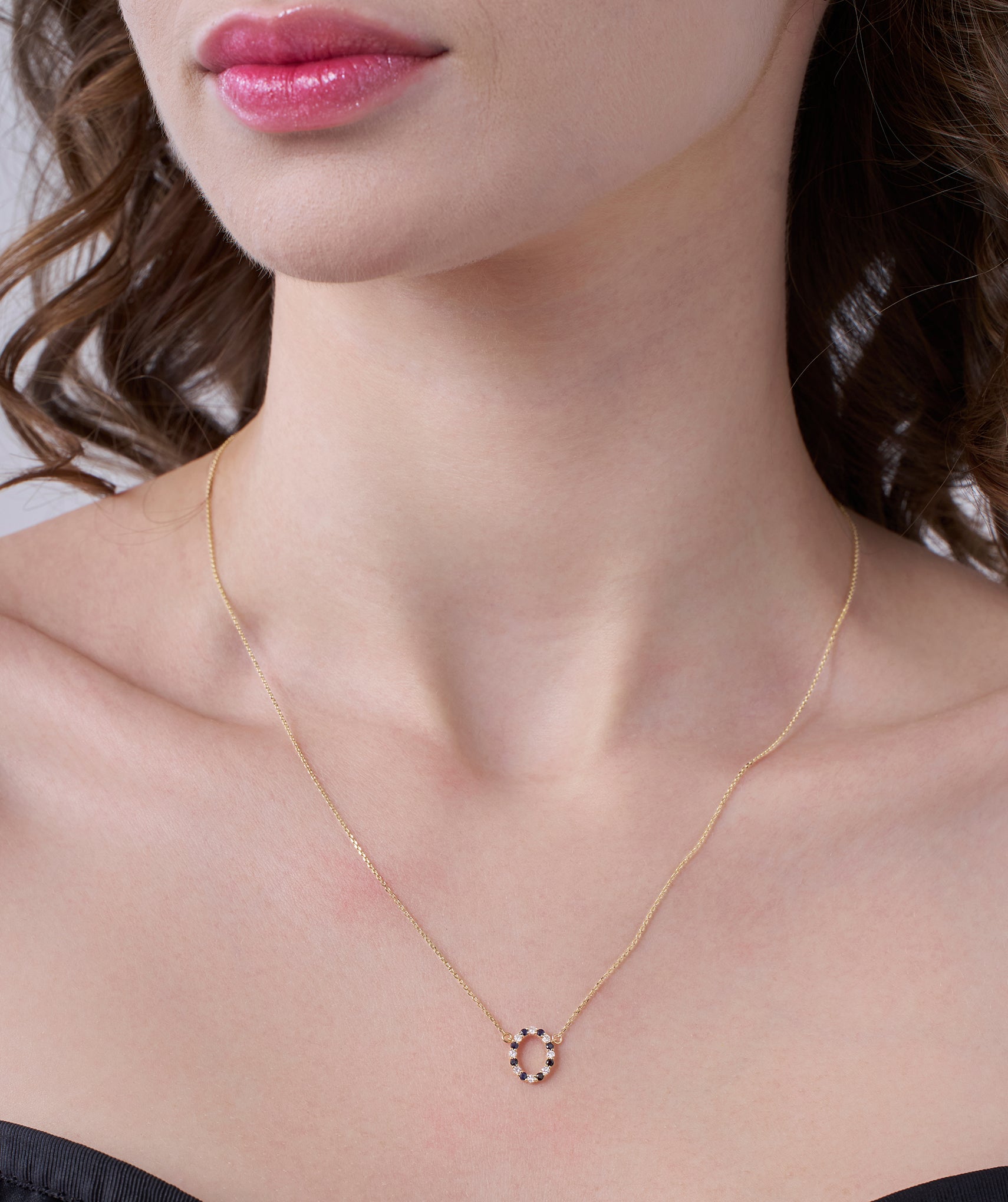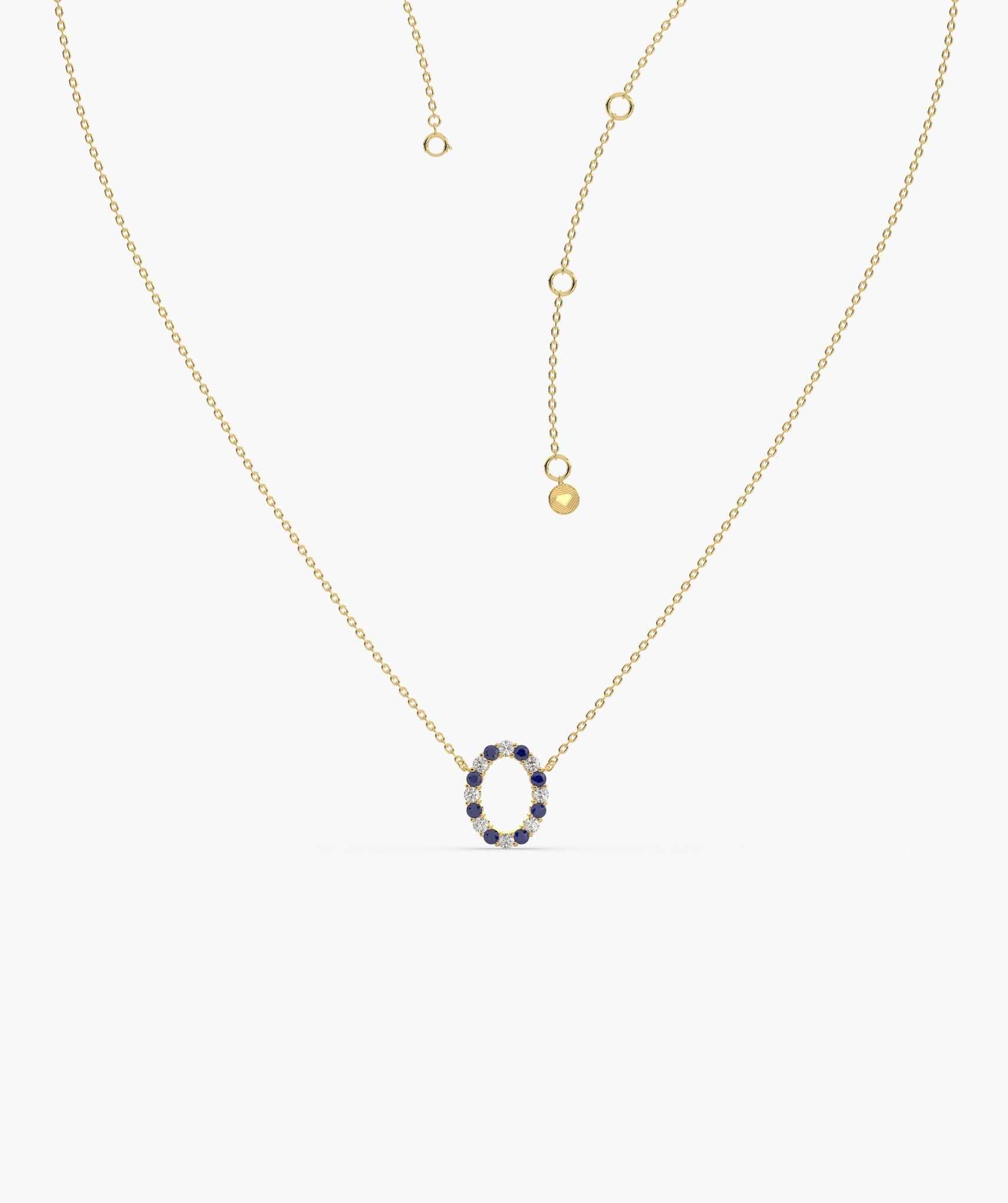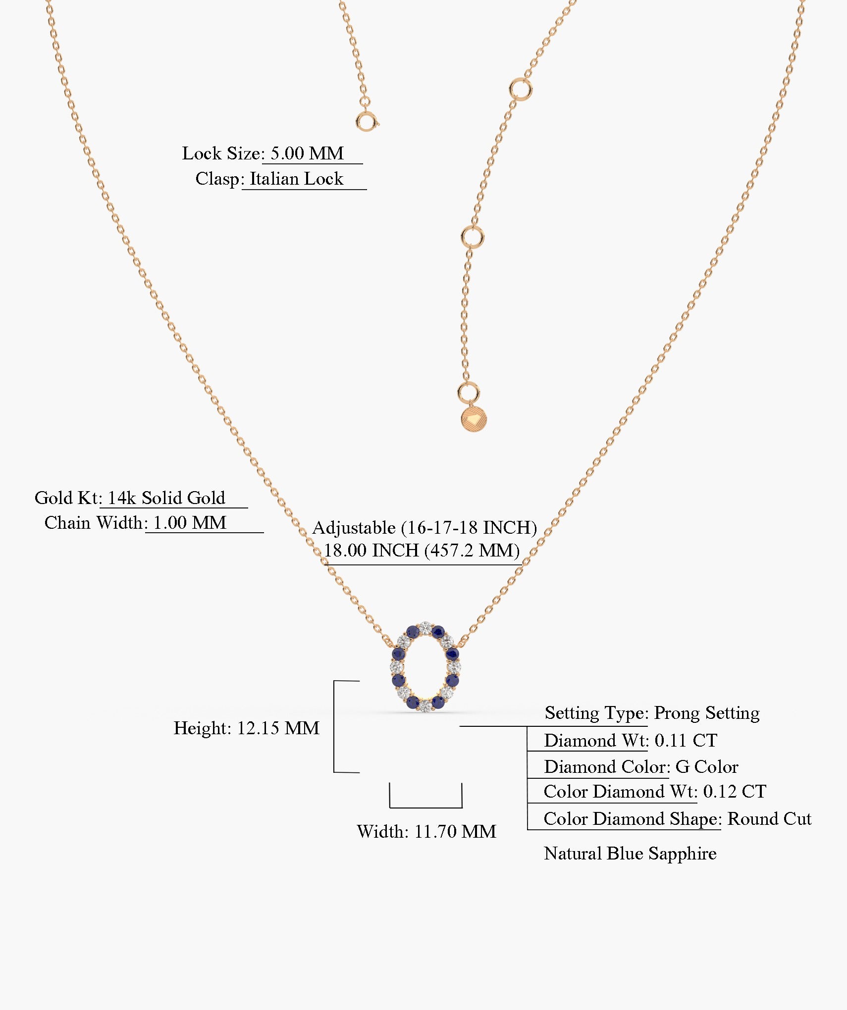 Elegant 14K gold necklace with a circular pendant adorned with alternating sapphires and diamonds, blending classic charm and modern sophistication.