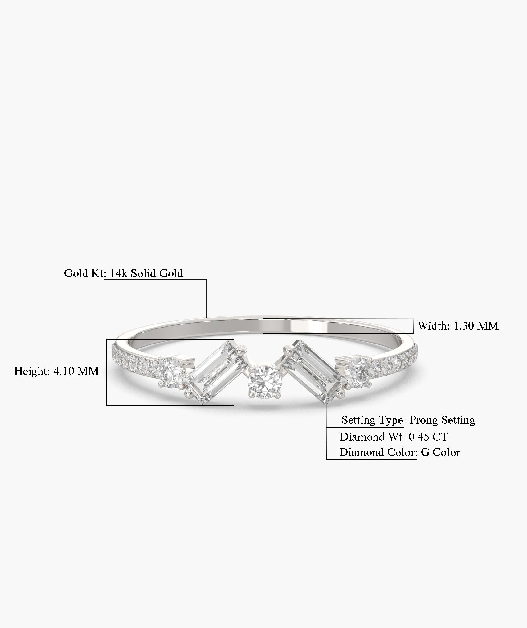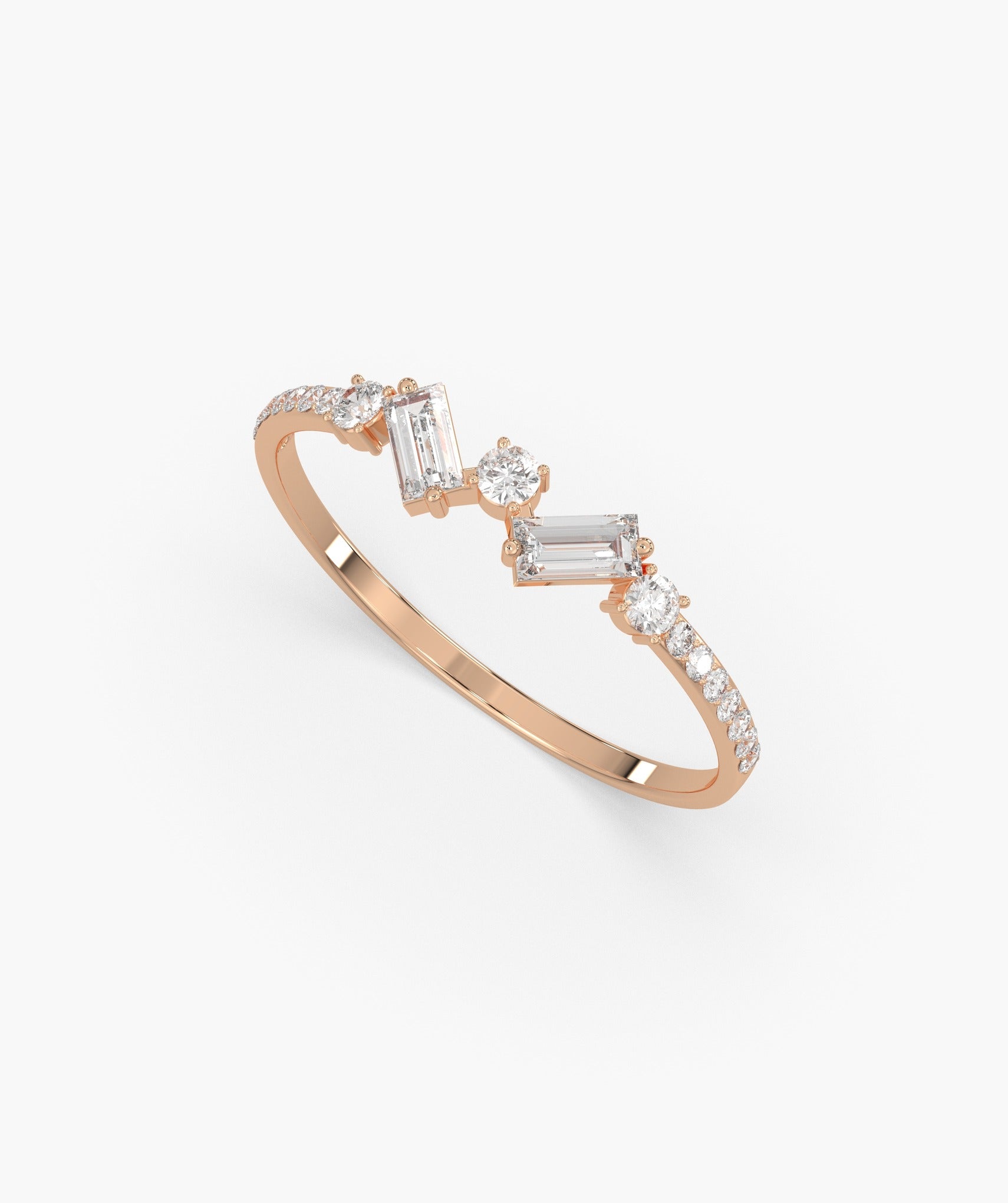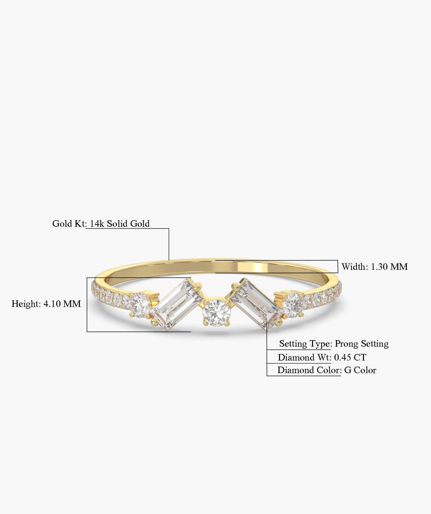 Exude timeless elegance with this 14K solid gold ring, intricately set with alternating baguette and round diamonds.