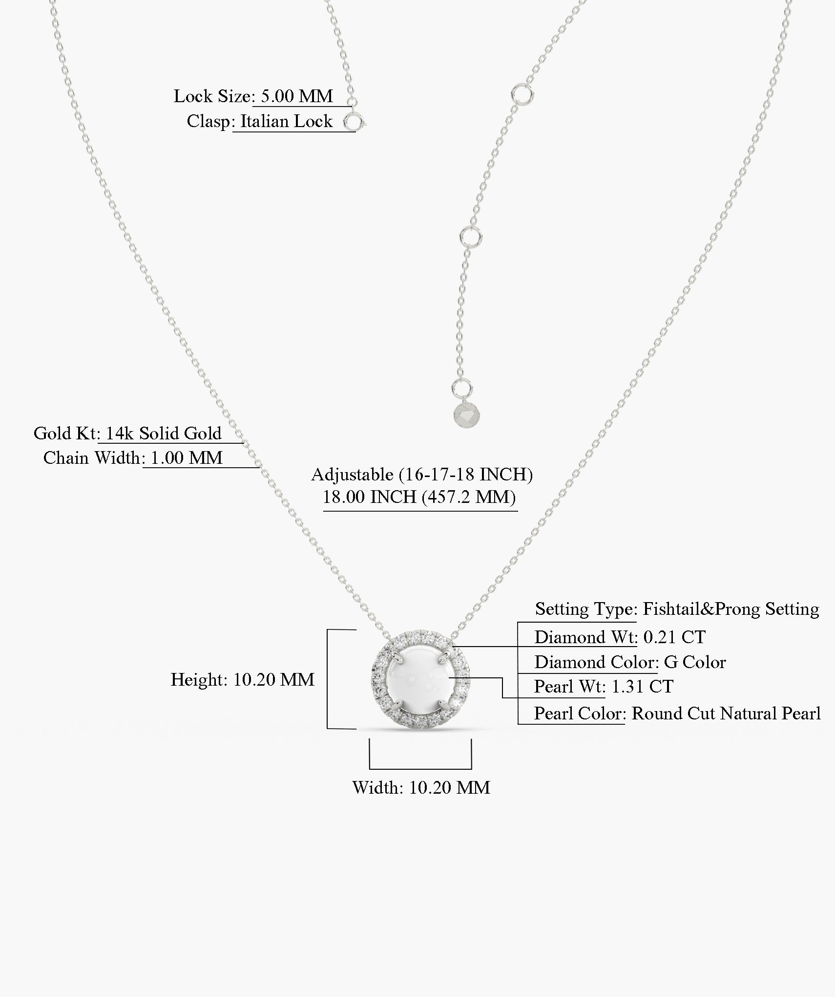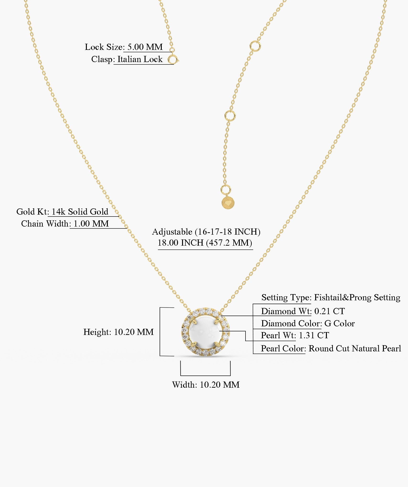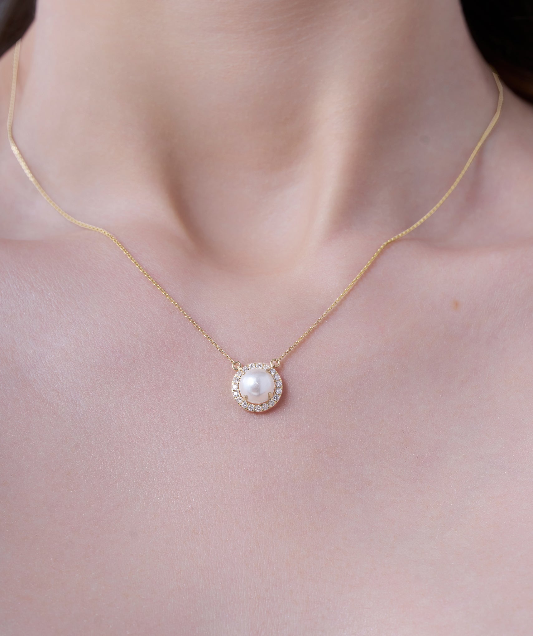 Crafted in 14K gold, this necklace showcases a stunning white pearl with a diamond halo, embodying classic elegance.