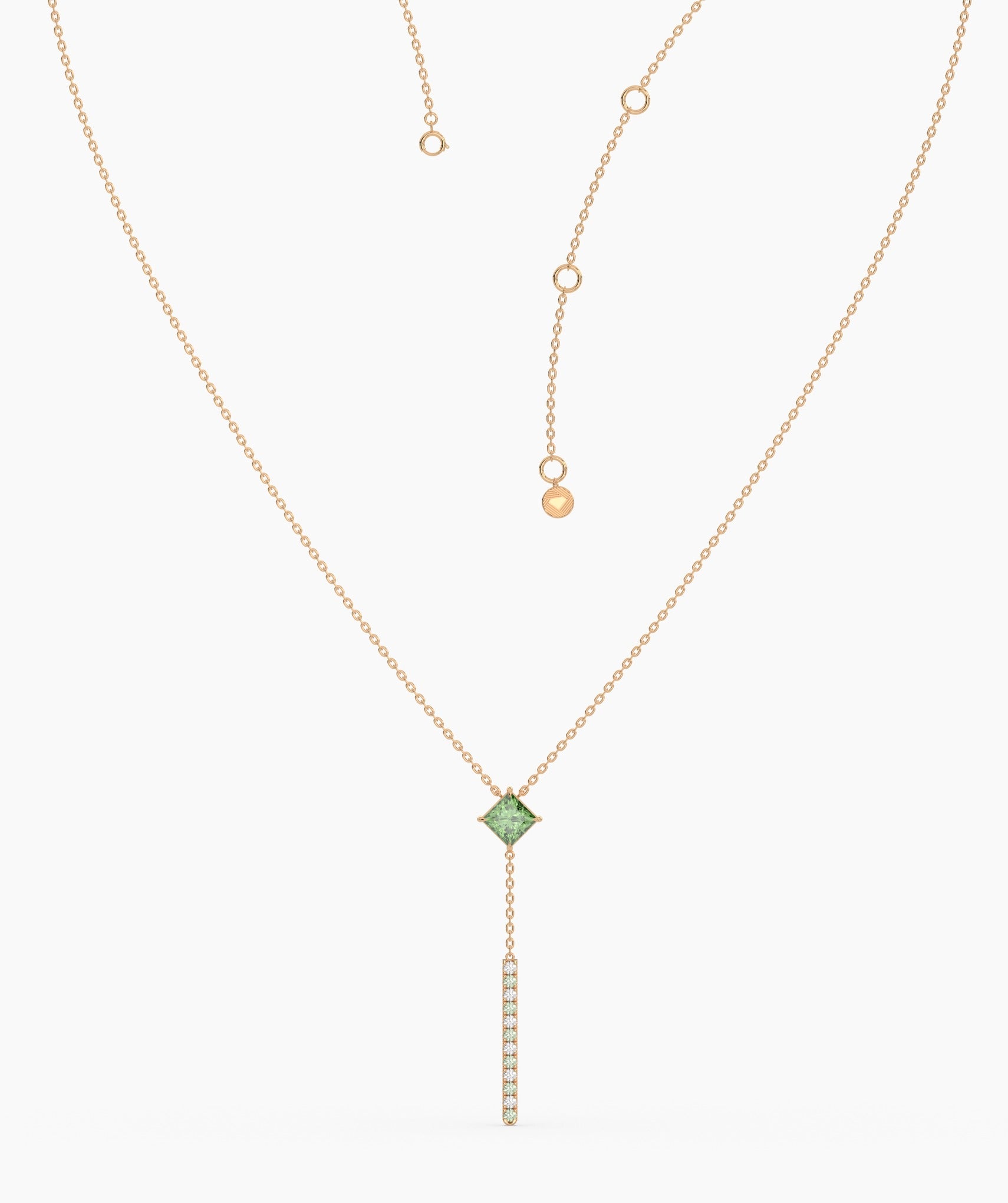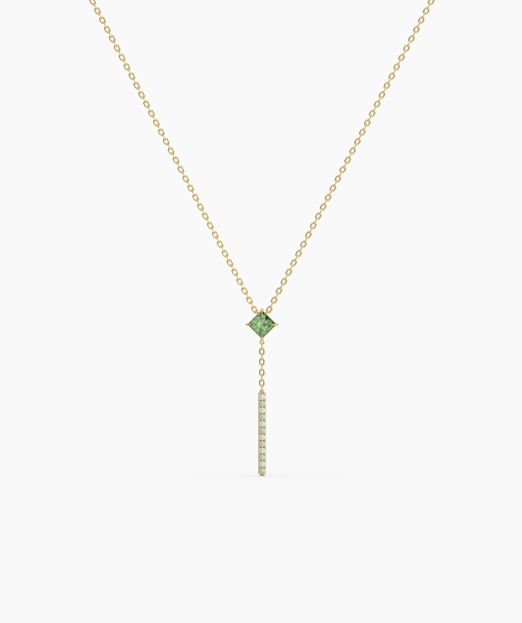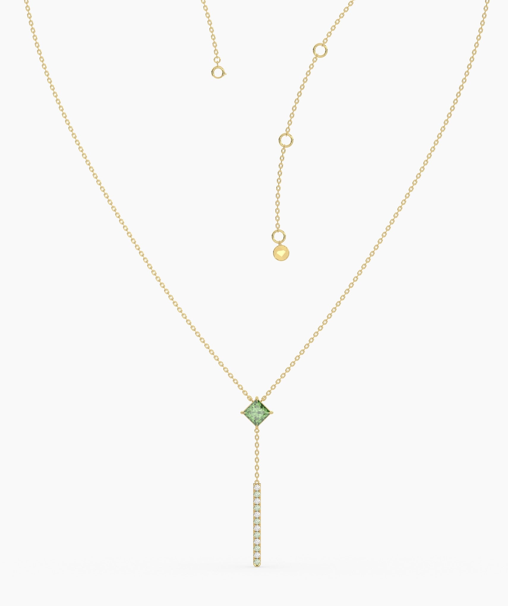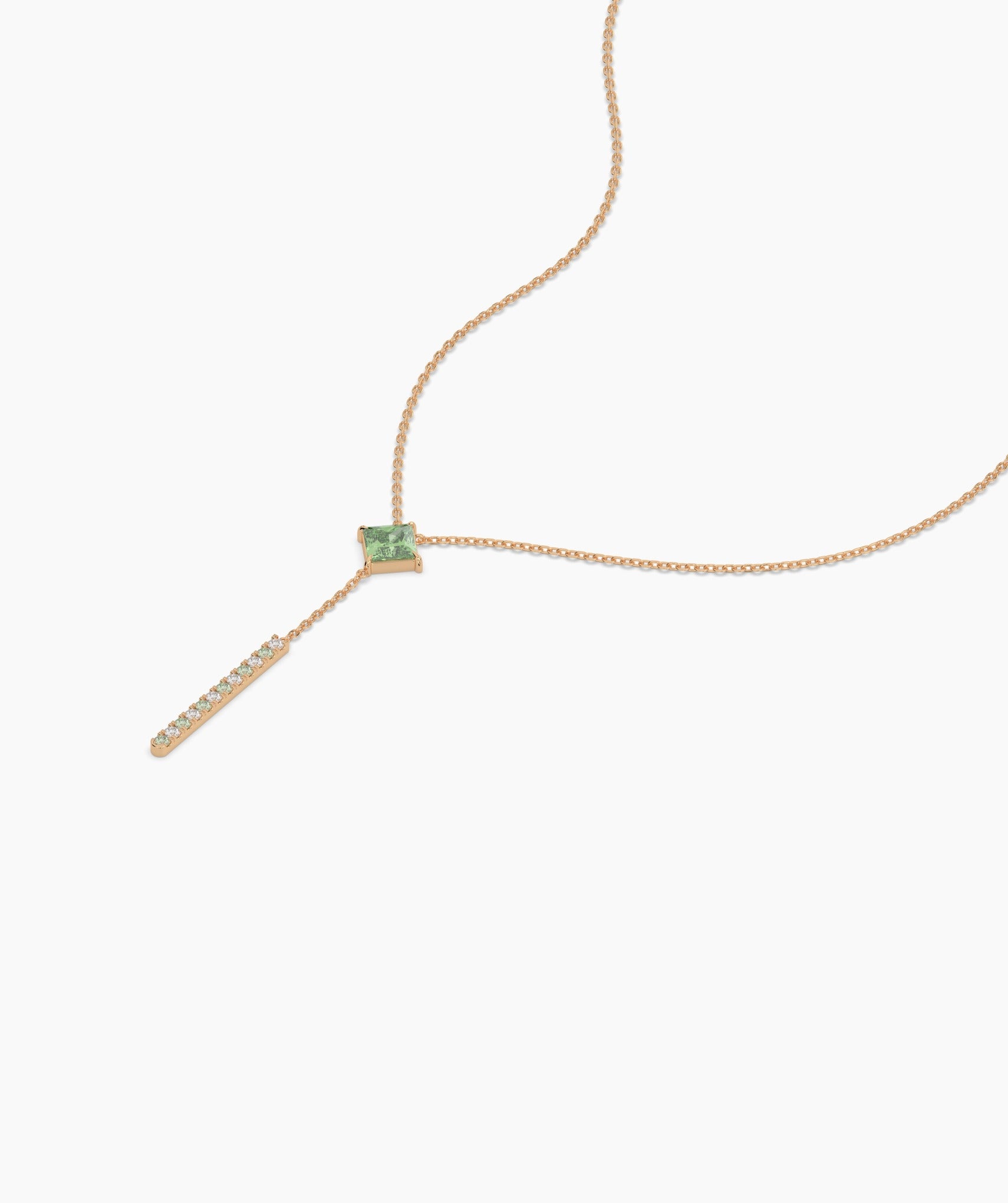 A modern twist on the classic Y-necklace, featuring a luminous green stone and a subtle vertical bar for a refined, stylish look.”