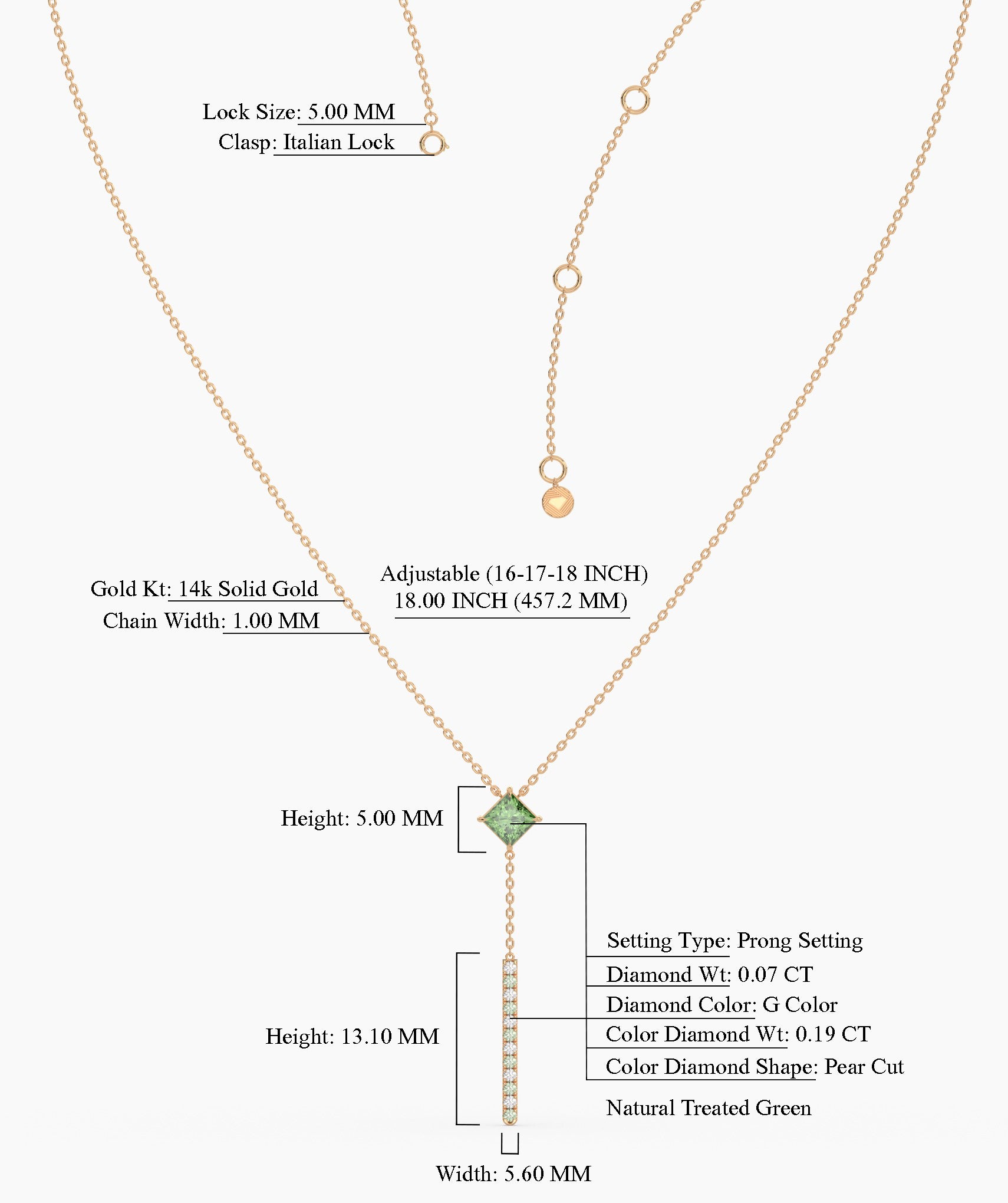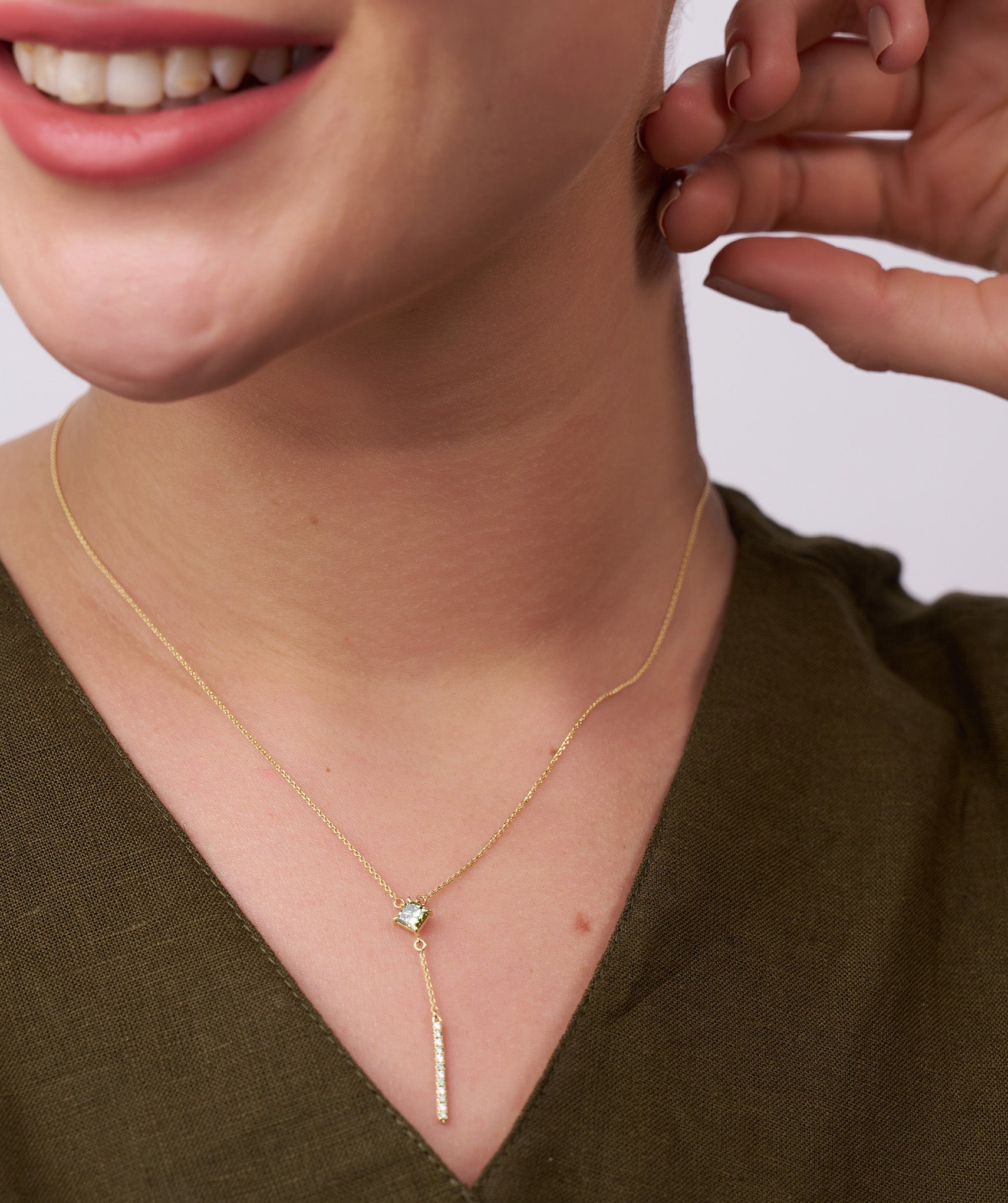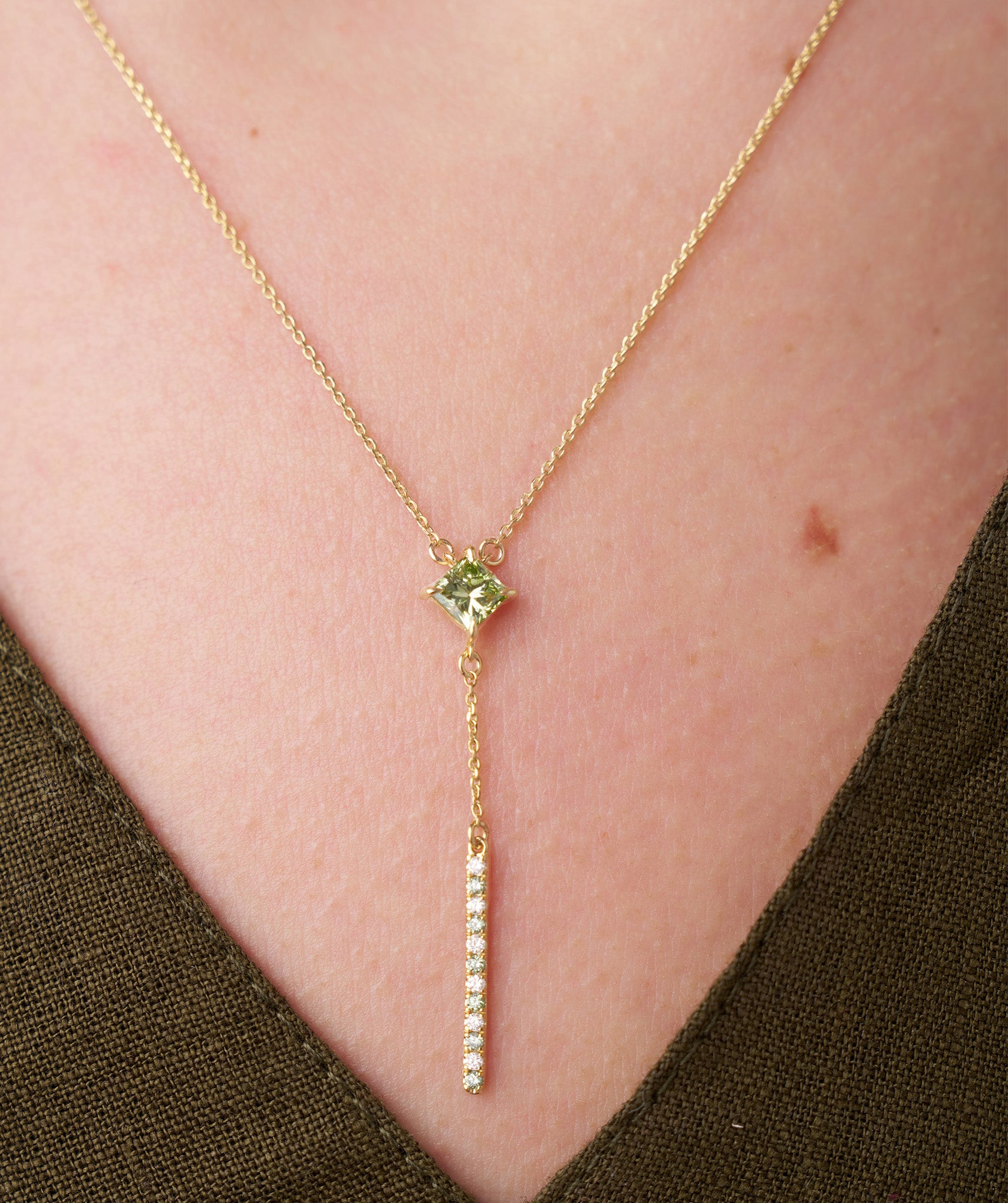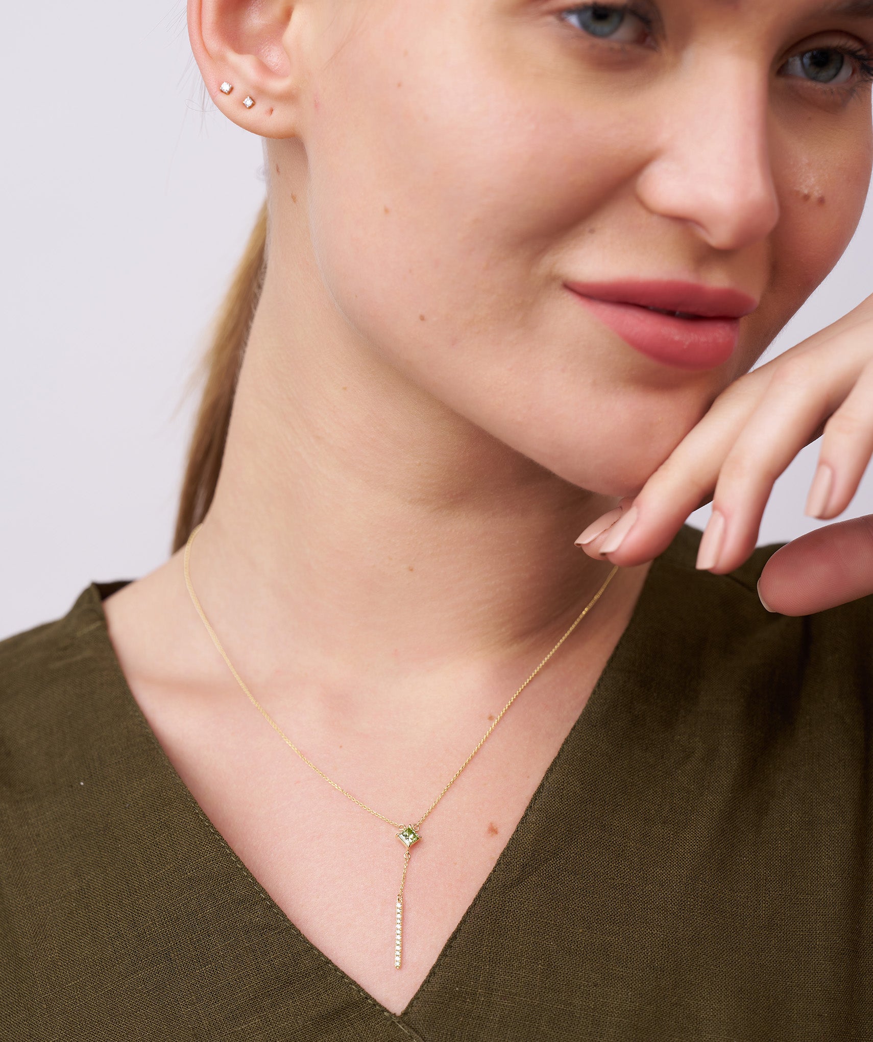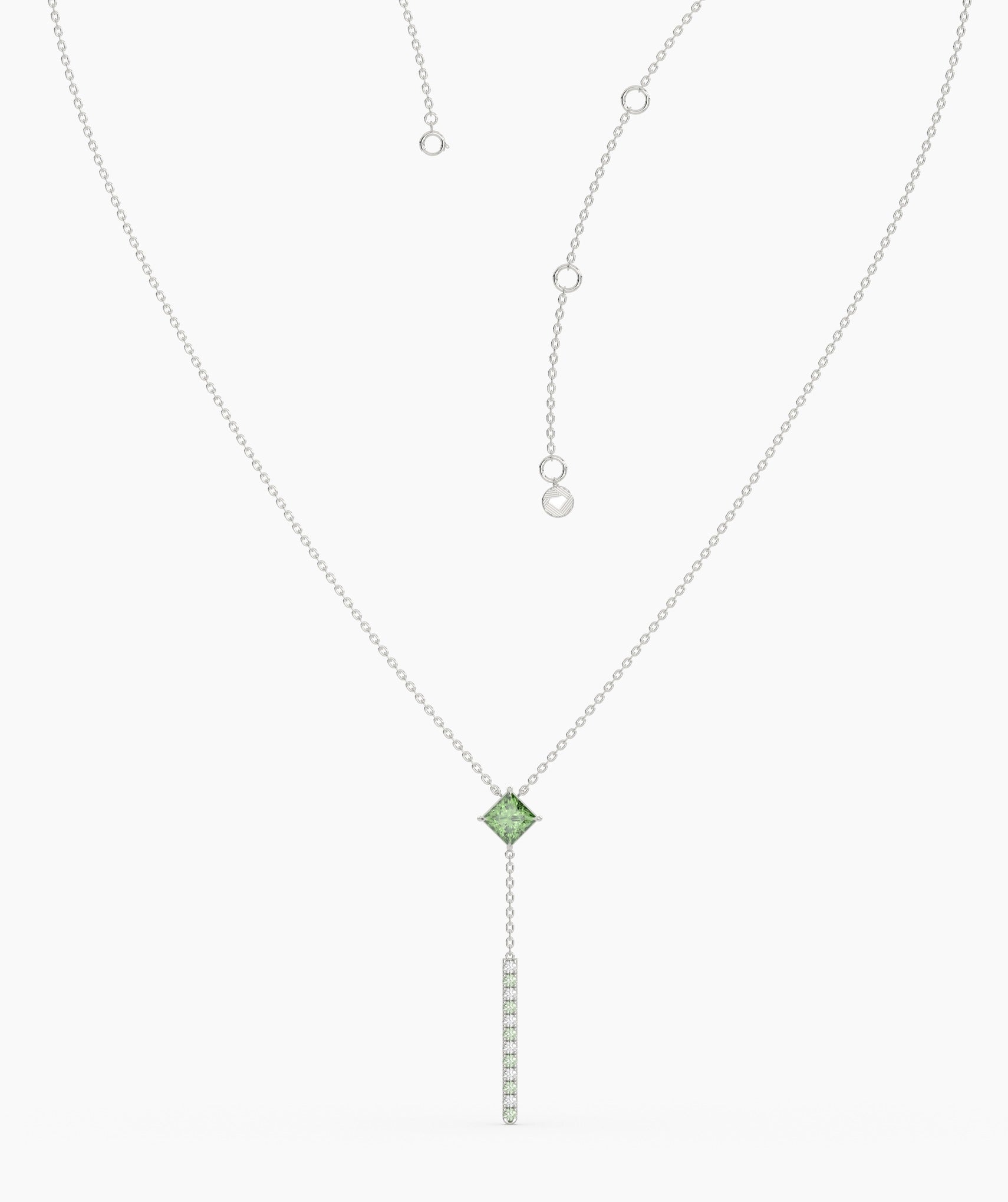 A modern twist on the classic Y-necklace, featuring a luminous green stone and a subtle vertical bar for a refined, stylish look.”