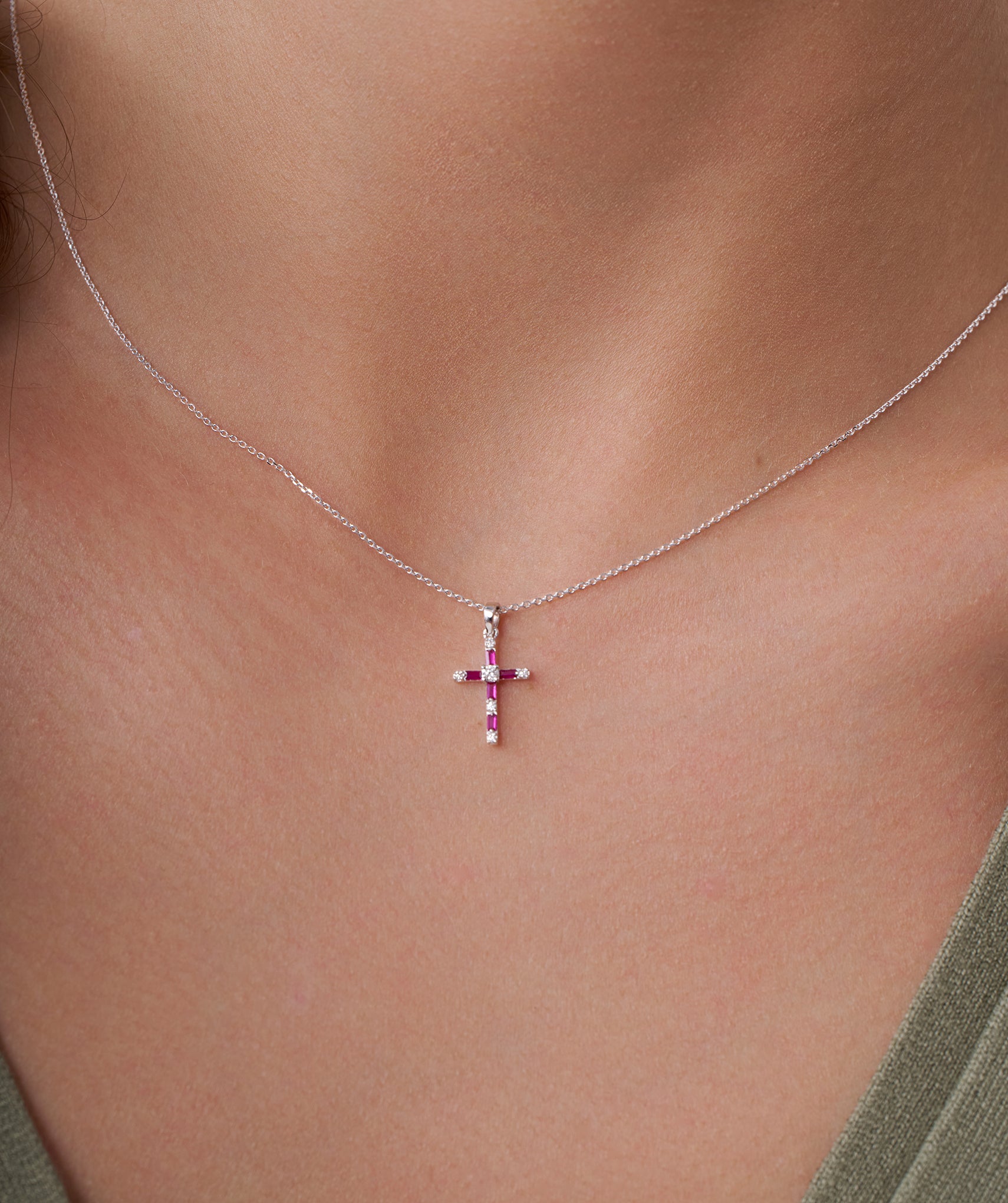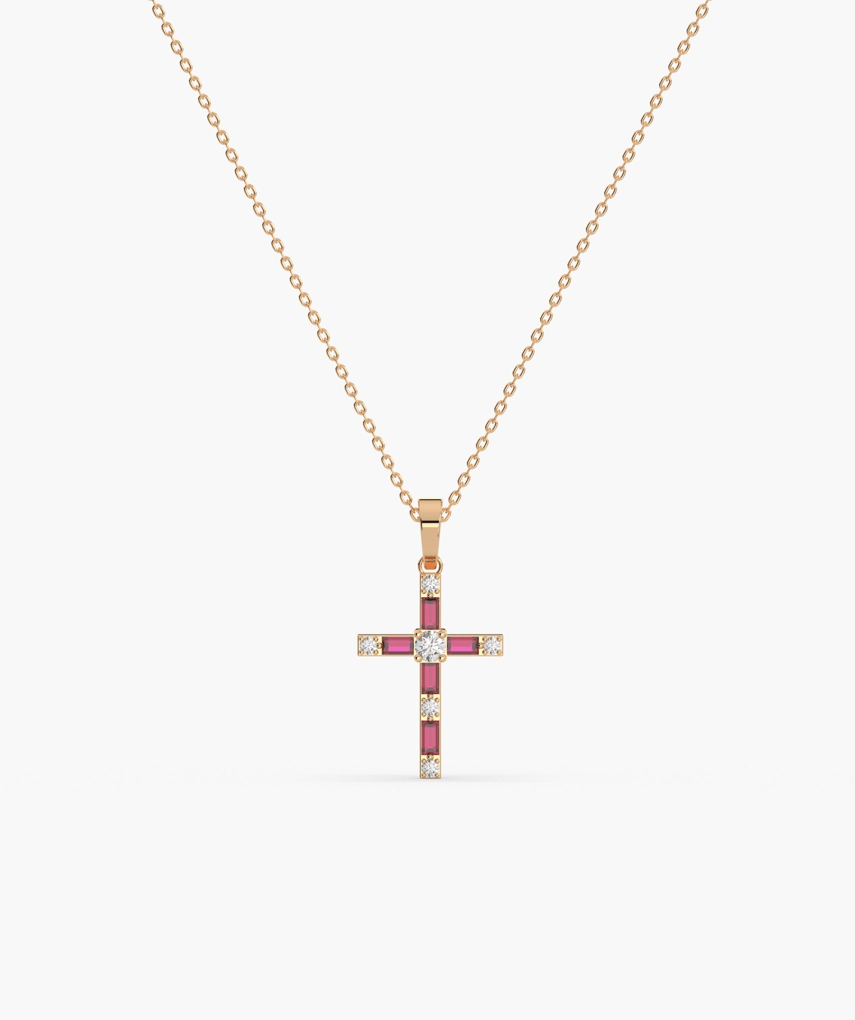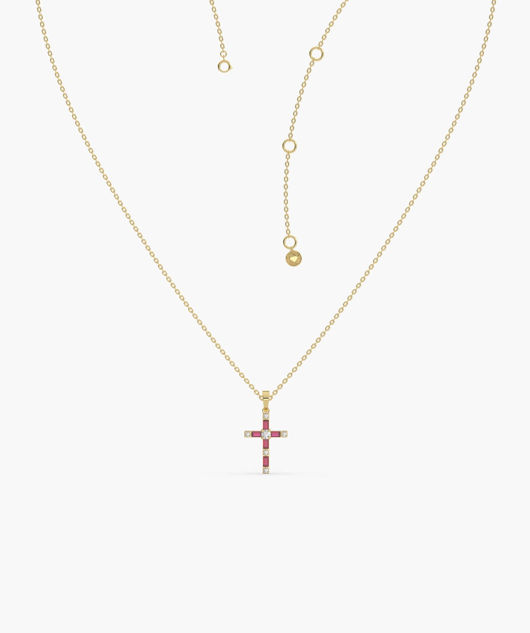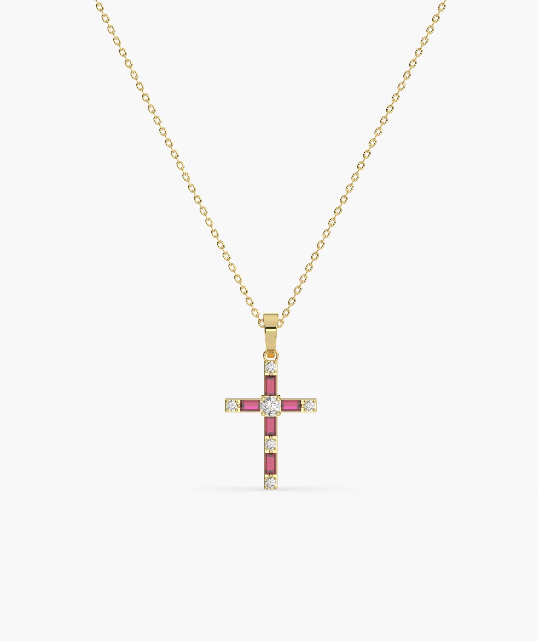 Chic 14K gold necklace with a cross pendant, beautifully accented with rubies and diamonds, offering a sophisticated splash of color and sparkle.