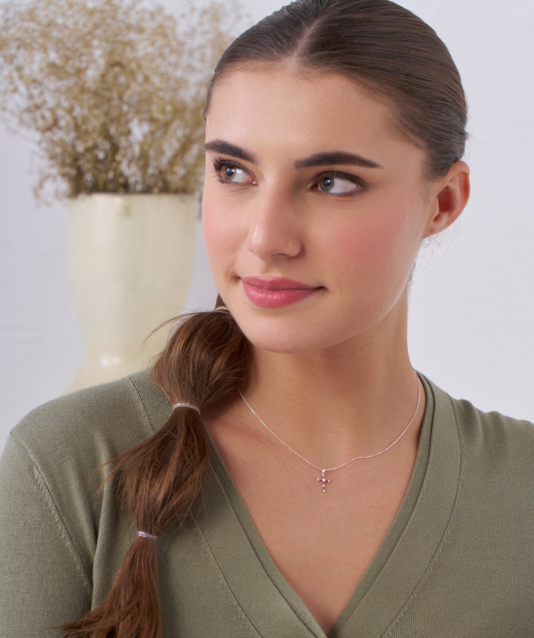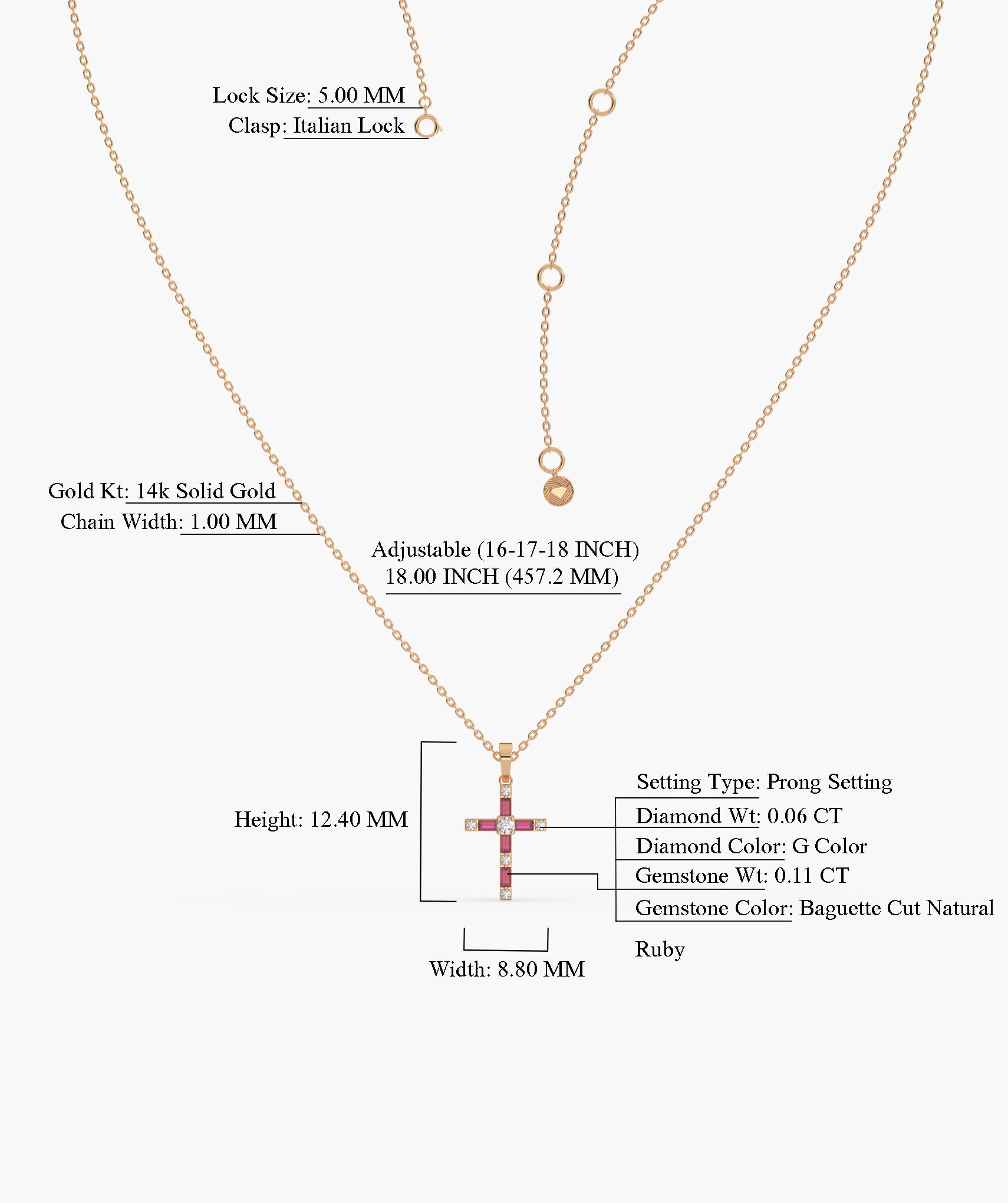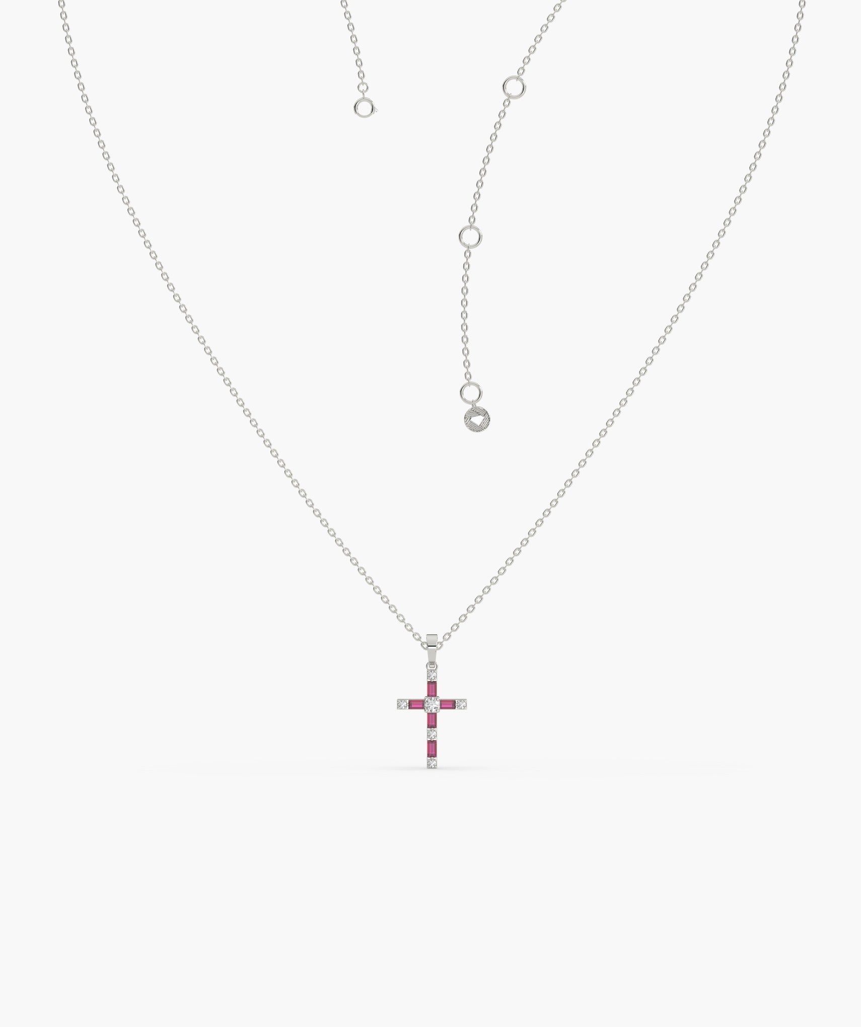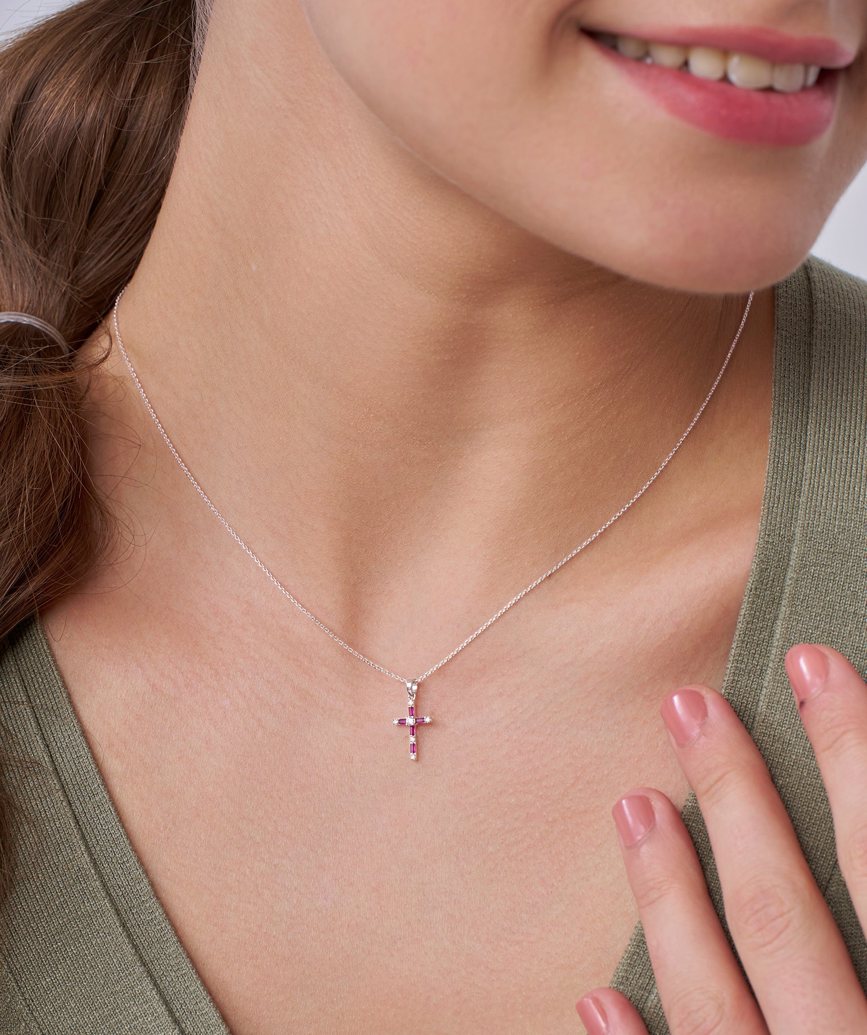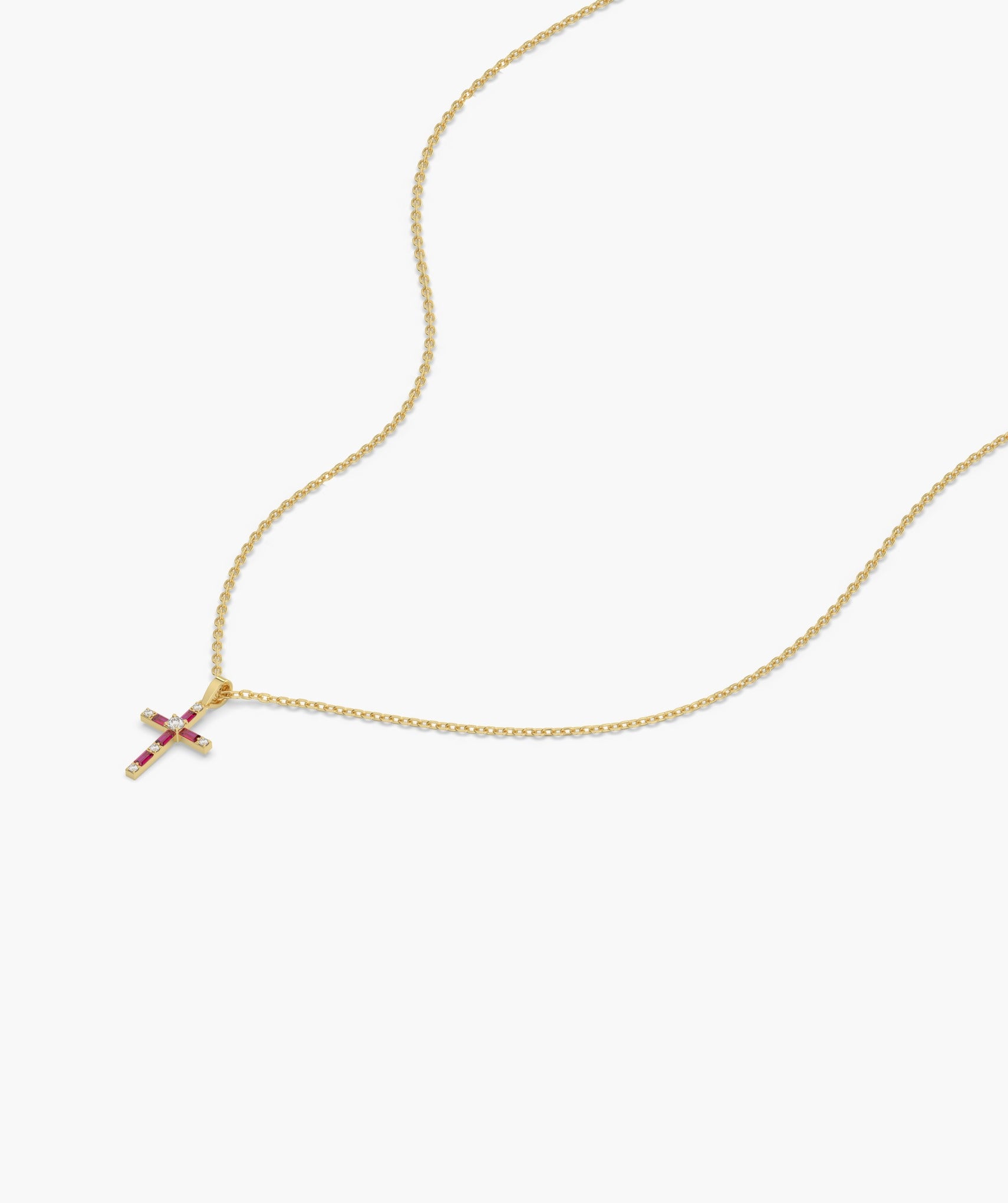 Chic 14K gold necklace with a cross pendant, beautifully accented with rubies and diamonds, offering a sophisticated splash of color and sparkle.