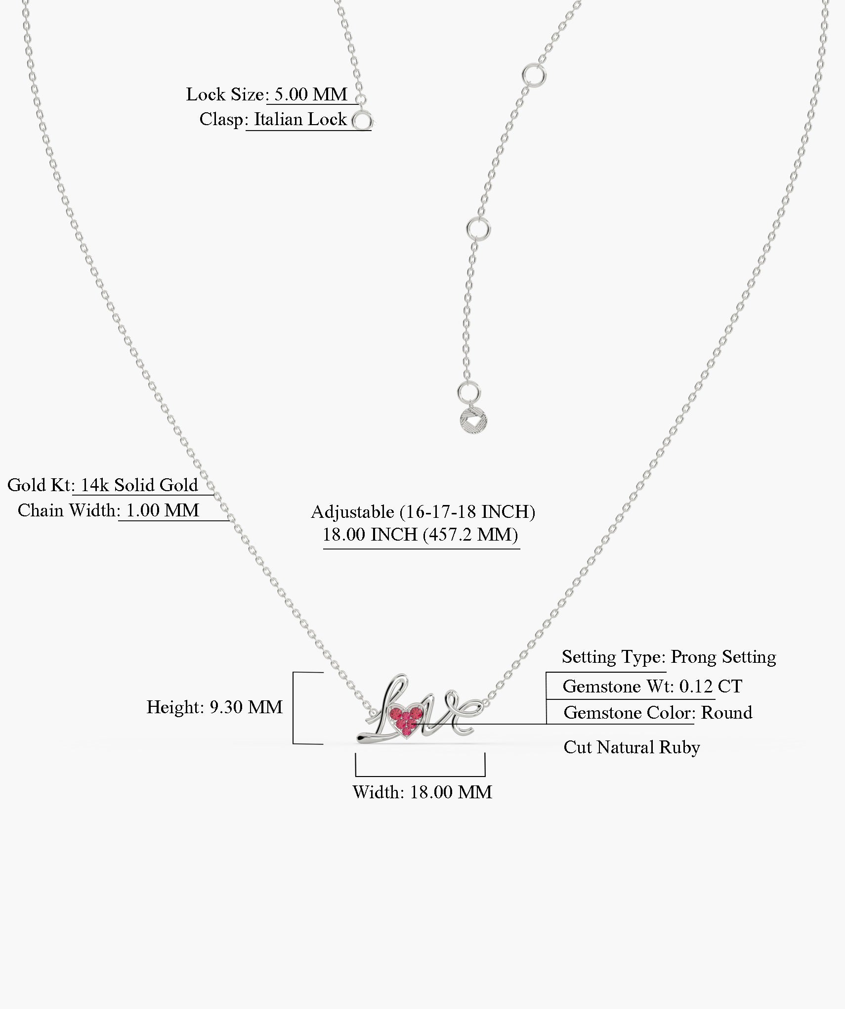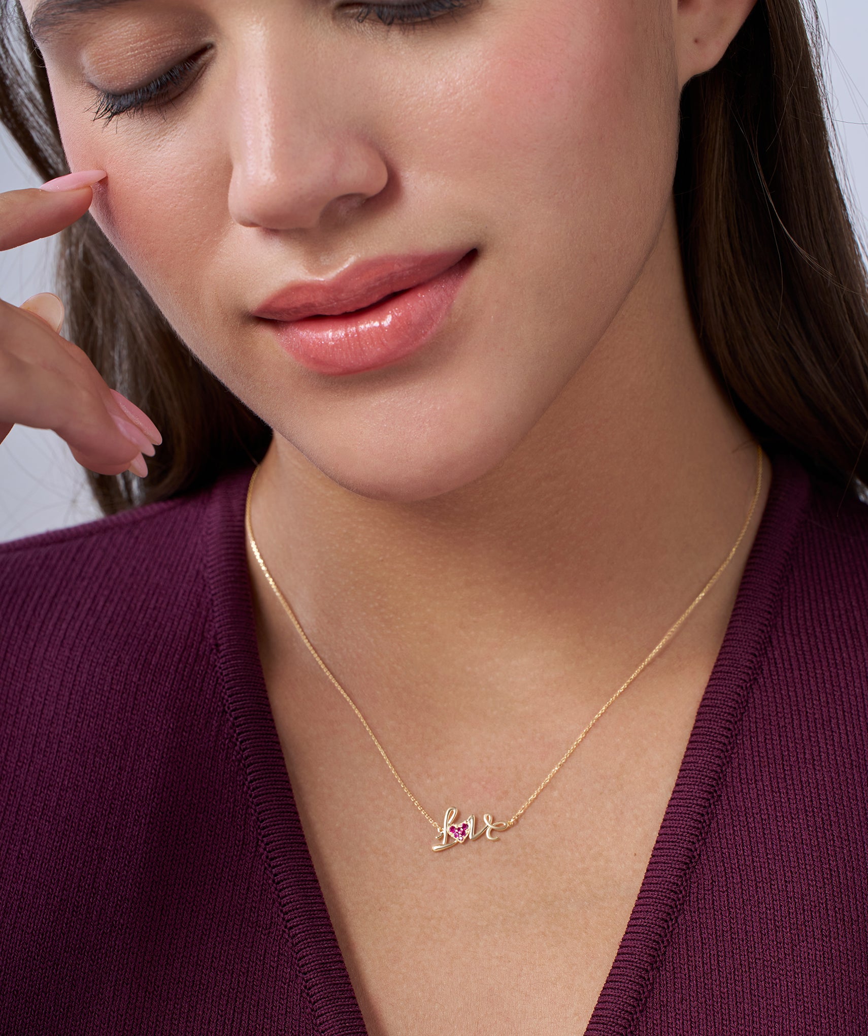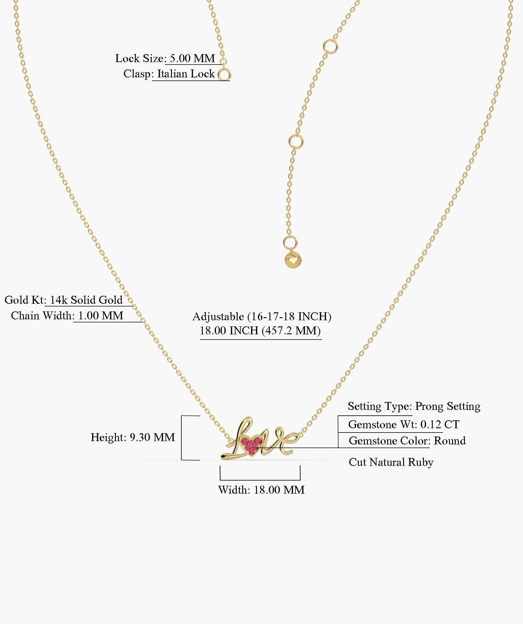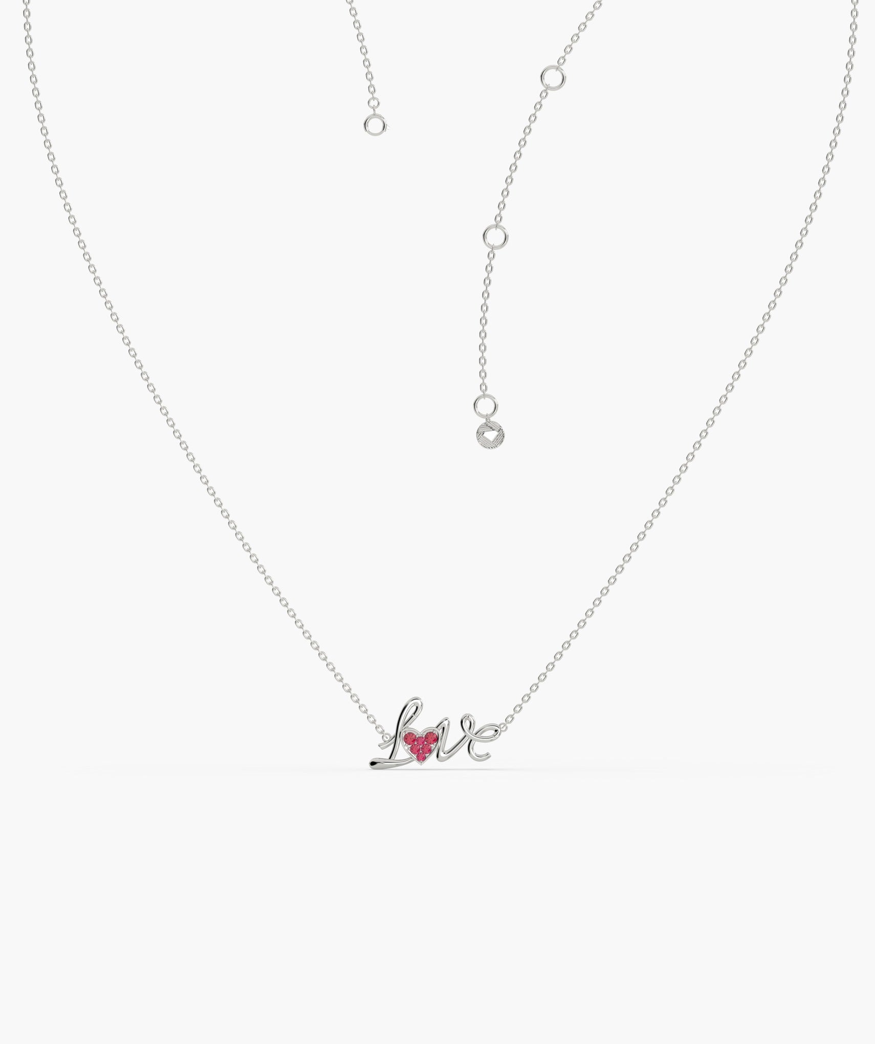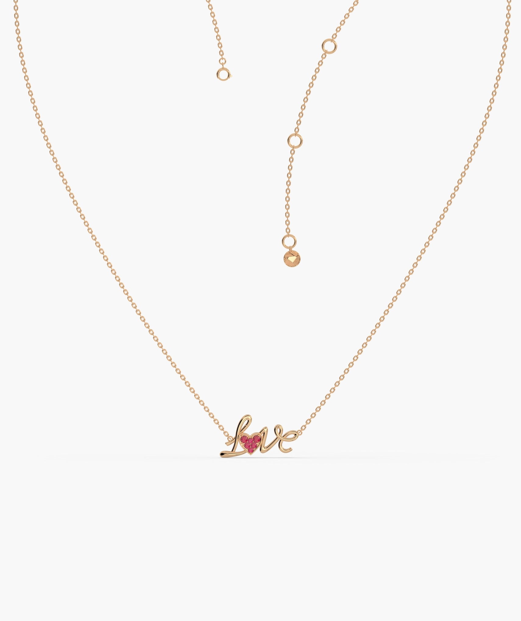 This 14K solid gold necklace spells out "Love" in a flowing script, accented by a heart adorned with sparkling pink ruby.