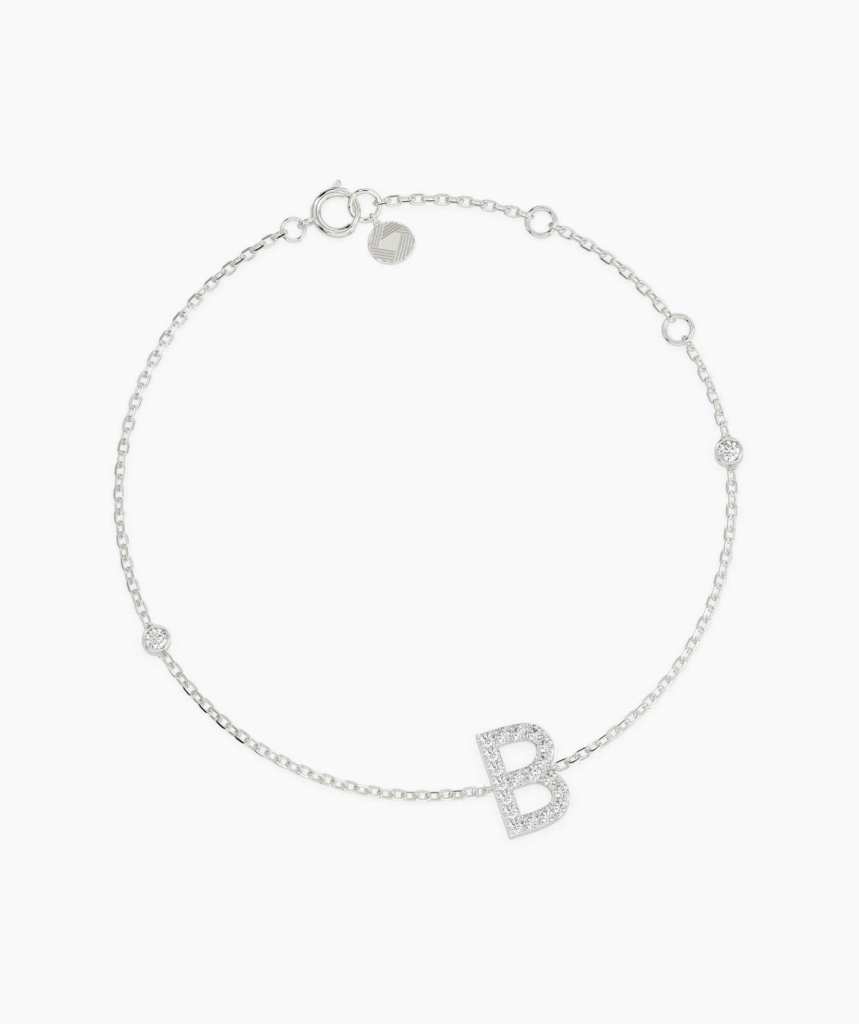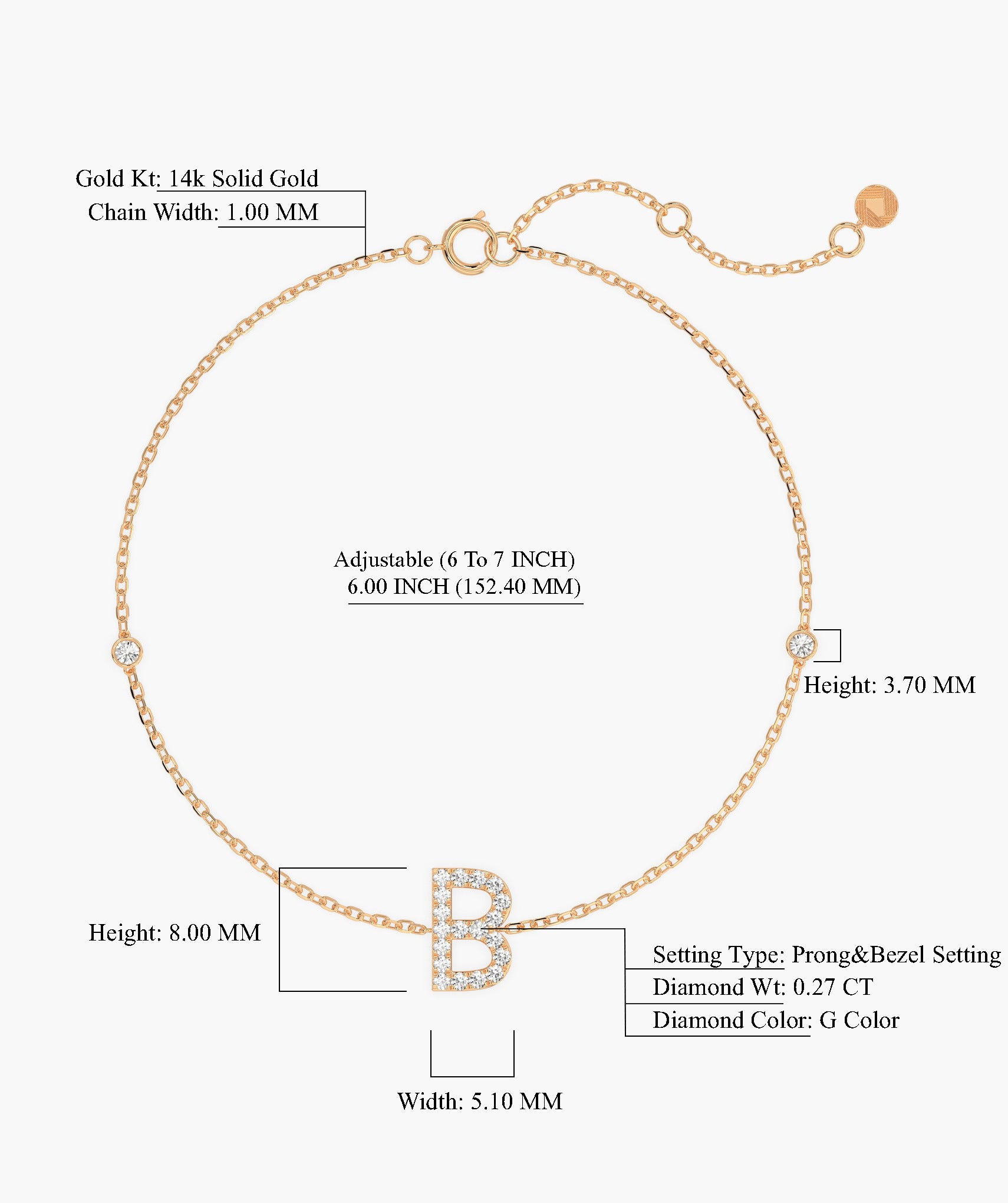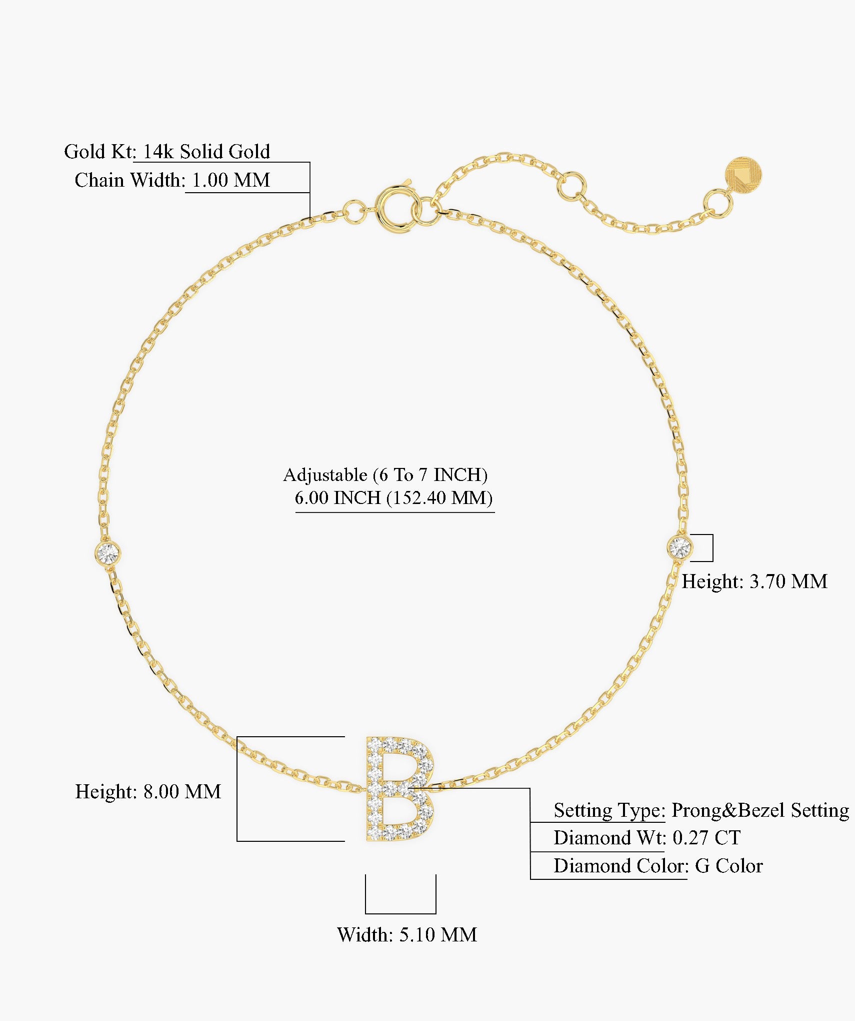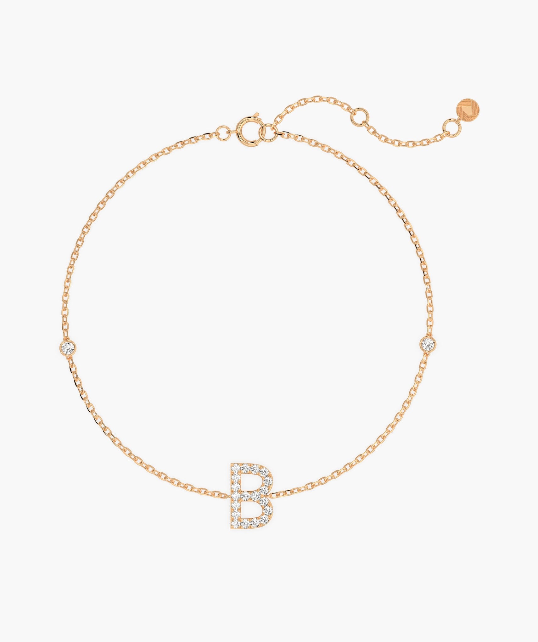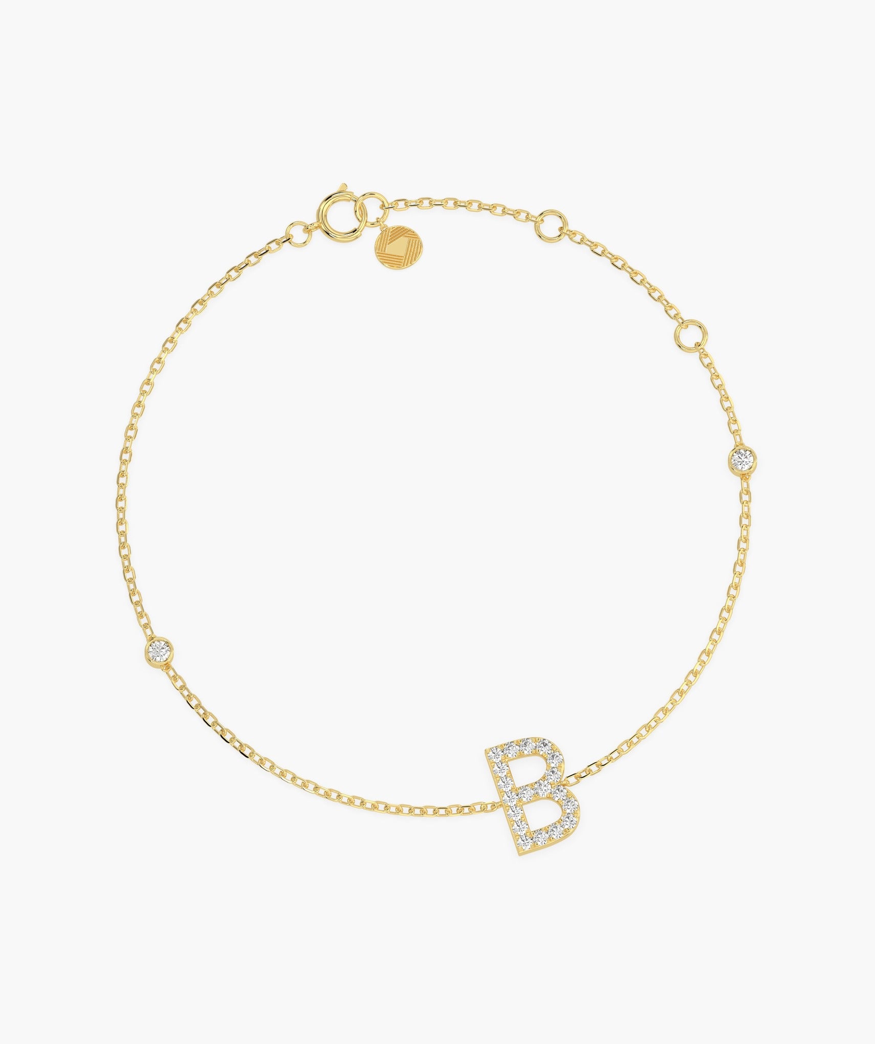 Elegant and timeless, this 14K solid gold bracelet features a delicate charm of the initial 'B' adorned with sparkling diamonds.