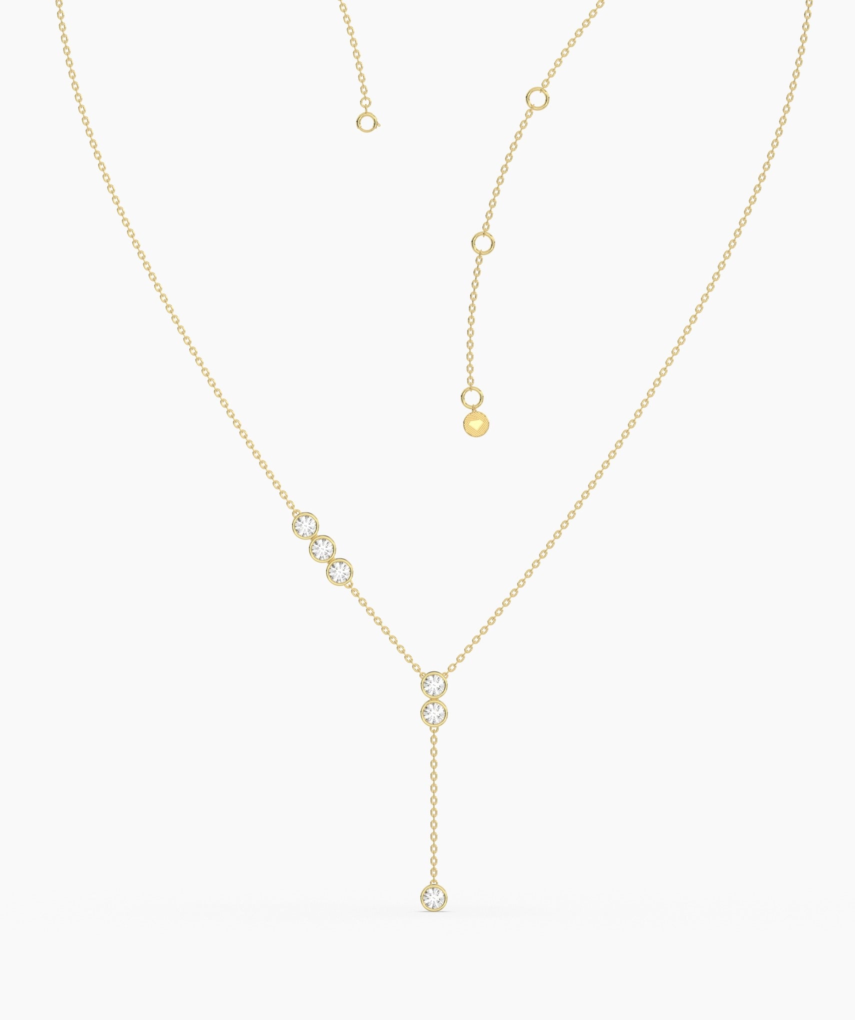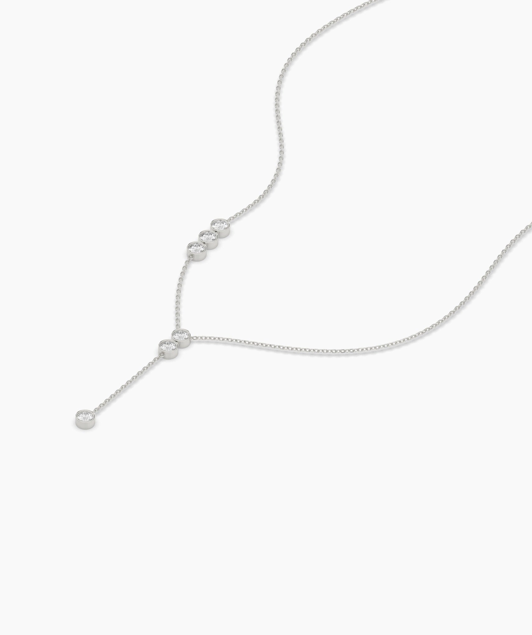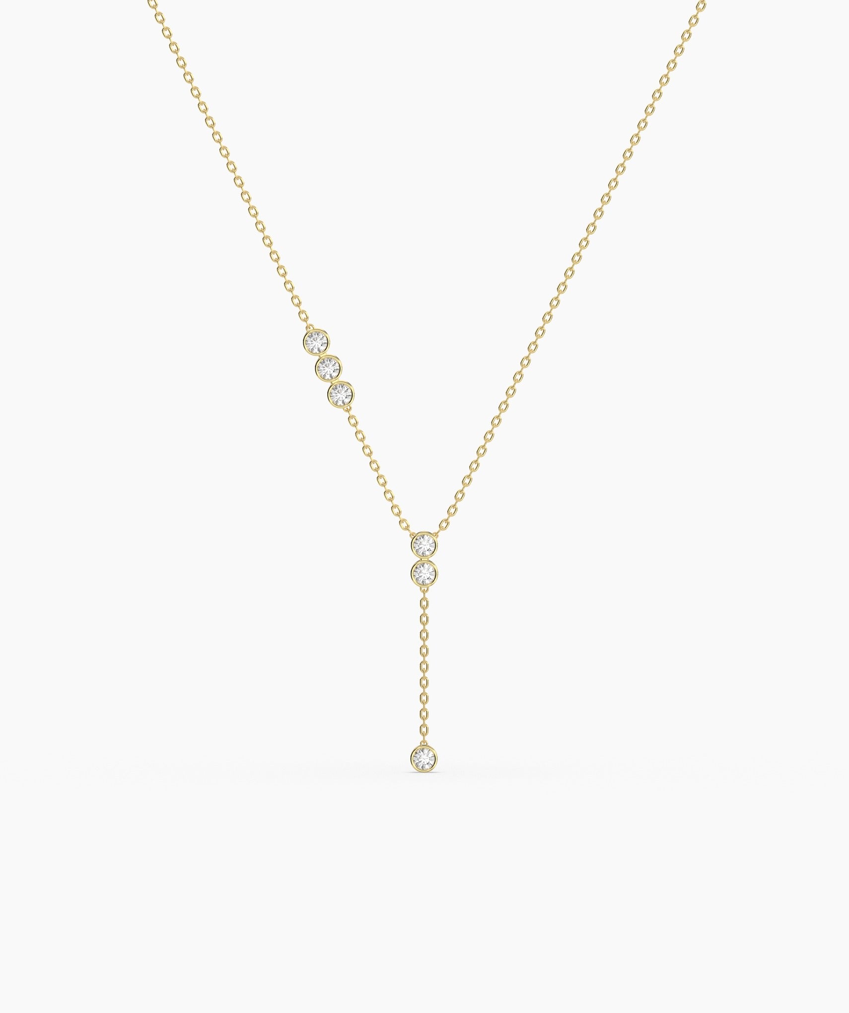 A perfect mix of modern and classic, this 14K gold Y-drop necklace showcases a delicate chain adorned with round bezel-set diamonds for a soft, radiant glow.