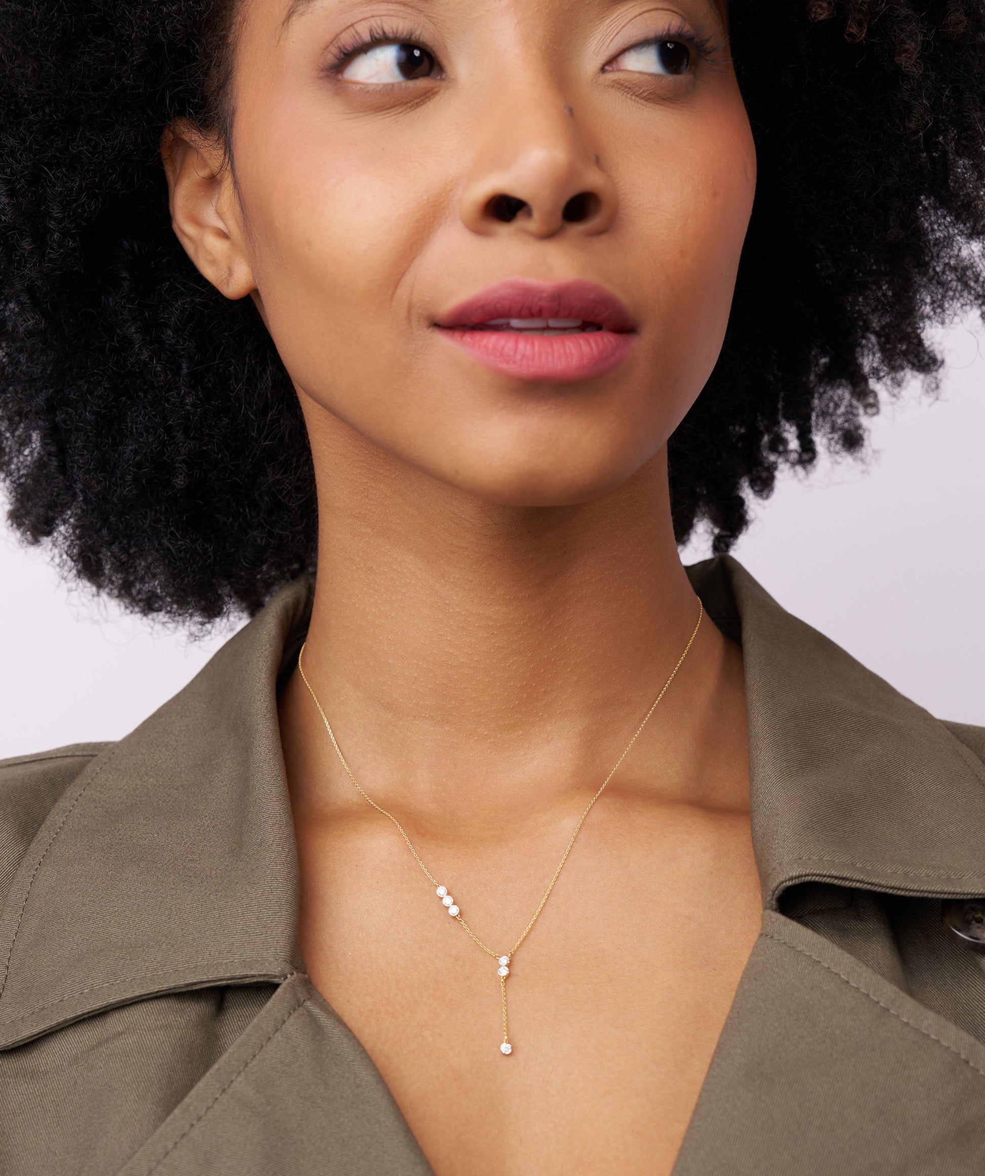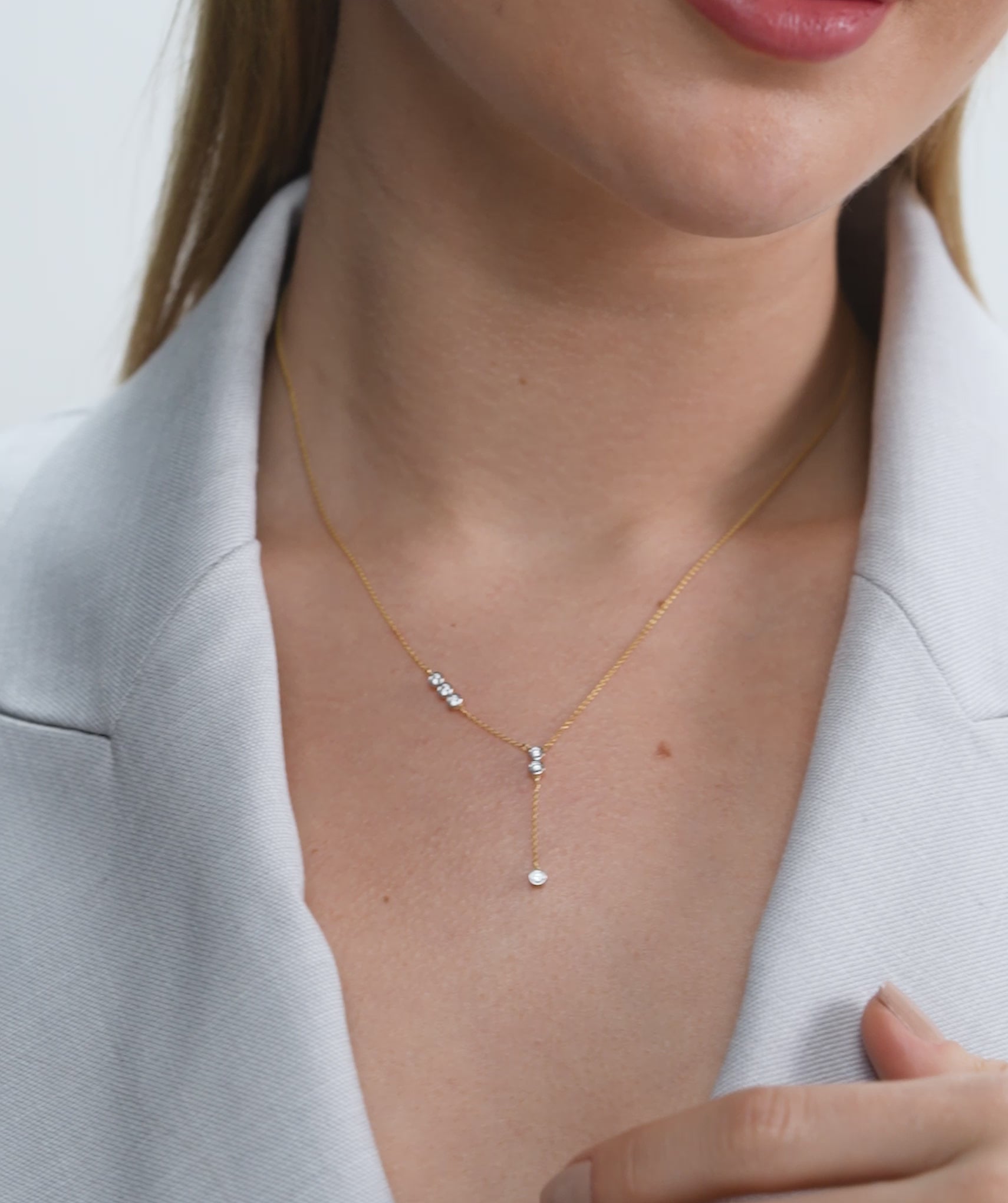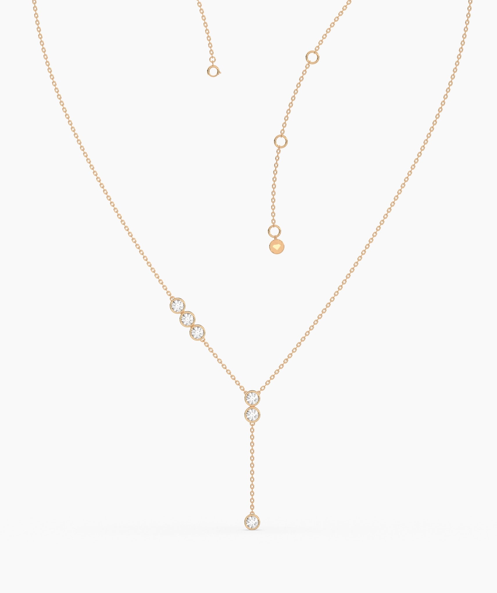 A perfect mix of modern and classic, this 14K gold Y-drop necklace showcases a delicate chain adorned with round bezel-set diamonds for a soft, radiant glow.
