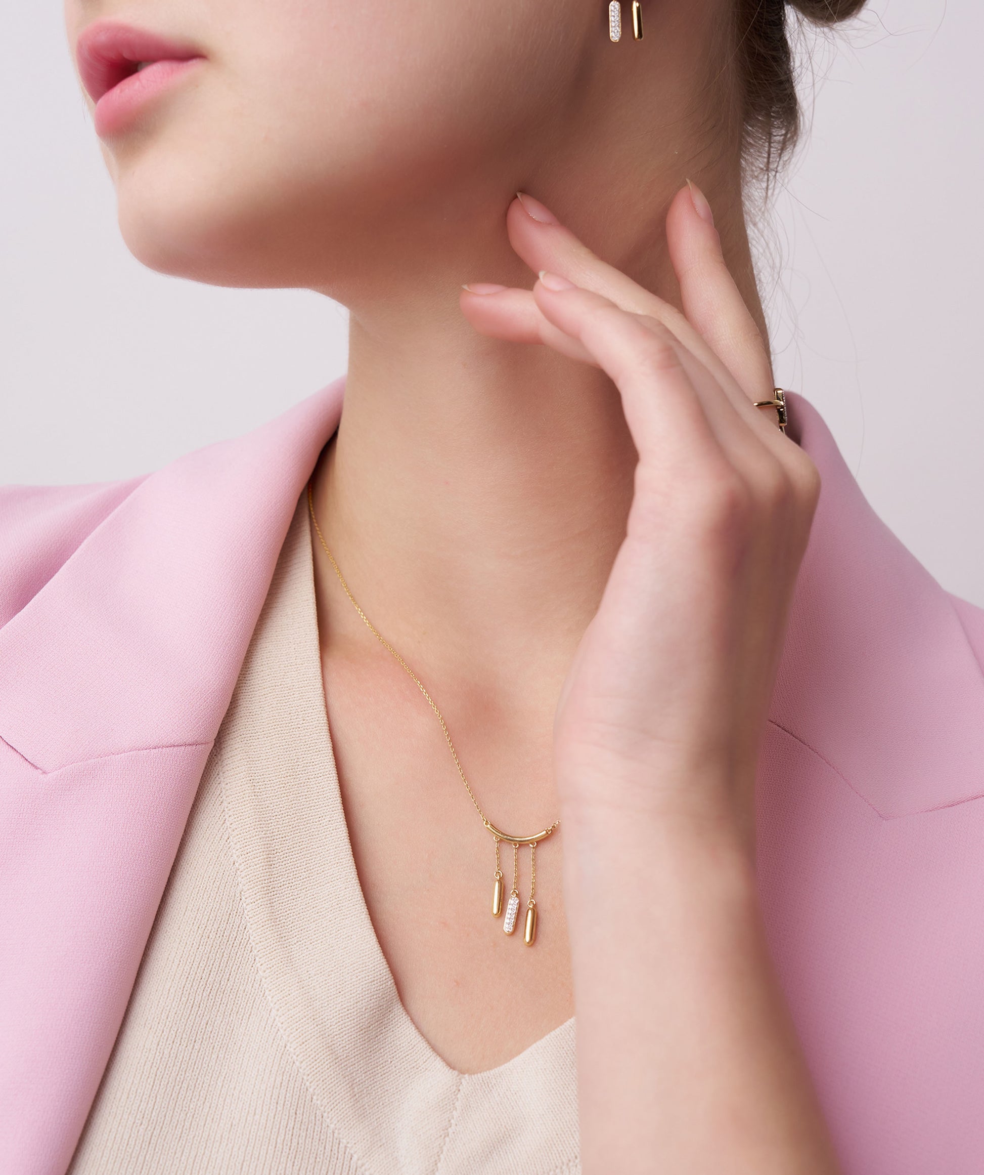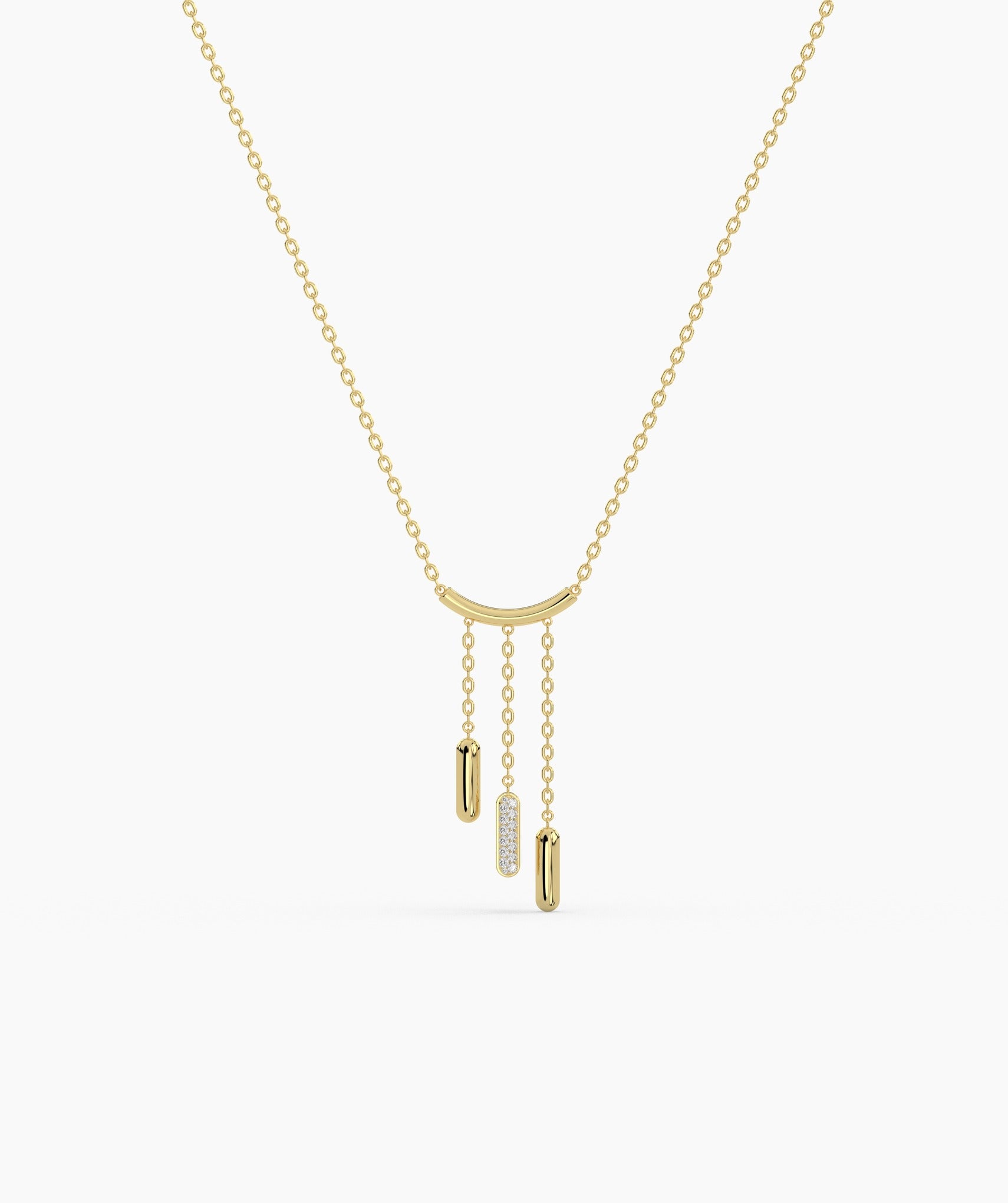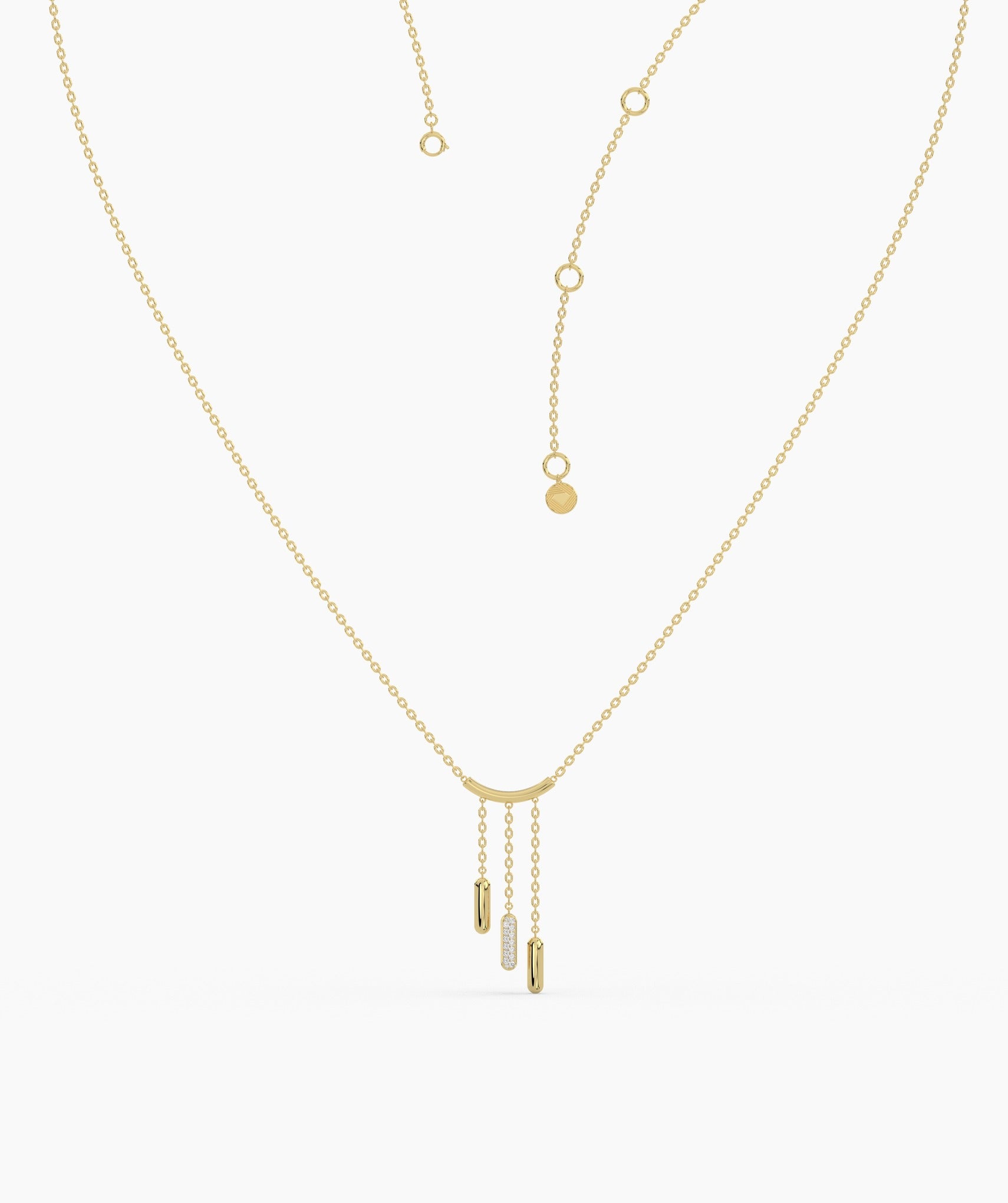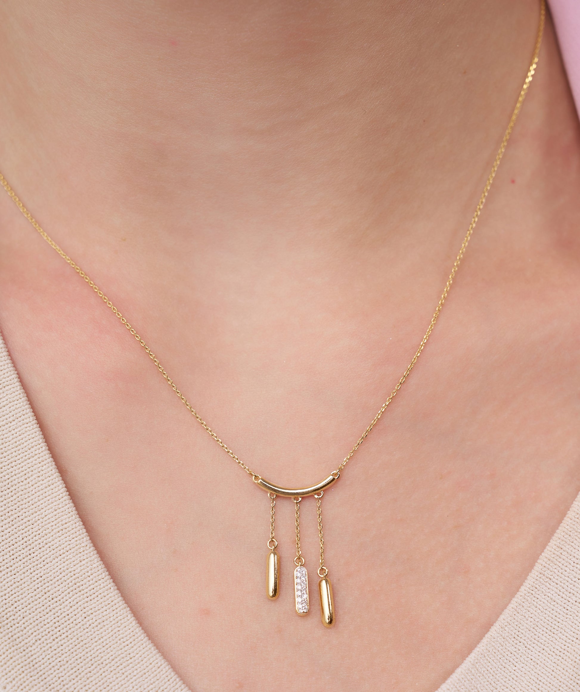 A dainty gold necklace featuring three hanging bar charms, including a sparkling diamond-accented pendant.