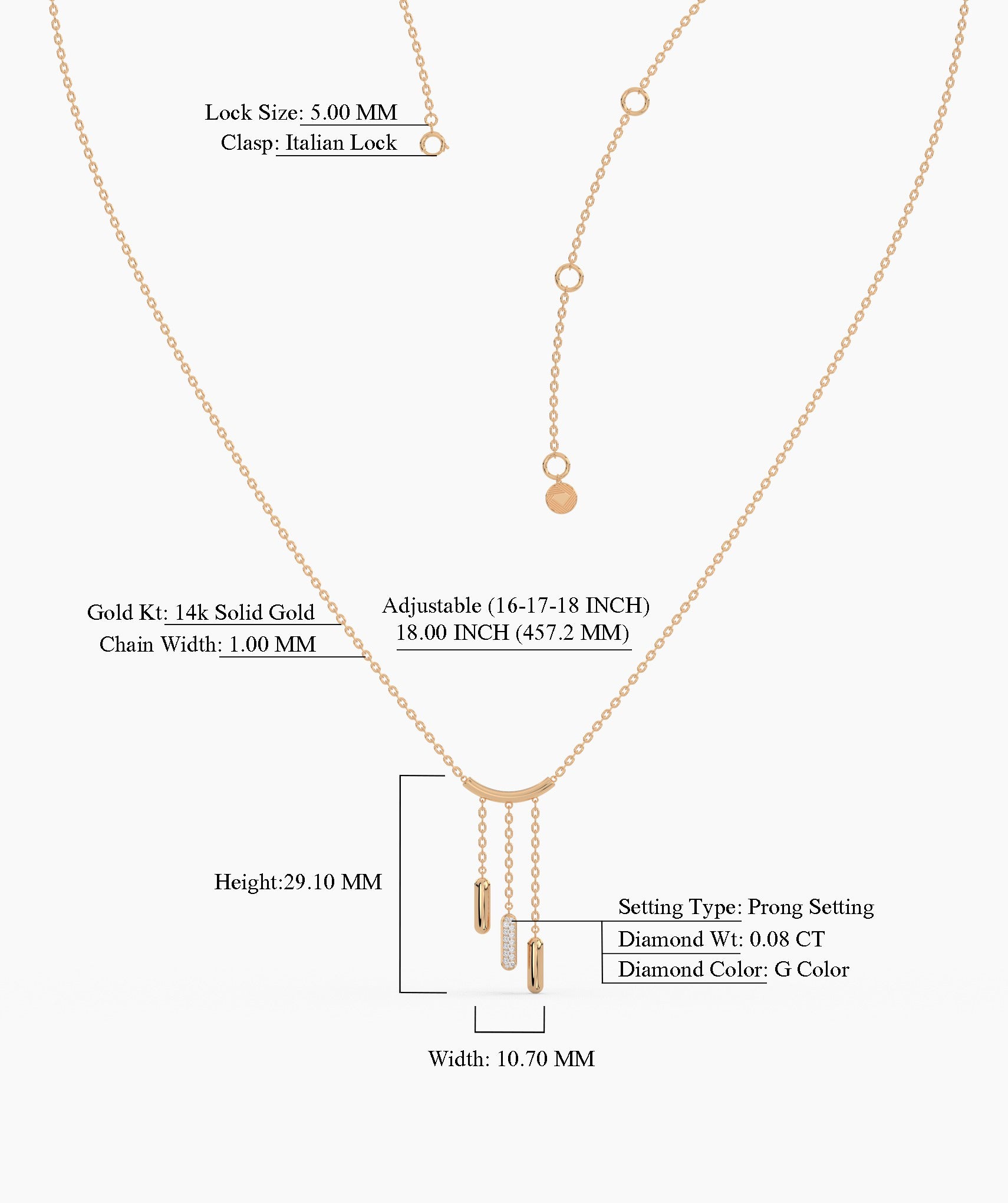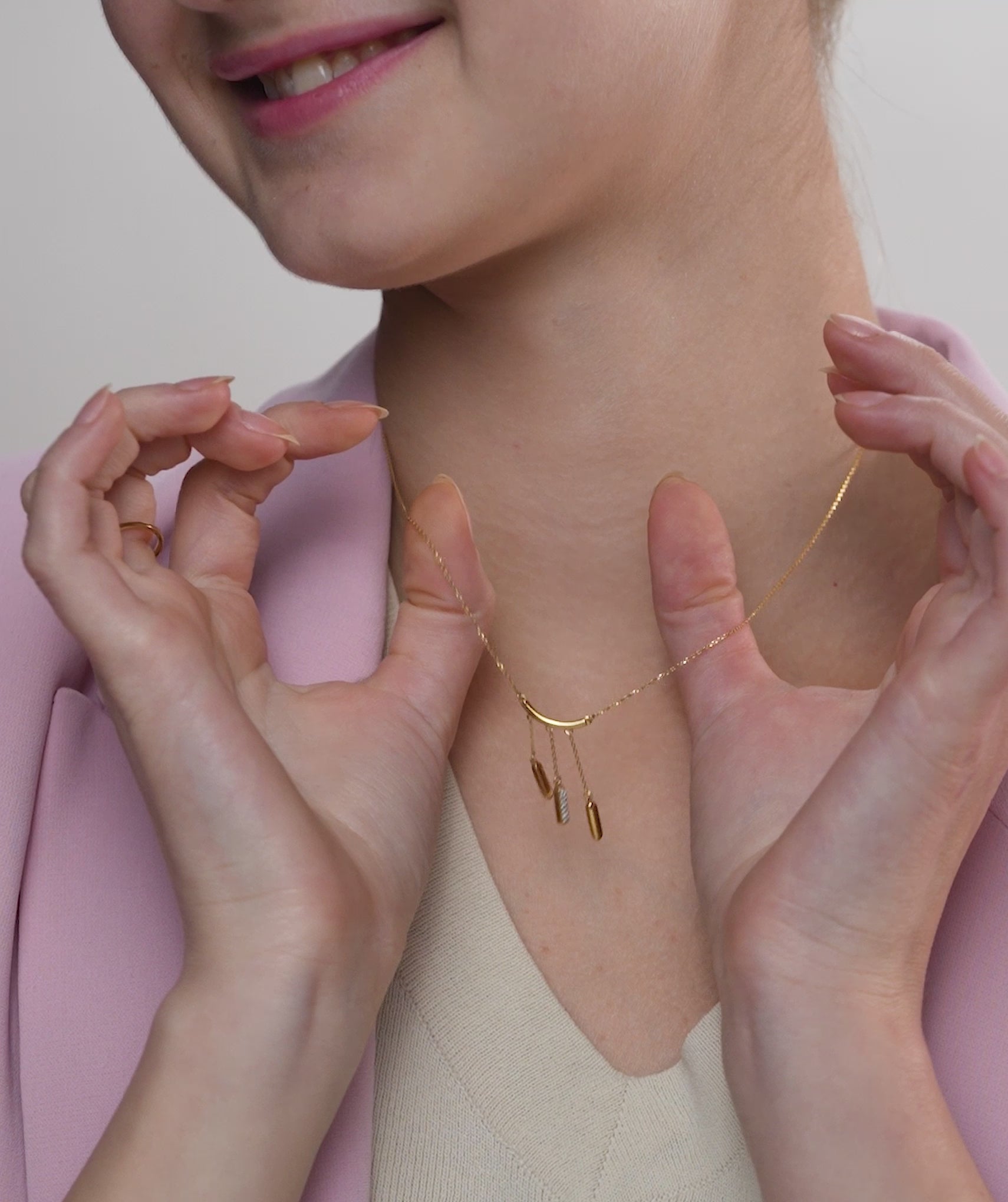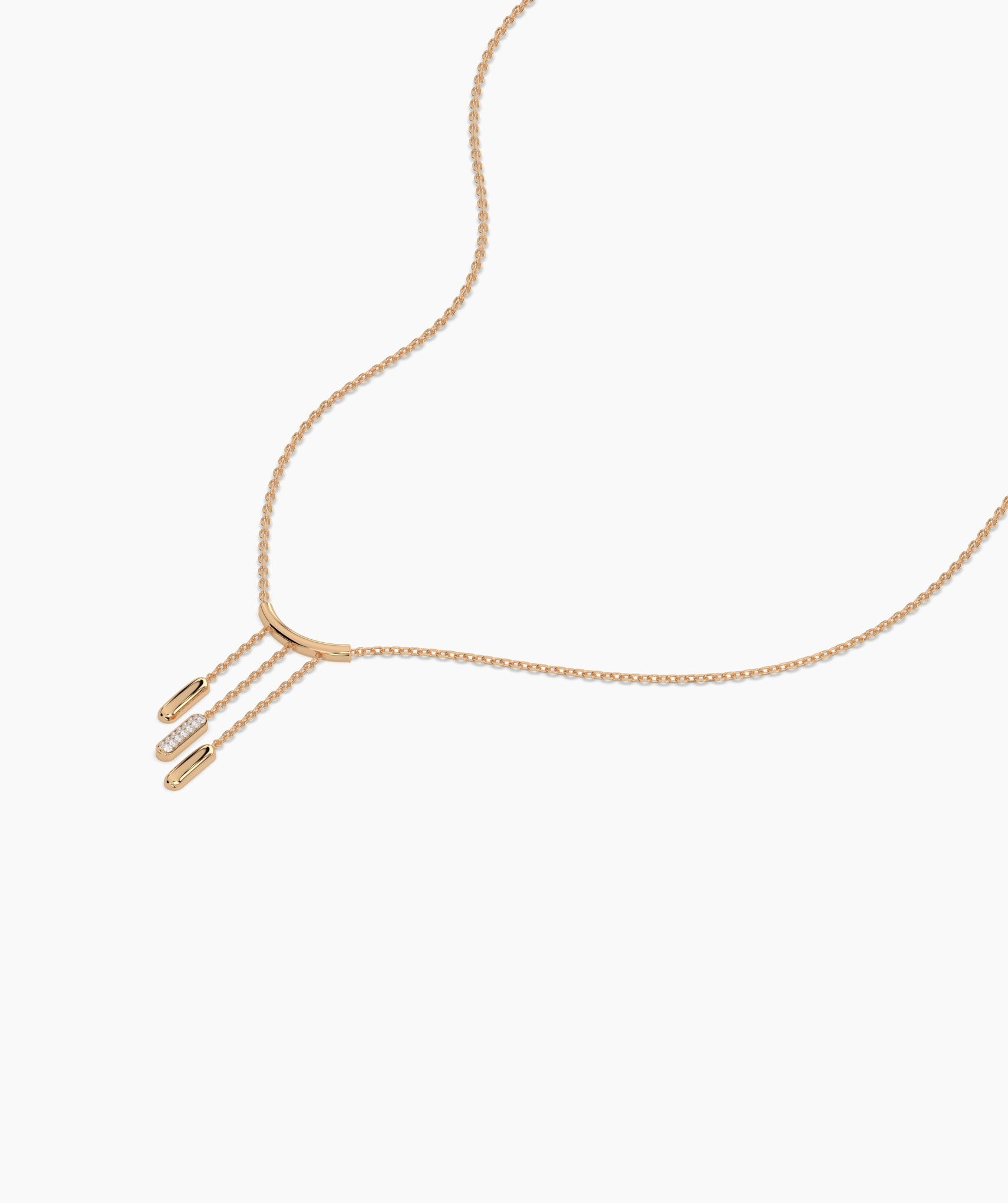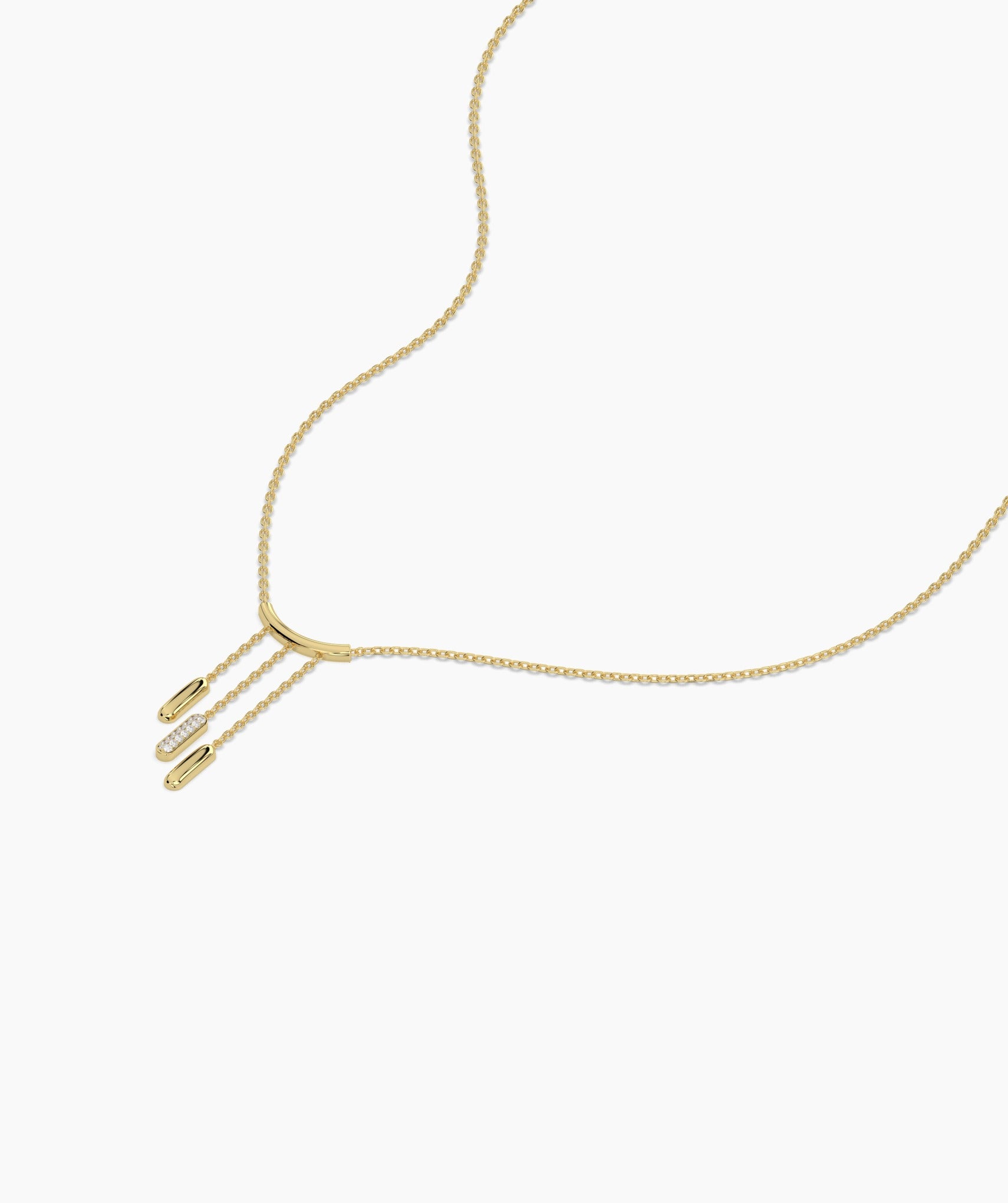 A dainty gold necklace featuring three hanging bar charms, including a sparkling diamond-accented pendant.