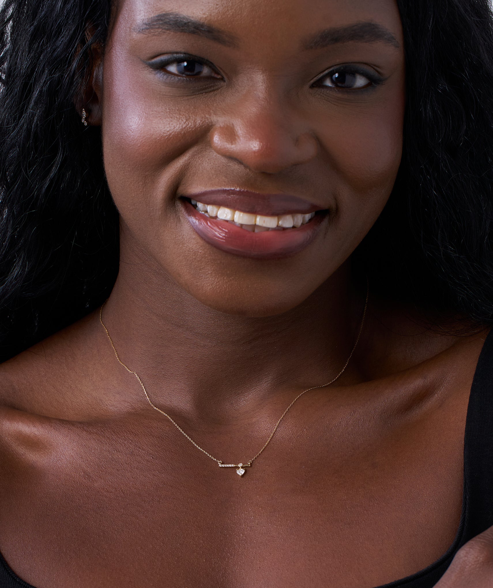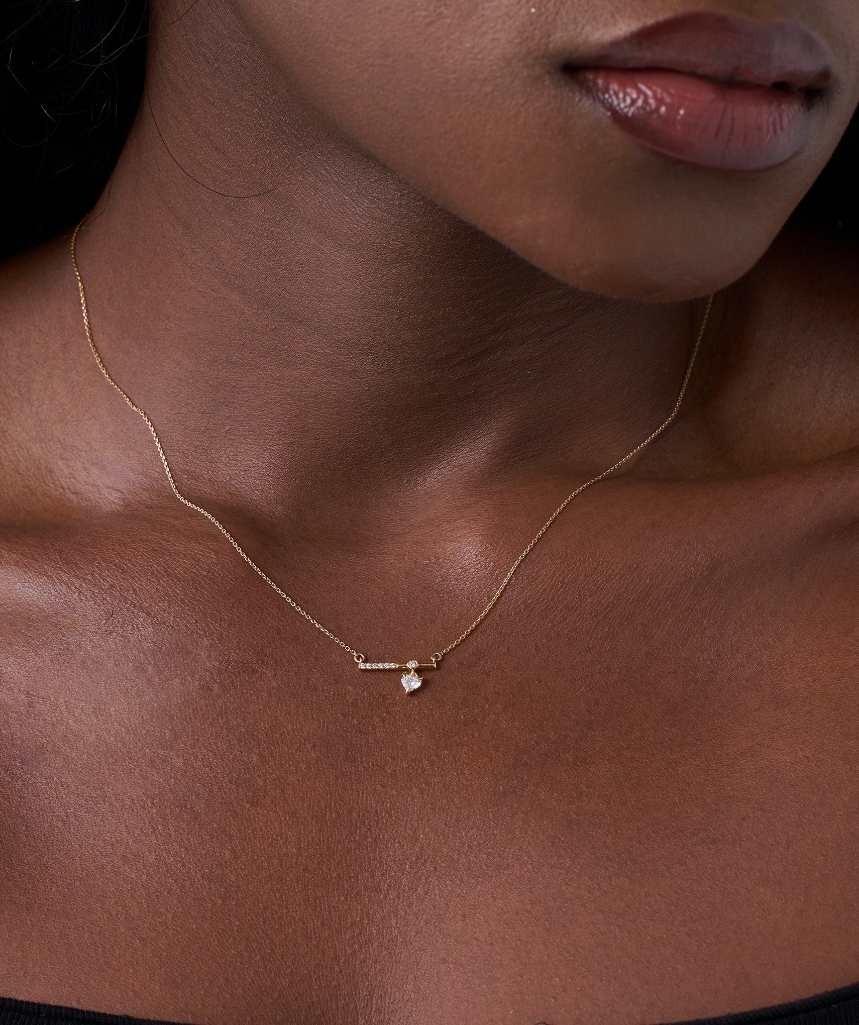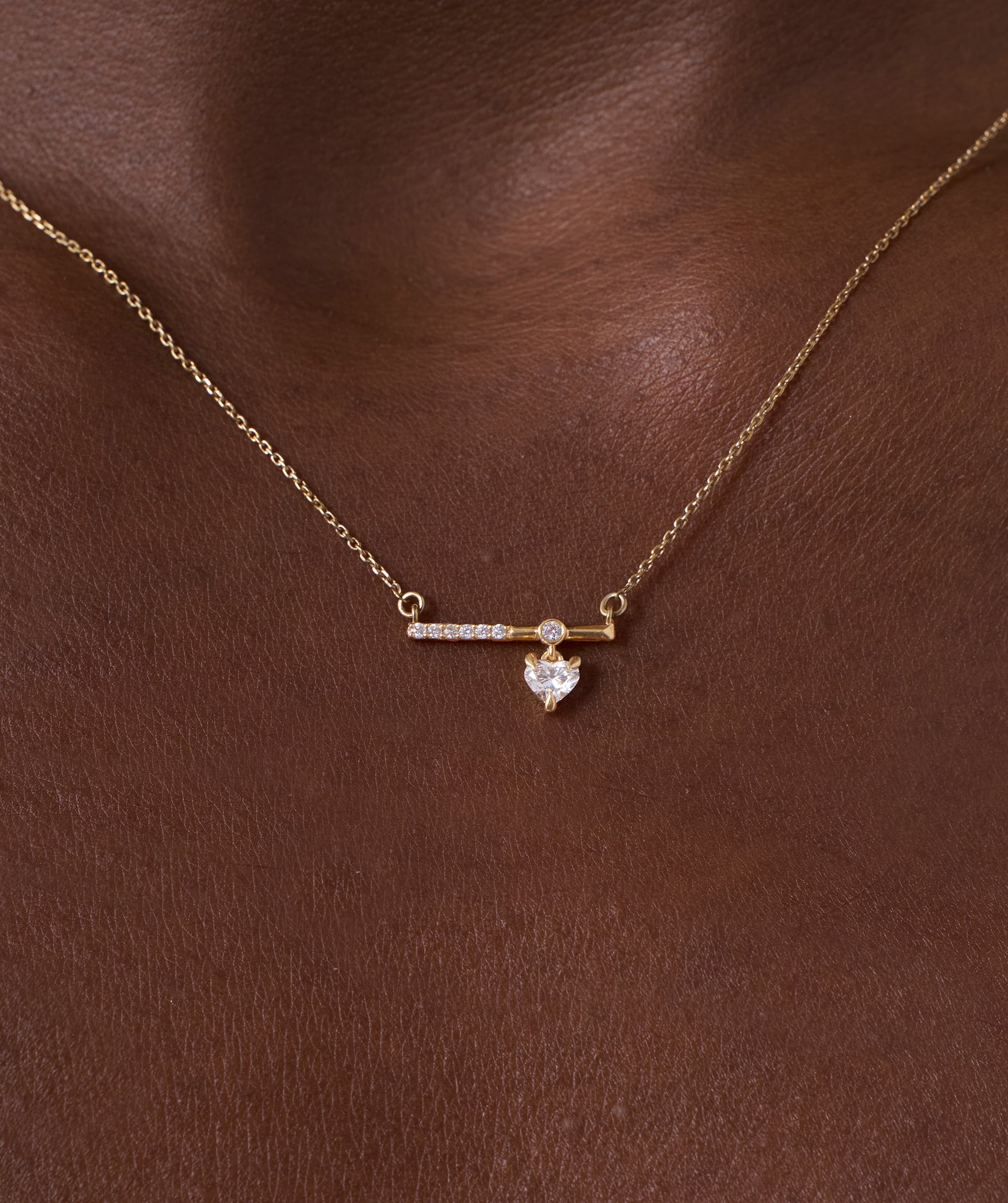 Why choose between sleek and sweet when you can have both? This architectural piece features an asymmetrical horizontal bar half set with sparkling pave diamonds, half polished gold anchored by a central bezel that holds a playful, dangling heart shaped diamond. Handcrafted in 14K solid gold and set with 0.22ct of G-color natural diamonds in a mix of prong and bezel settings, it offers a dynamic sense of movement and modern balance. The chain is adjustable from 16 to 18 inches, creating a captivating focal point that transitions effortlessly from office tailoring to evening silk. Available in yellow, white, and rose gold to suit your style.