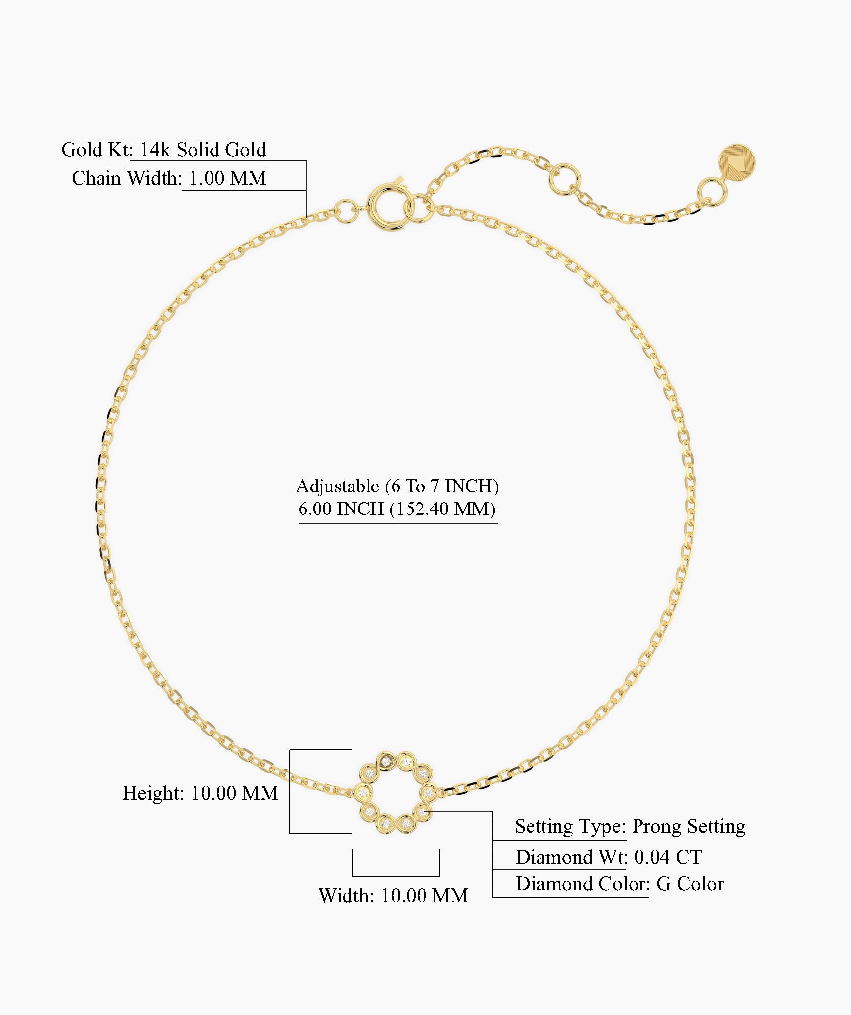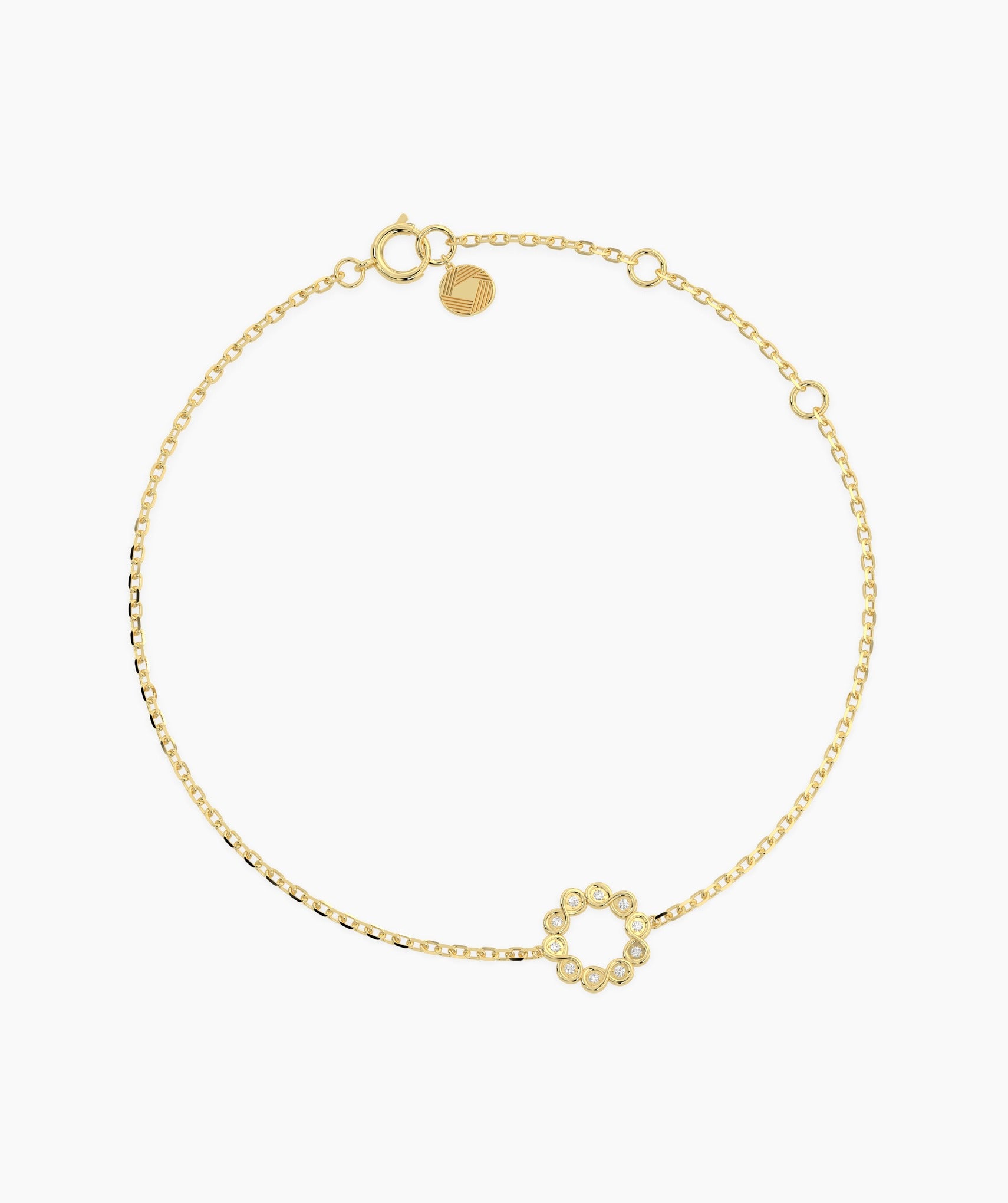 A delicate loop of light for your wrist, this bracelet reimagines the classic circle motif with a textured, scalloped edge. The open circle design is formed by a cluster of bezel set natural diamonds, creating a "bubble" effect that feels both playful and refined. Set on a whisper thin chain in 14K solid gold, it is designed to float against your skin, making it the ultimate low profile piece for daily wear. Whether worn solo as a subtle hint of sparkle or stacked with heavy cuffs for contrast, this bracelet adapts to every version of you. Available in yellow, white, and rose gold.