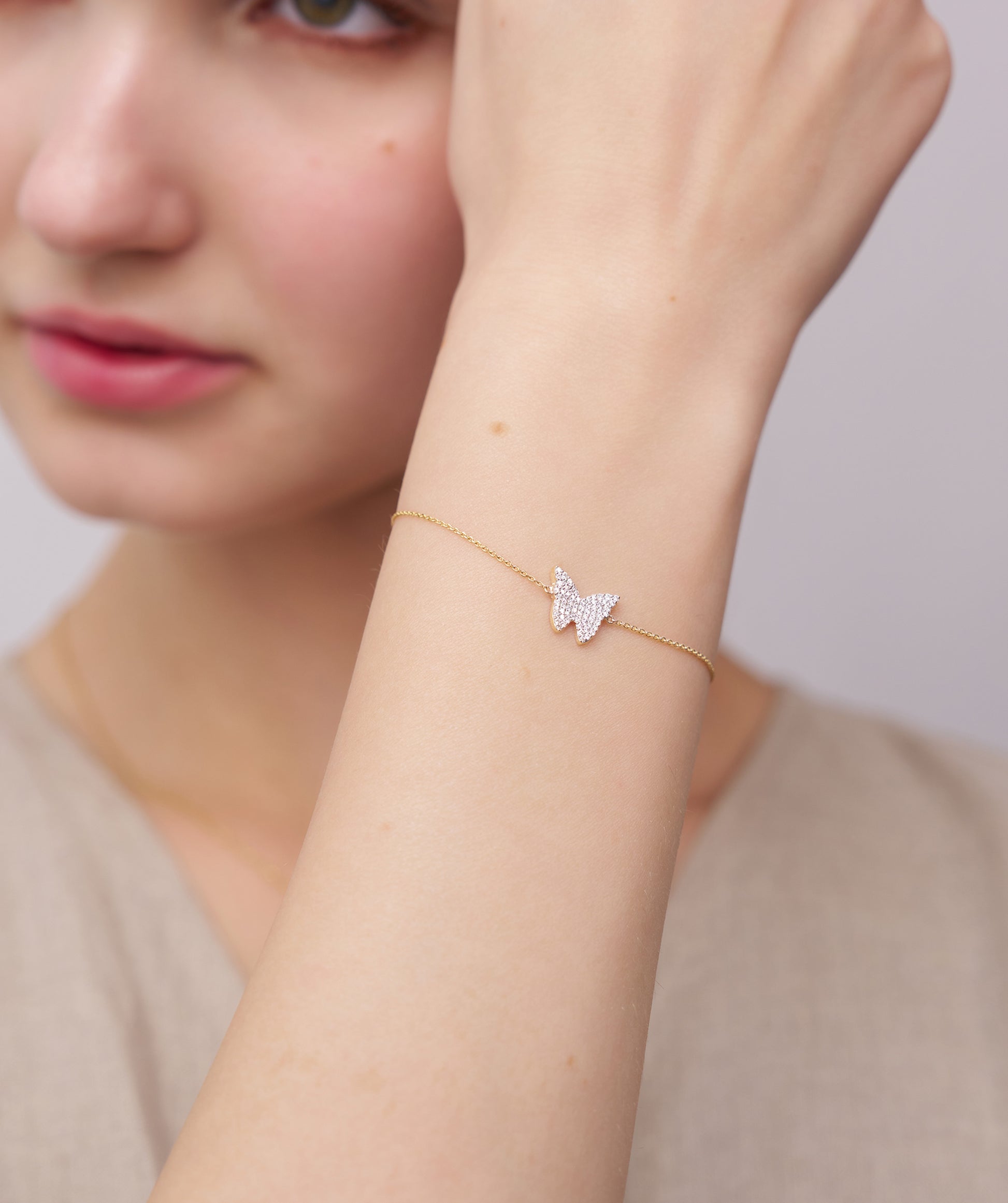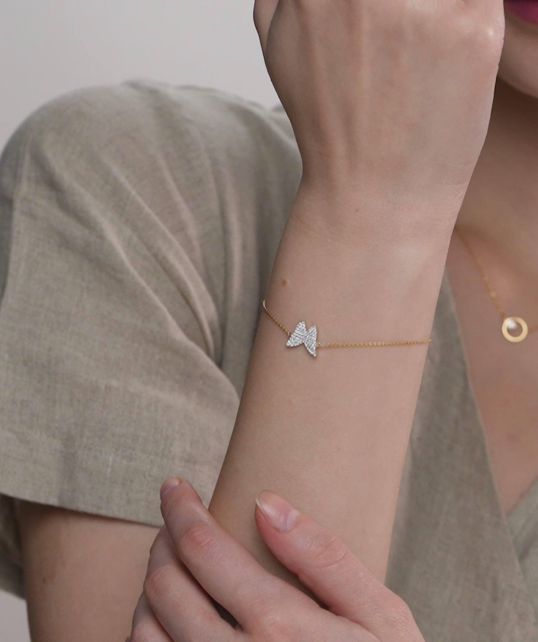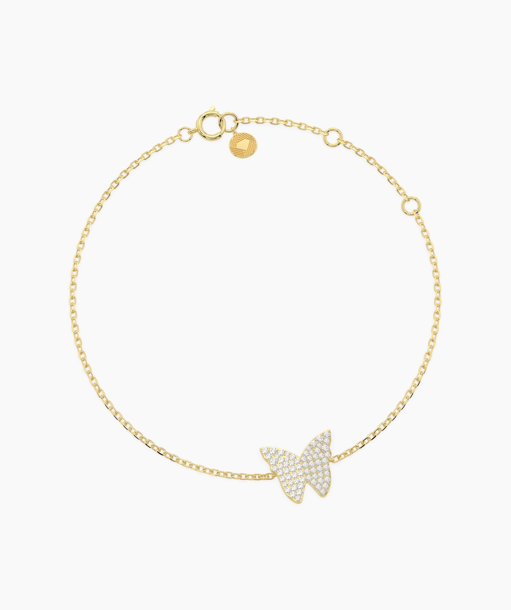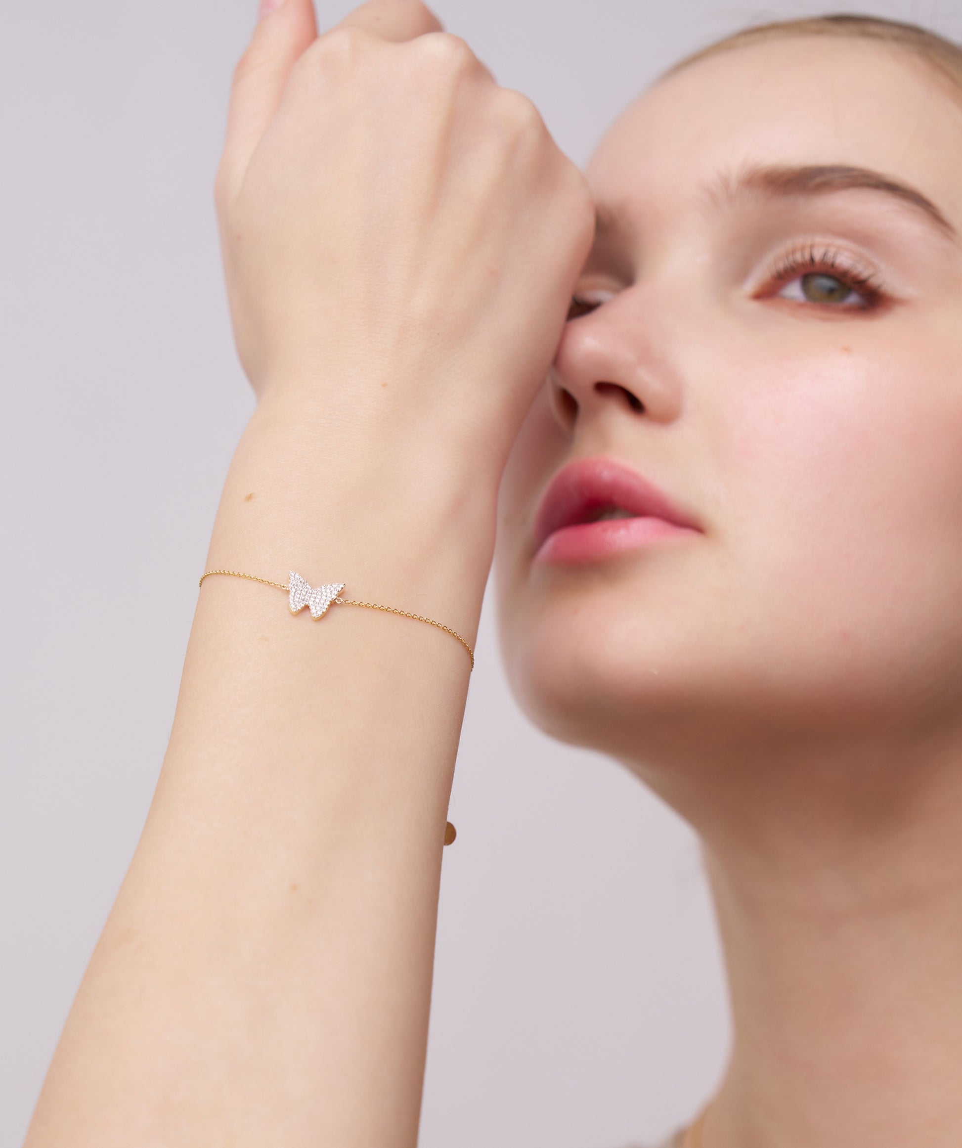 A dainty gold butterfly bracelet adorned with sparkling pavé diamonds, symbolizing transformation and grace.