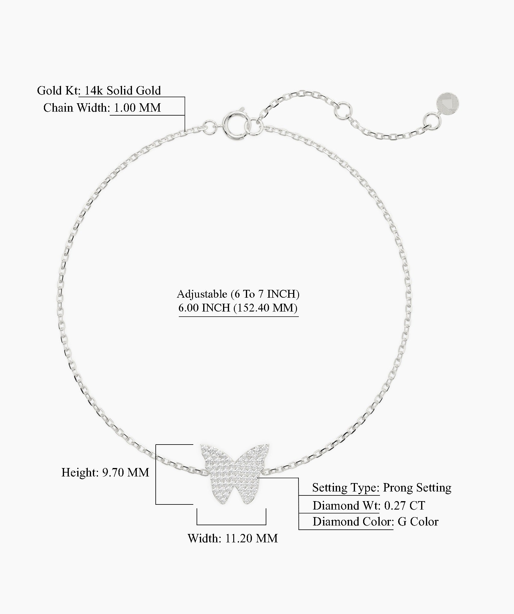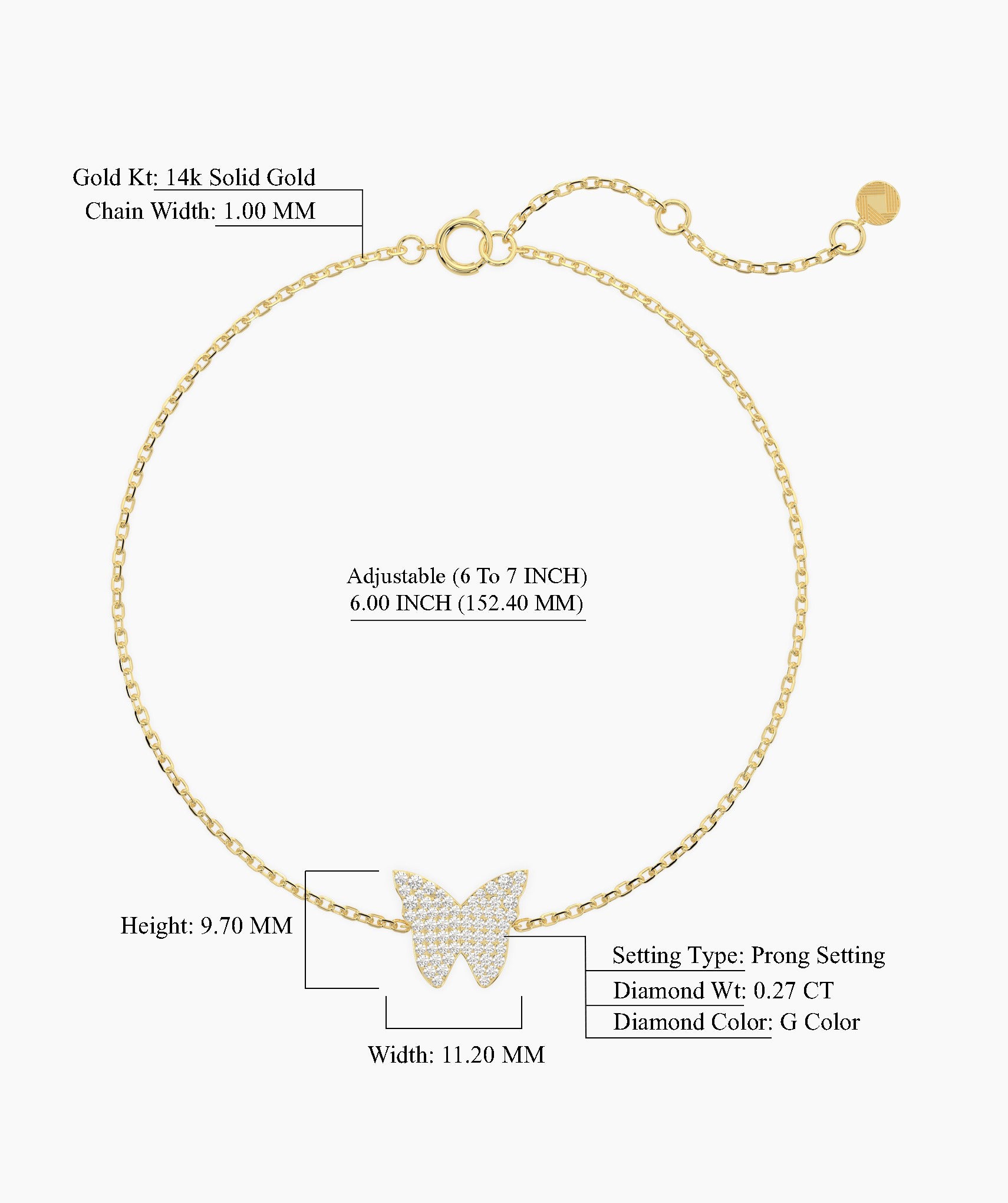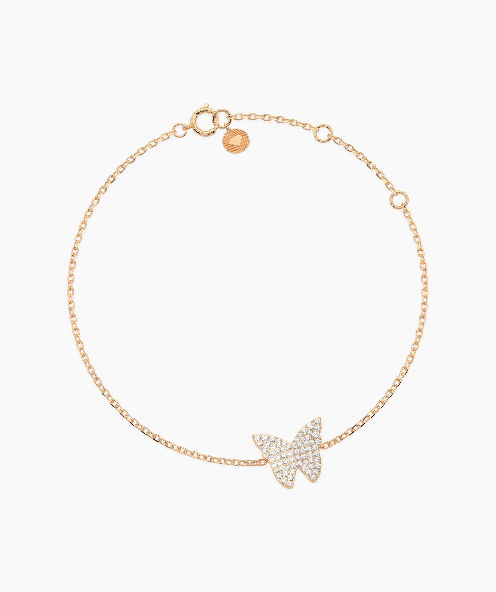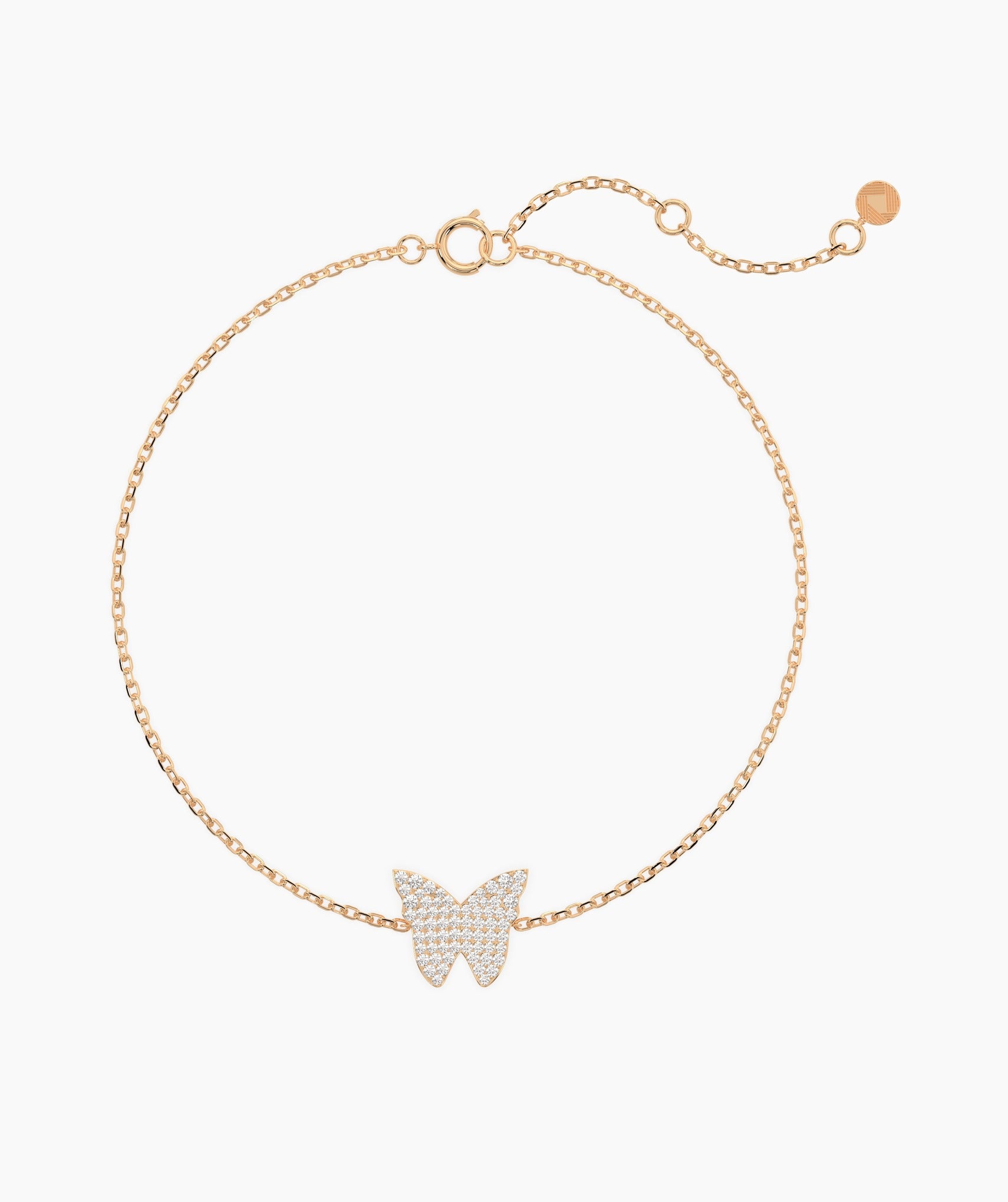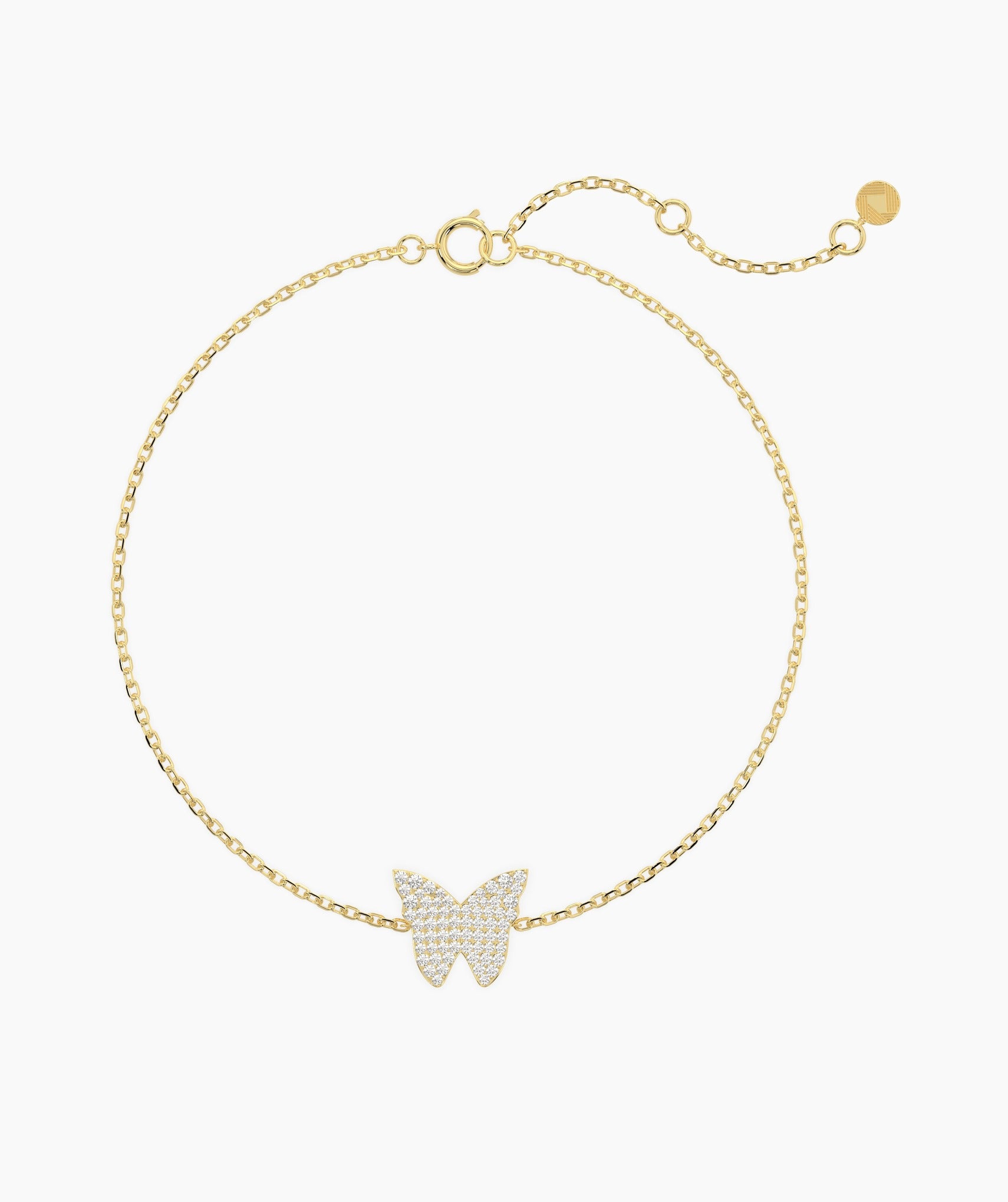 A dainty gold butterfly bracelet adorned with sparkling pavé diamonds, symbolizing transformation and grace.