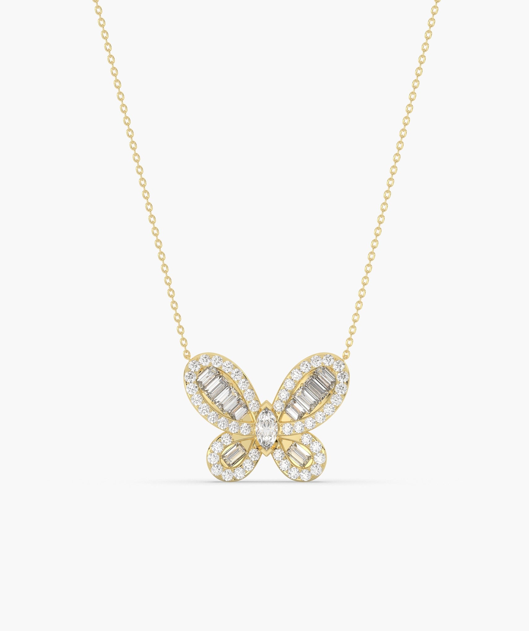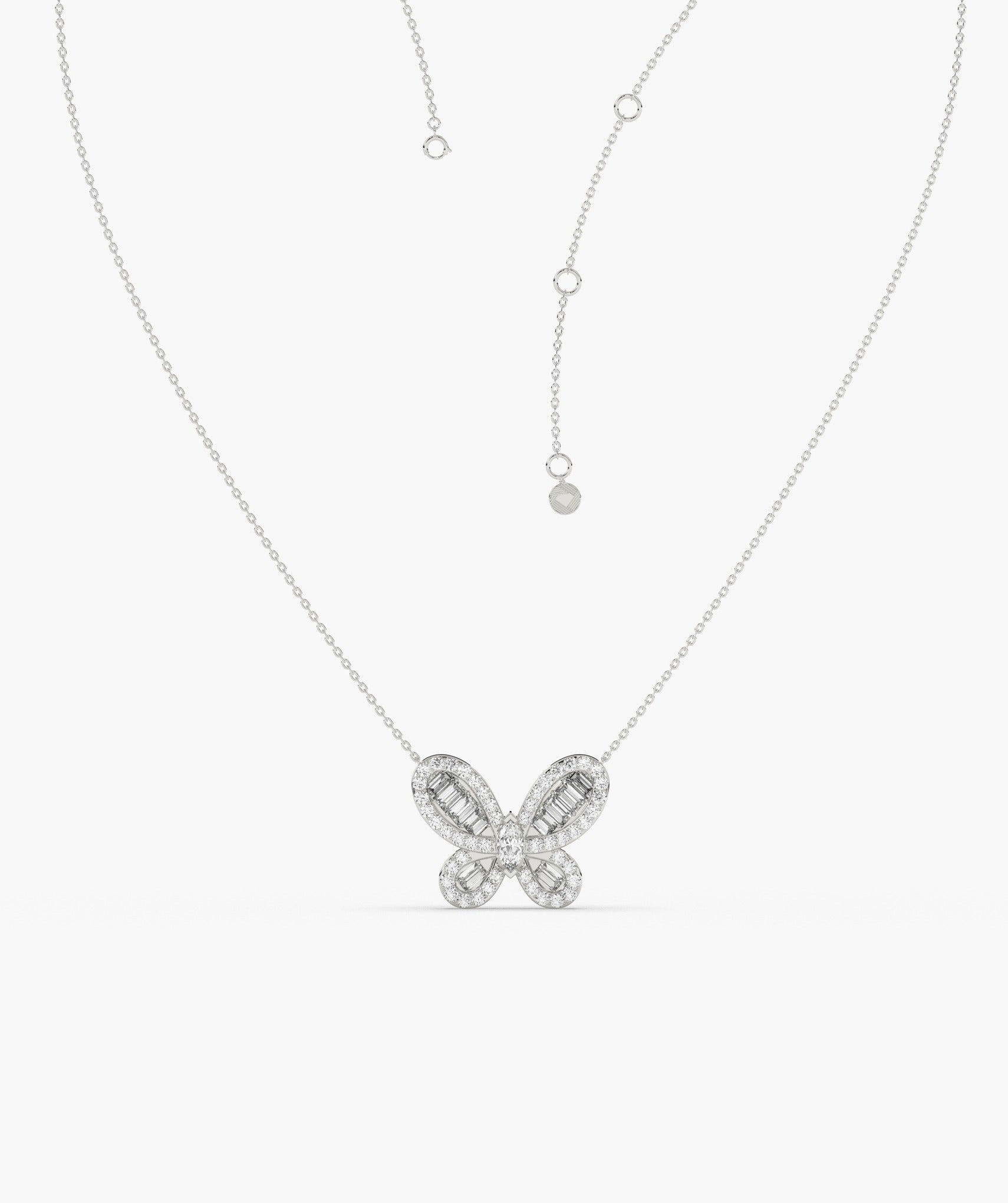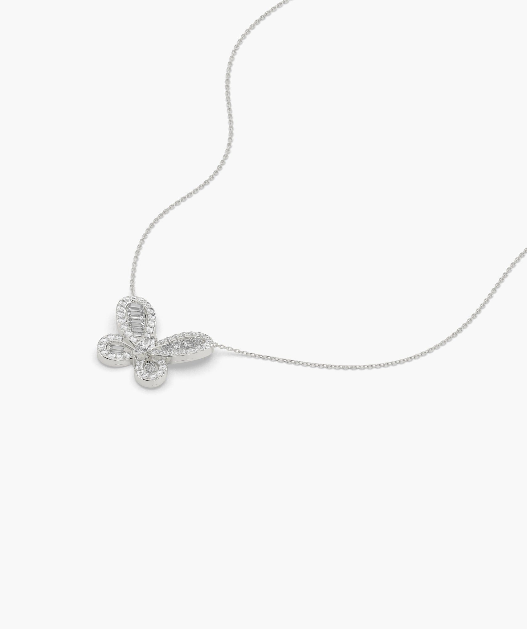 Delicate and dazzling, this 14K white gold necklace features a graceful butterfly pendant adorned with shimmering baguette and round-cut diamonds. A symbol of transformation and beauty, perfect for everyday elegance or a thoughtful gift.
