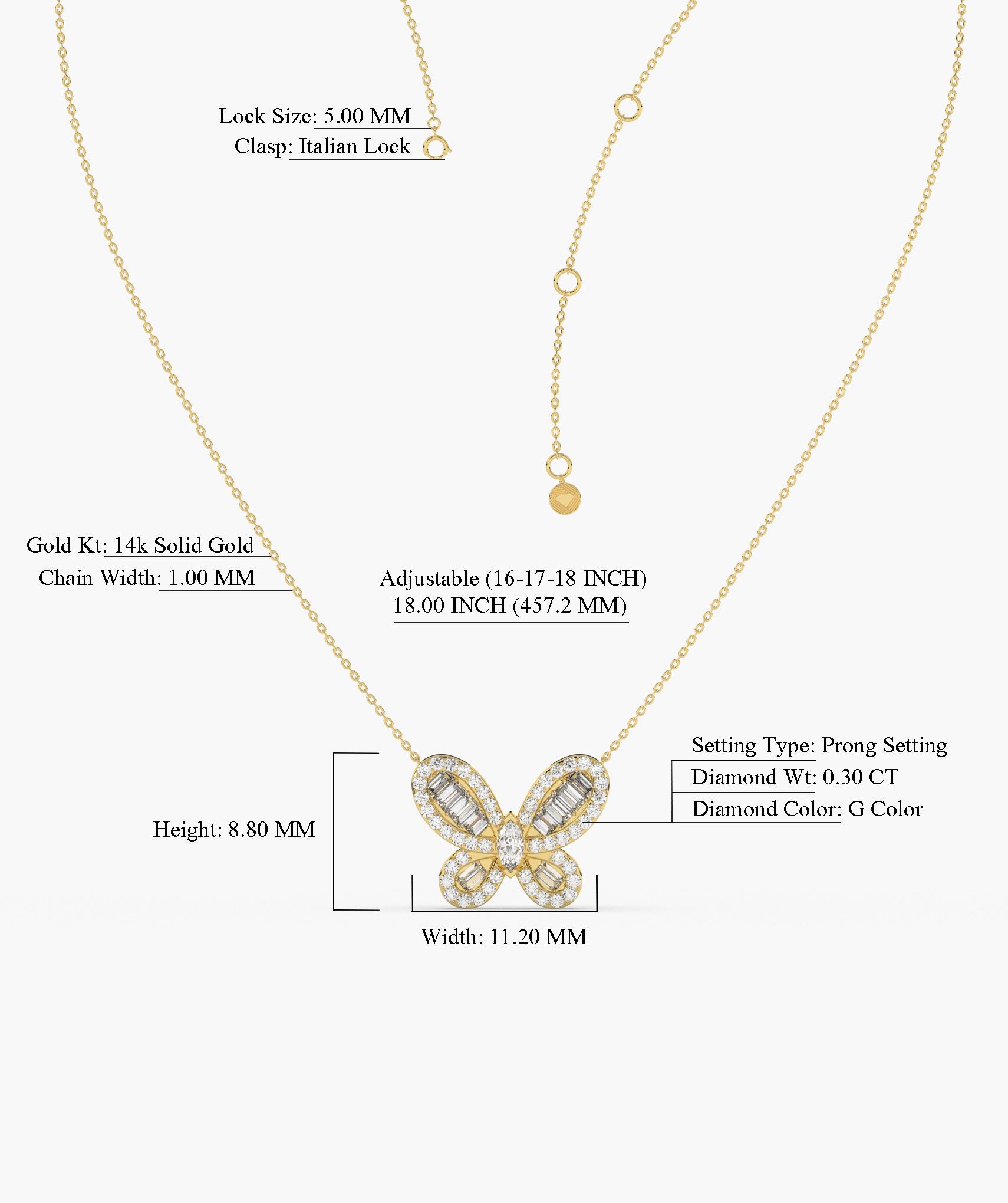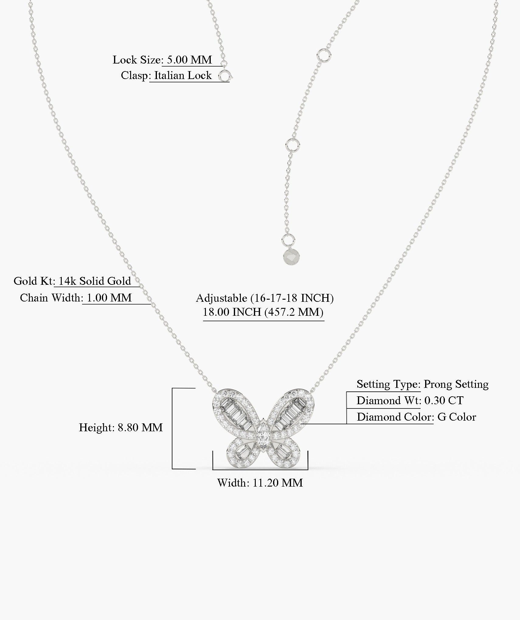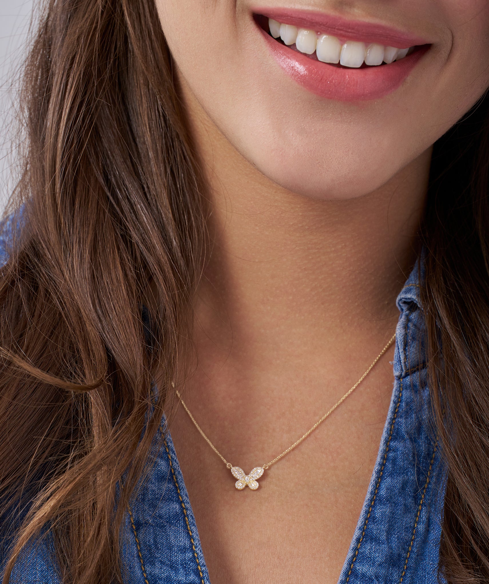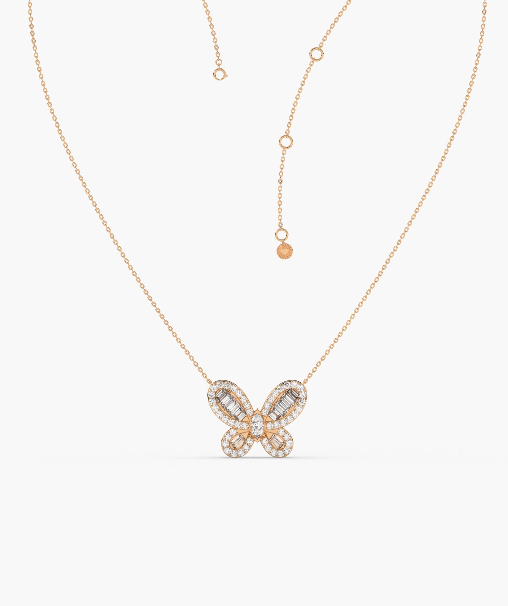 Delicate and dazzling, this 14K white gold necklace features a graceful butterfly pendant adorned with shimmering baguette and round-cut diamonds. A symbol of transformation and beauty, perfect for everyday elegance or a thoughtful gift.