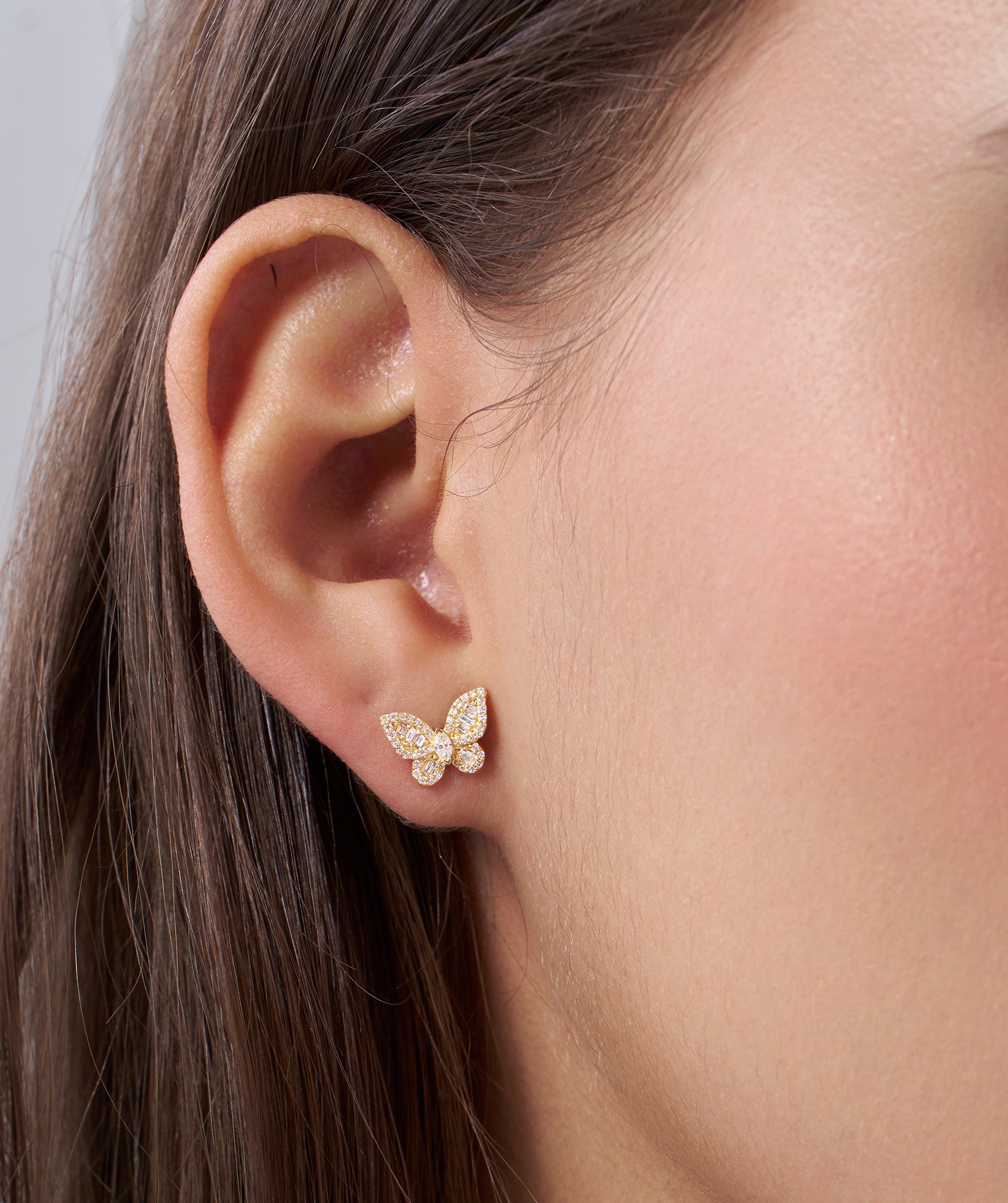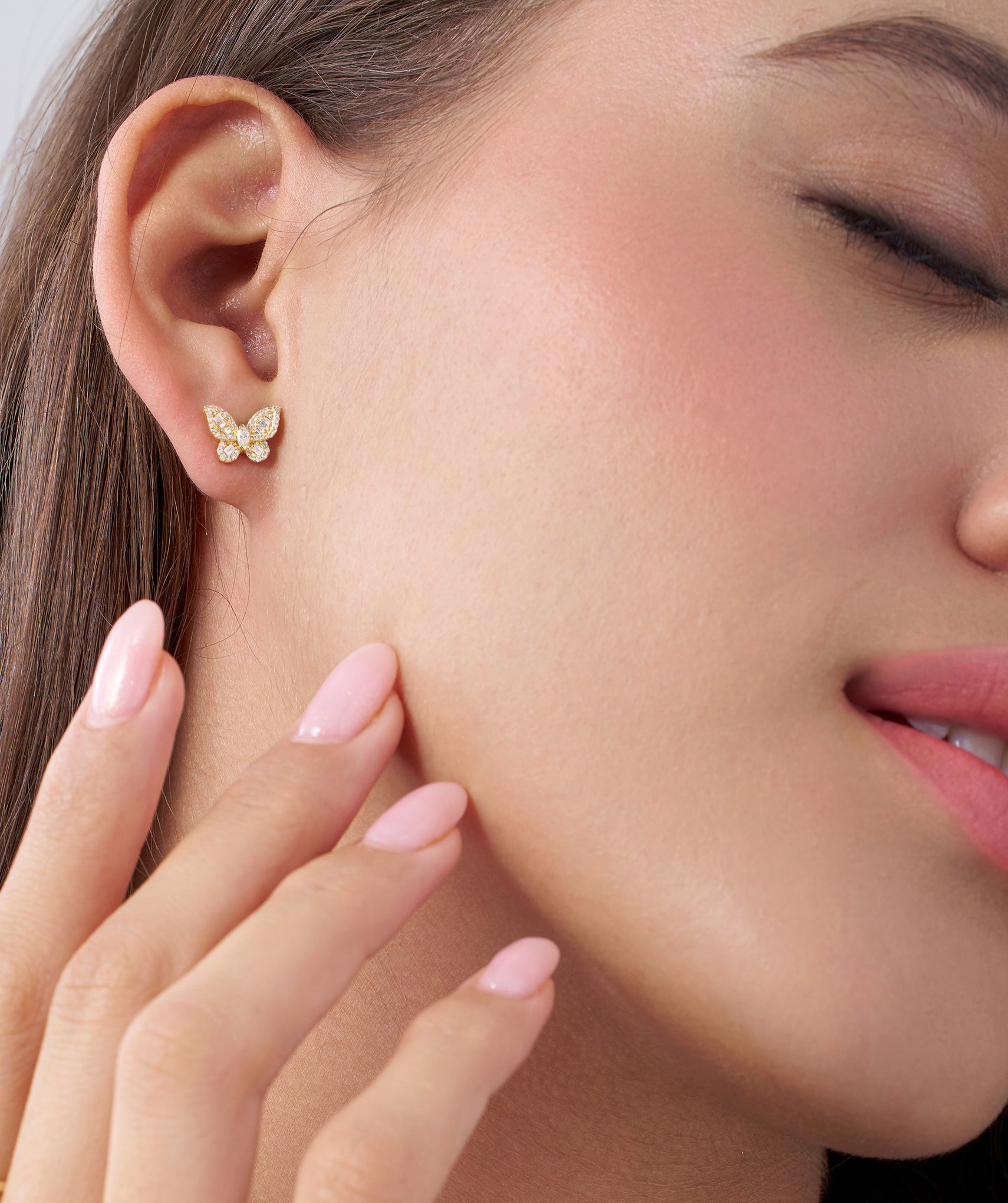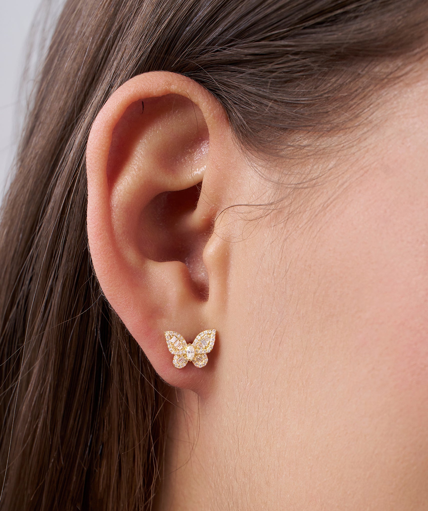 Wear a symbol of transformation that shines as bright as you do. These intricate studs are crafted in 14K solid gold and feature a stunning mosaic of natural diamonds blending baguette wings, a marquise center, and a halo of round stones for 0.49 carats of total brilliance. The mix of cuts creates a textured, light catching effect that feels both playful and refined. Secured with comfortable push backs and a detailed prong setting, they are dainty enough for daily wear yet detailed enough to spark conversation. Whether you’re pairing them with a silk blouse for work or a denim jacket for the weekend, they add a touch of whimsy to your look. Available in yellow, white, and rose gold to suit your personal style.