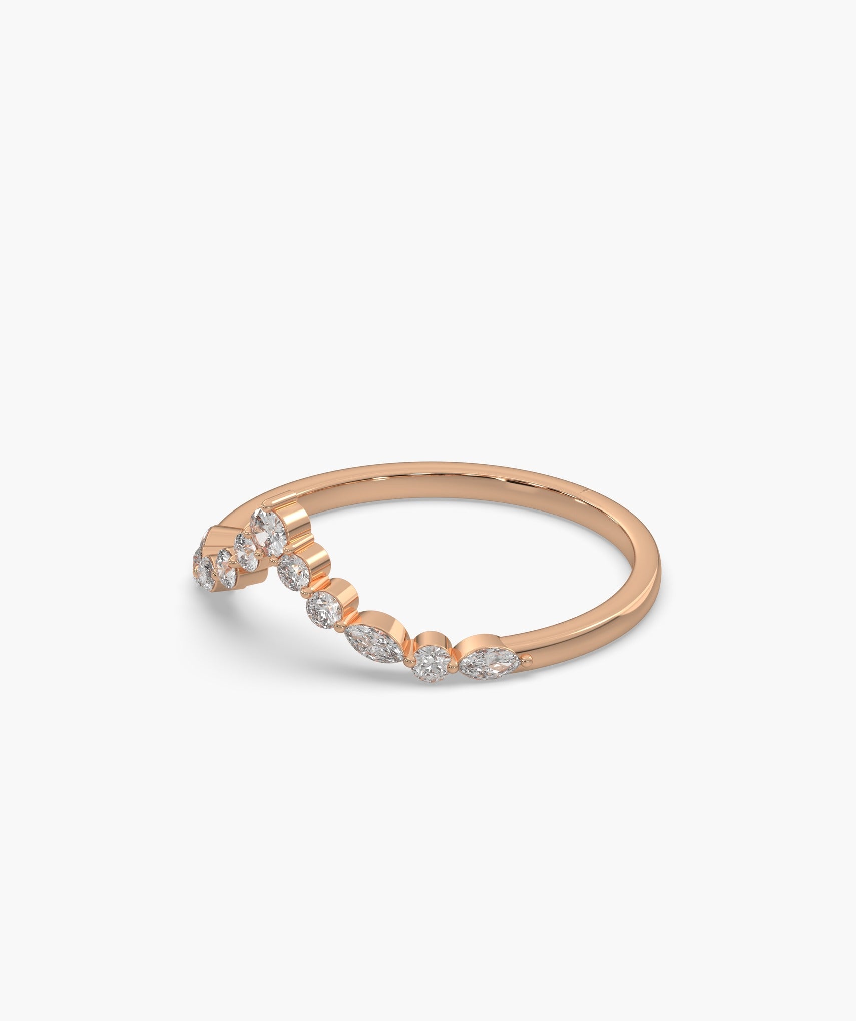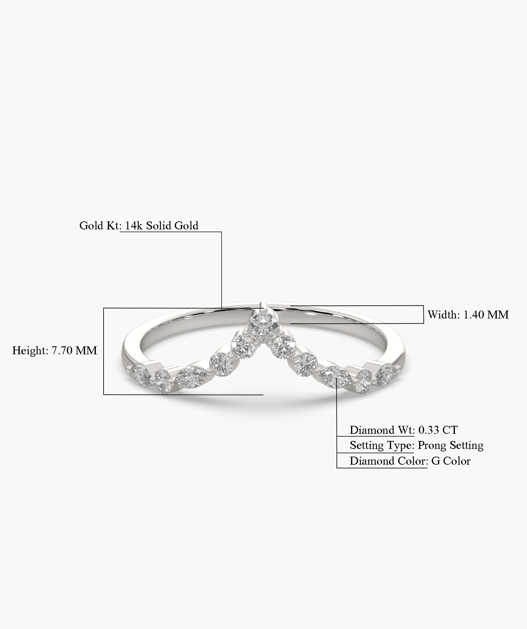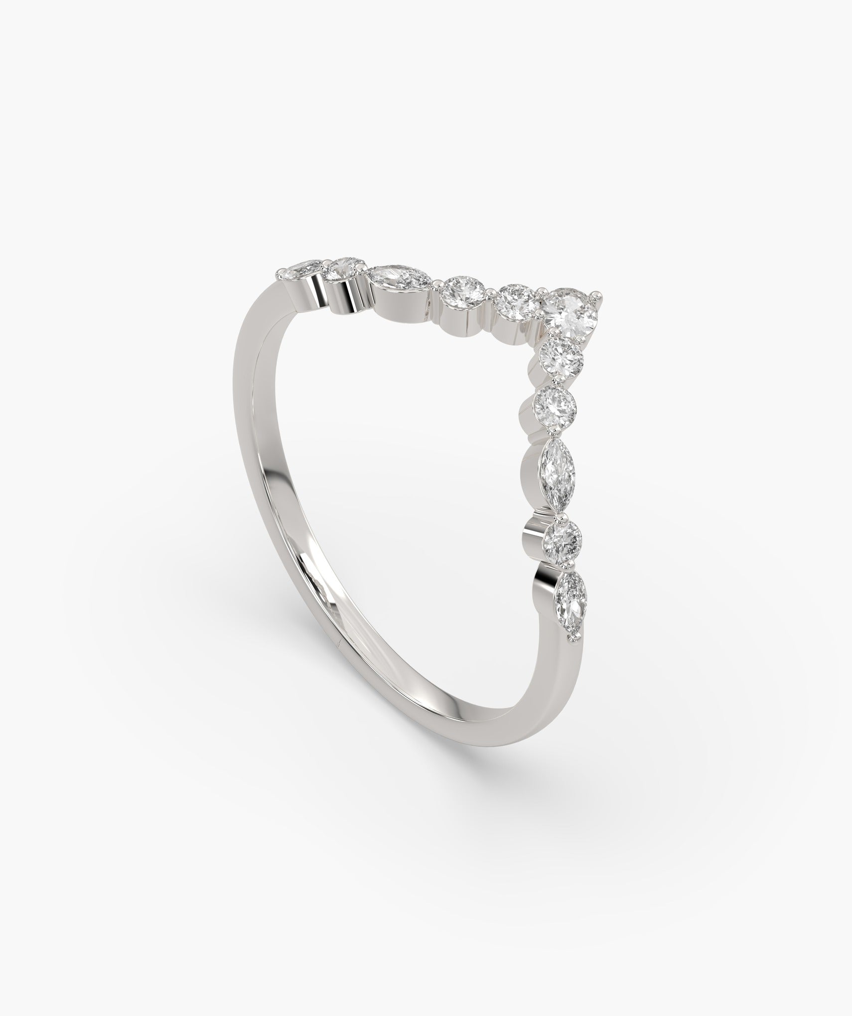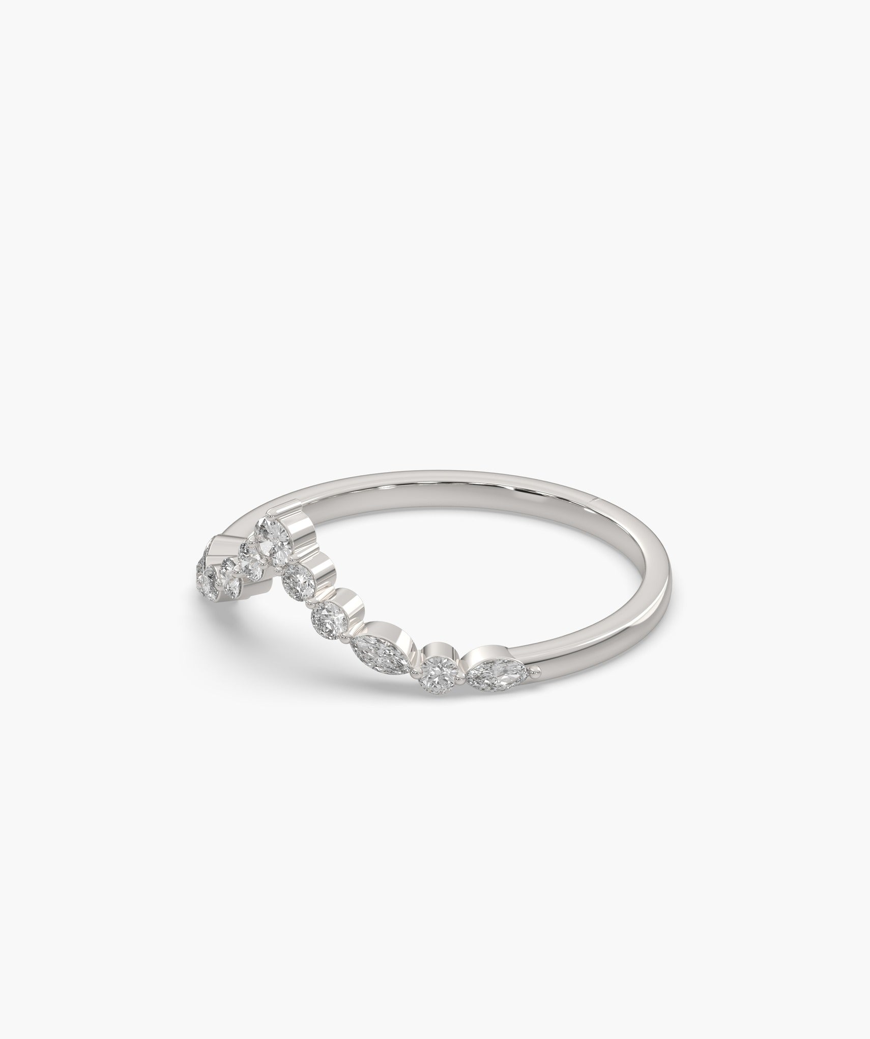 A sleek chevron-style band crafted in 14K white gold, adorned with round brilliant diamonds for a modern, elegant contour. Perfect as a wedding band or a unique stackable piece.