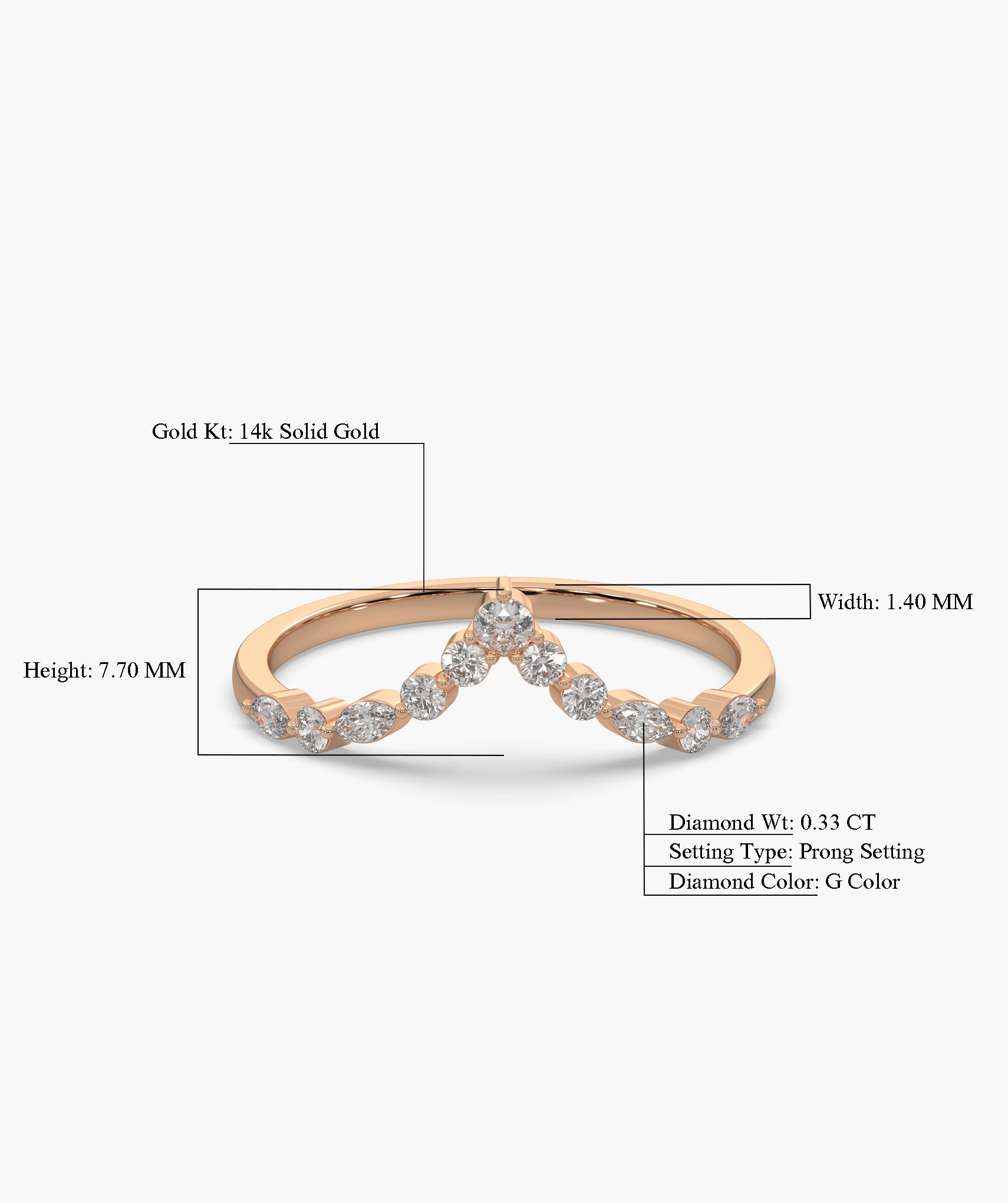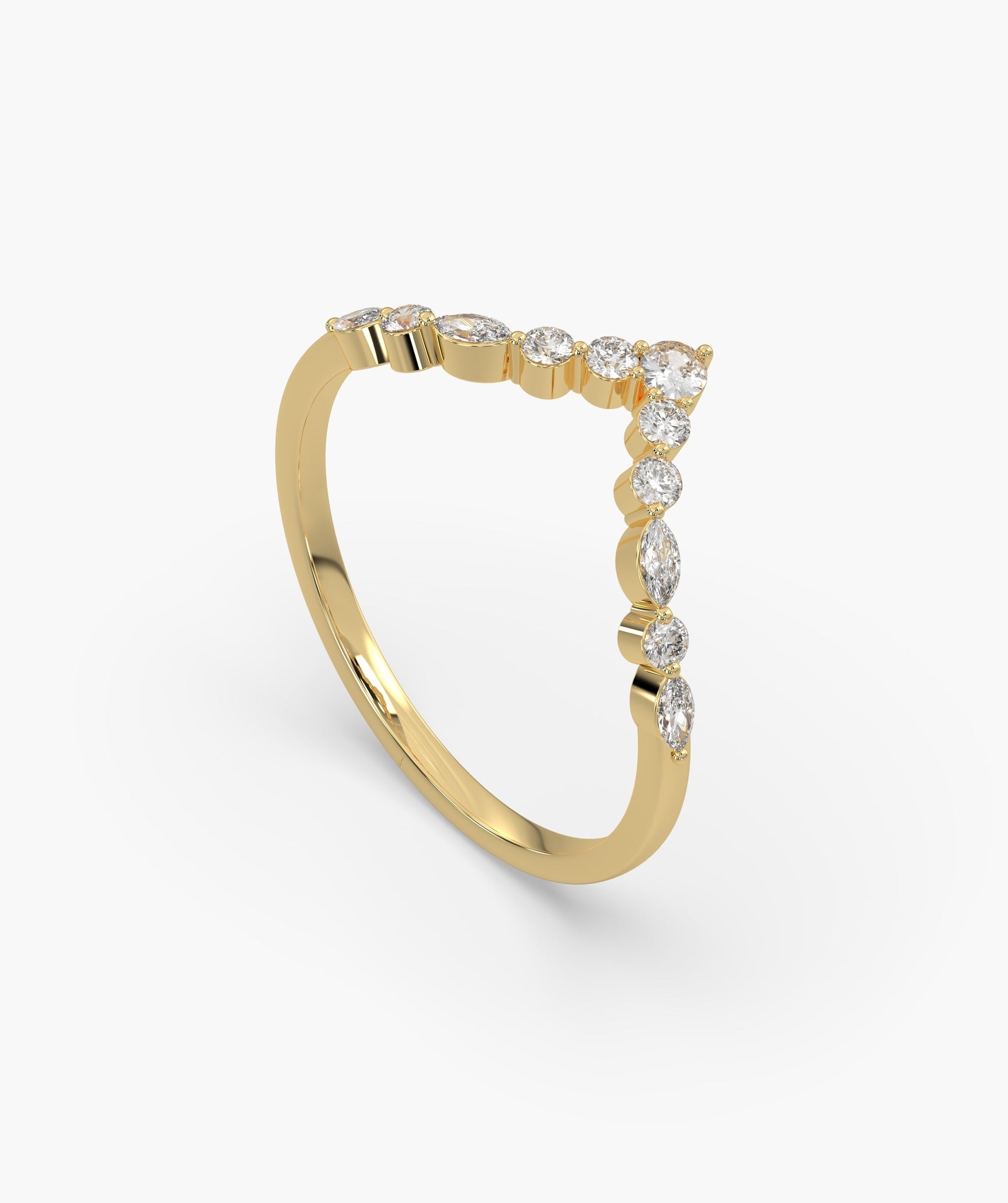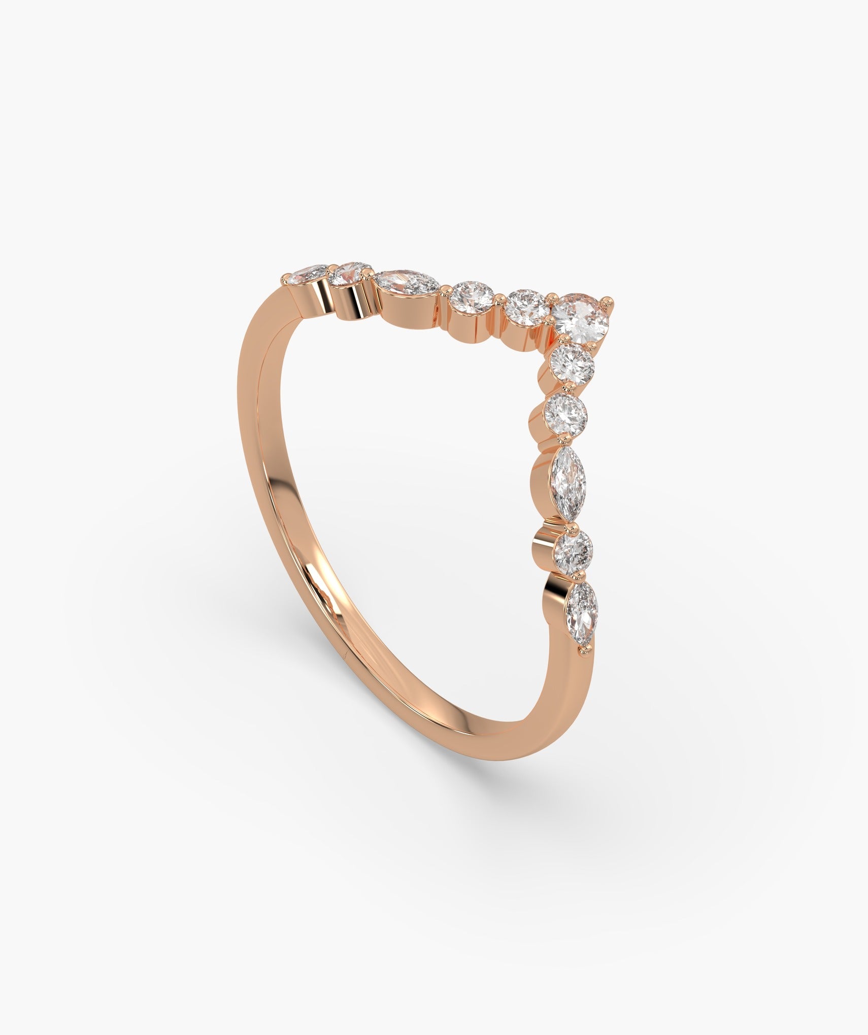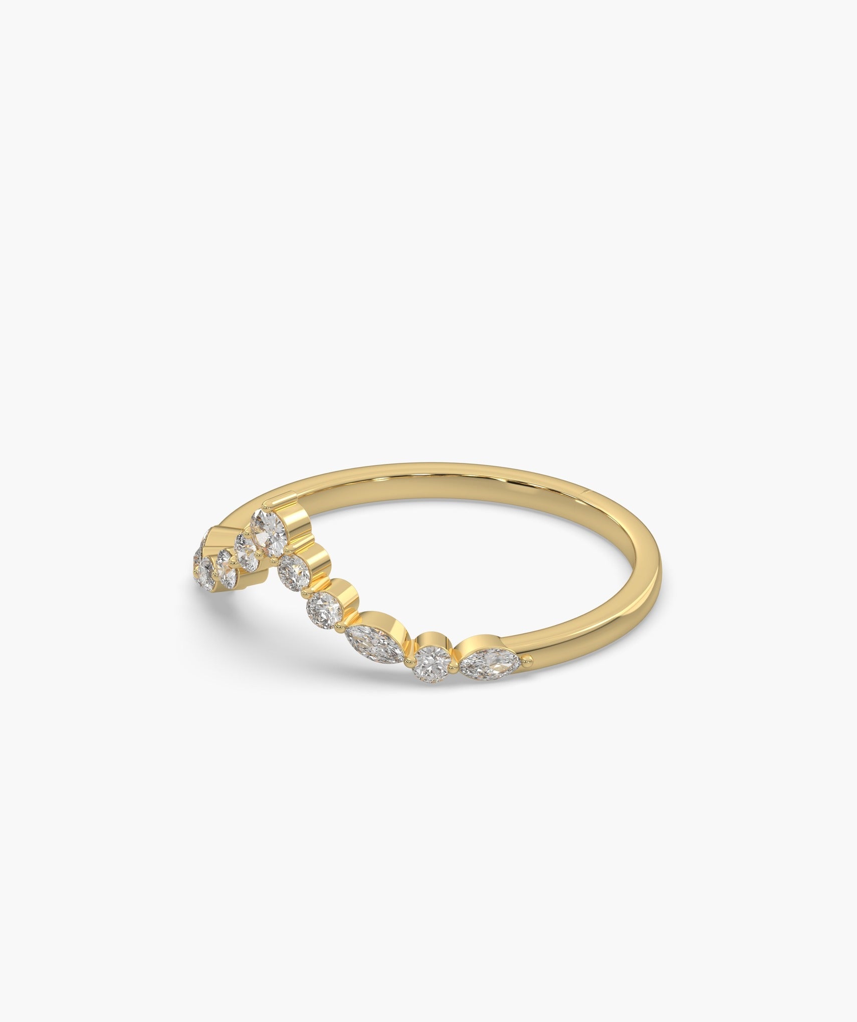 A sleek chevron-style band crafted in 14K white gold, adorned with round brilliant diamonds for a modern, elegant contour. Perfect as a wedding band or a unique stackable piece.
