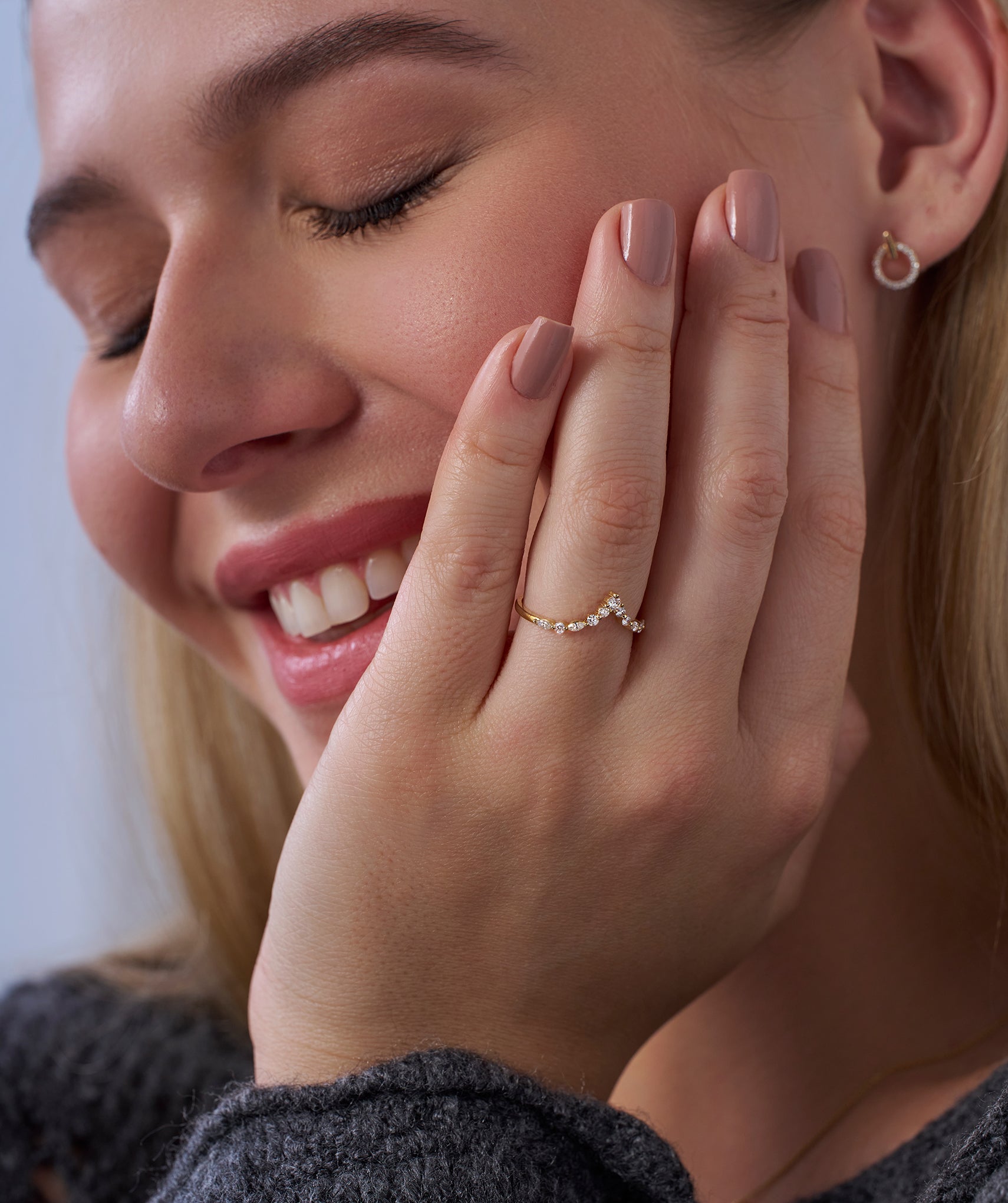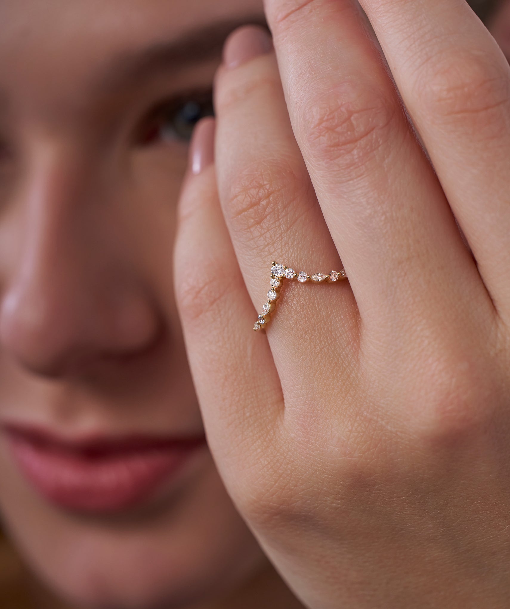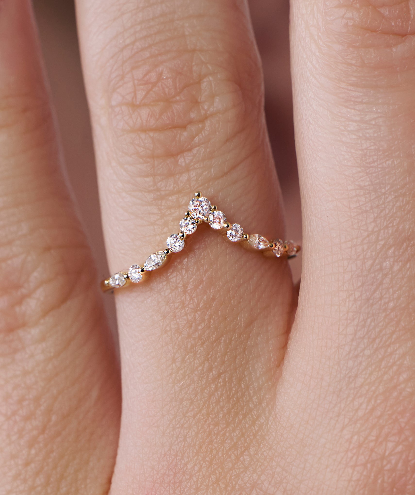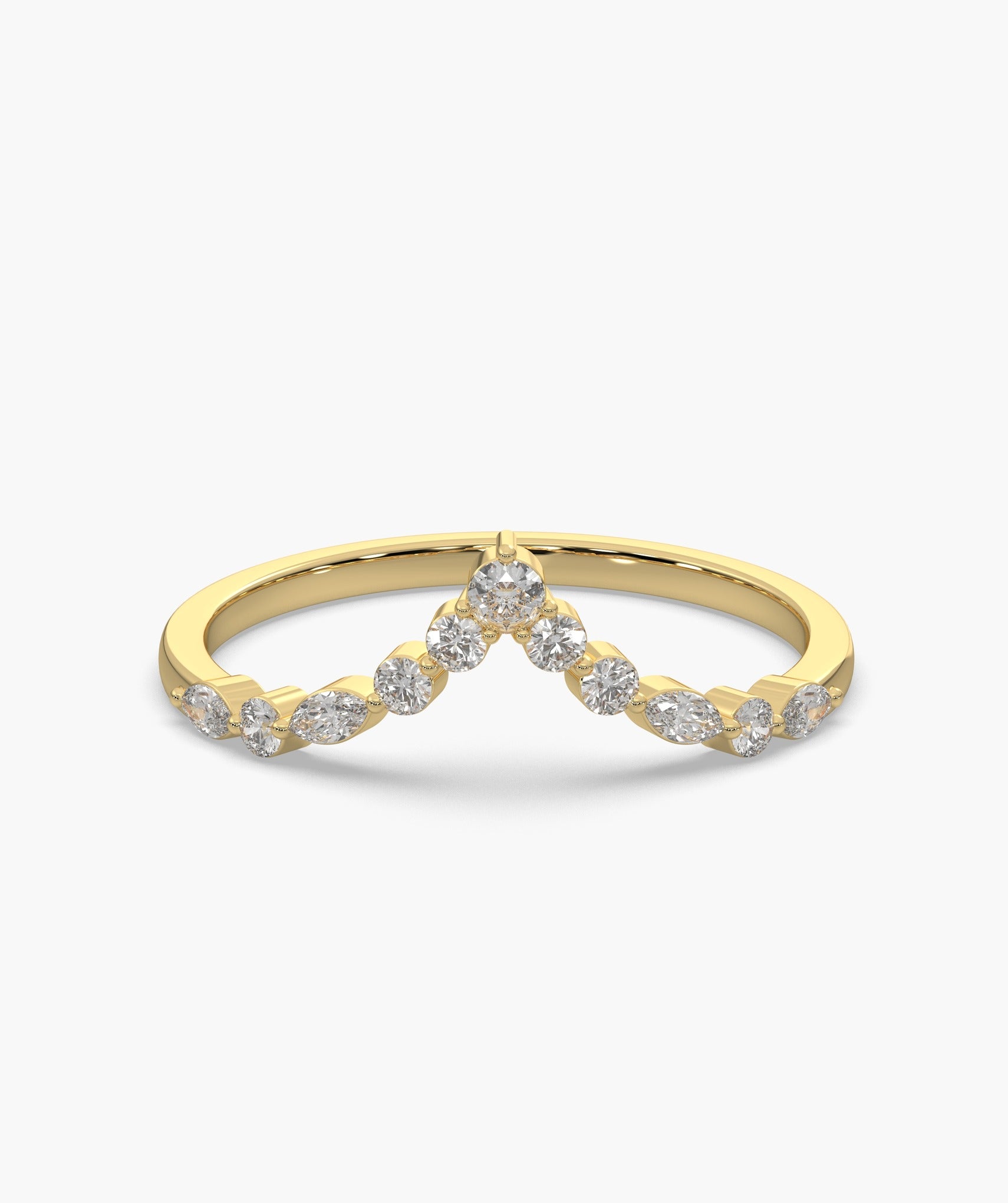 A sleek chevron-style band crafted in 14K white gold, adorned with round brilliant diamonds for a modern, elegant contour. Perfect as a wedding band or a unique stackable piece.