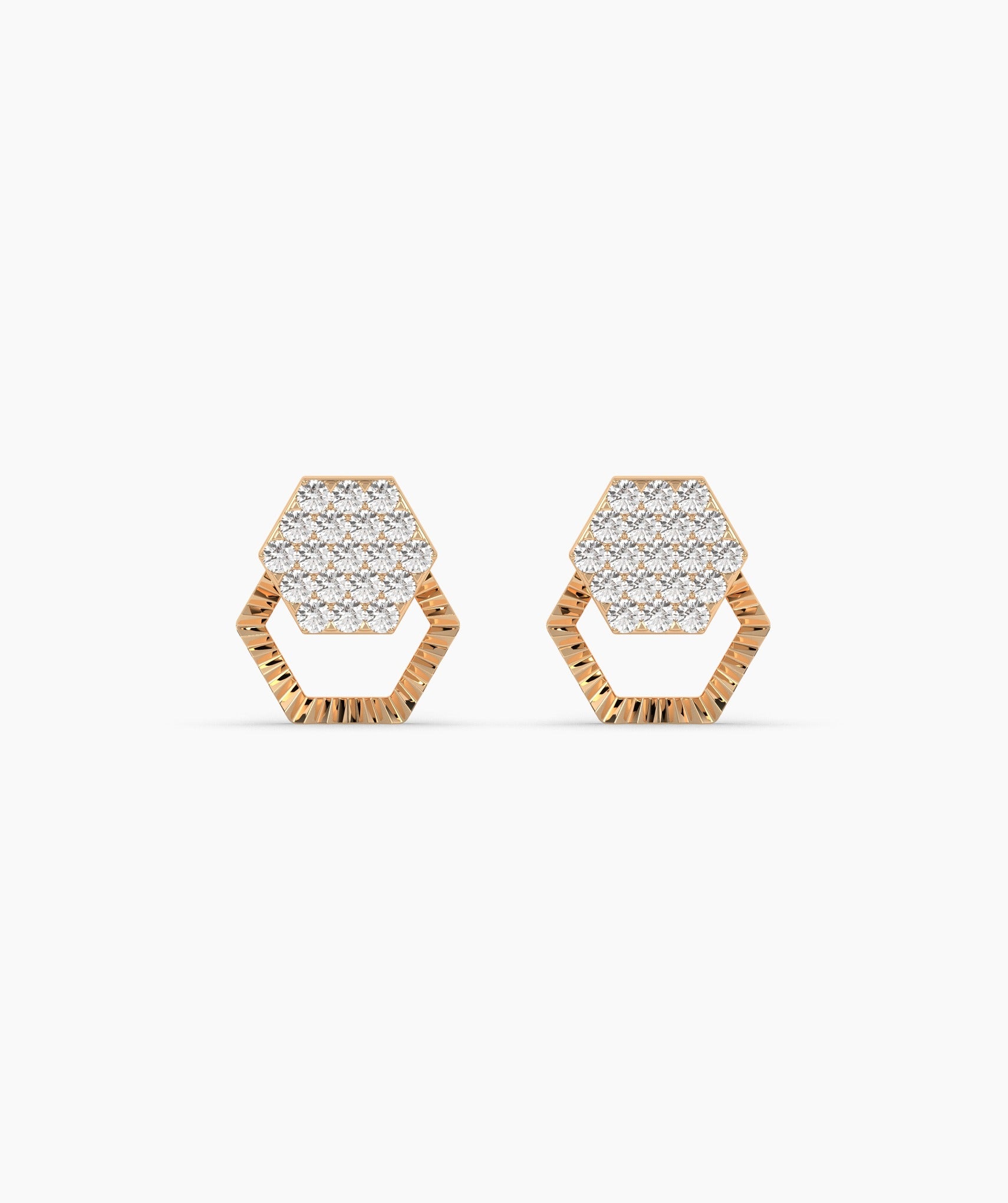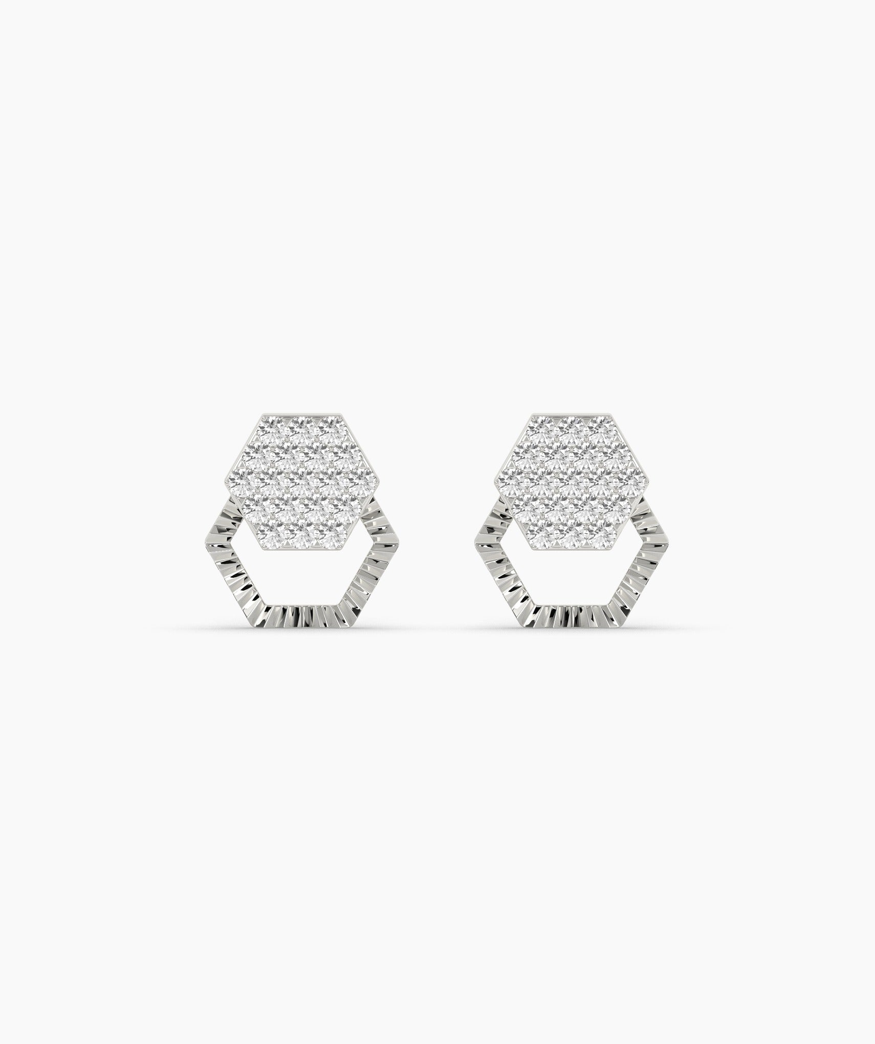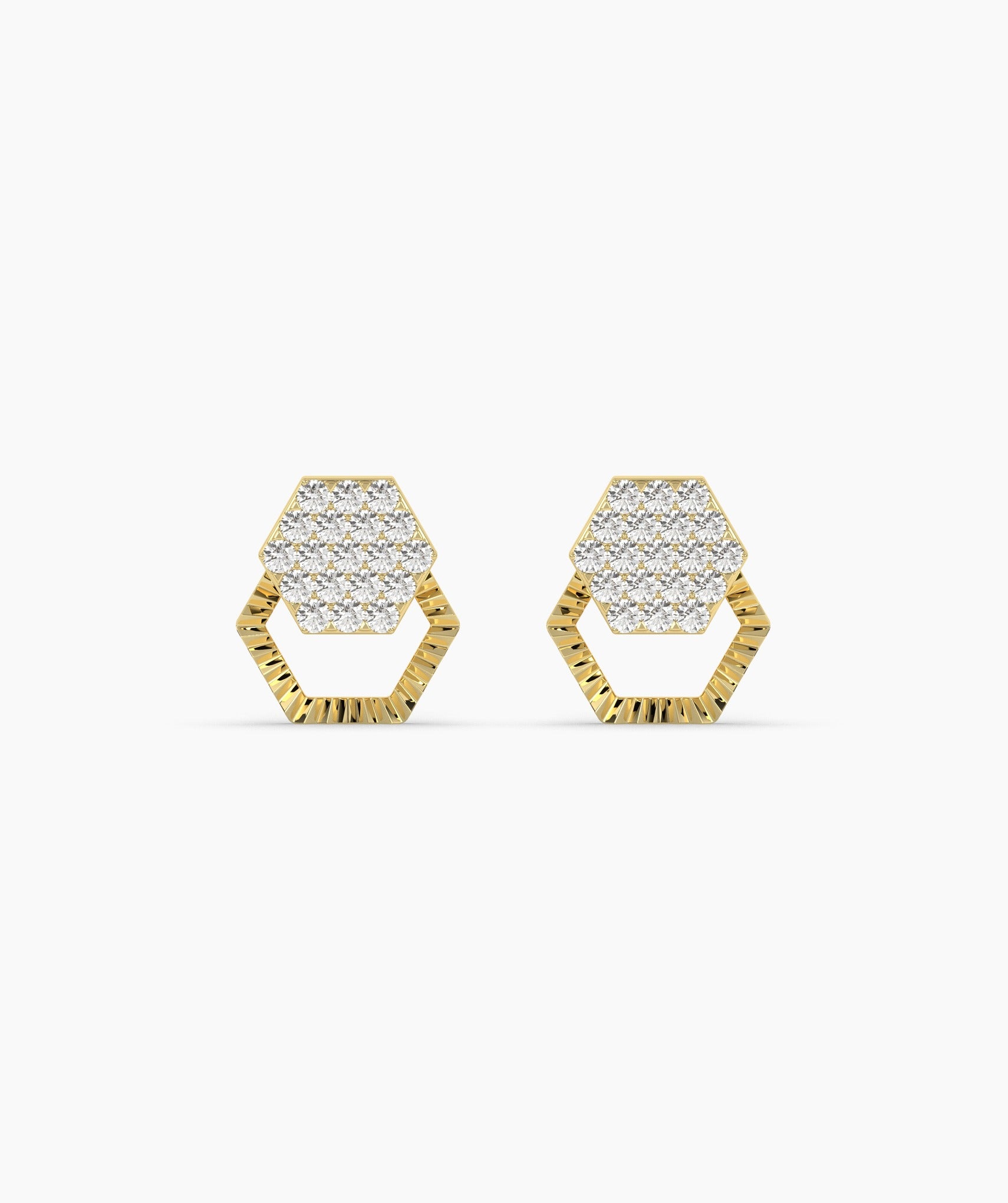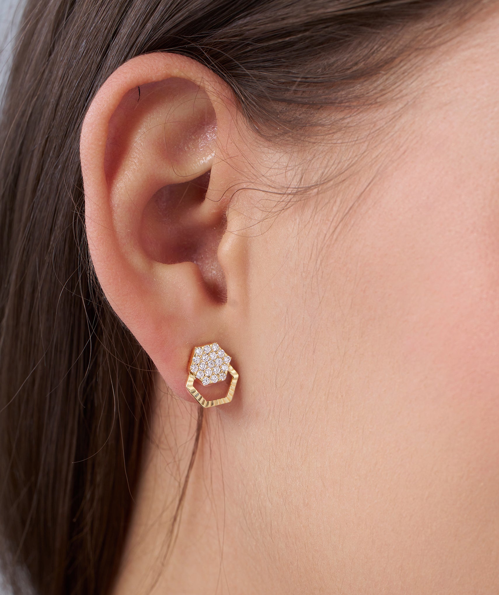 Stunning 14K gold earrings featuring a diamond-paved hexagon design paired with a sleek open-frame hexagon for a modern and elegant touch.