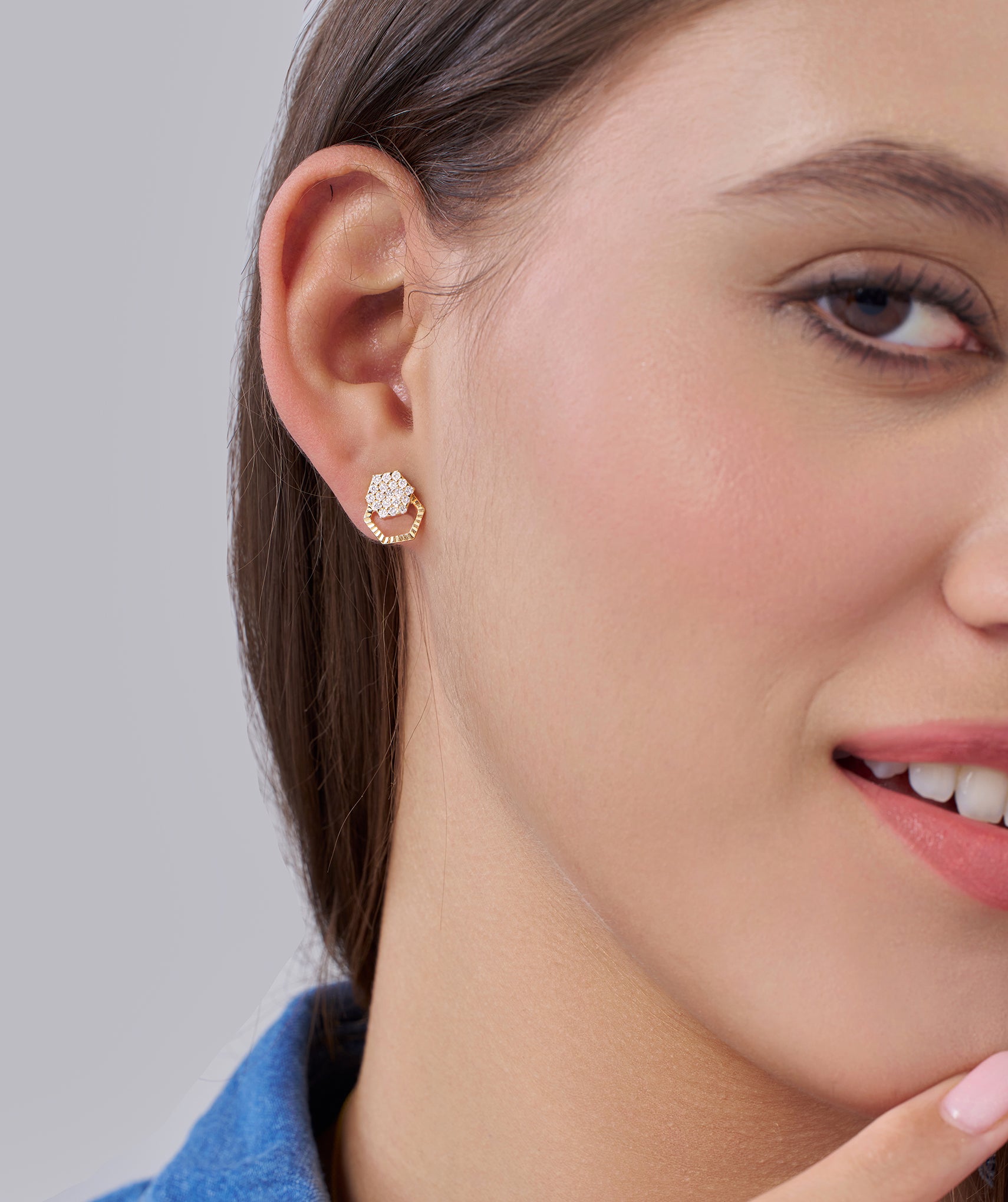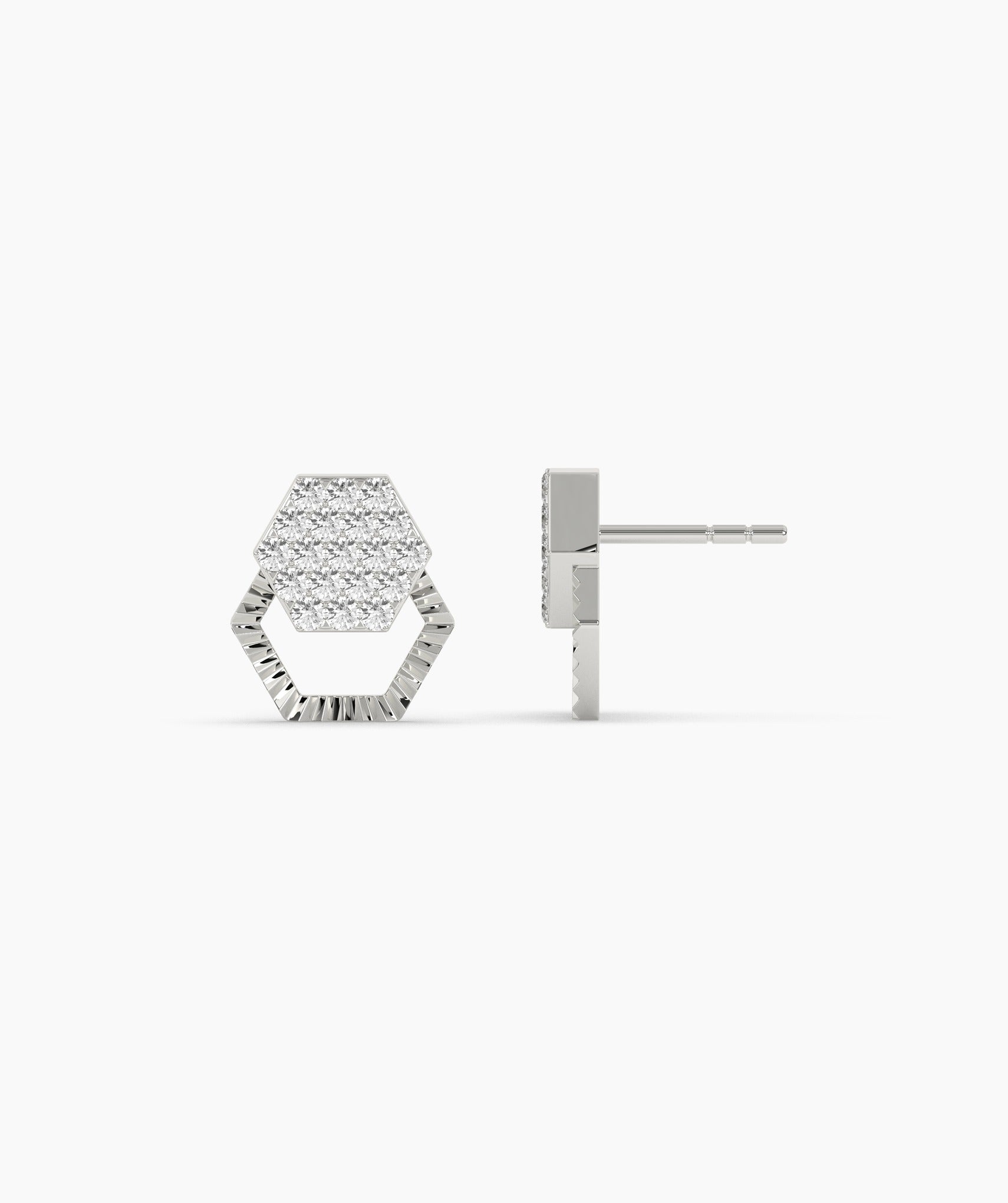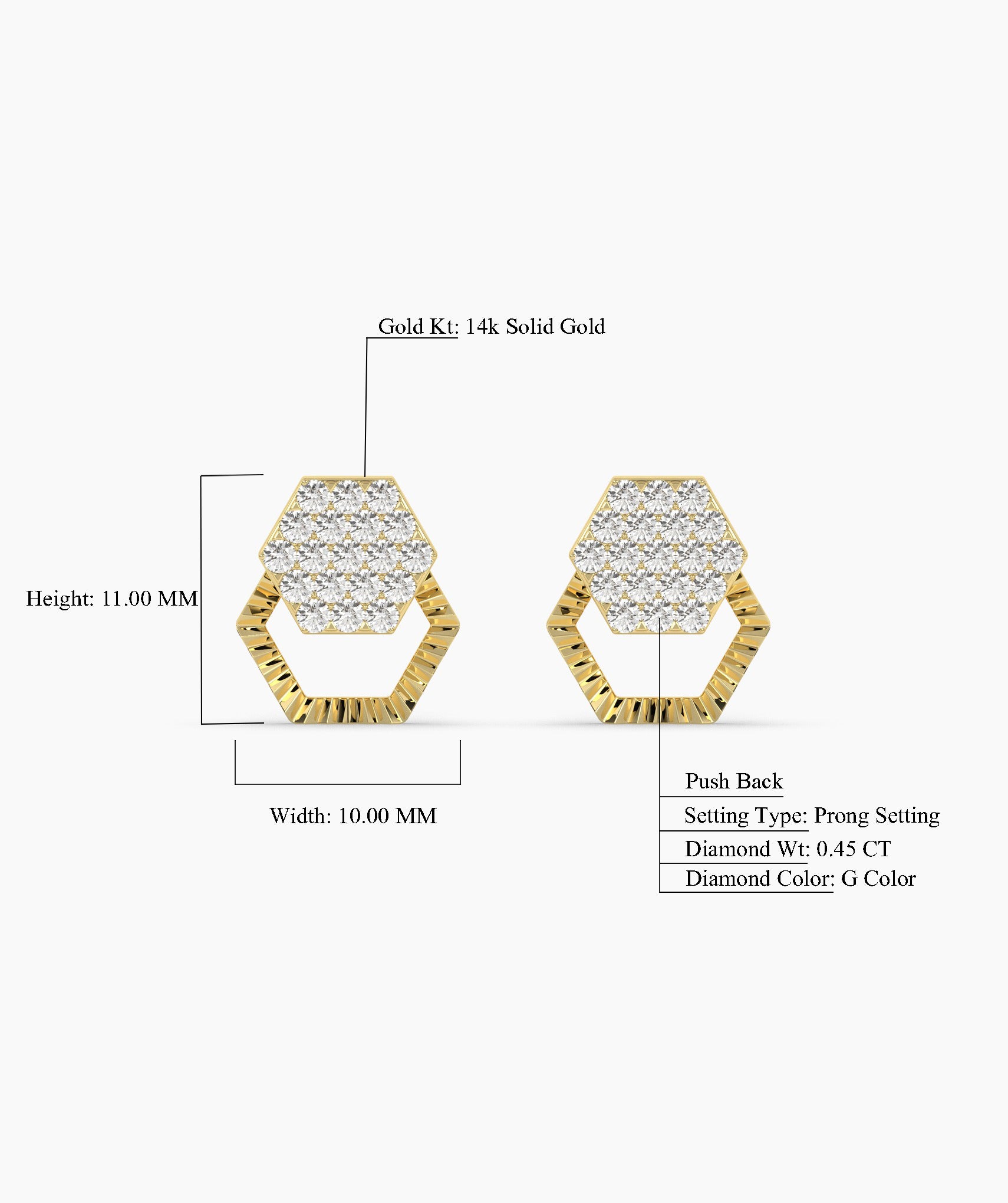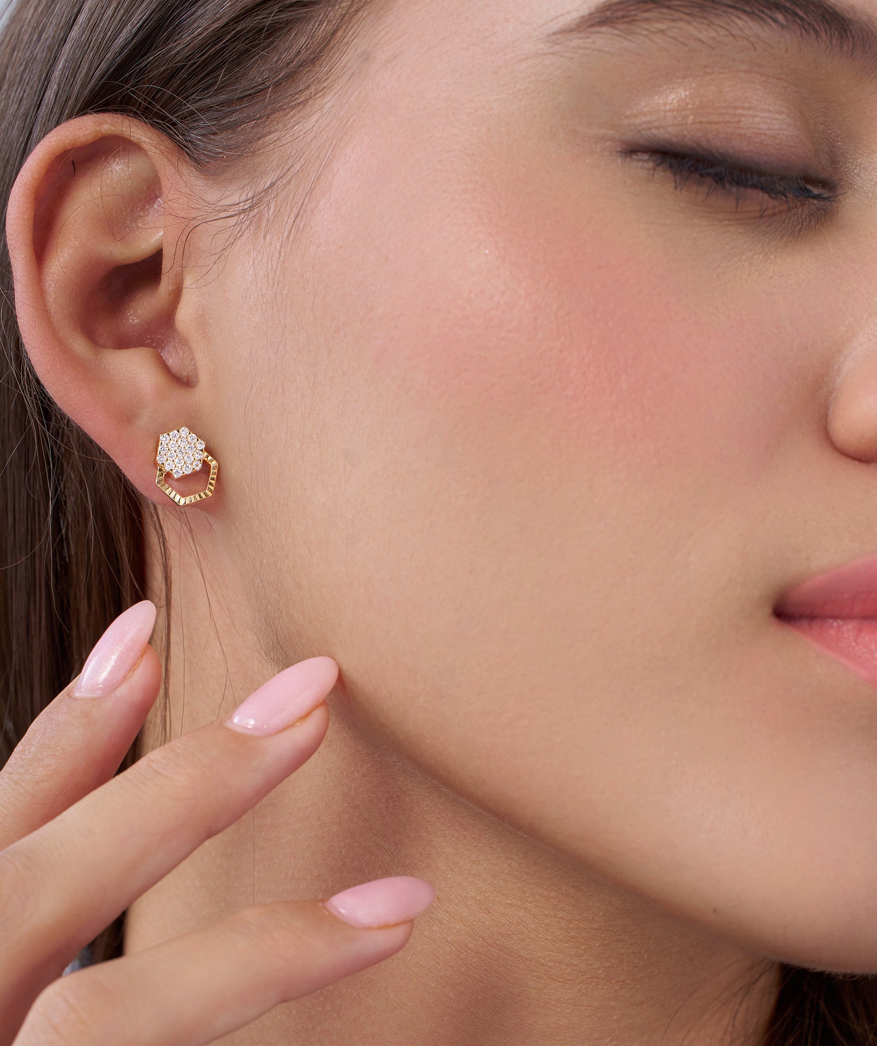 Stunning 14K gold earrings featuring a diamond-paved hexagon design paired with a sleek open-frame hexagon for a modern and elegant touch.