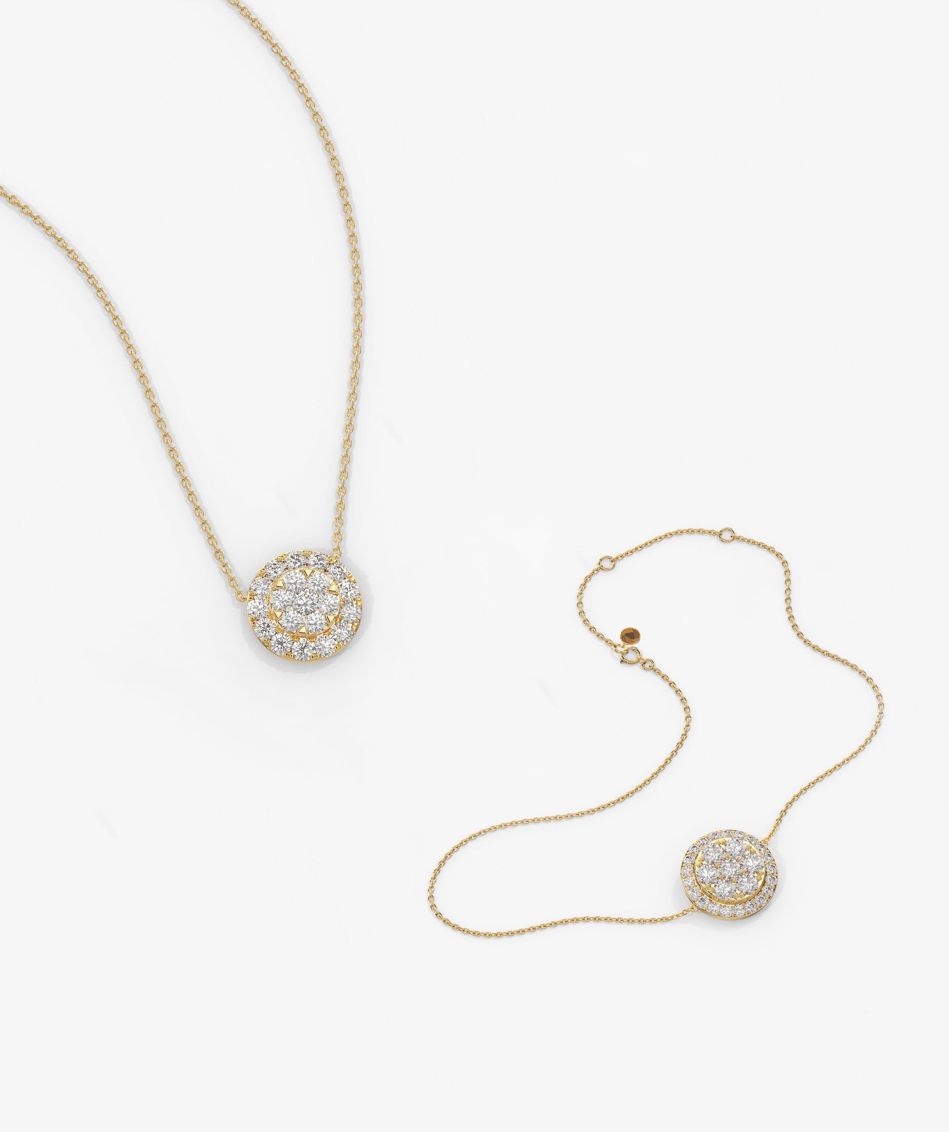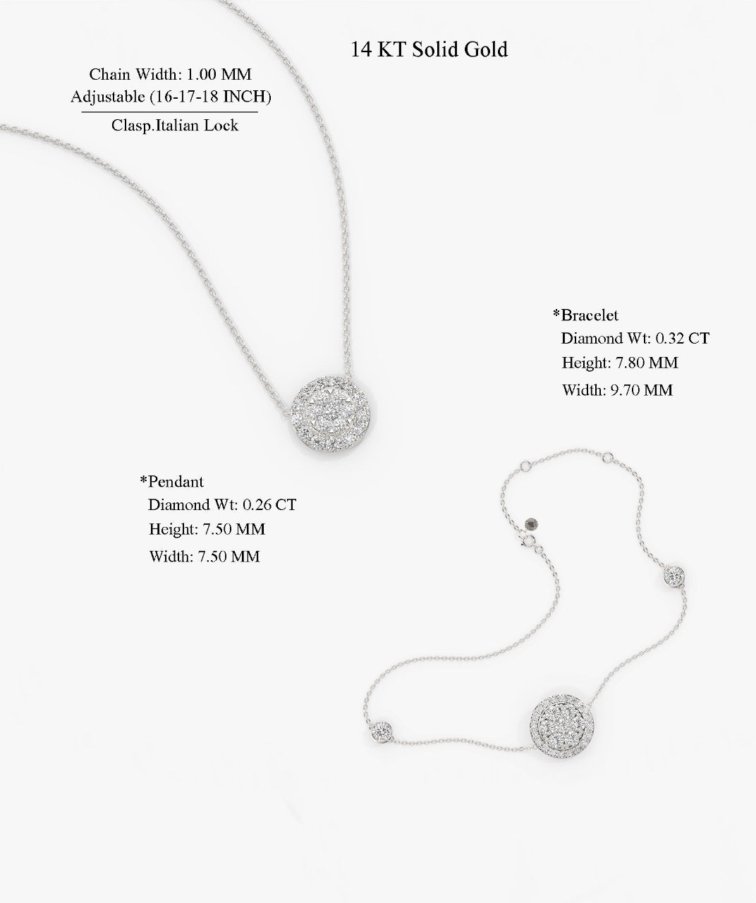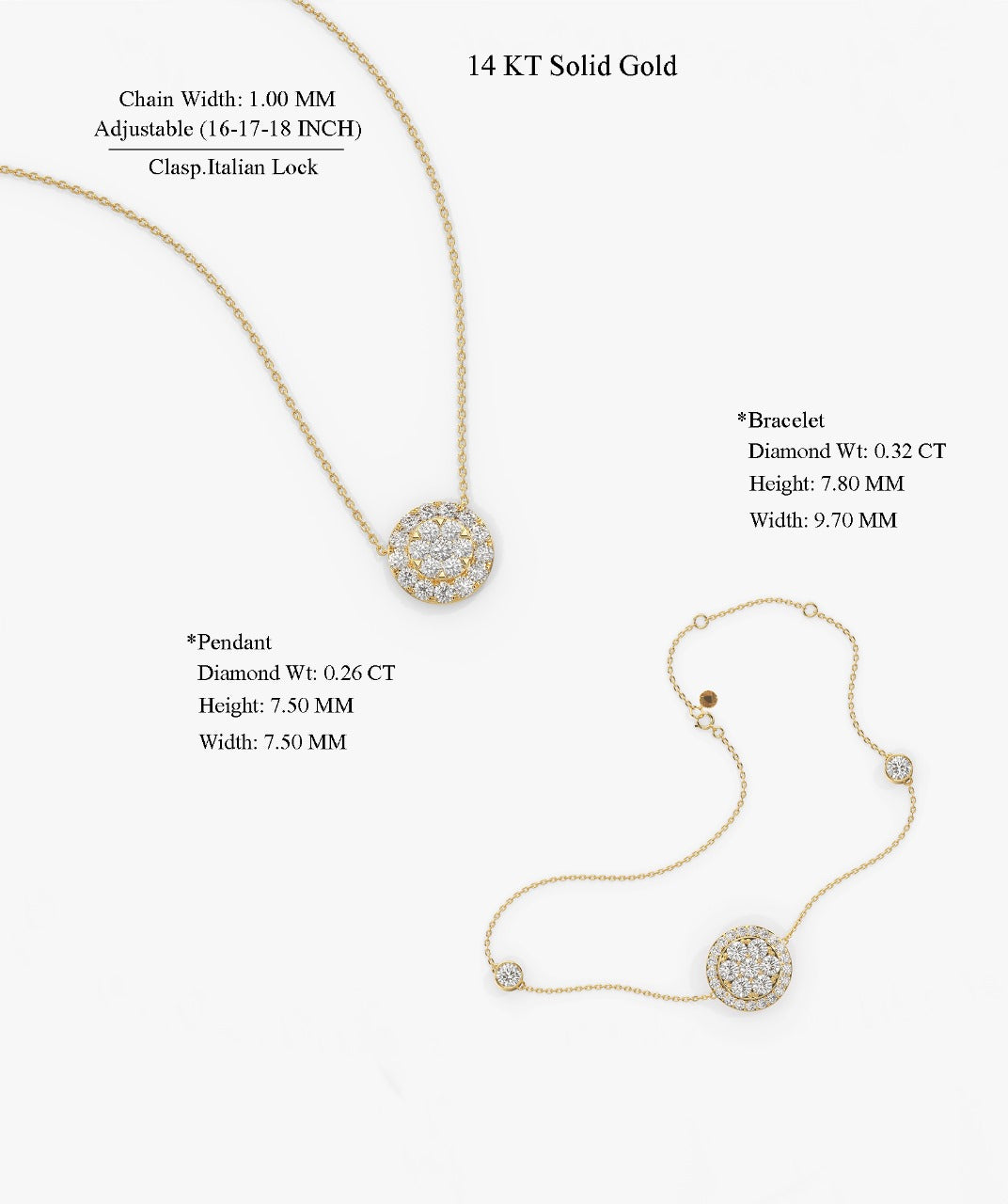 This 14k solid gold jewelry set features a brilliant diamond cluster design, crafted with natural round-cut diamonds for maximum sparkle. Including an adjustable 16–18 inch necklace and a matching bracelet, it’s a timeless set for everyday elegance or gifting. Perfect for birthdays, anniversaries, or bridesmaids.