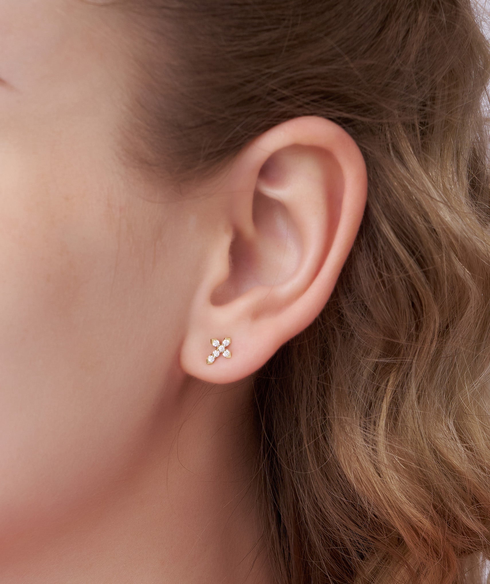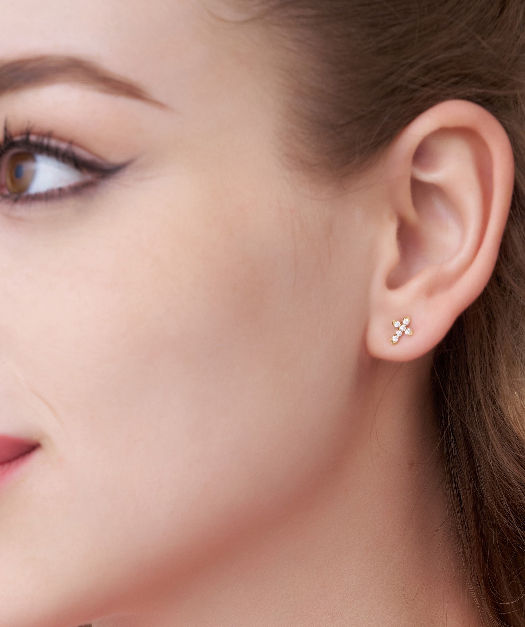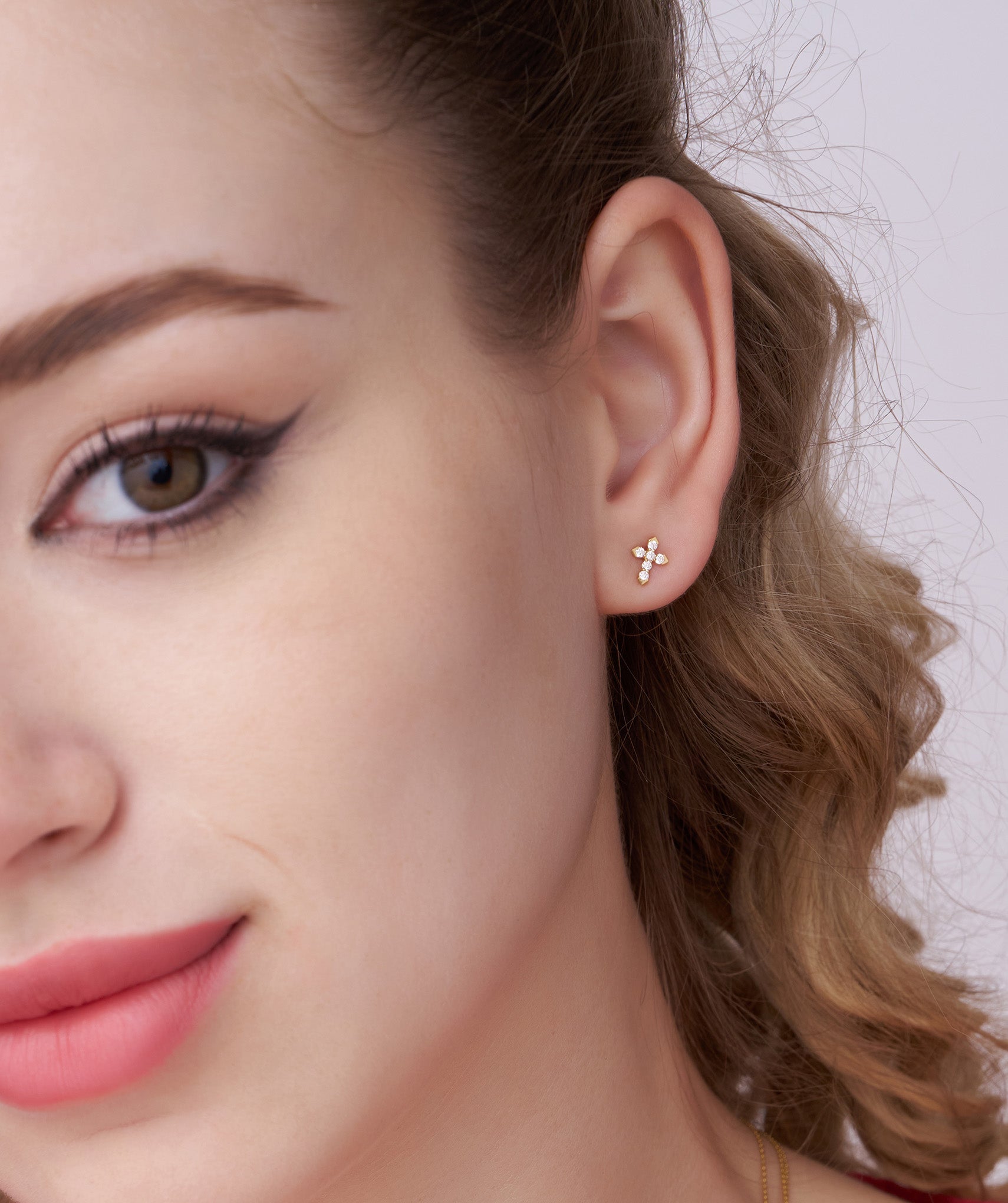 Delicately crafted in 14K yellow gold, these elegant cross stud earrings feature round brilliant-cut diamonds arranged in a classic cross silhouette. A perfect blend of faith and fashion, they make a meaningful statement piece for everyday wear or special occasions.
