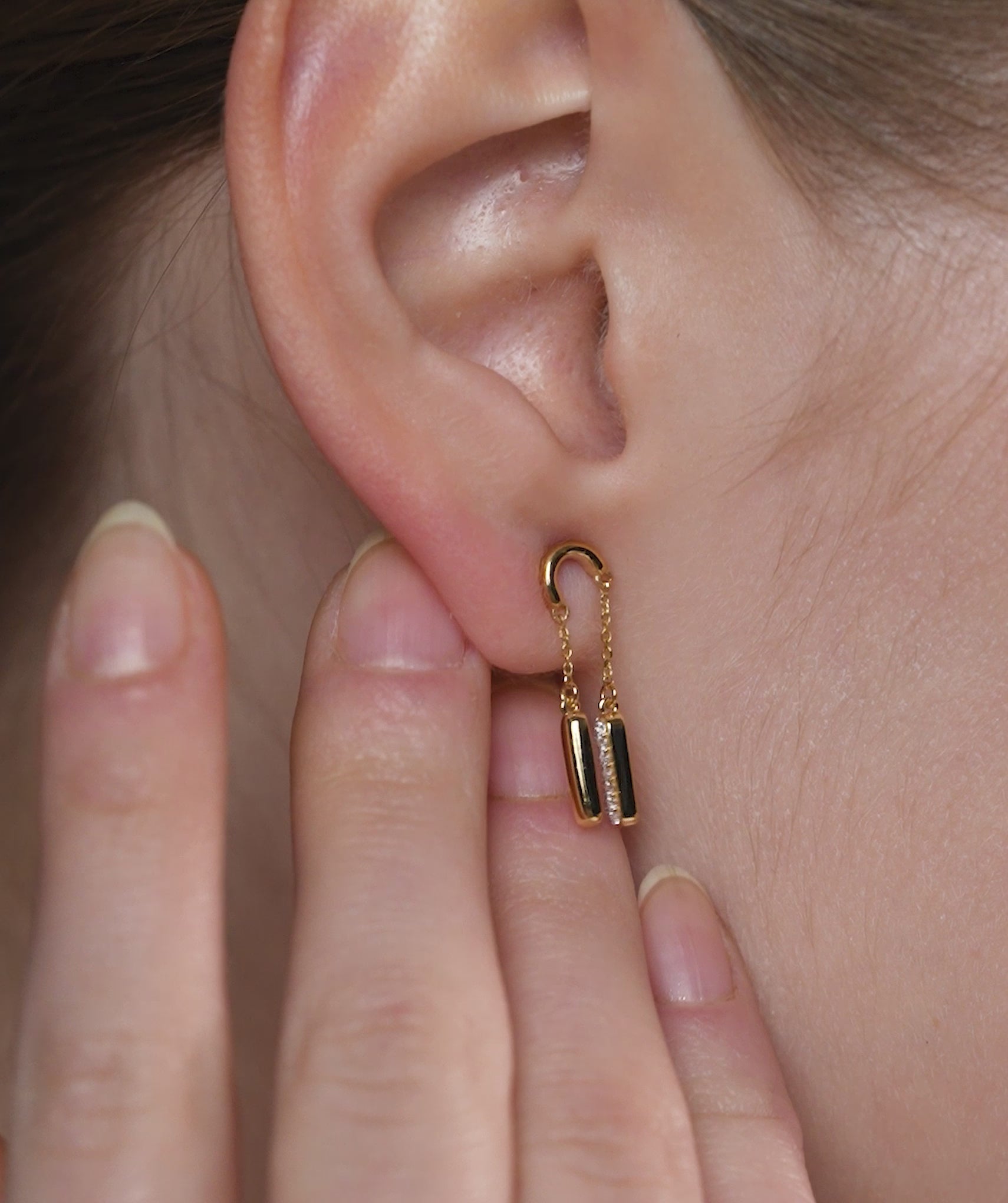 Play with texture and motion in a way that feels effortlessly cool. These architectural drop earrings feature a polished gold arch that suspends two distinct elements: a shimmering bar hand-set with natural diamonds (0.15 CT) and a sleek, high-polished gold capsule. Crafted in 14K solid gold, the 22.8mm drop length creates a dynamic sway that catches the light from every angle, embodying the perfect mix of grit and glamour. Securely fastened with push backs, they are lightweight enough for all-day wear yet bold enough to define your evening look. Available in yellow, white, and rose gold to match your vibe.