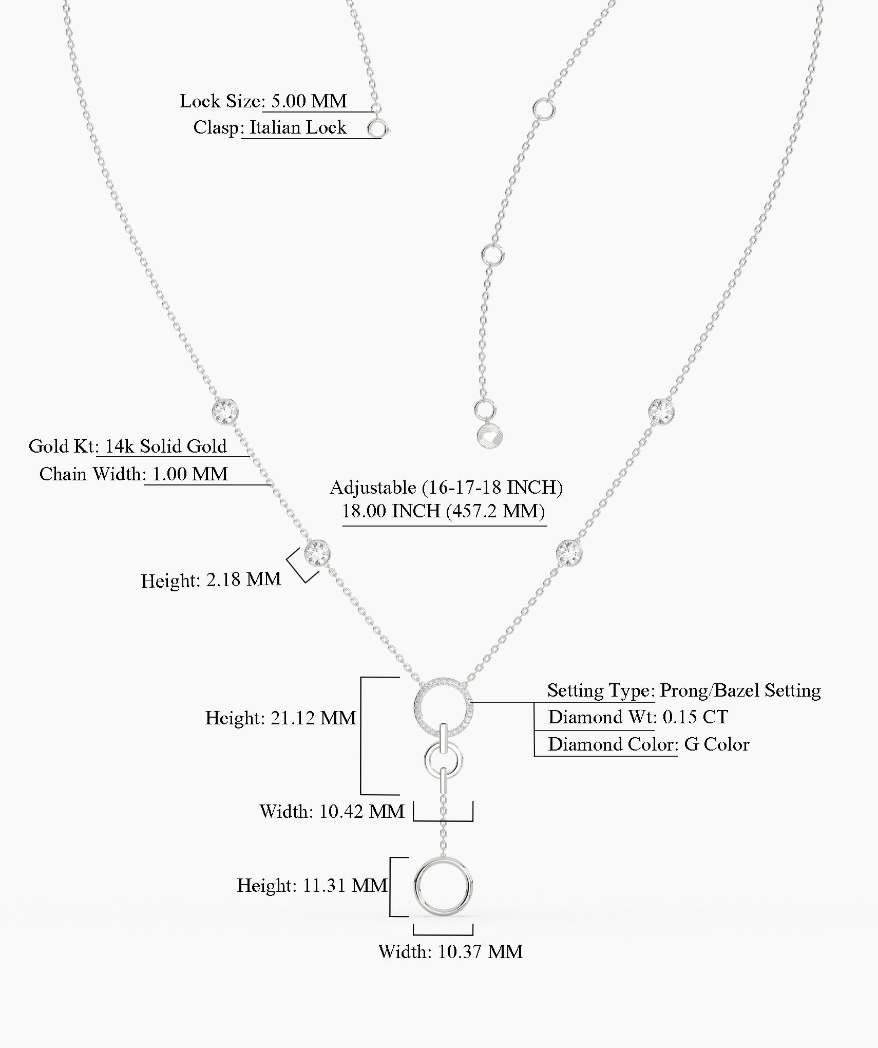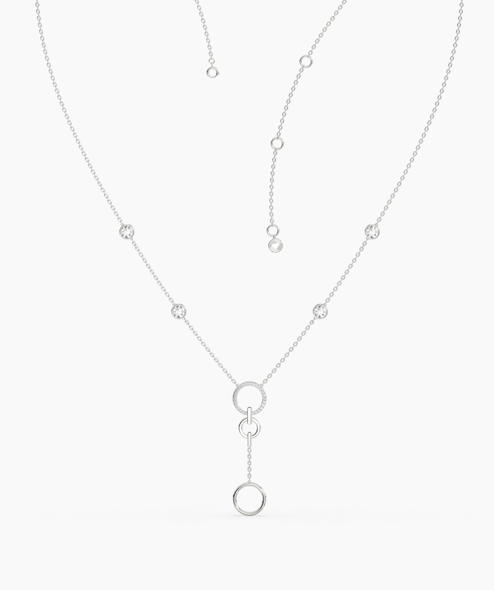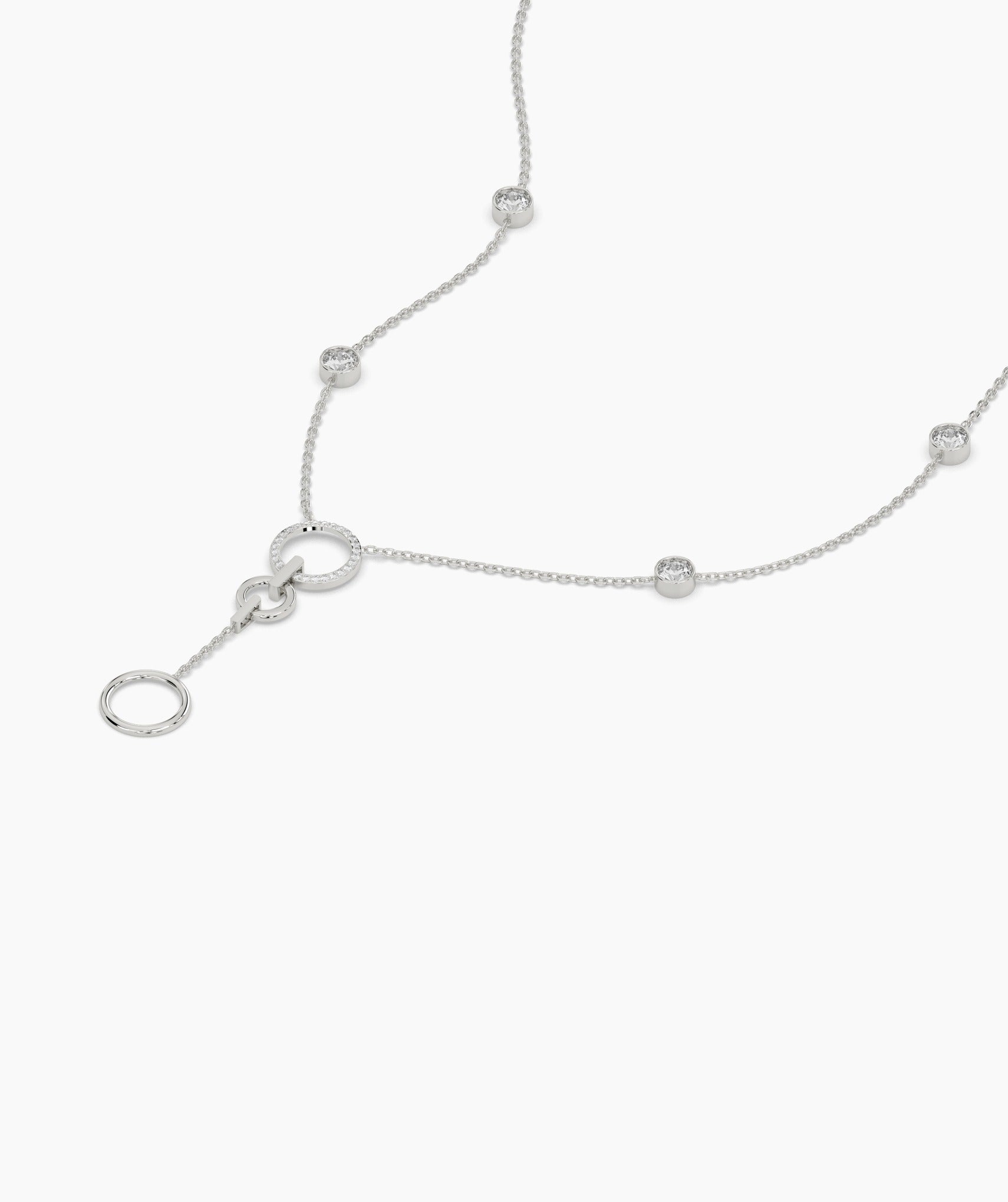 Elegant and modern, this 14K white gold lariat necklace features a delicate chain accented with bezel-set diamonds and a stylish circular drop design. Perfect for layering or wearing solo, it adds a touch of sophistication to any outfit.