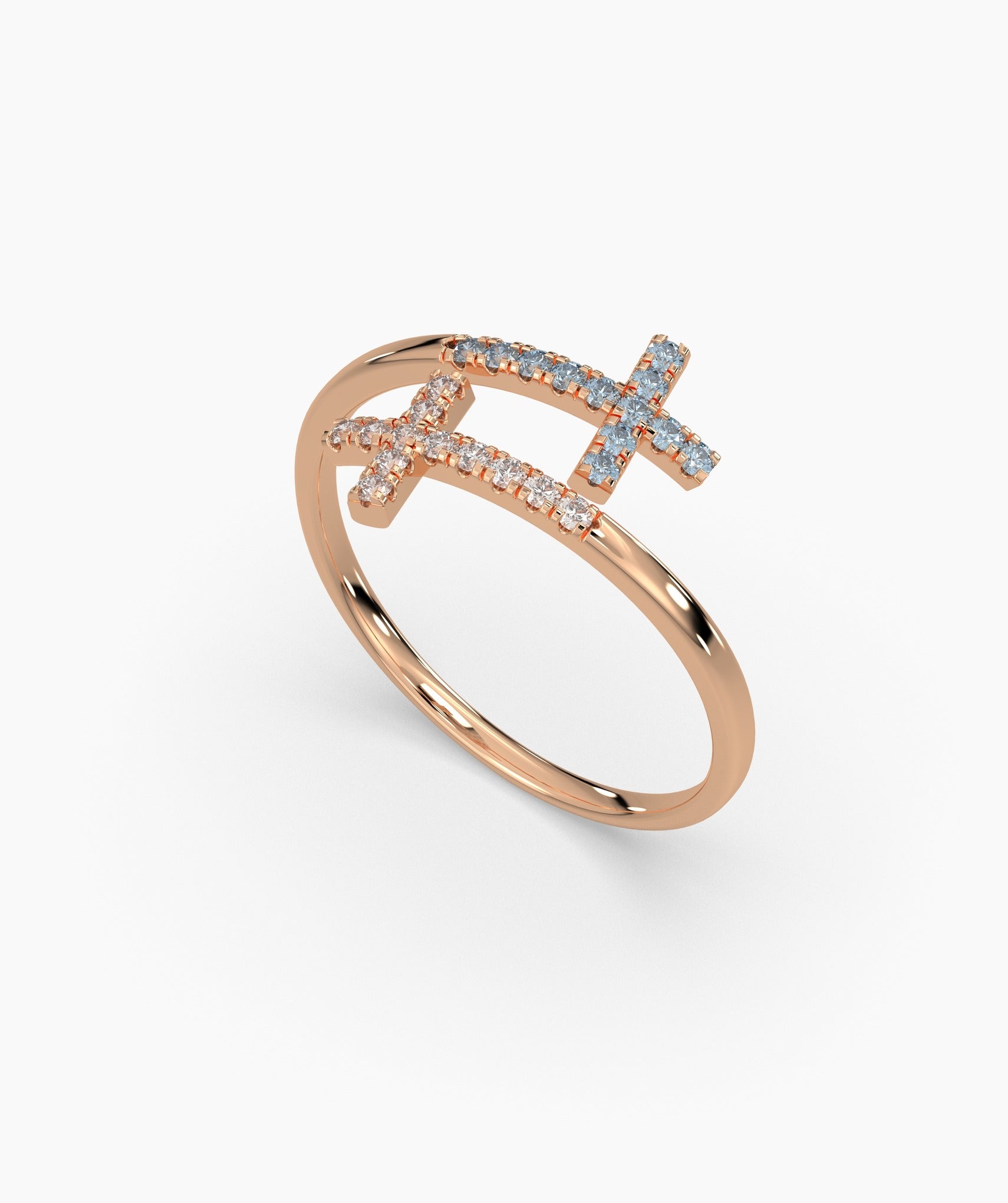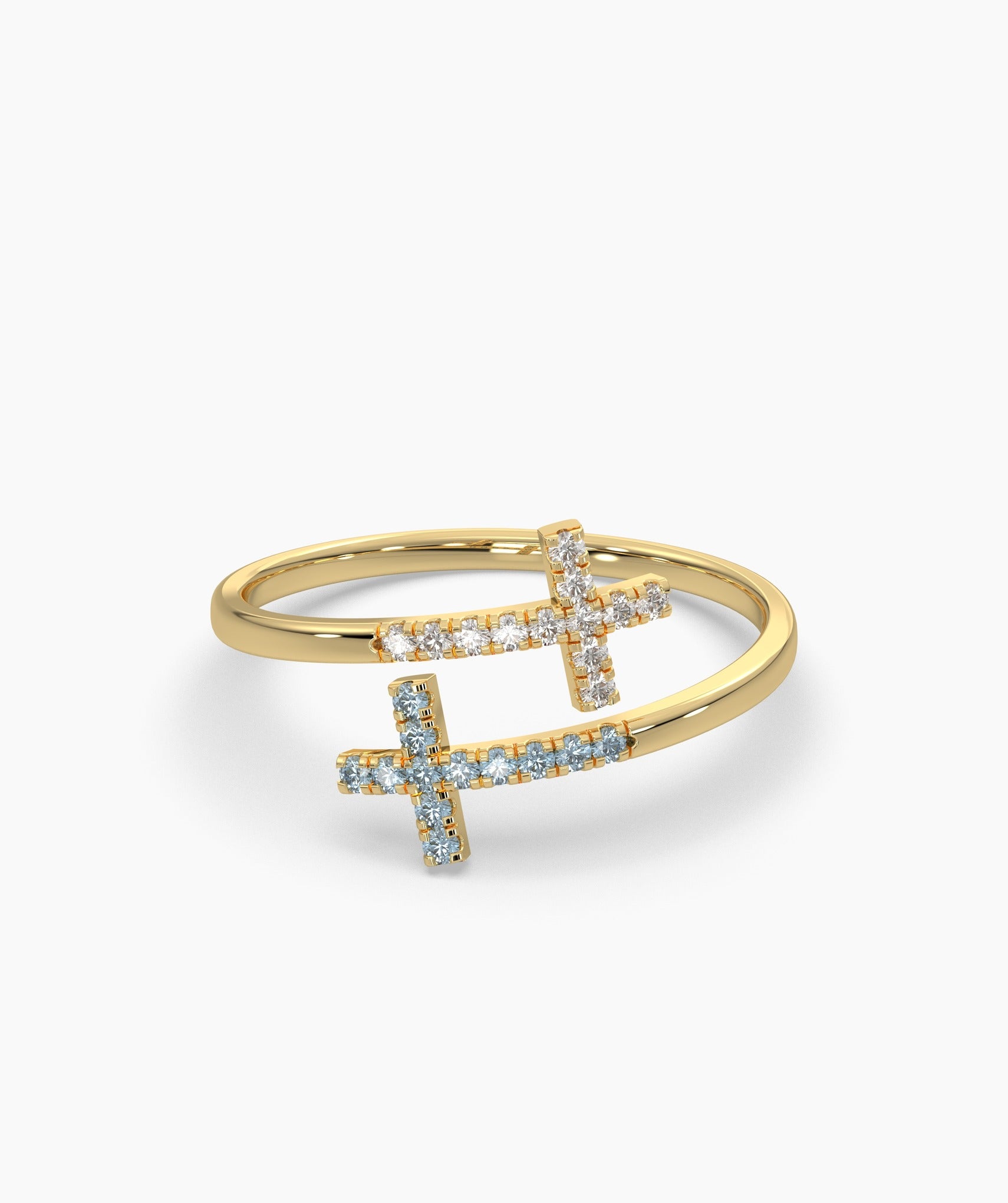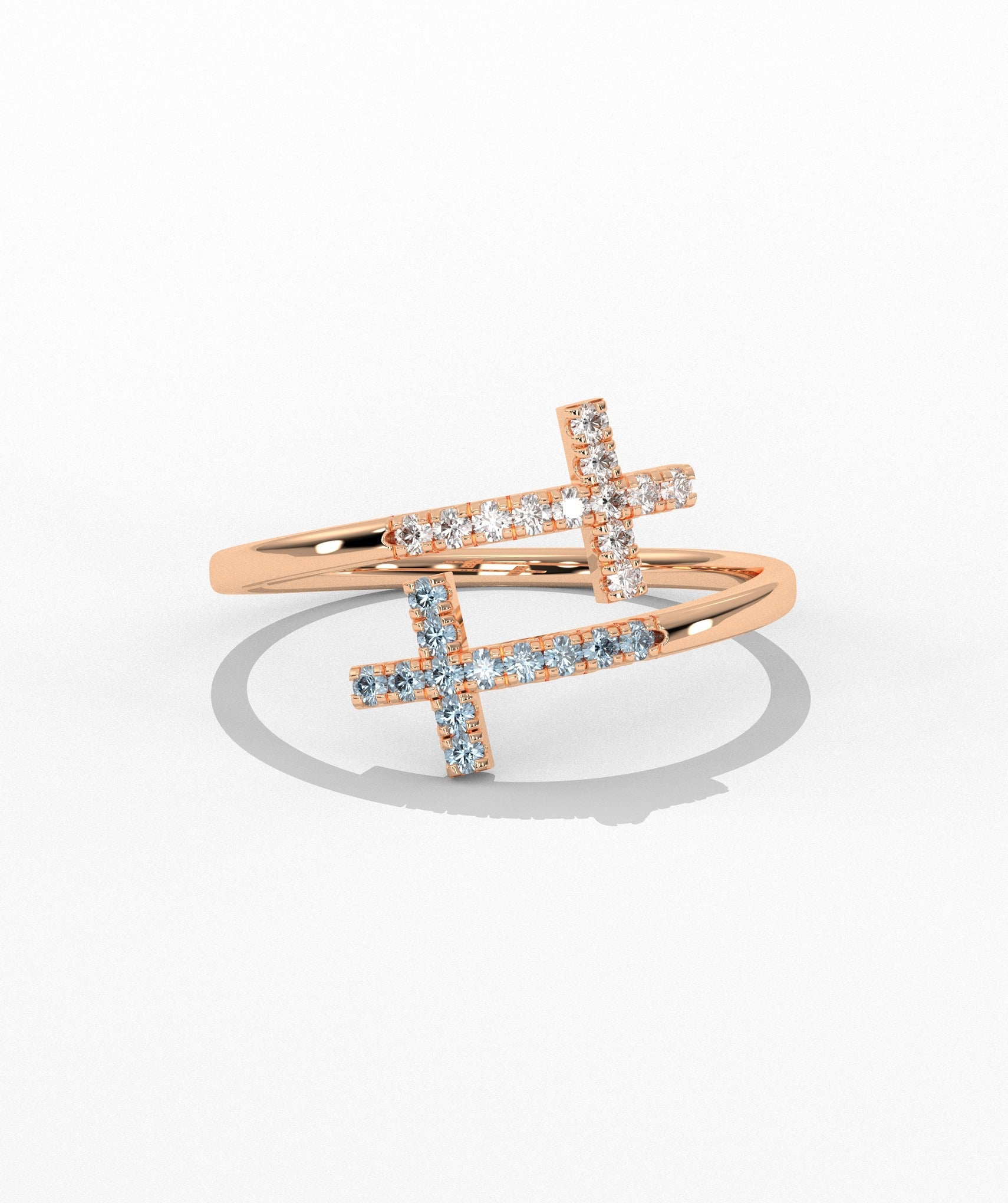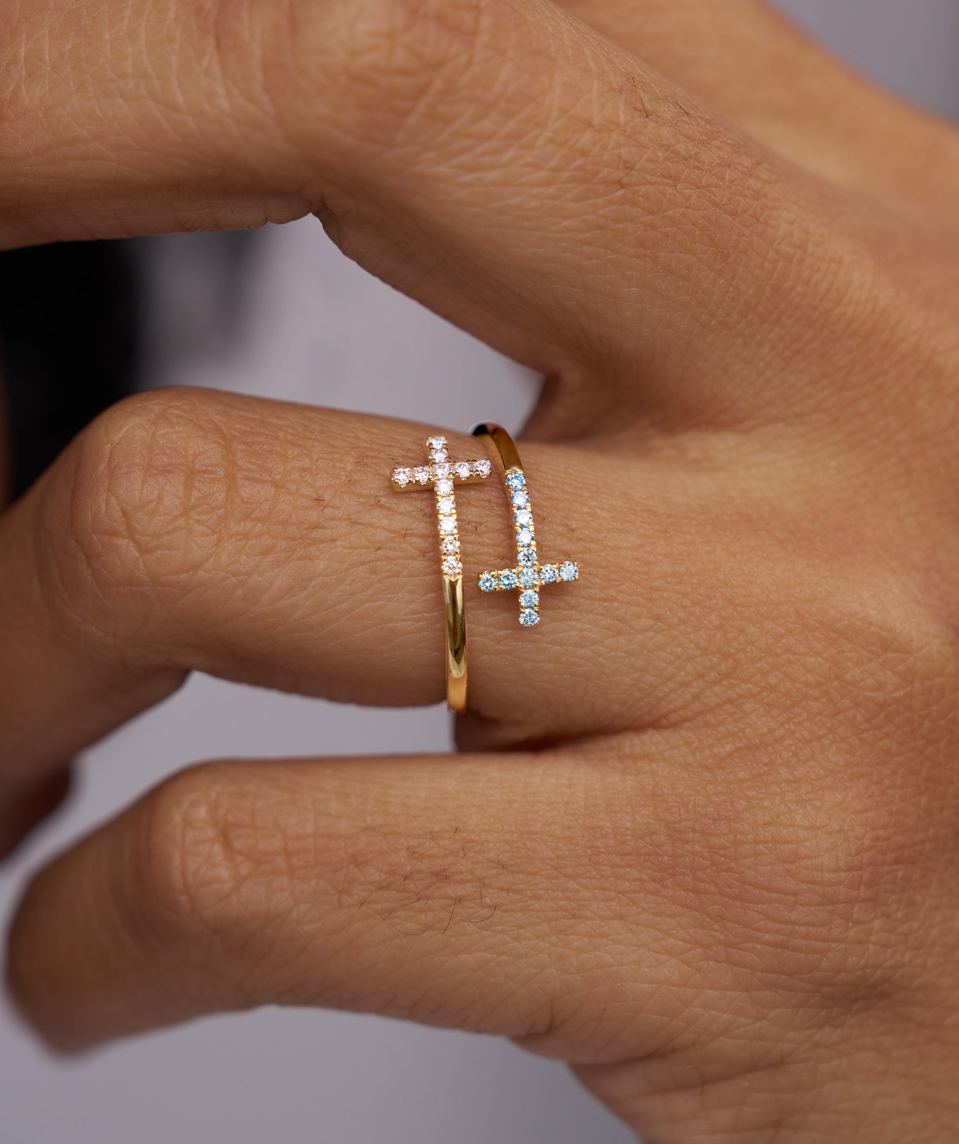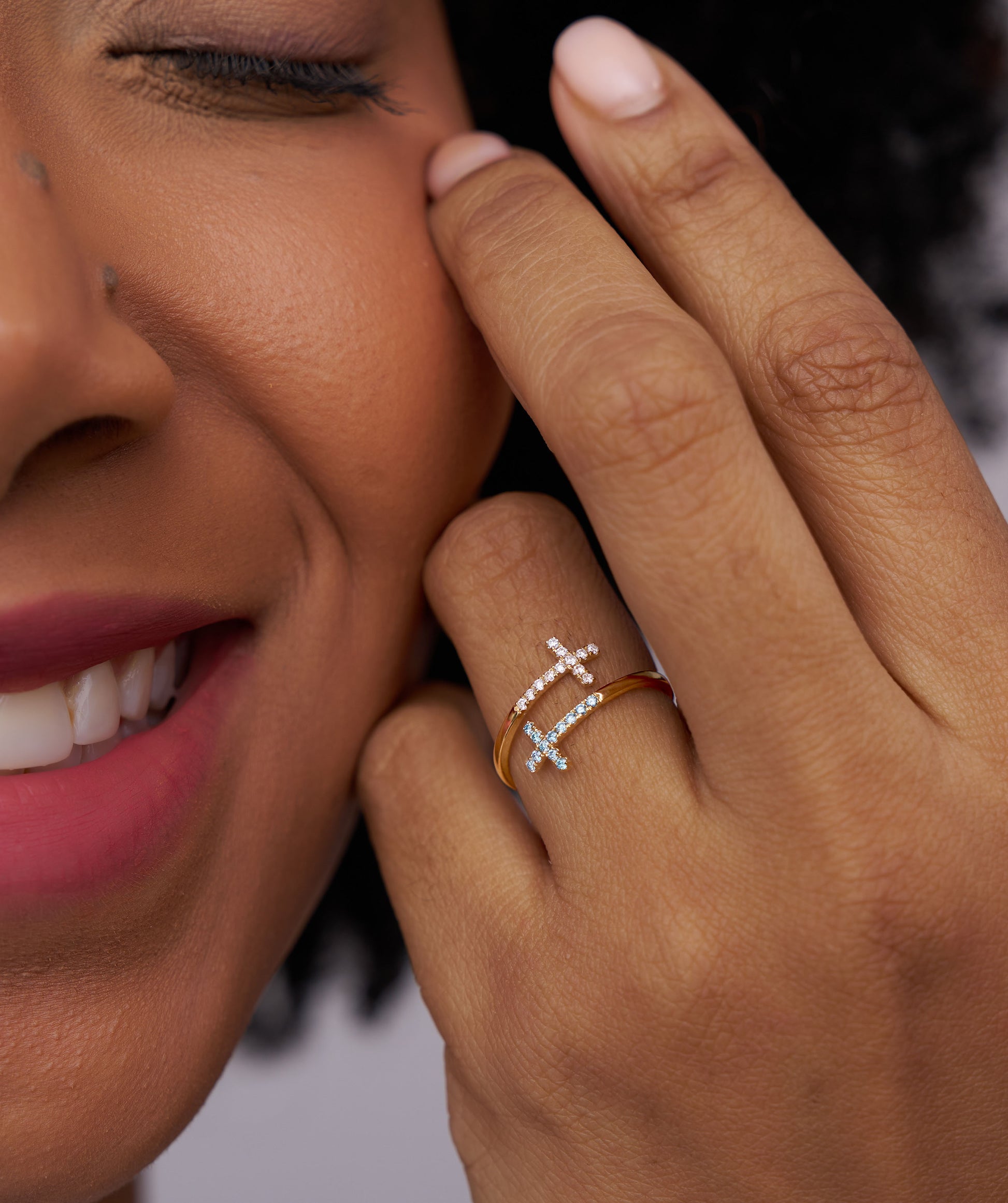 Two sleek pave-set crosses wrap around your finger in a graceful dance of light and faith, all set in gleaming 14K solid gold.