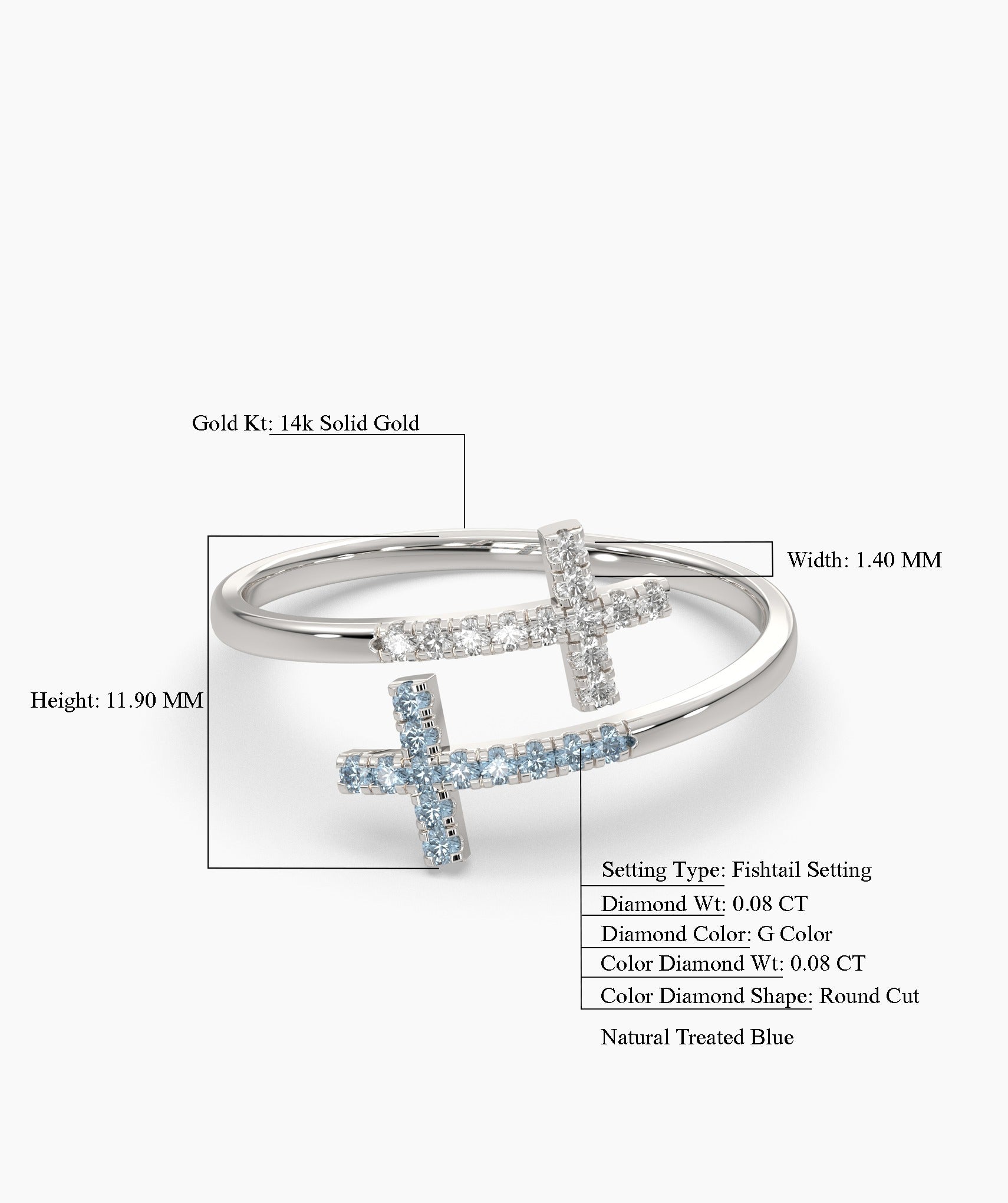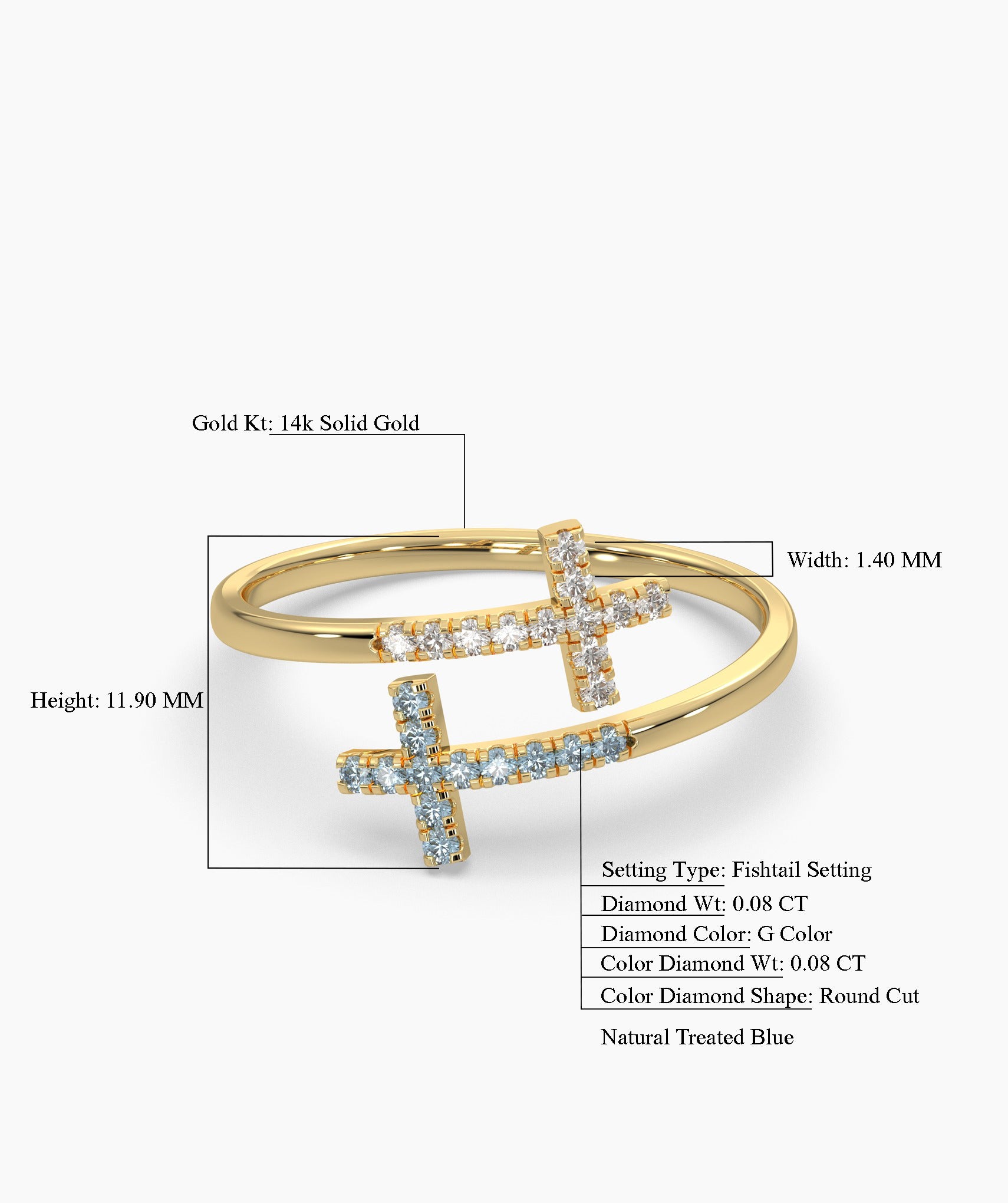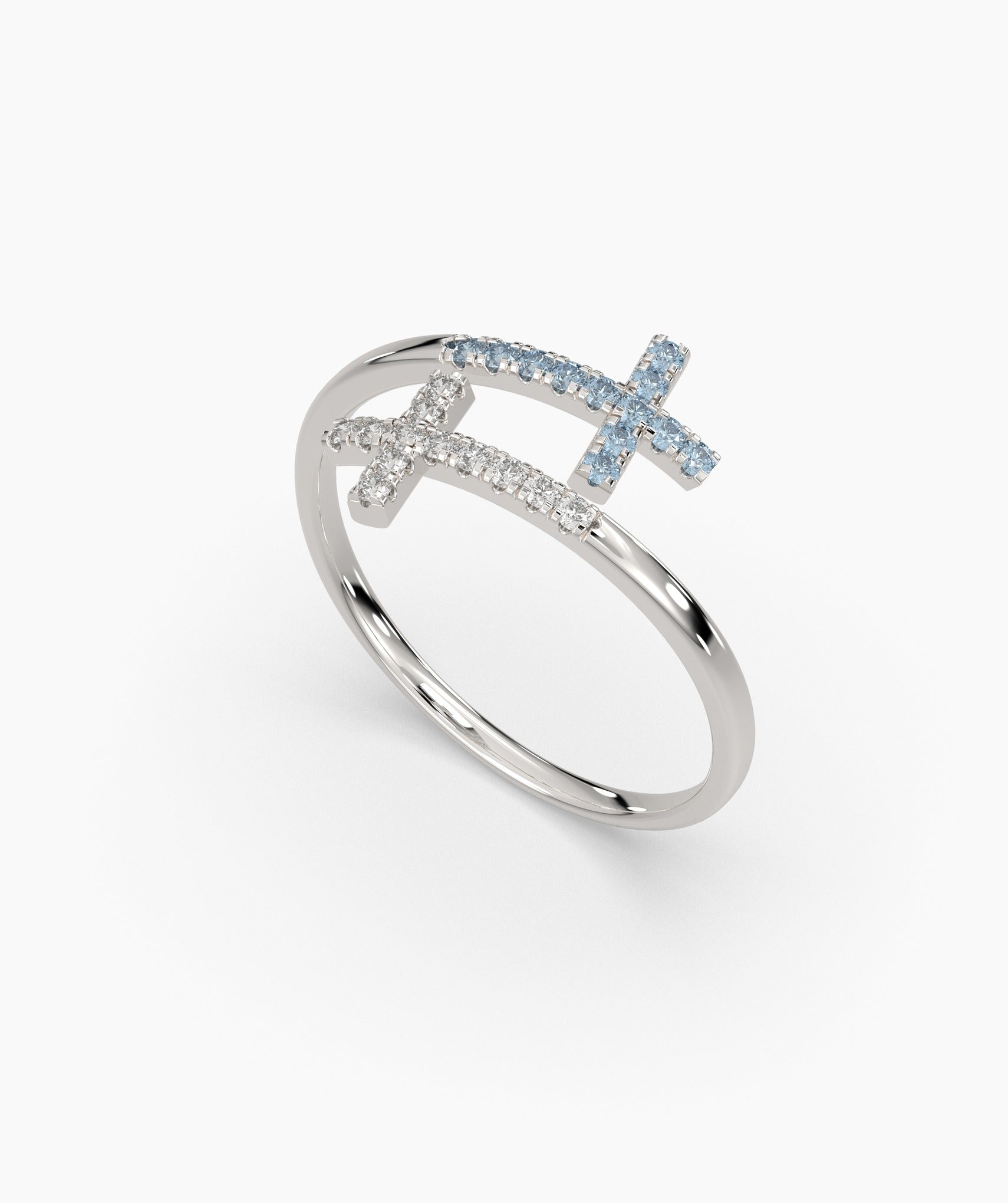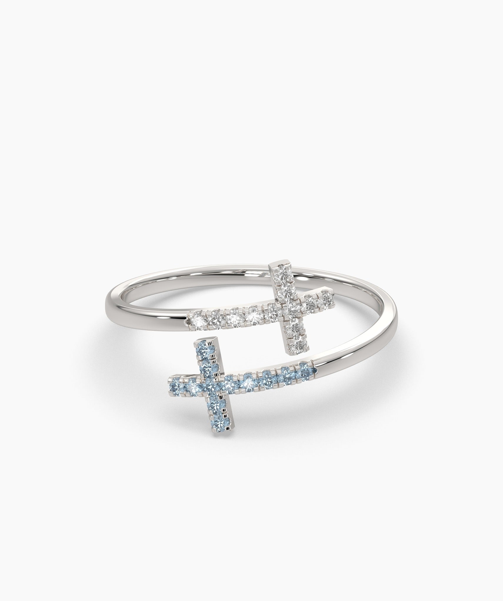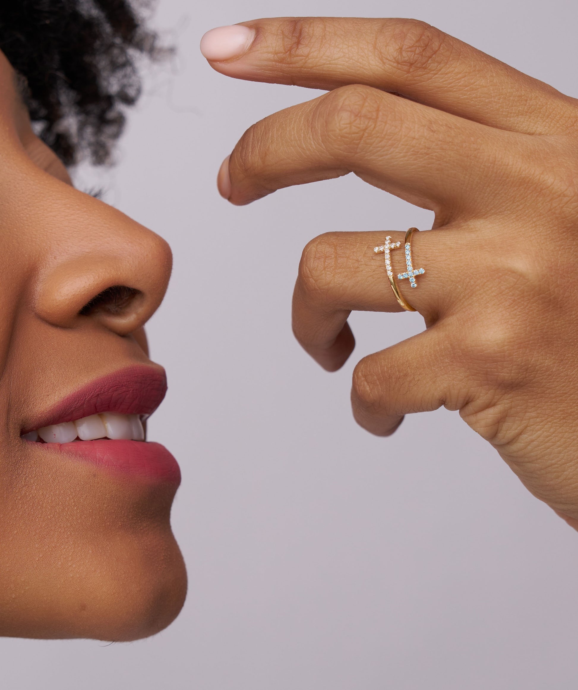 Two sleek pave-set crosses wrap around your finger in a graceful dance of light and faith, all set in gleaming 14K solid gold.