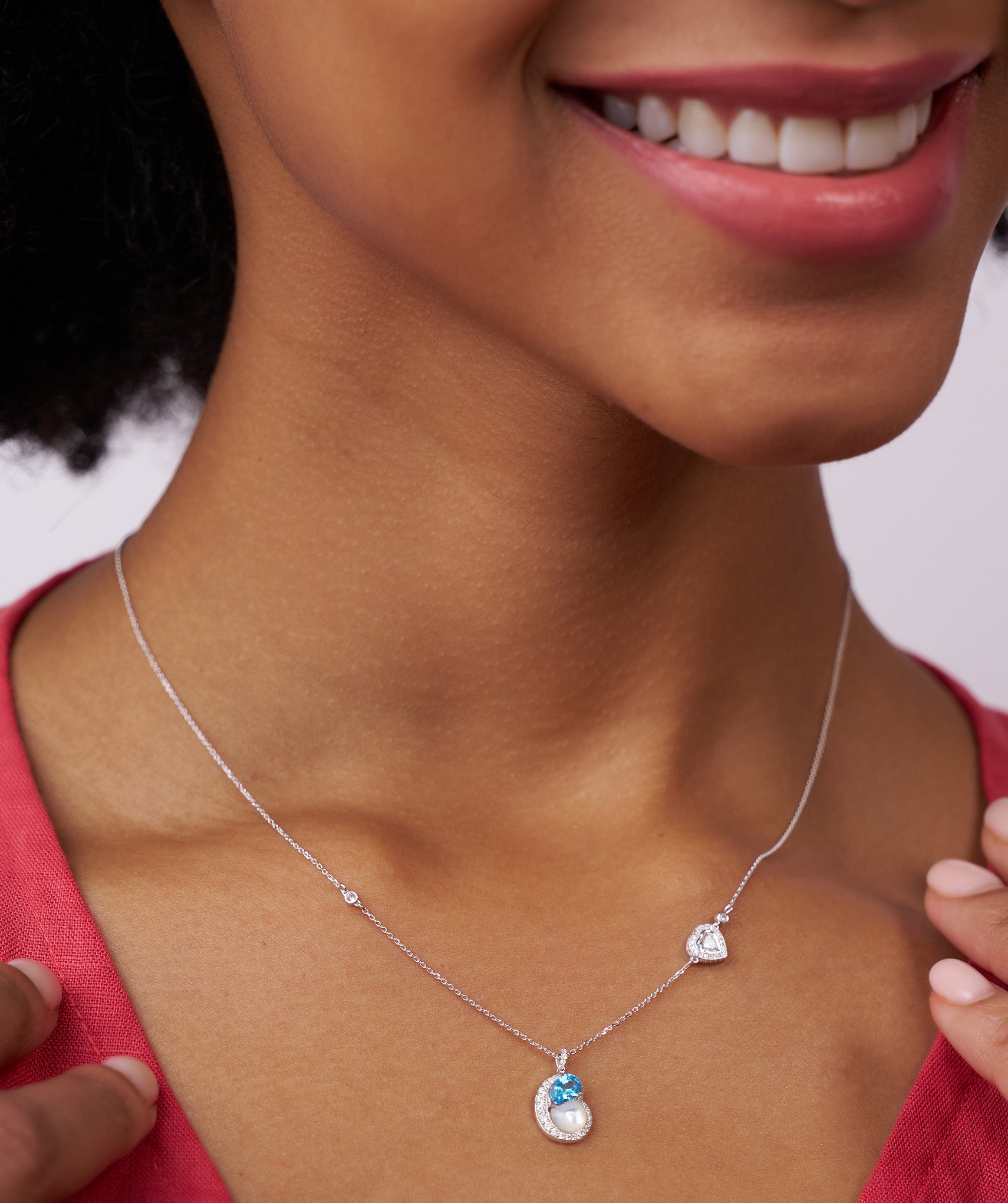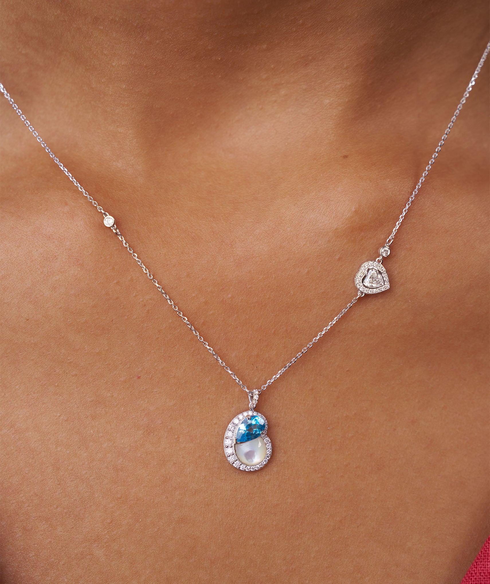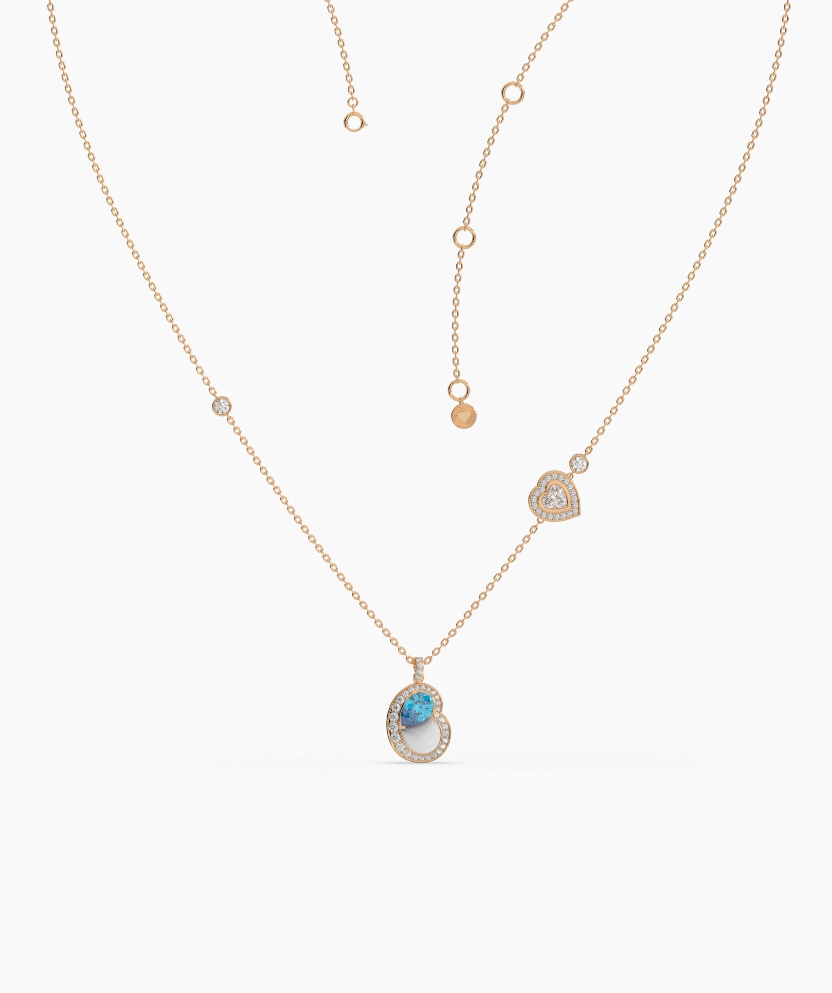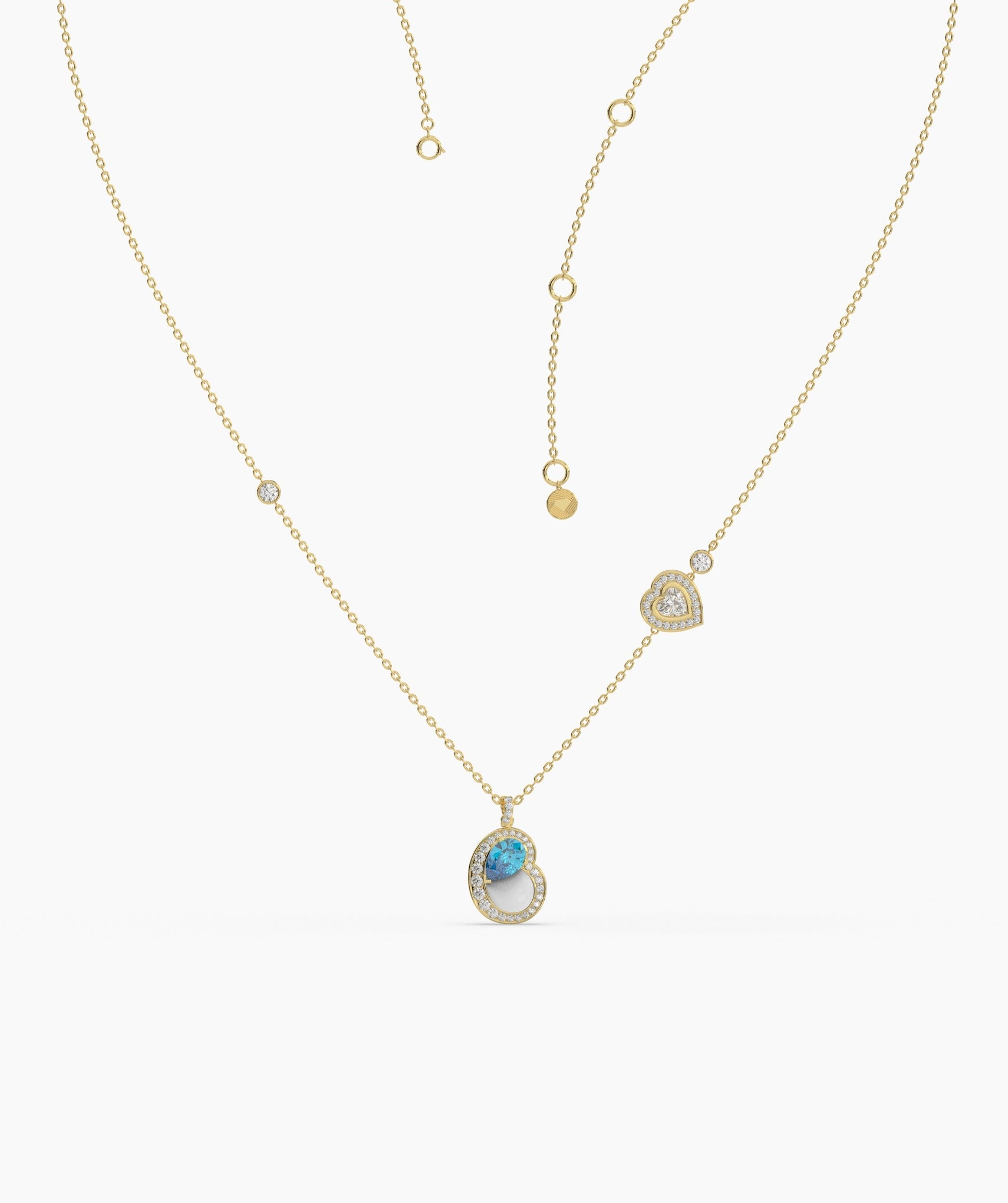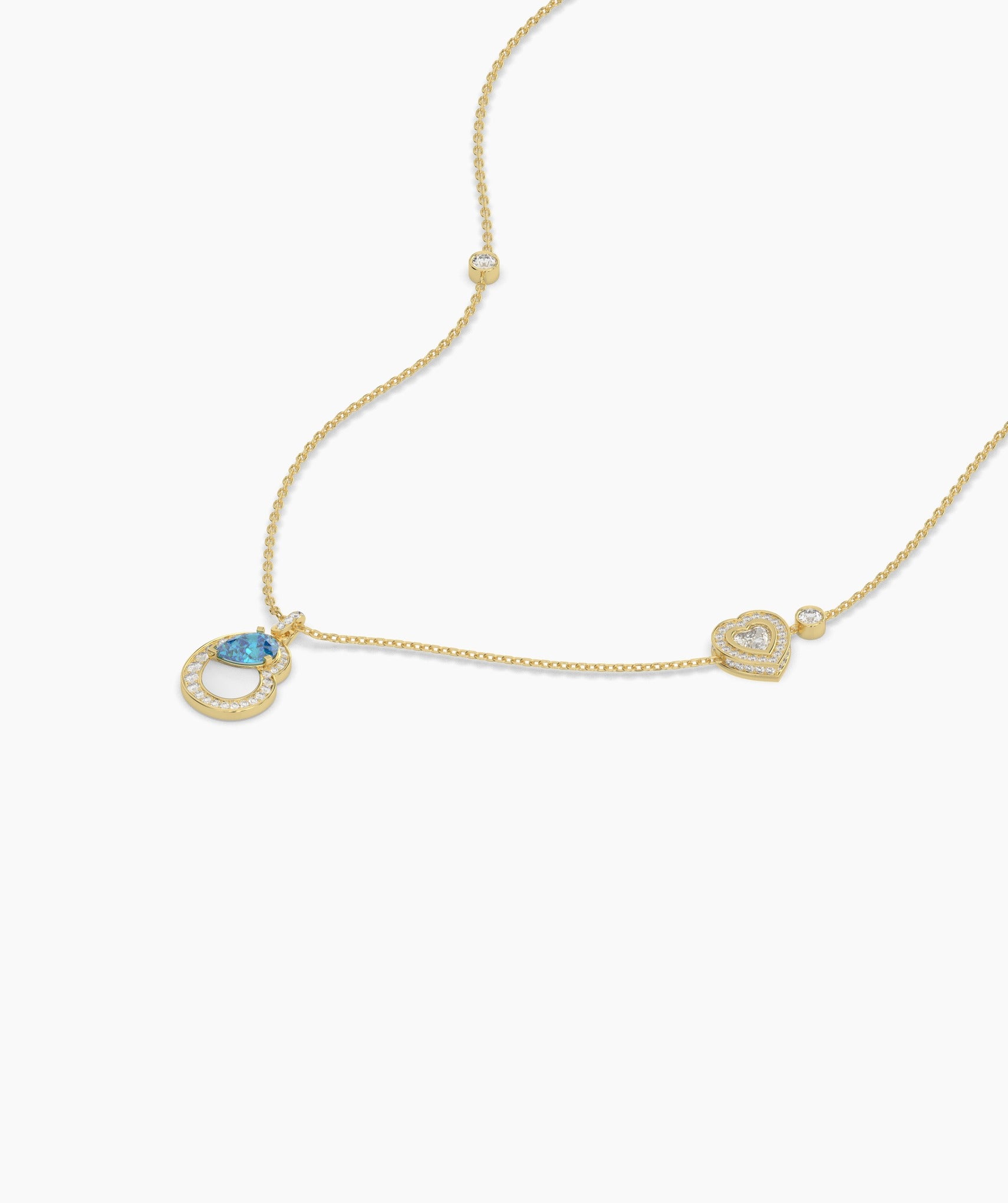 Delicately crafted in 14k gold, this romantic necklace showcases a vibrant blue heart centerpiece and a smaller heart along the chain for added charm.”