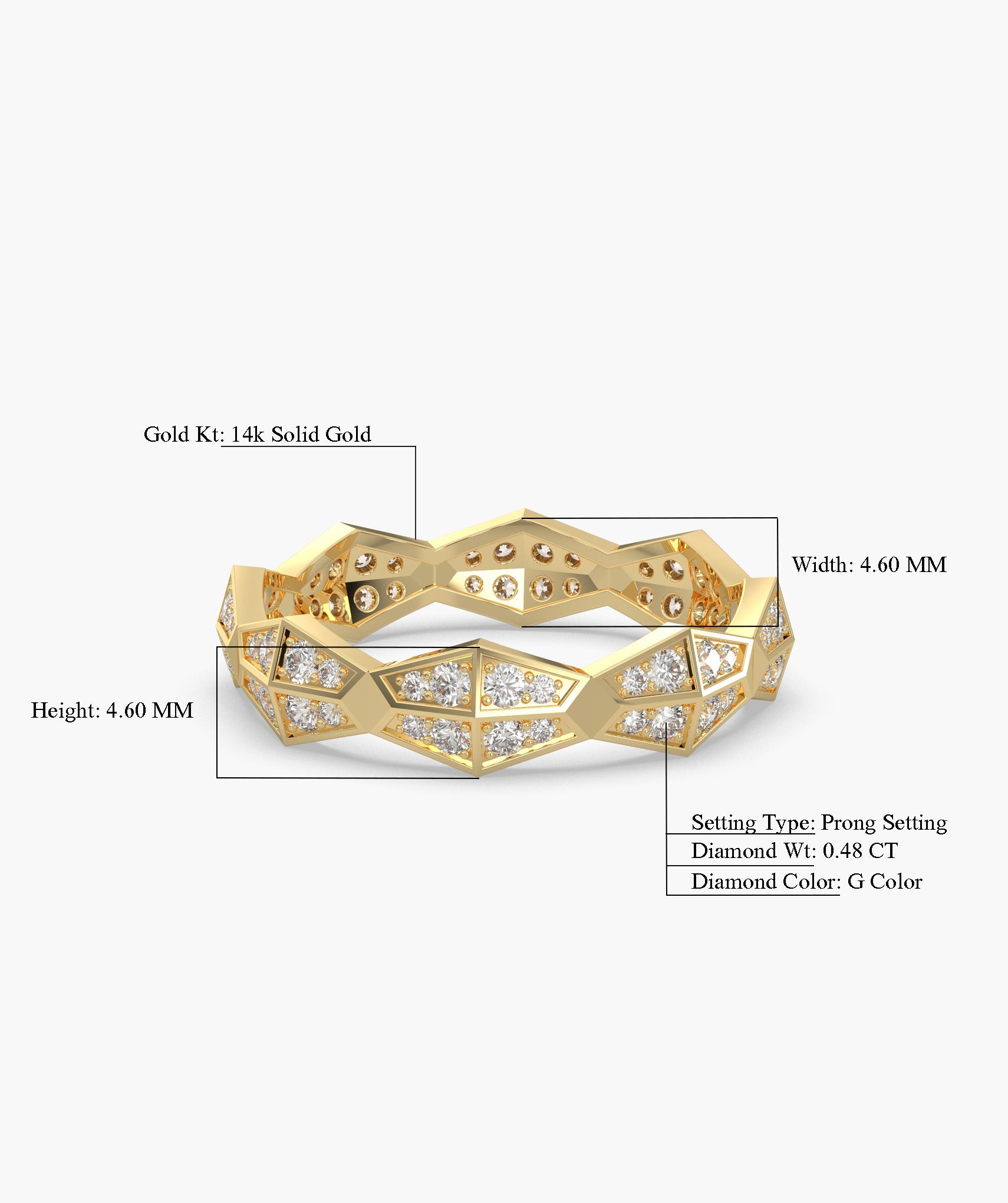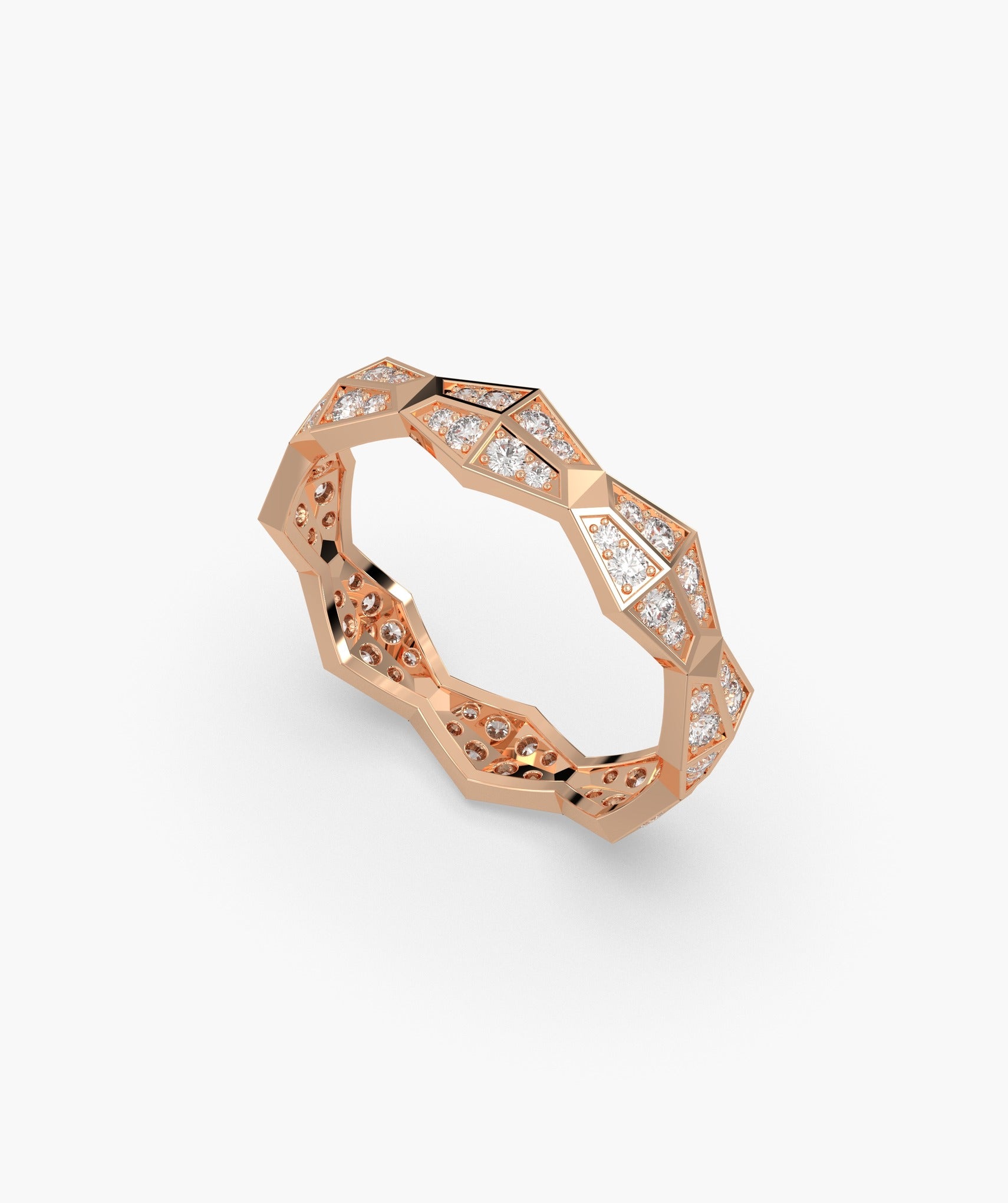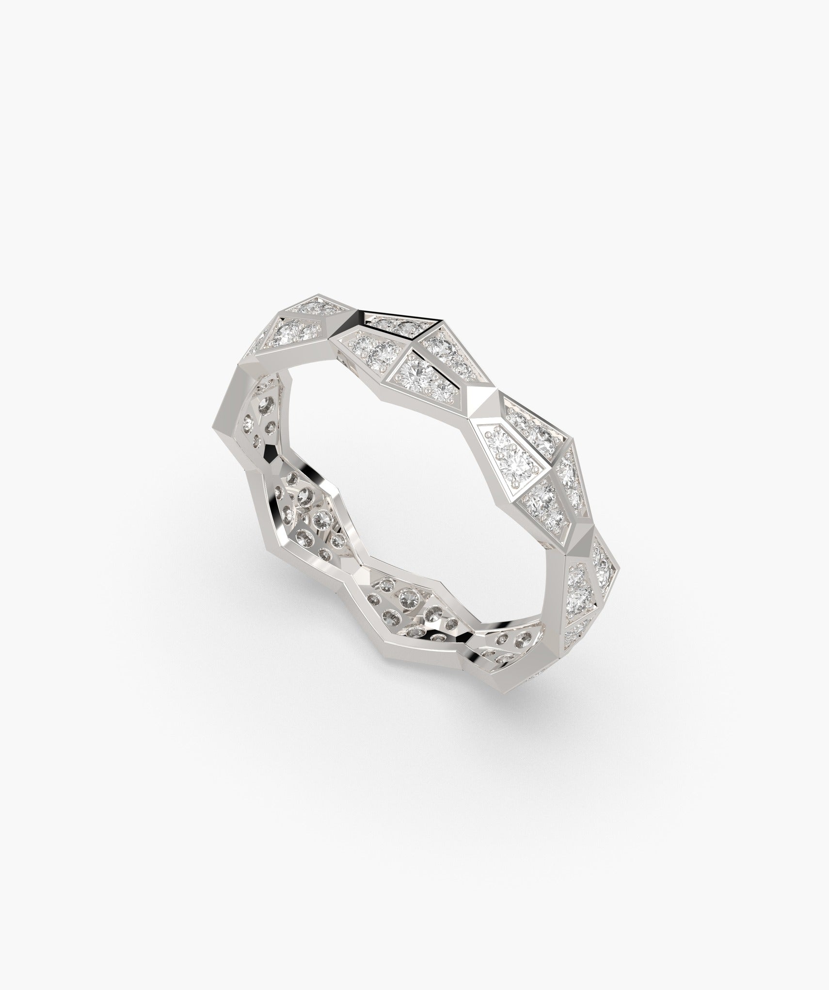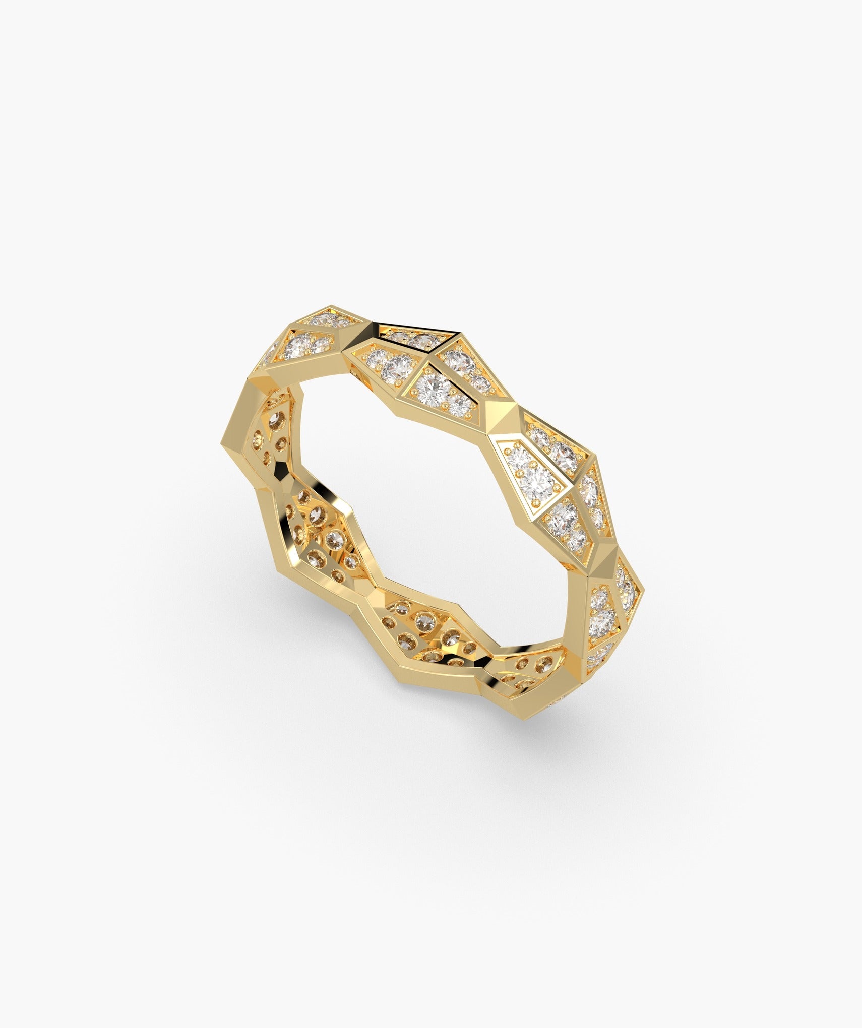 This solid gold eternity ring is adorned with dazzling diamonds in an edgy geometric pattern, making it a standout piece.