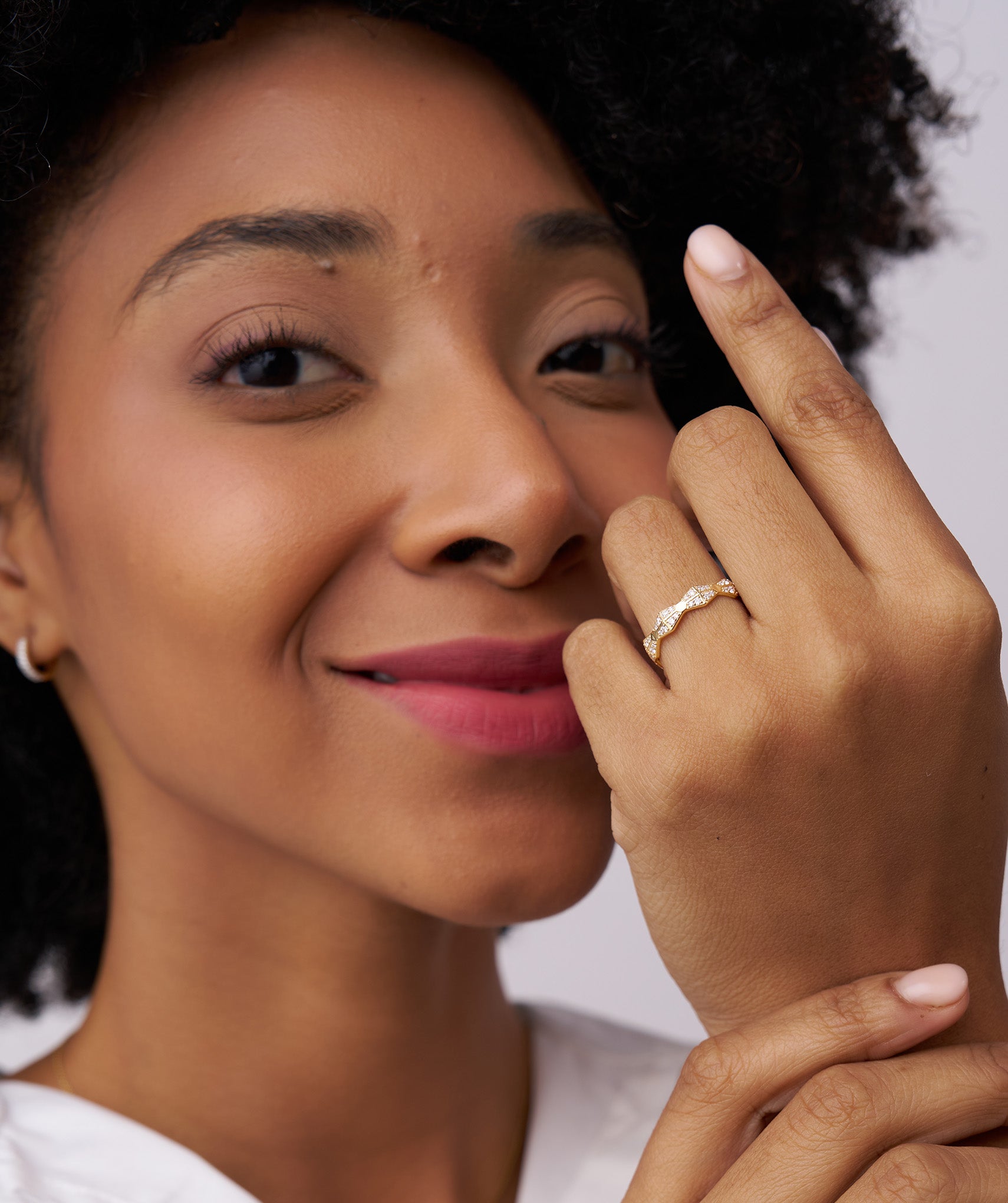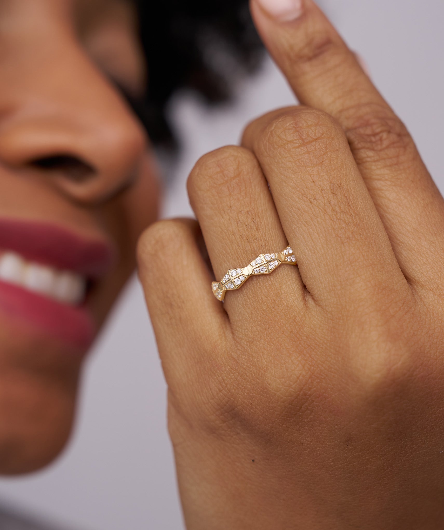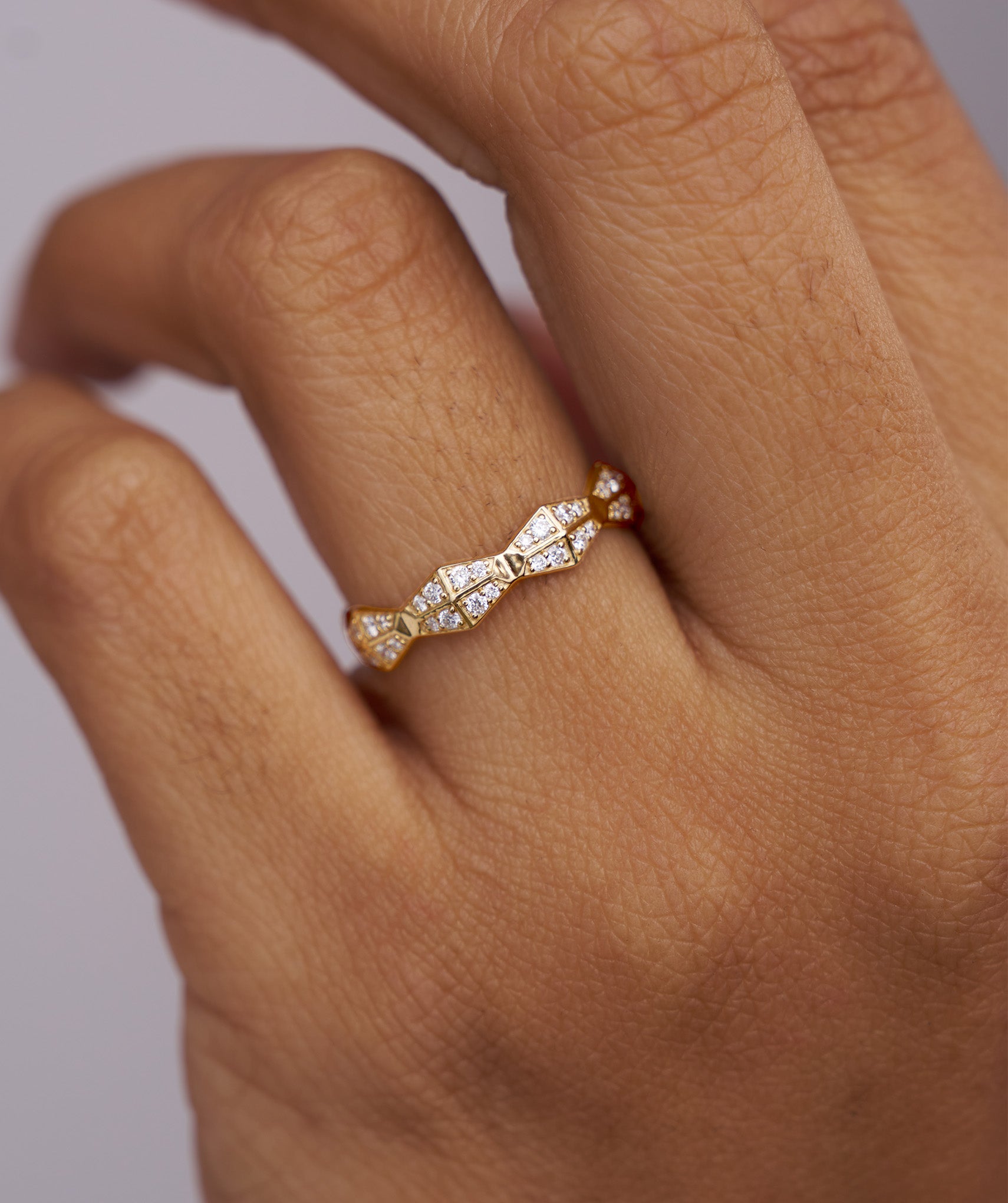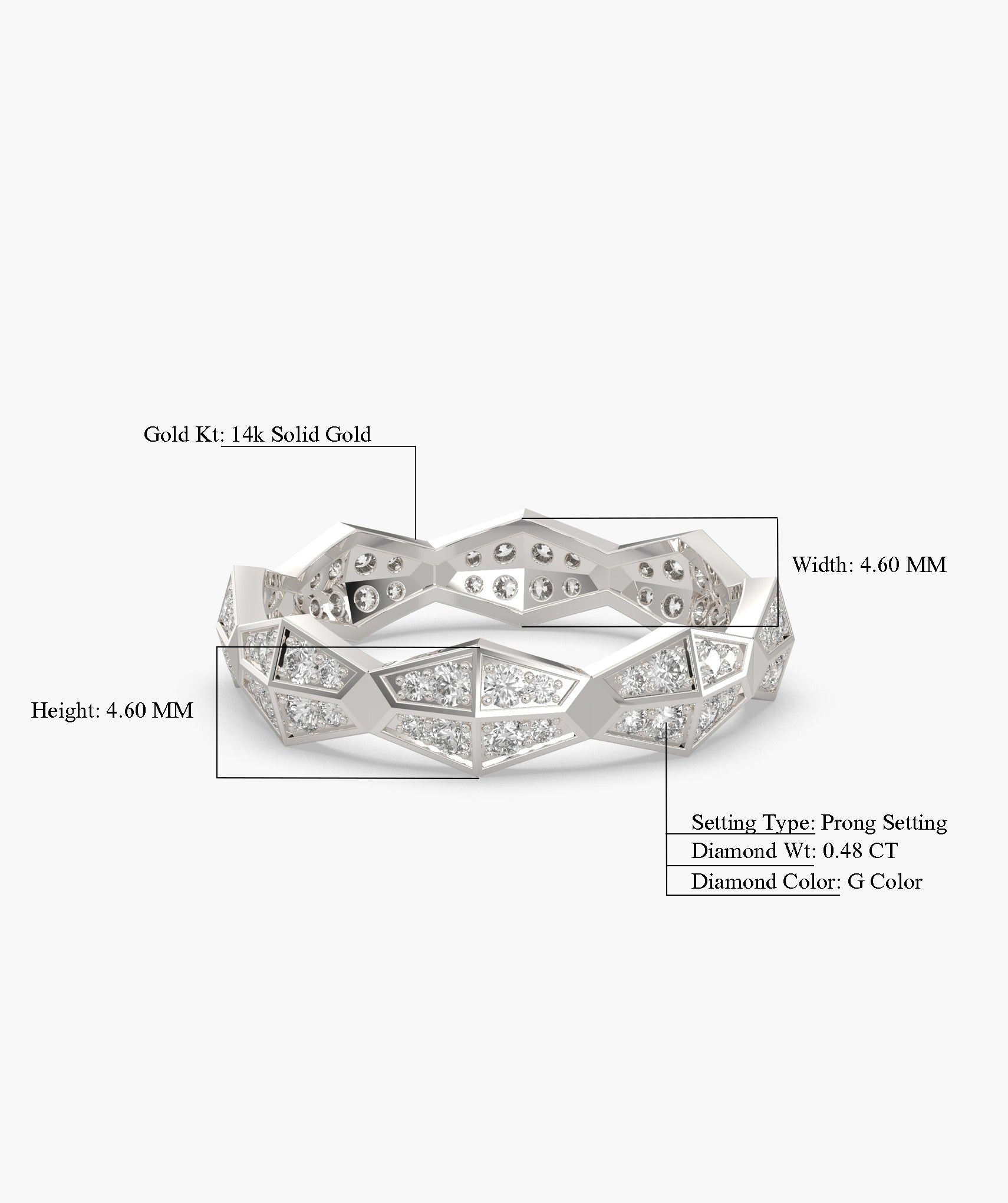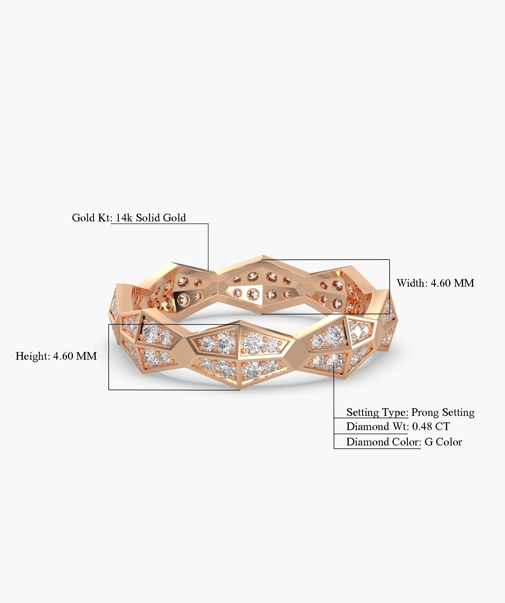 This solid gold eternity ring is adorned with dazzling diamonds in an edgy geometric pattern, making it a standout piece.