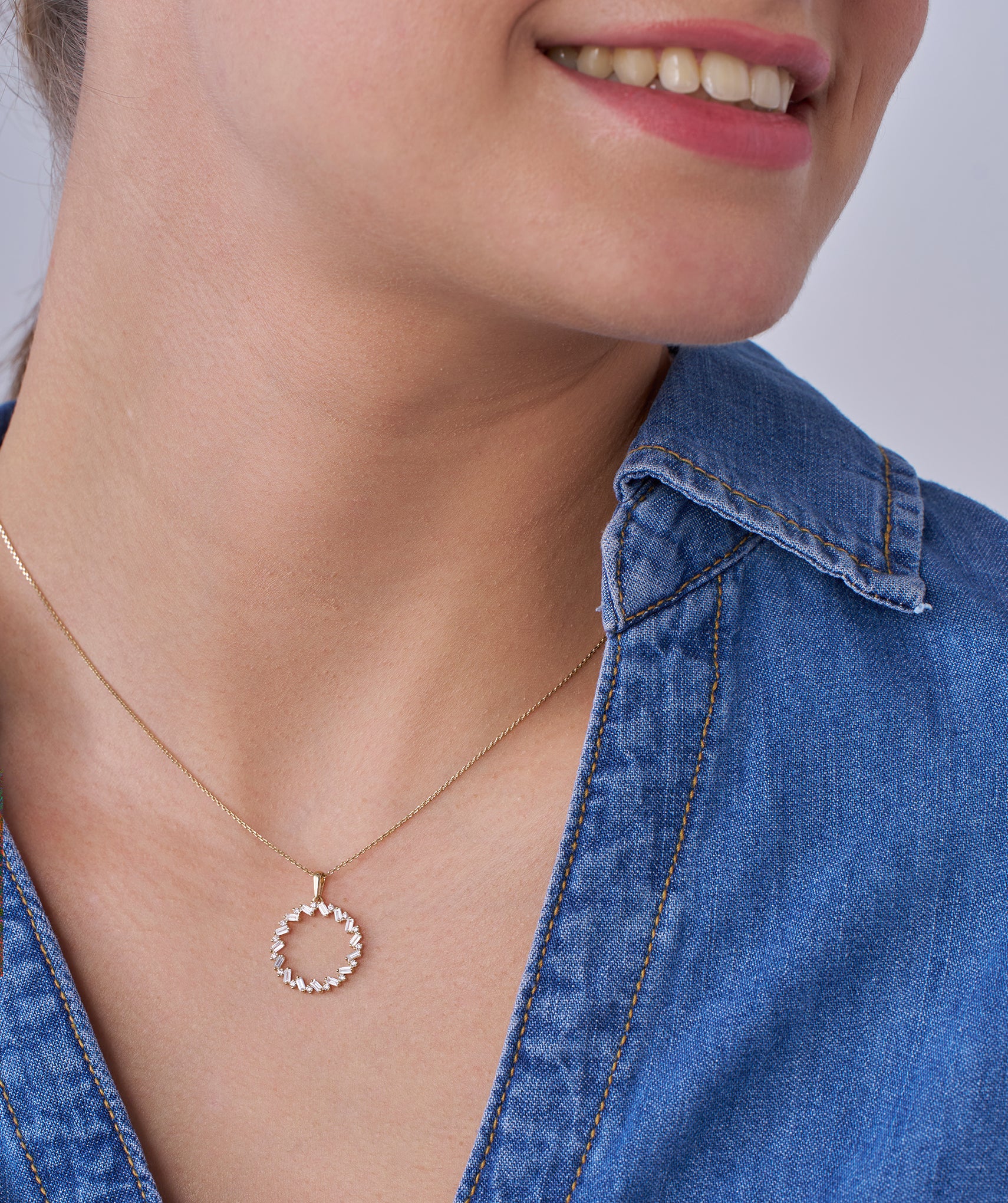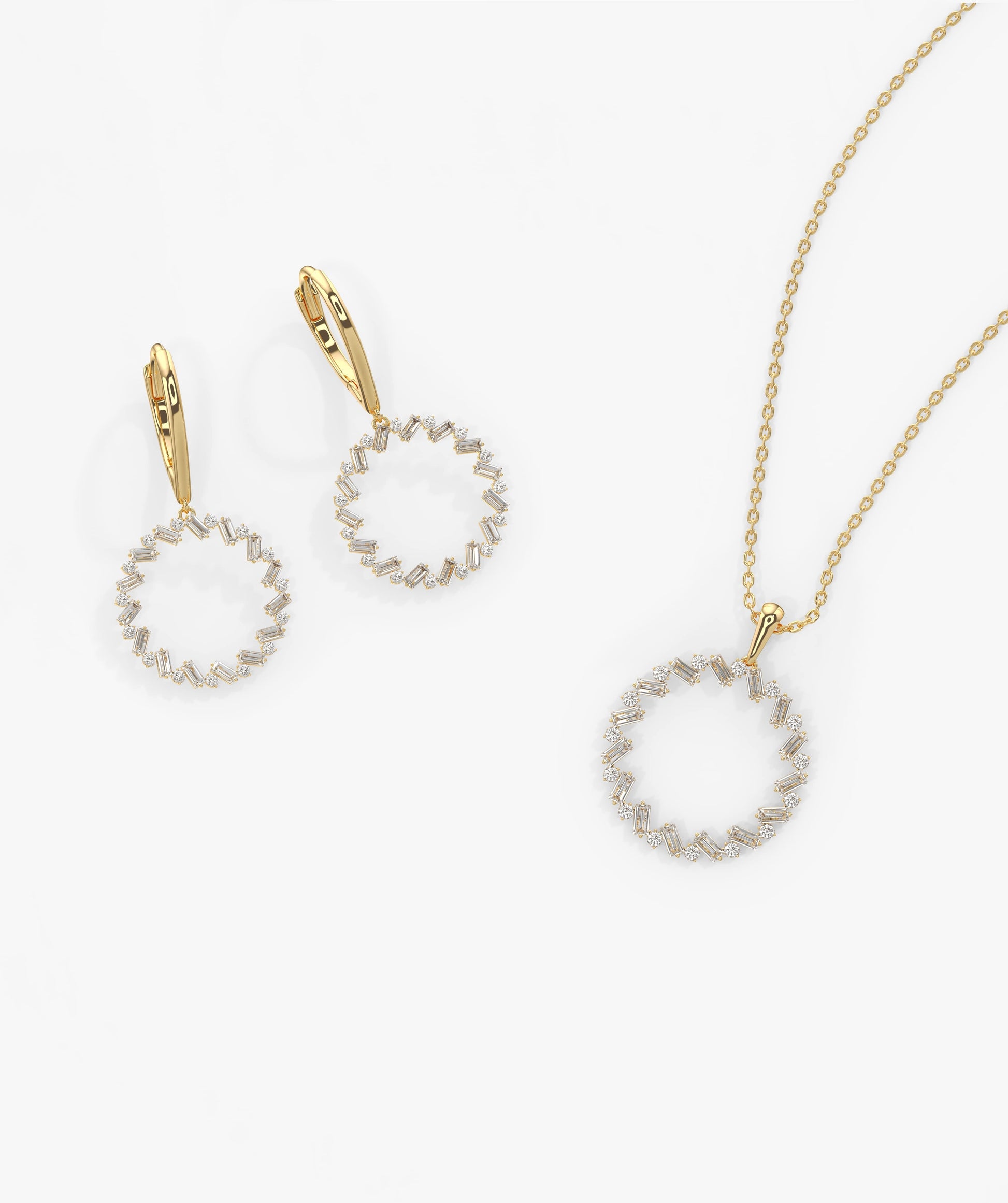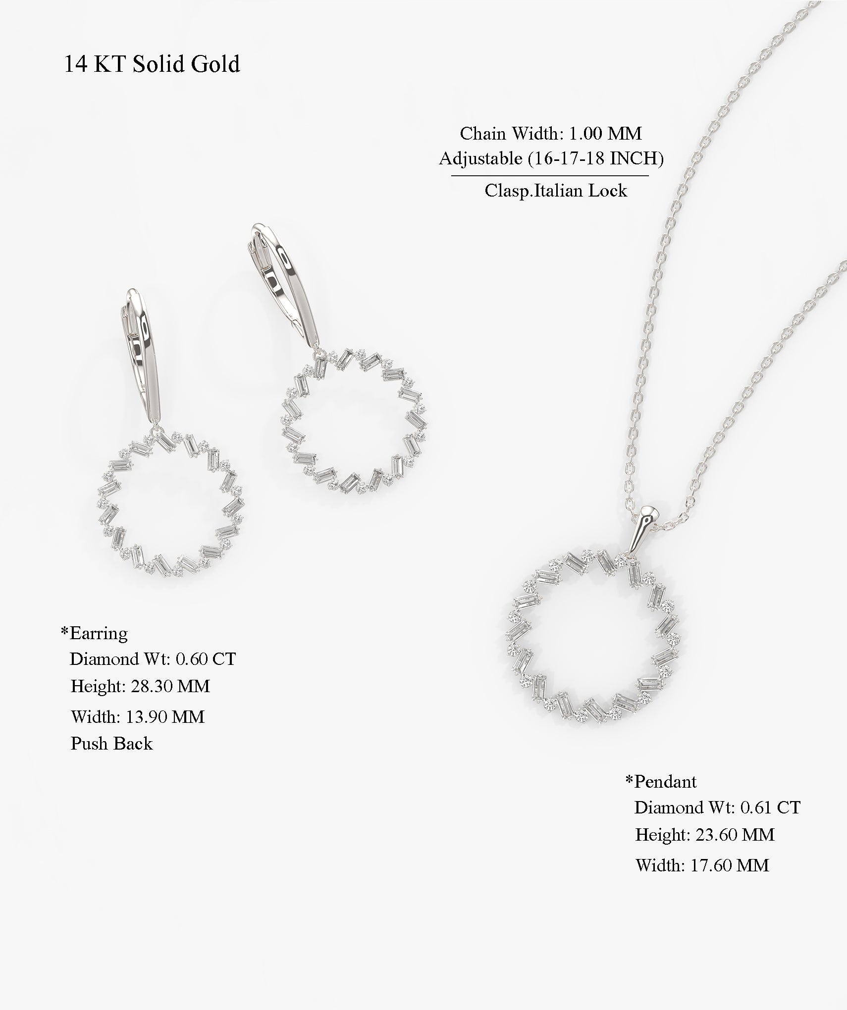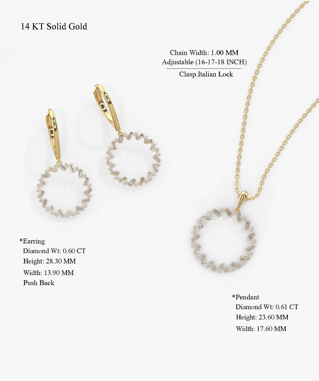 Crafted for modern sophistication, this 14K gold diamond jewelry set includes a sparkling circle pendant necklace and coordinating drop earrings. Designed with authentic natural diamonds, it’s ideal for self-gifting, weddings, and anniversaries. A timeless fine jewelry set for women who love refined, minimalist luxury.