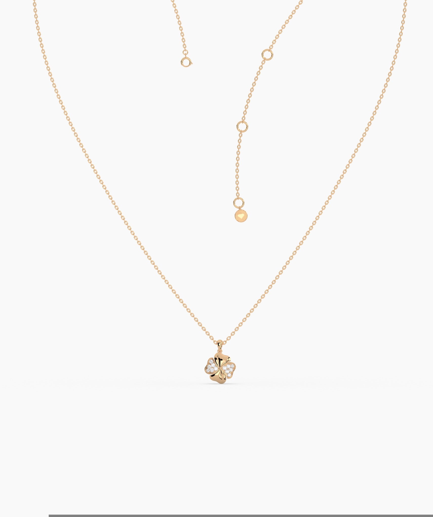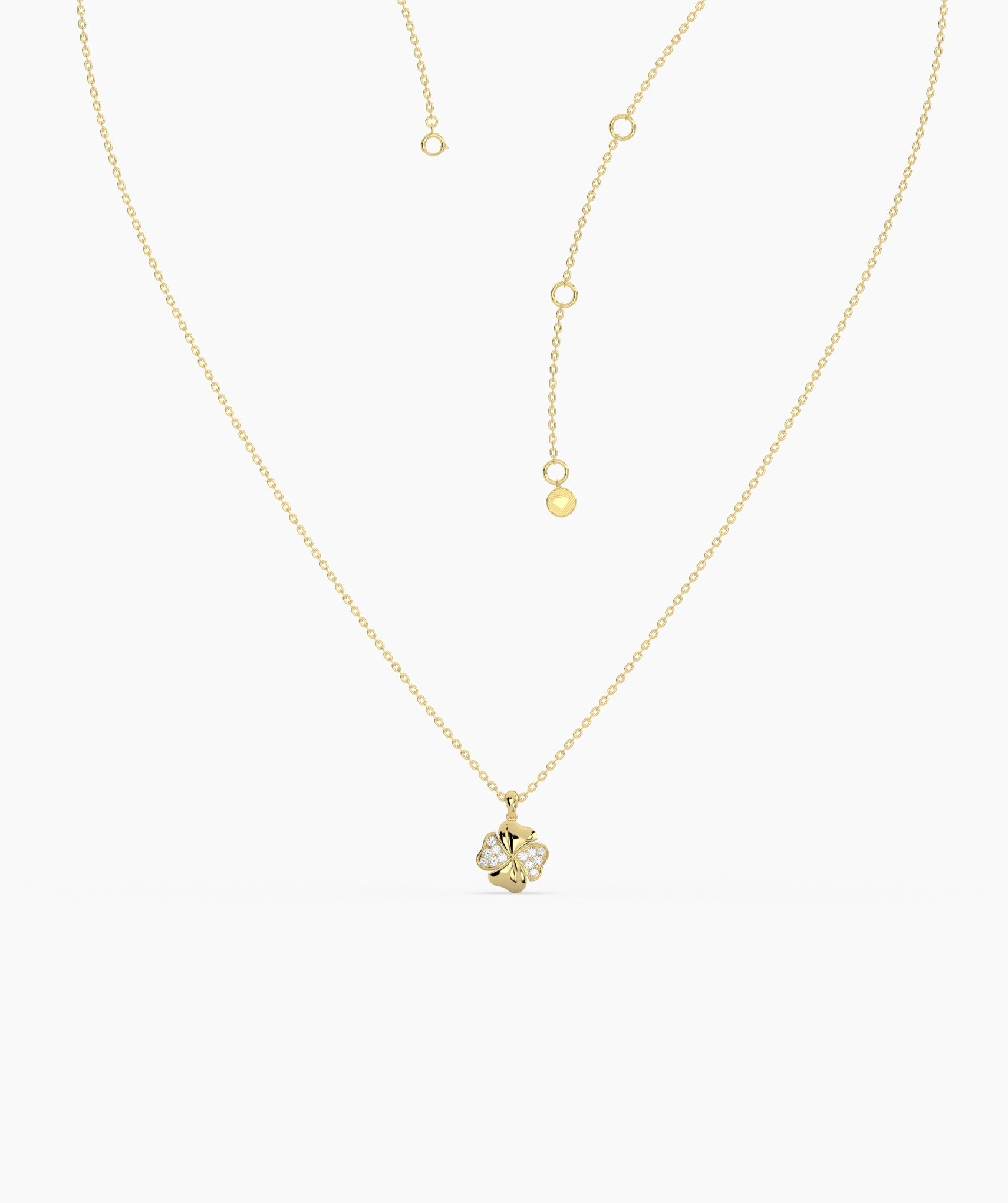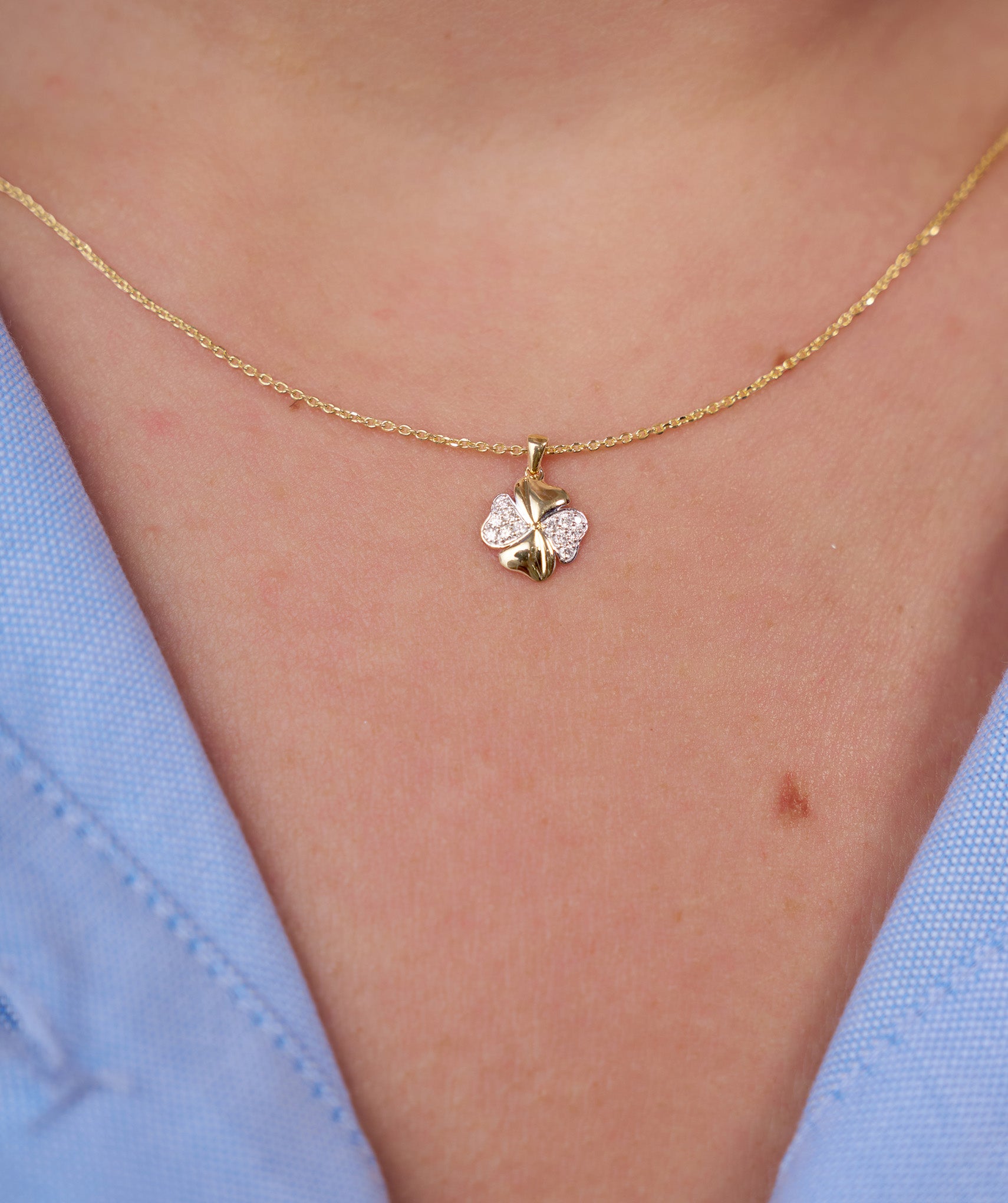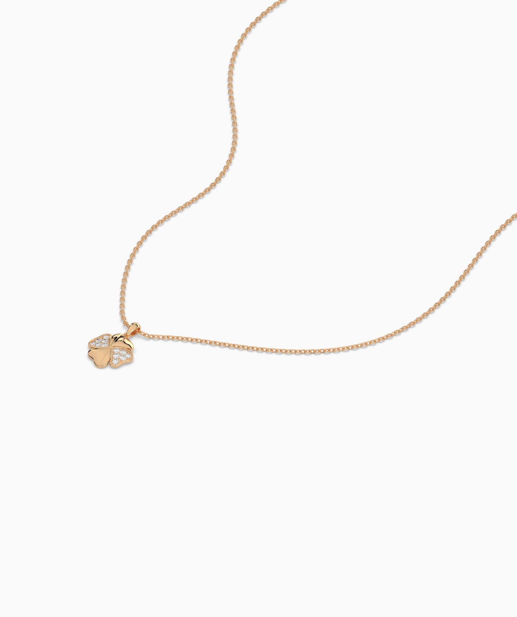 This exquisite gold necklace features a charming diamond-studded clover, symbolizing luck, love, and prosperity.