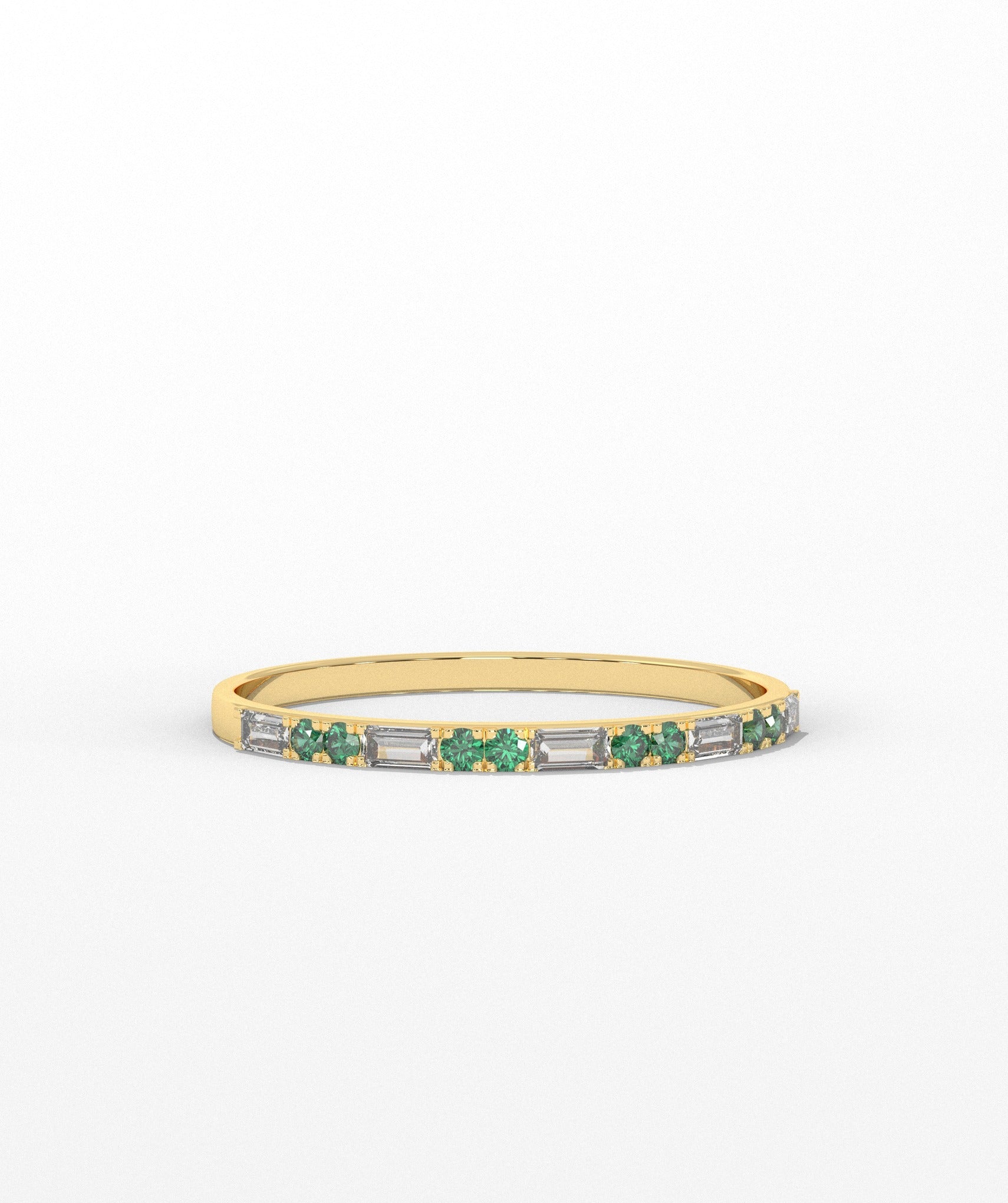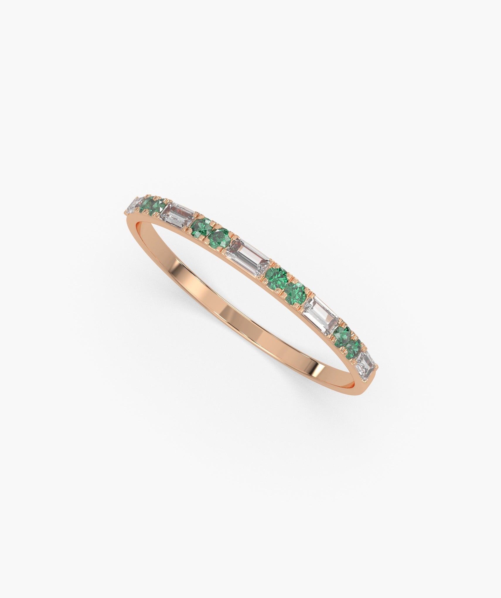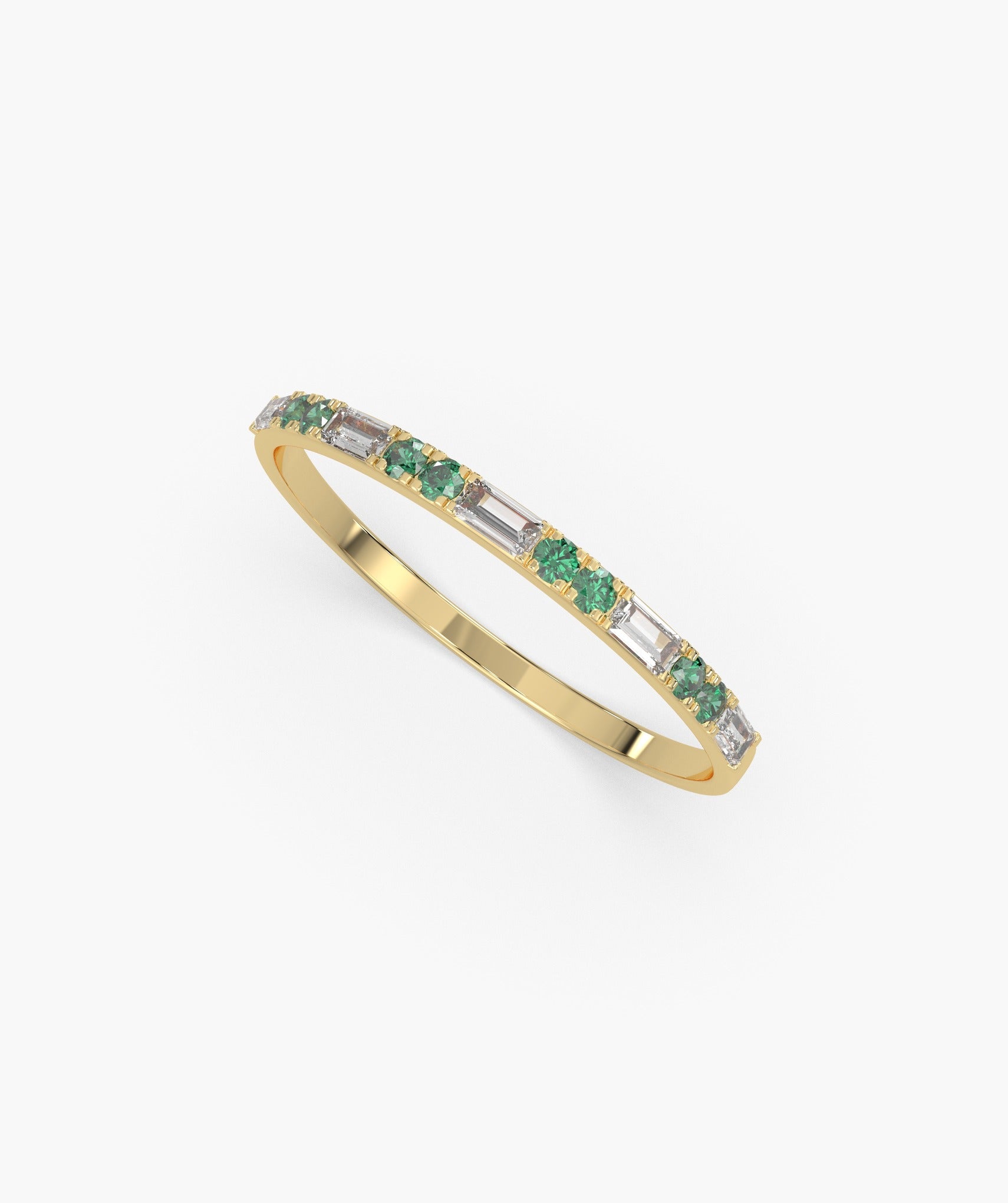 This 14K solid gold ring features a captivating blend of vibrant green stones and sparkling diamond accents.