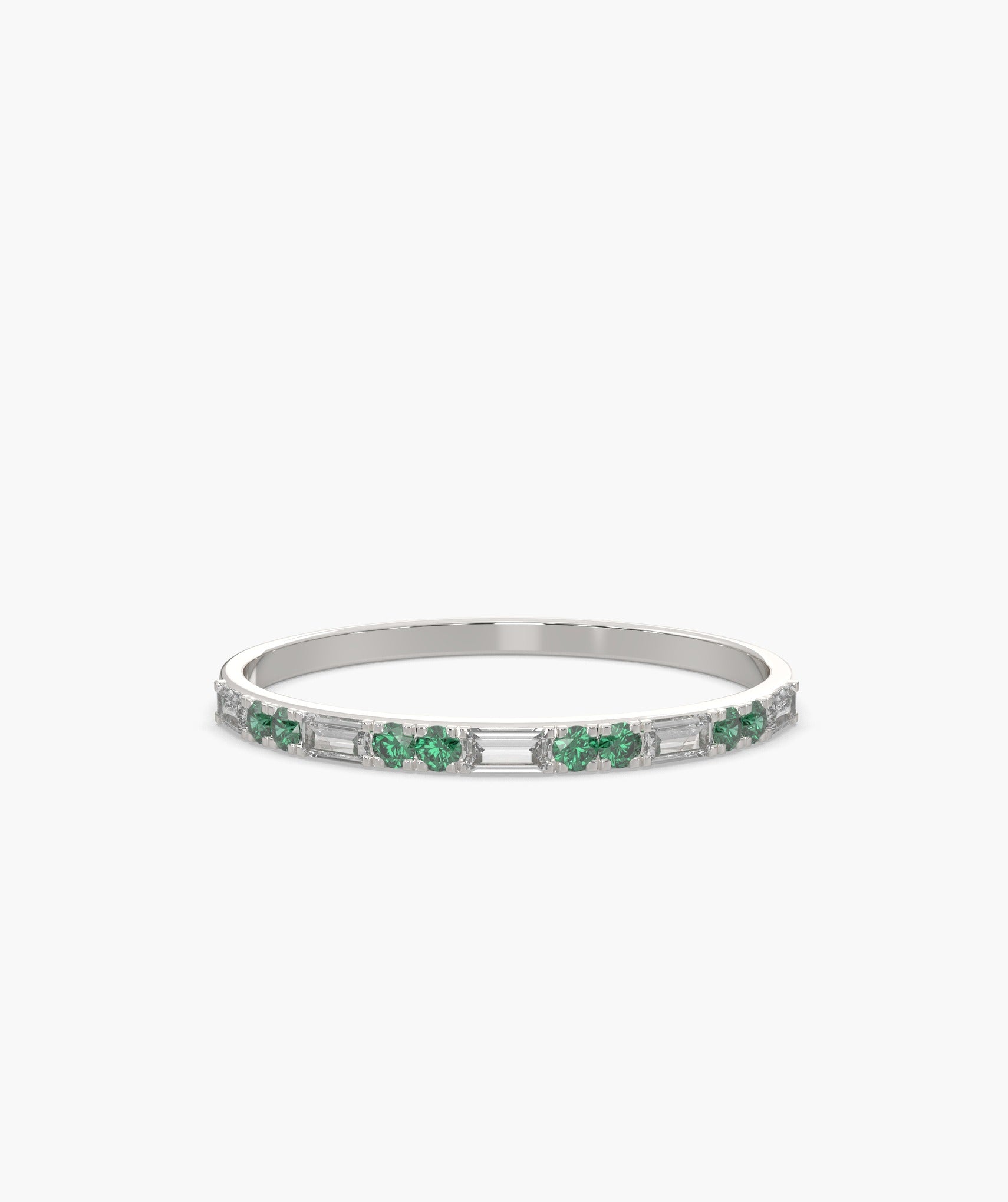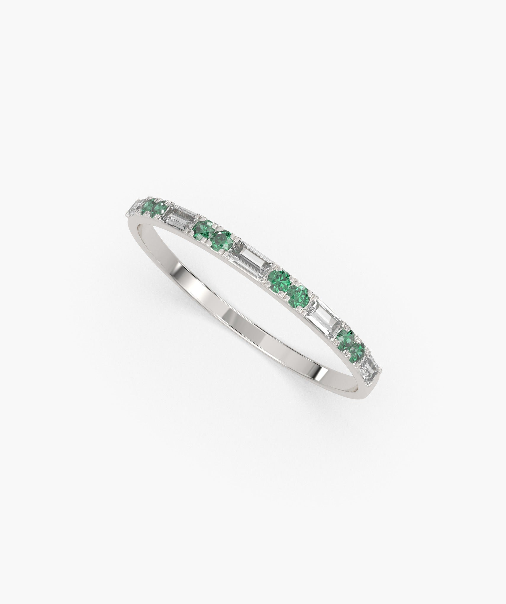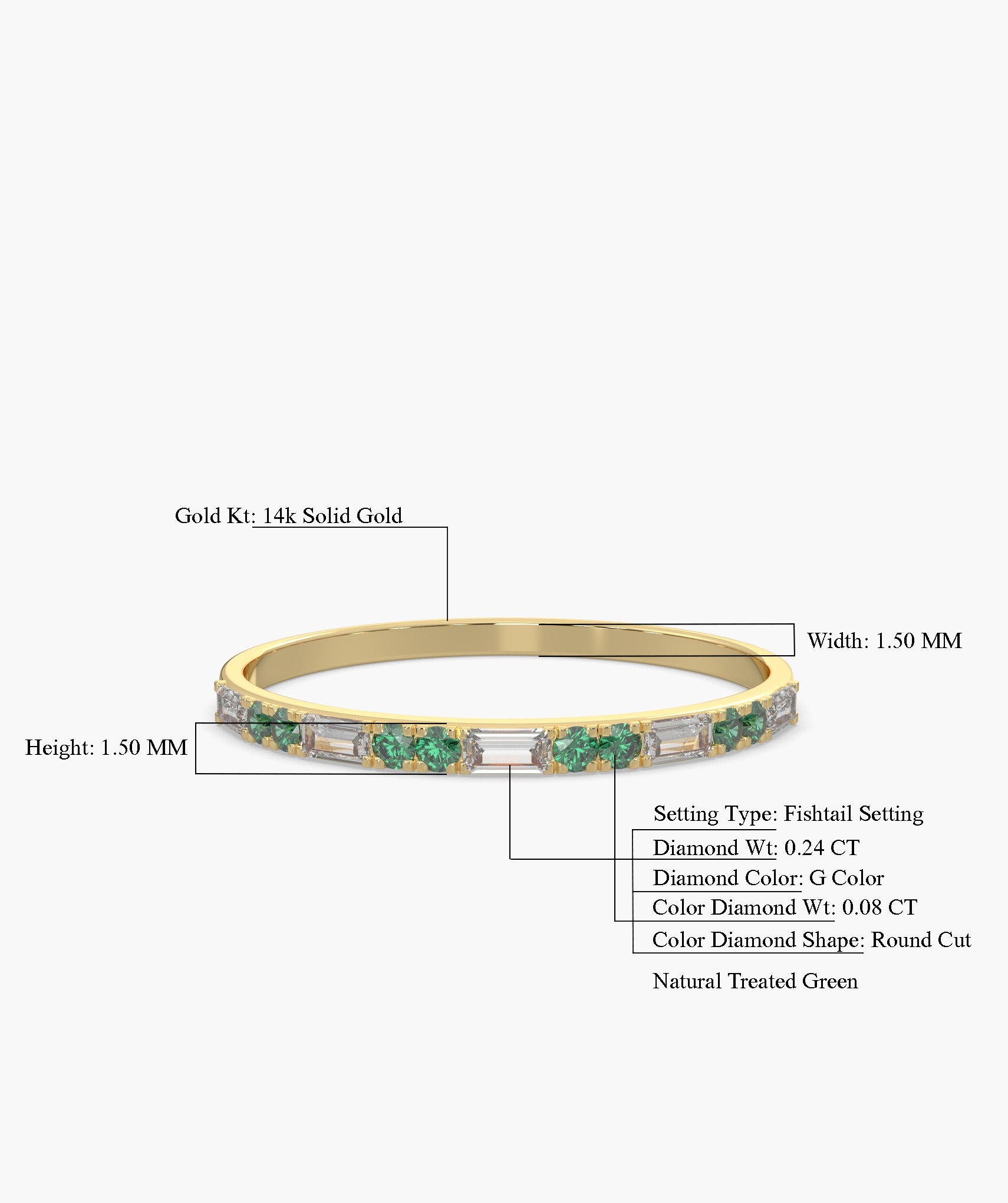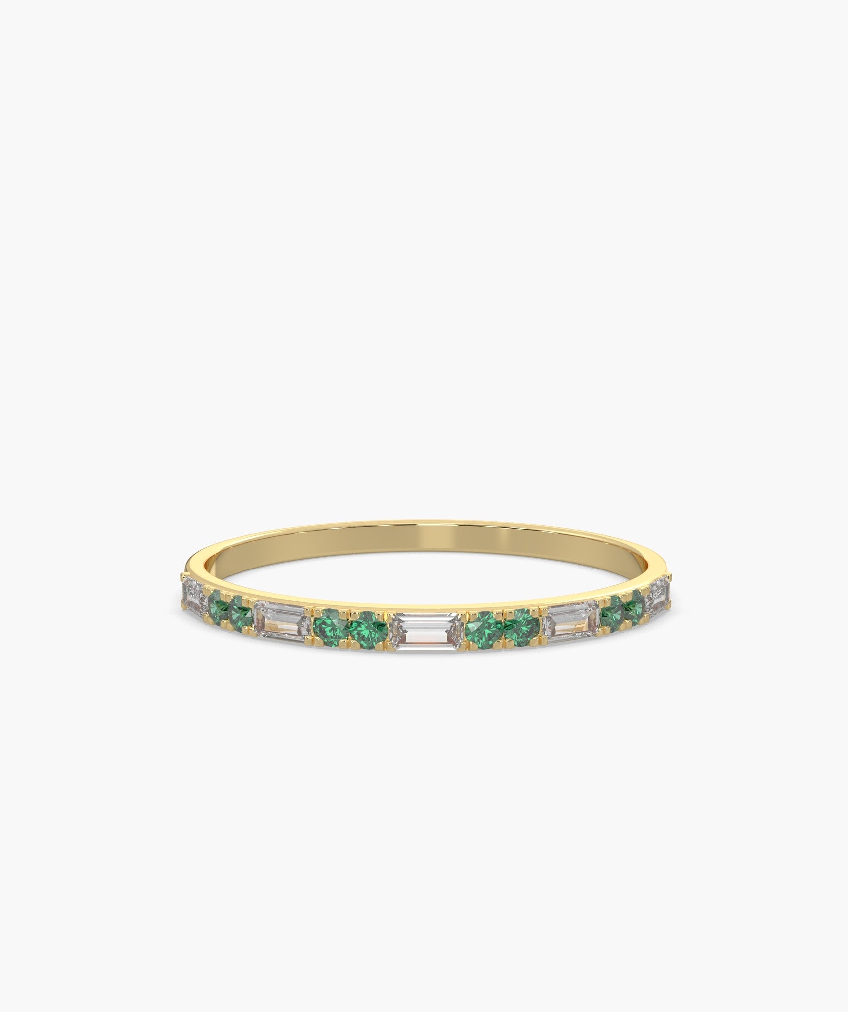 This 14K solid gold ring features a captivating blend of vibrant green stones and sparkling diamond accents.