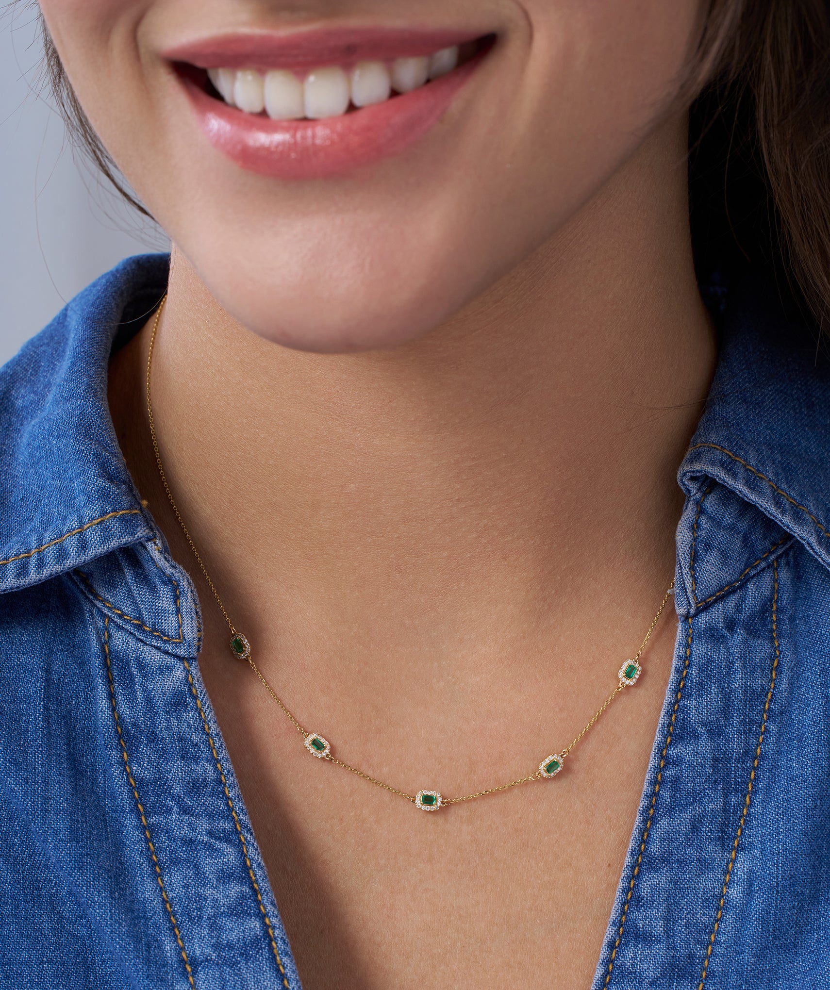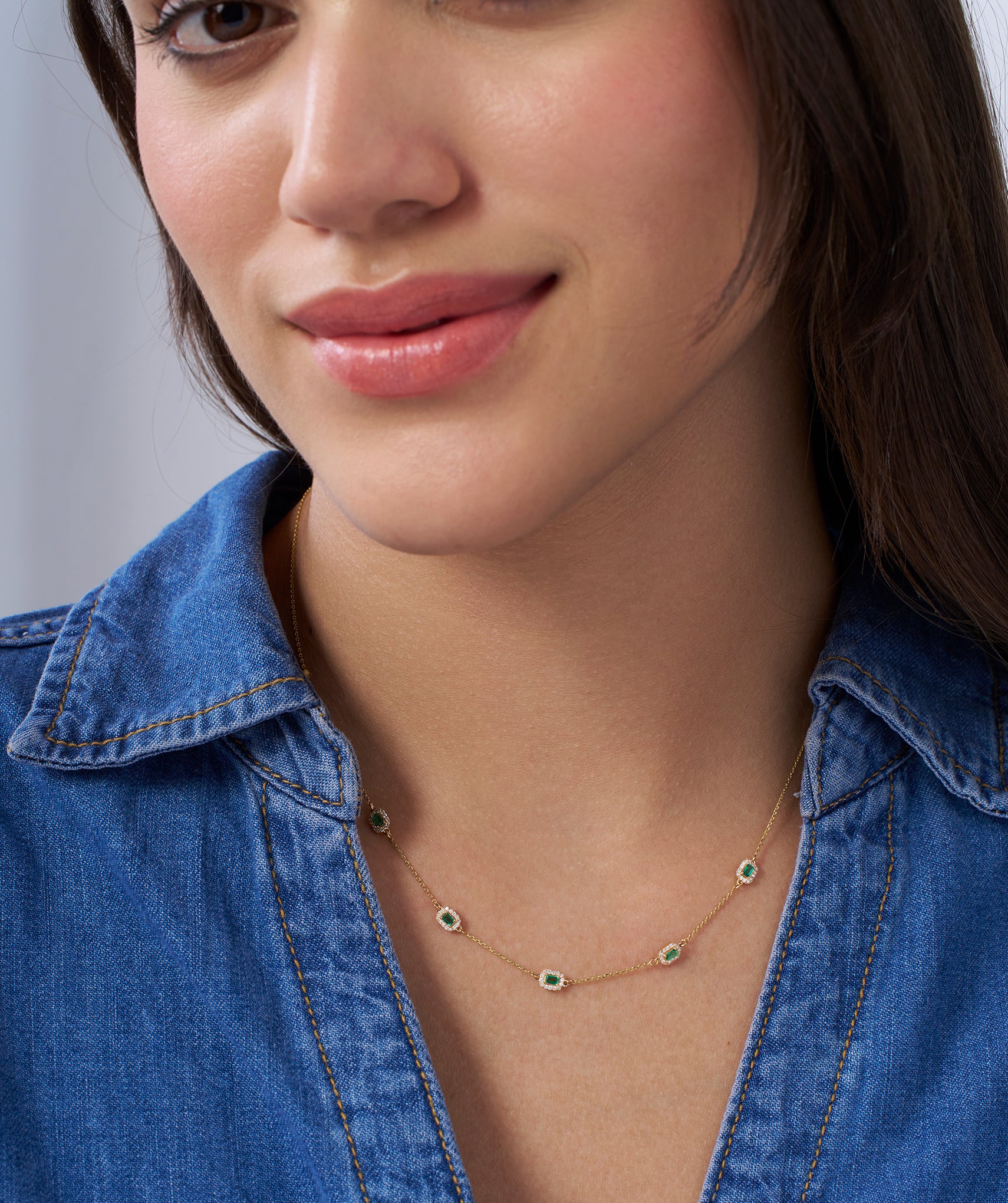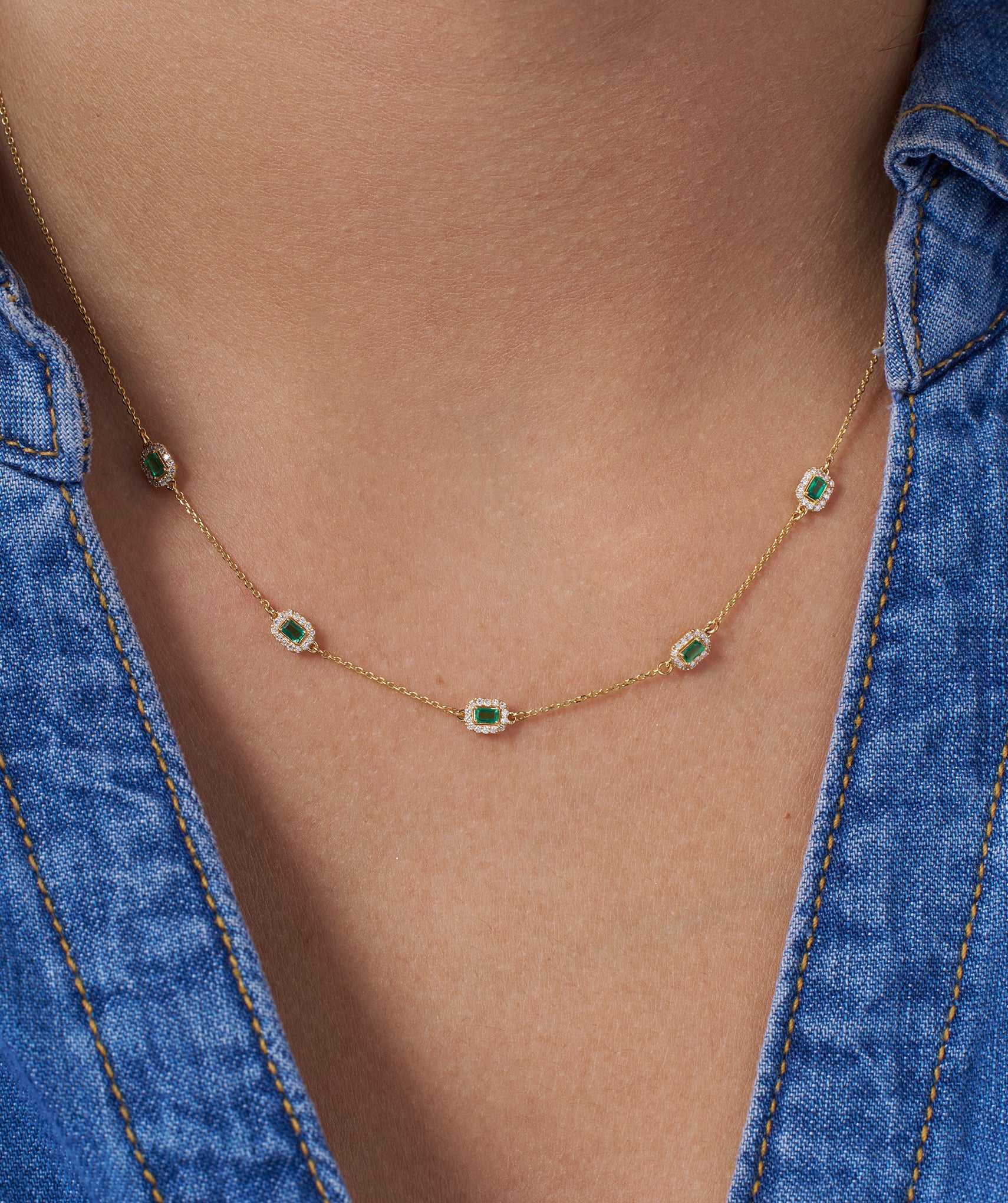 Bring a touch of regal modernism to your everyday wardrobe with a piece that balances vibrant color and classic structure. This station necklace features five emerald cut lab-grown emeralds, each encased in a shimmering pave set halo of lab-grown diamonds. Crafted in high-quality gold vermeil, the stations are perfectly spaced along a delicate chain to catch the light with every movement. It’s a sophisticated choice for women who appreciate fine jewelry that feels special enough for an event but is lightweight and comfortable enough for daily wear. this necklace serves as a bold yet refined talisman that layers beautifully with your favorite gold chains or shines brilliantly as a solo statement piece.