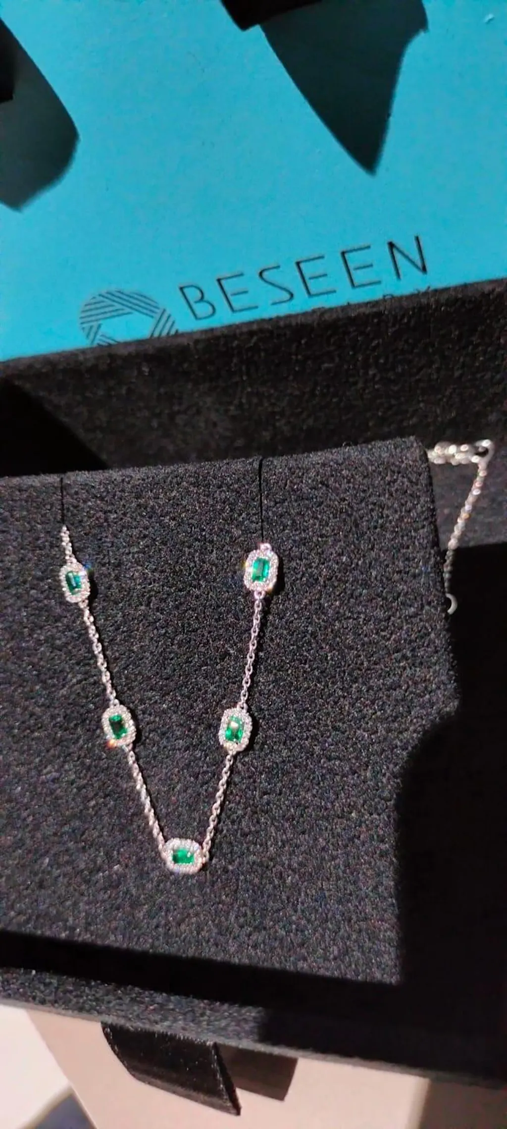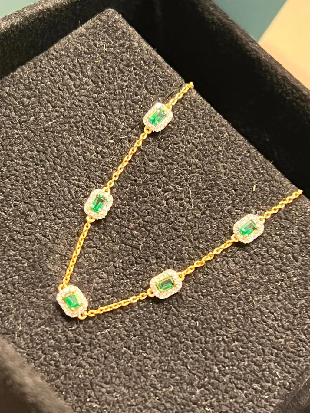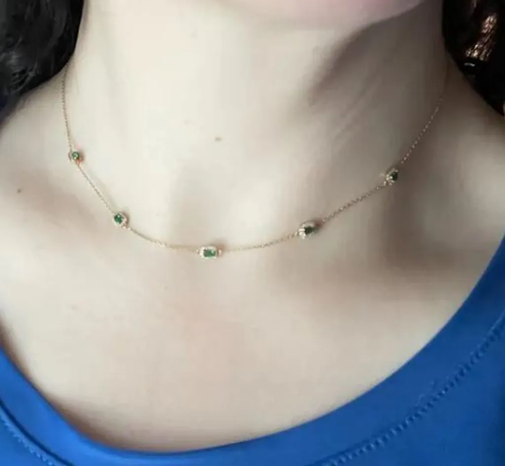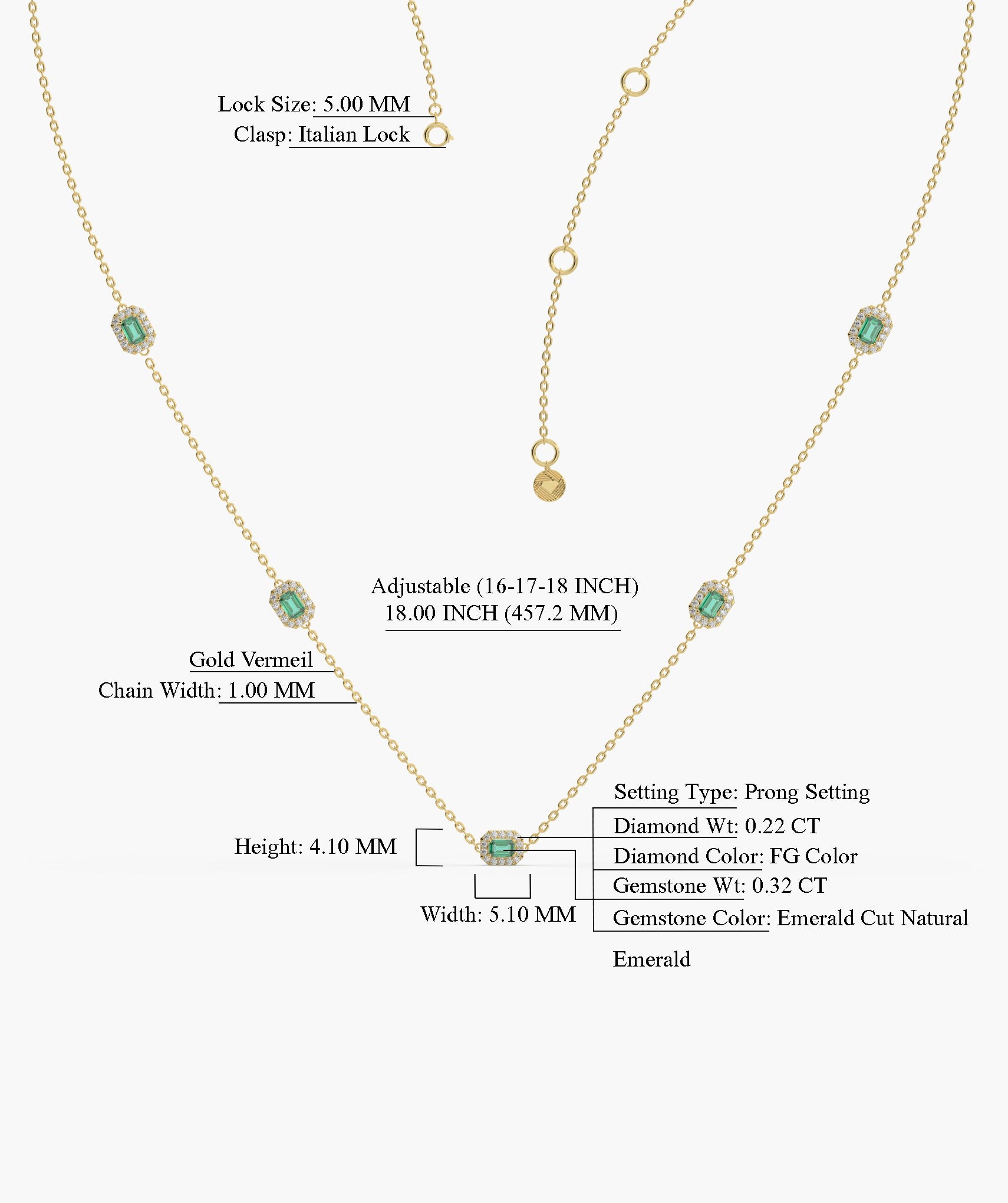 Bring a touch of regal modernism to your everyday wardrobe with a piece that balances vibrant color and classic structure. This station necklace features five emerald cut lab-grown emeralds, each encased in a shimmering pave set halo of lab-grown diamonds. Crafted in high-quality gold vermeil, the stations are perfectly spaced along a delicate chain to catch the light with every movement. It’s a sophisticated choice for women who appreciate fine jewelry that feels special enough for an event but is lightweight and comfortable enough for daily wear. this necklace serves as a bold yet refined talisman that layers beautifully with your favorite gold chains or shines brilliantly as a solo statement piece.