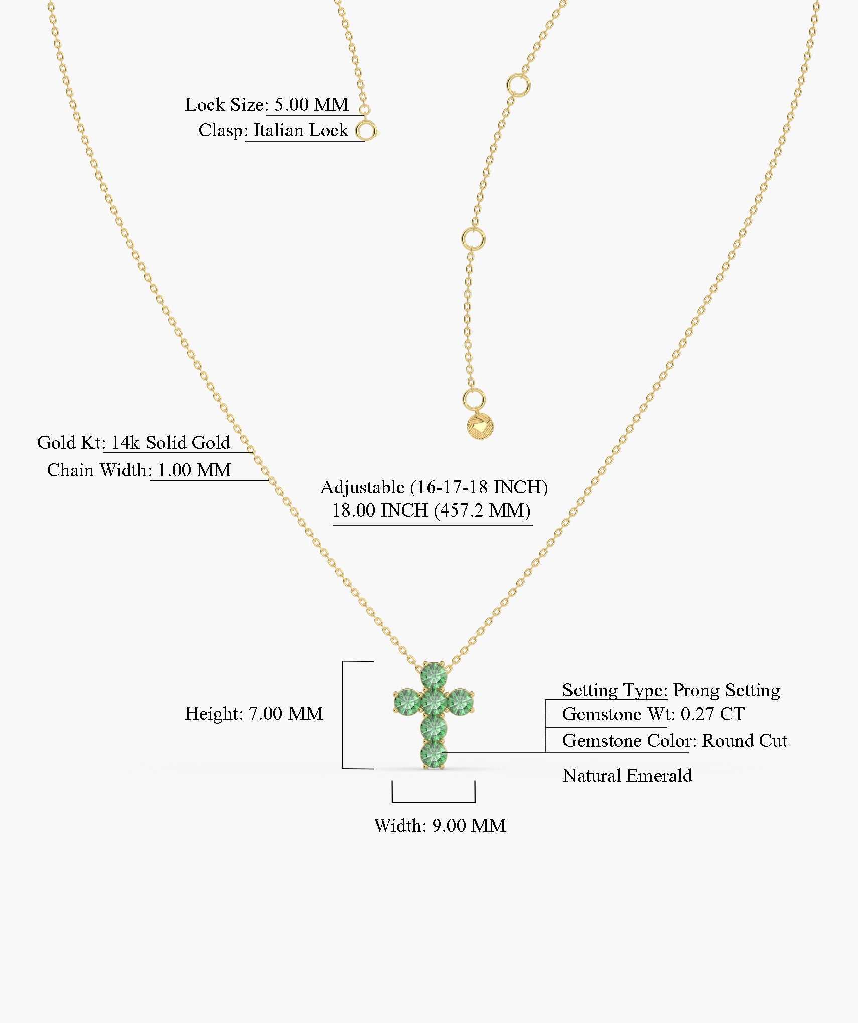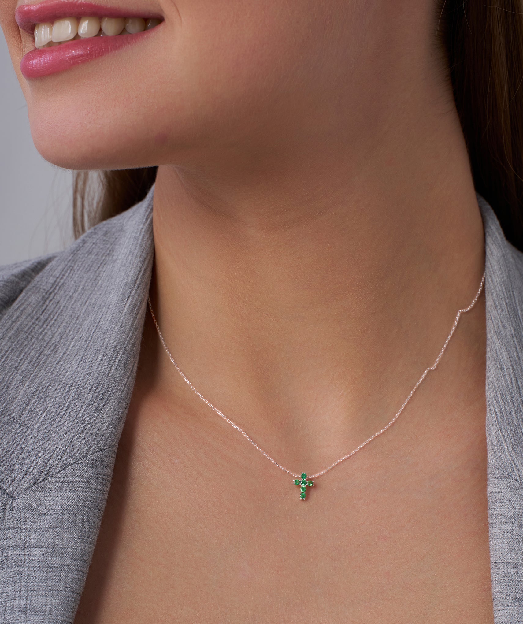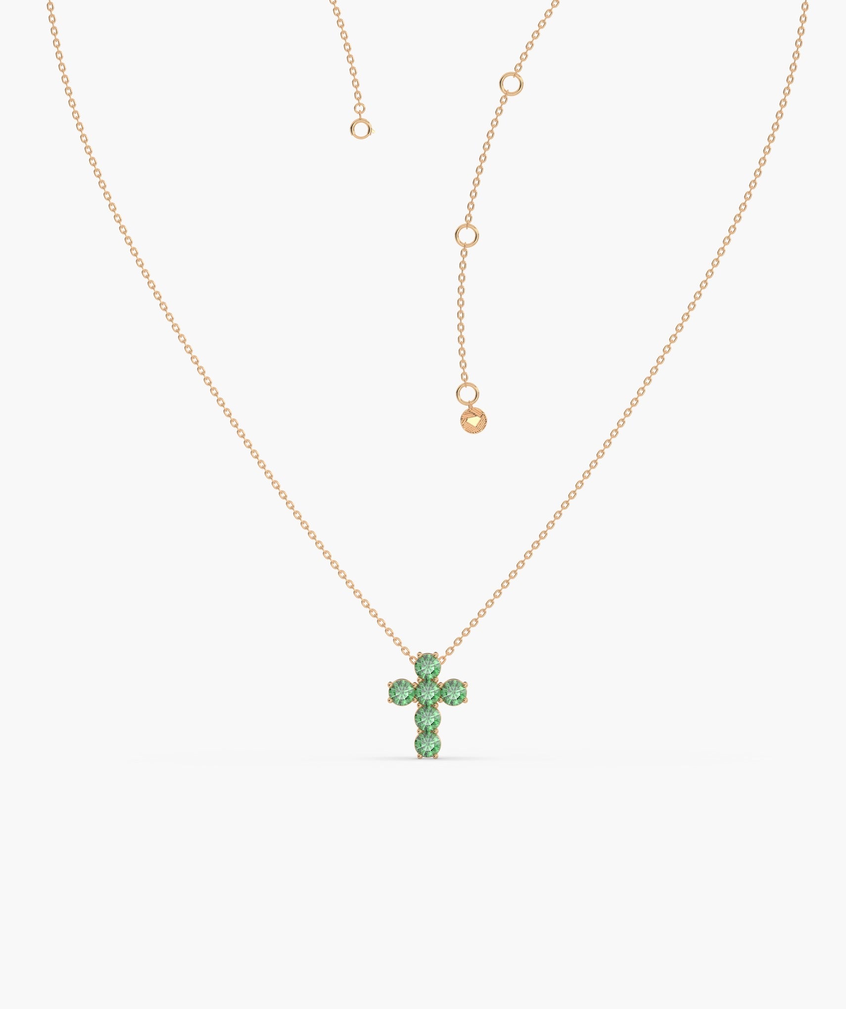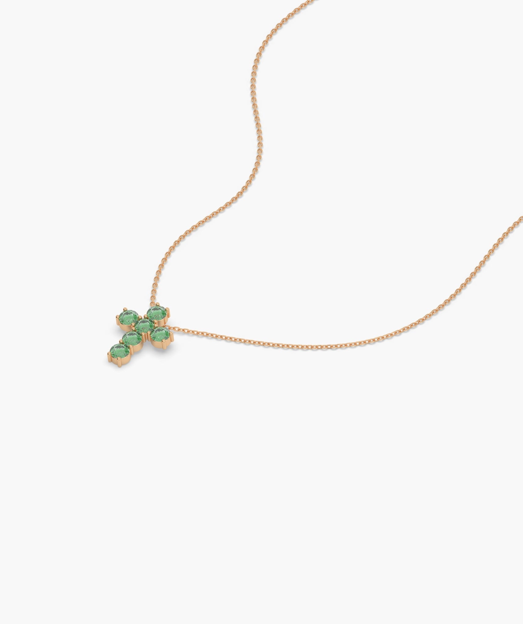 A timeless 14K solid gold necklace featuring a radiant cross pendant adorned with vibrant green diamonds.