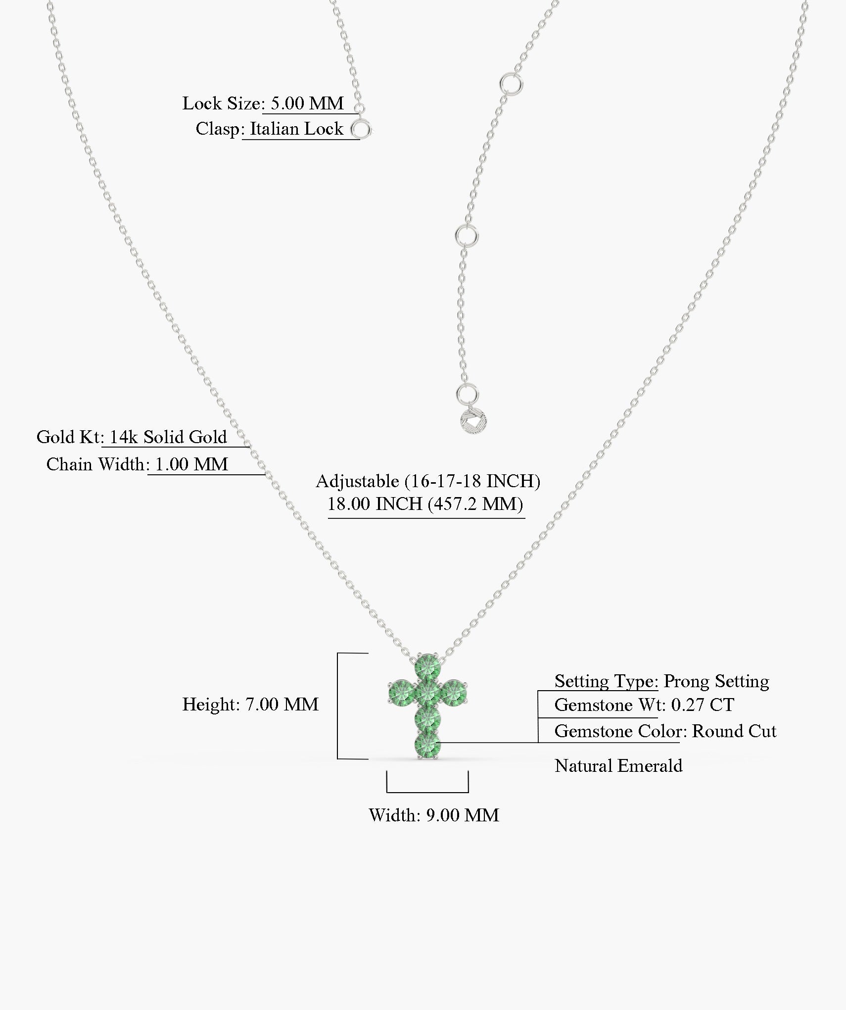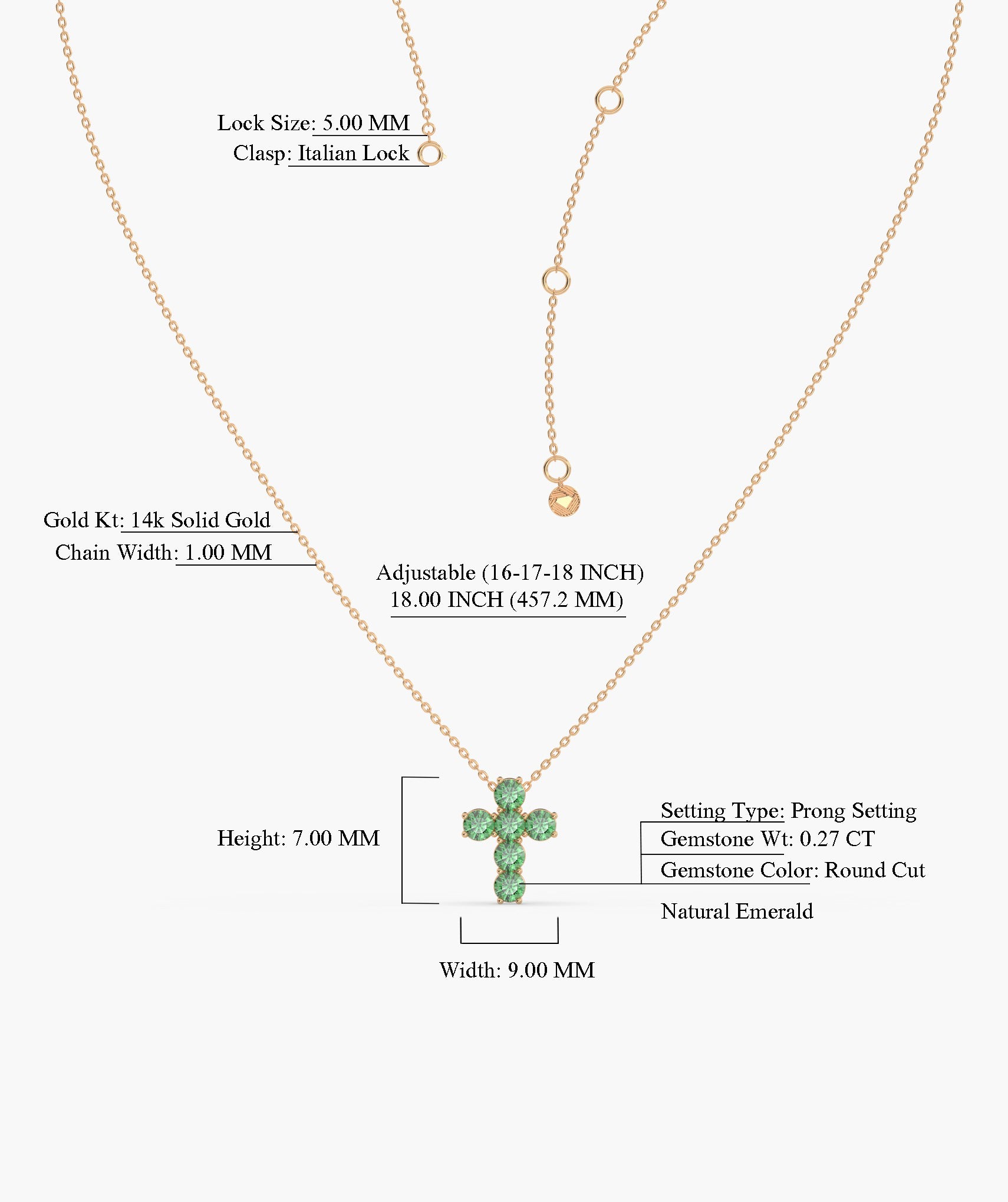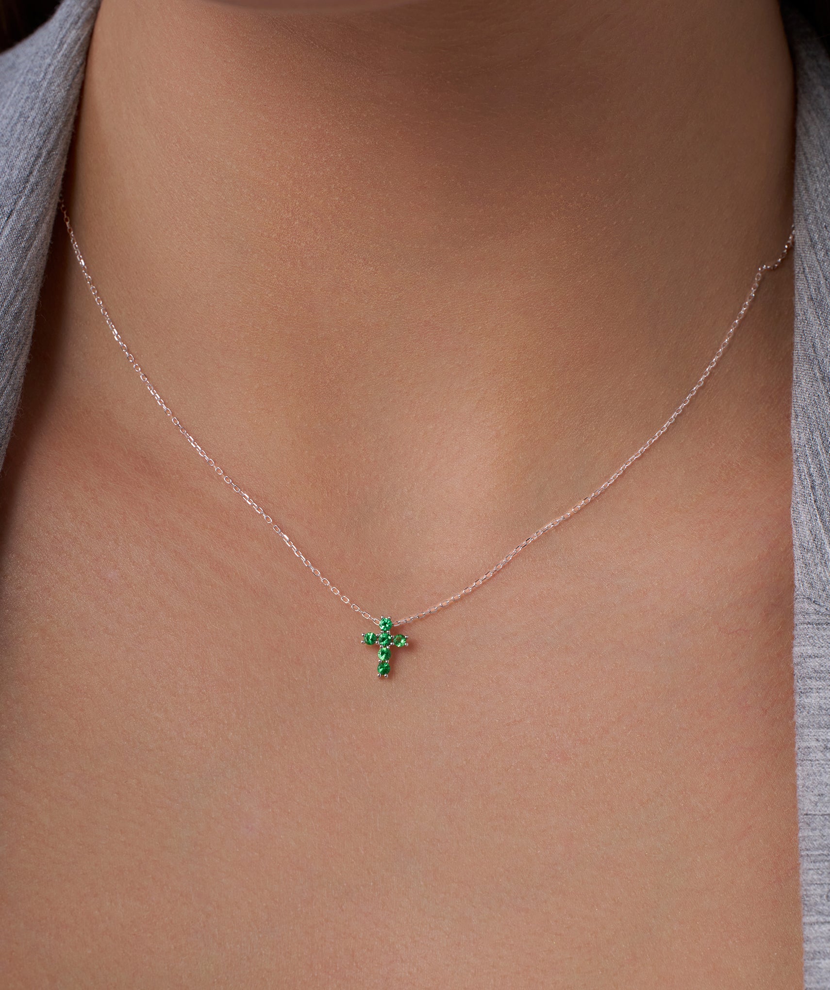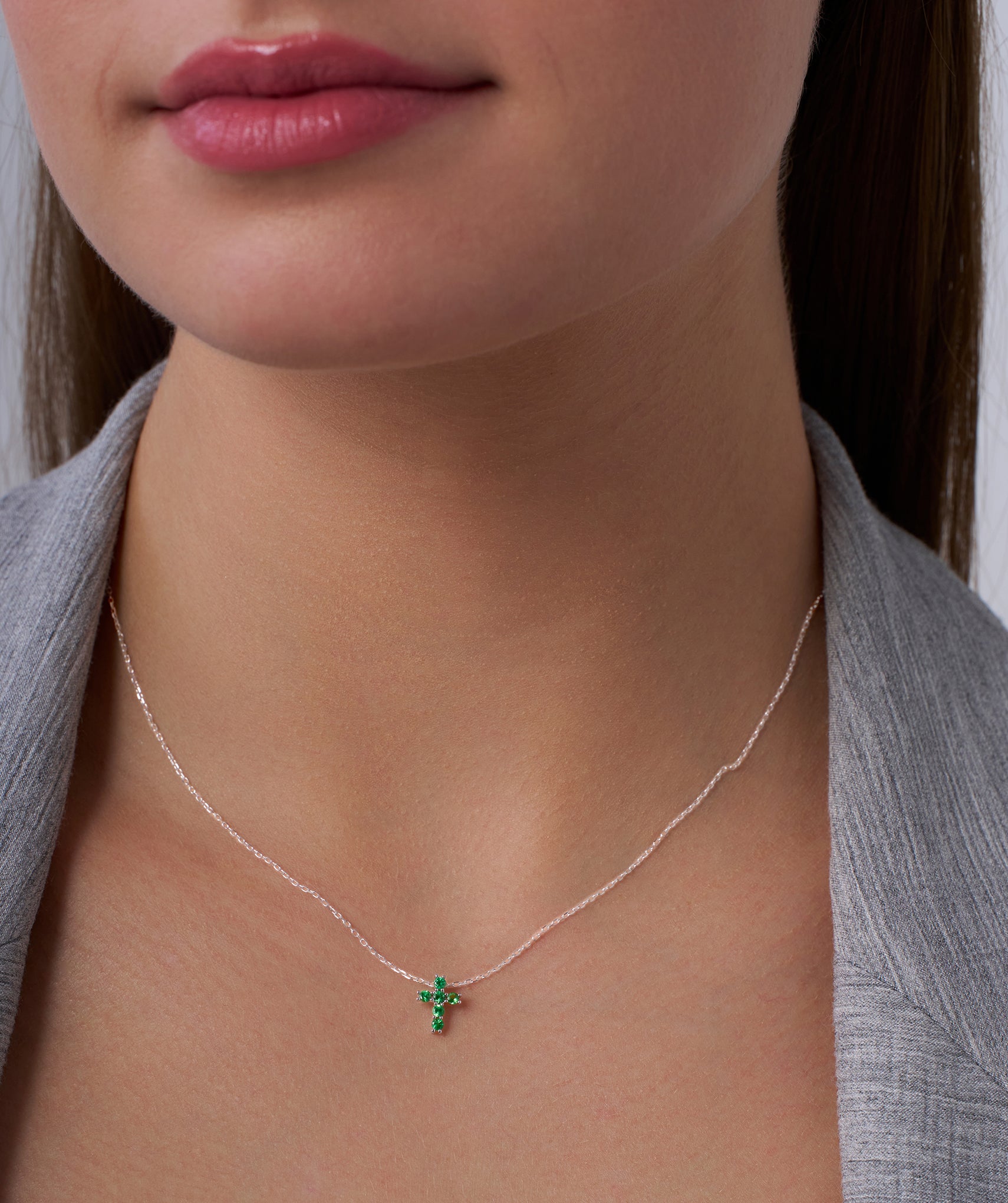 A timeless 14K solid gold necklace featuring a radiant cross pendant adorned with vibrant green diamonds.