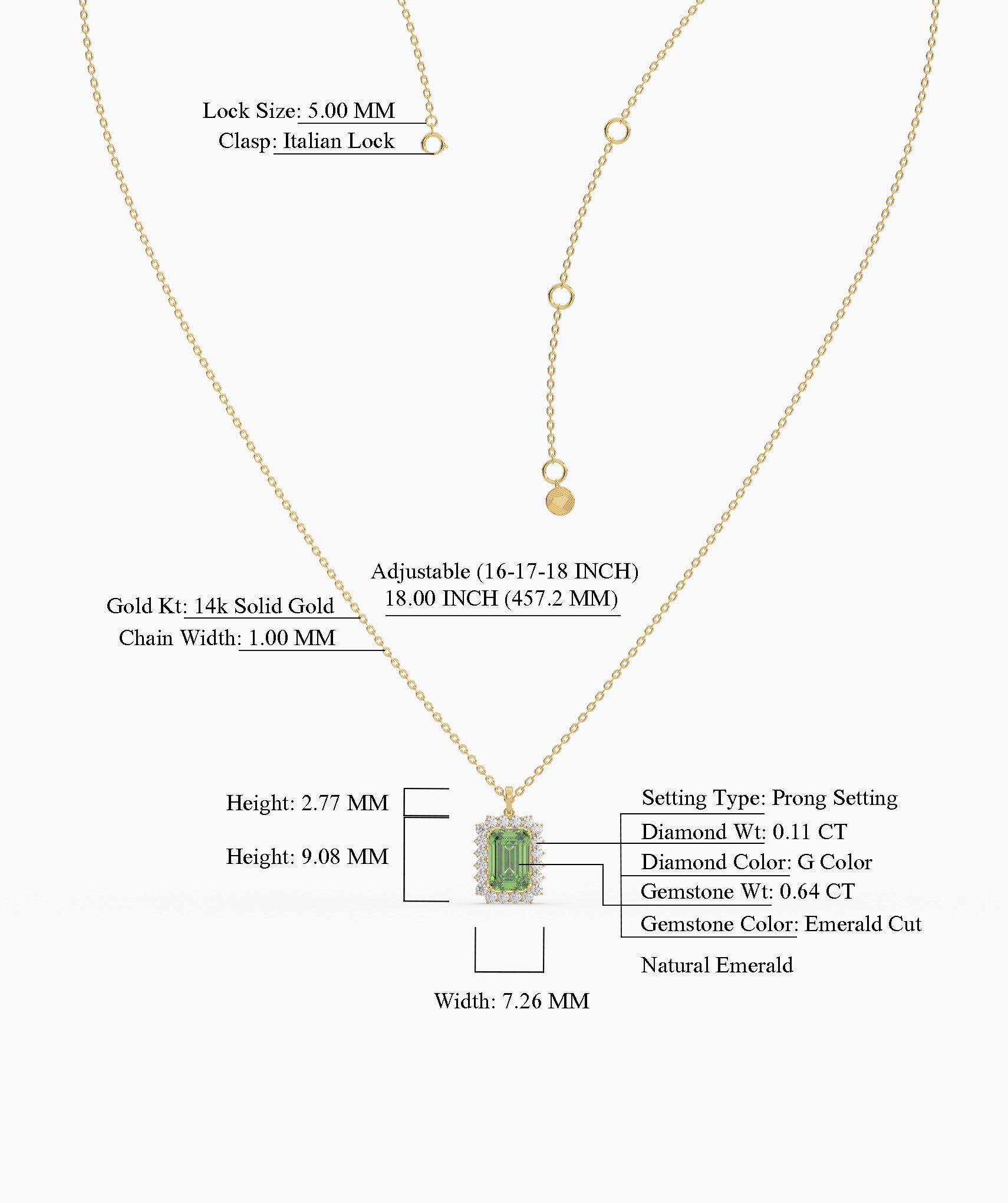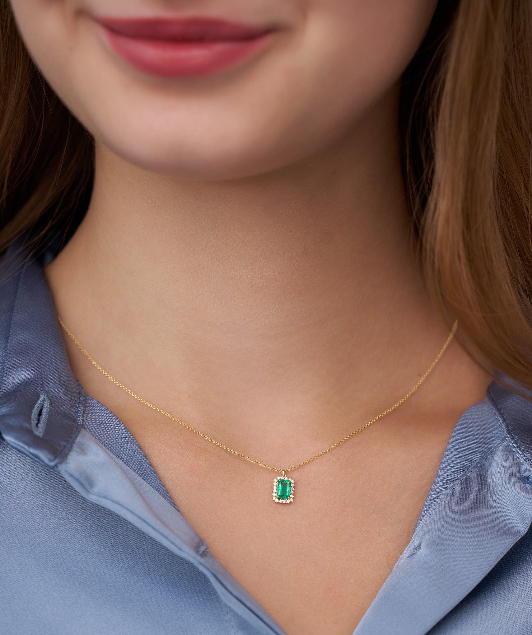 Bring a vibrant touch of nature to your daily armor. This sophisticated pendant centers on a lush 0.64ct emerald-cut natural emerald, known for its deep, mesmerizing green hue. It is framed by a sparkling halo of 0.11ct round G-color diamonds that amplify its rich color and geometric shape. Set in 14K solid gold, the pendant features a delicate 9.08mm drop and hangs from a fine 1.00mm chain that adjusts from 16 to 18 inches, ensuring the perfect fit for any neckline. Available in yellow, white, and rose gold to suit your personal palette. Whether you are dressing up a white tee or accessorizing for a night out, this piece adds timeless elegance that feels effortlessly right.