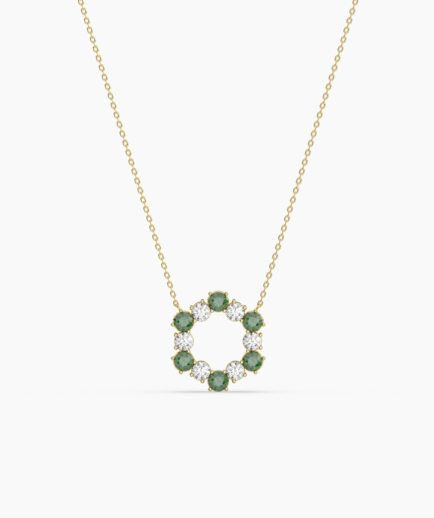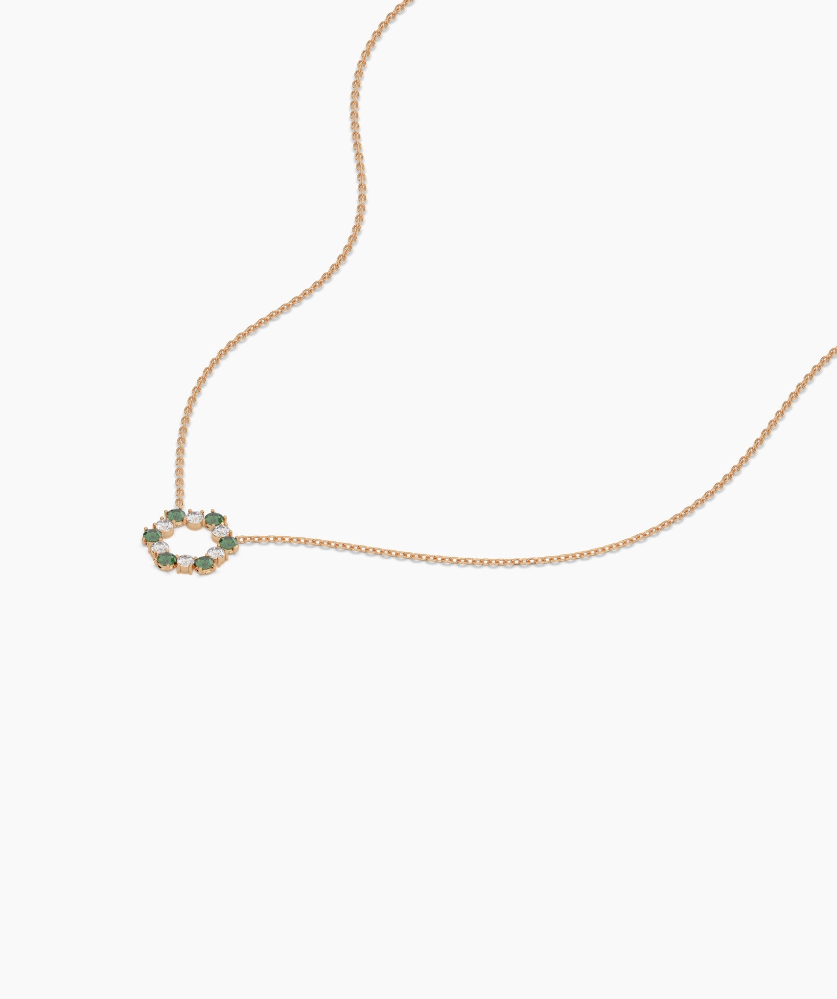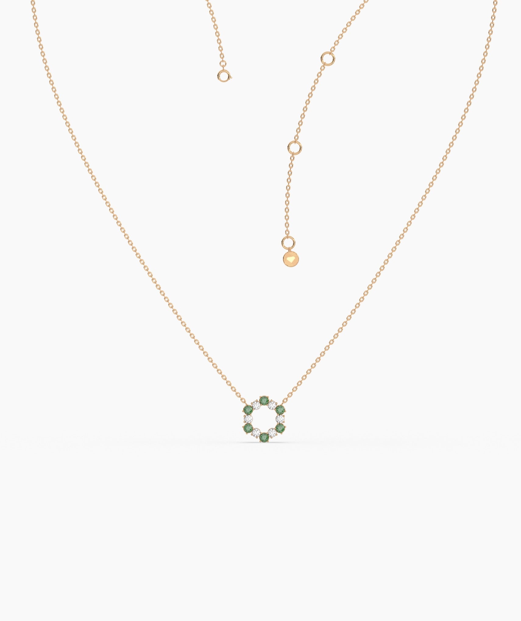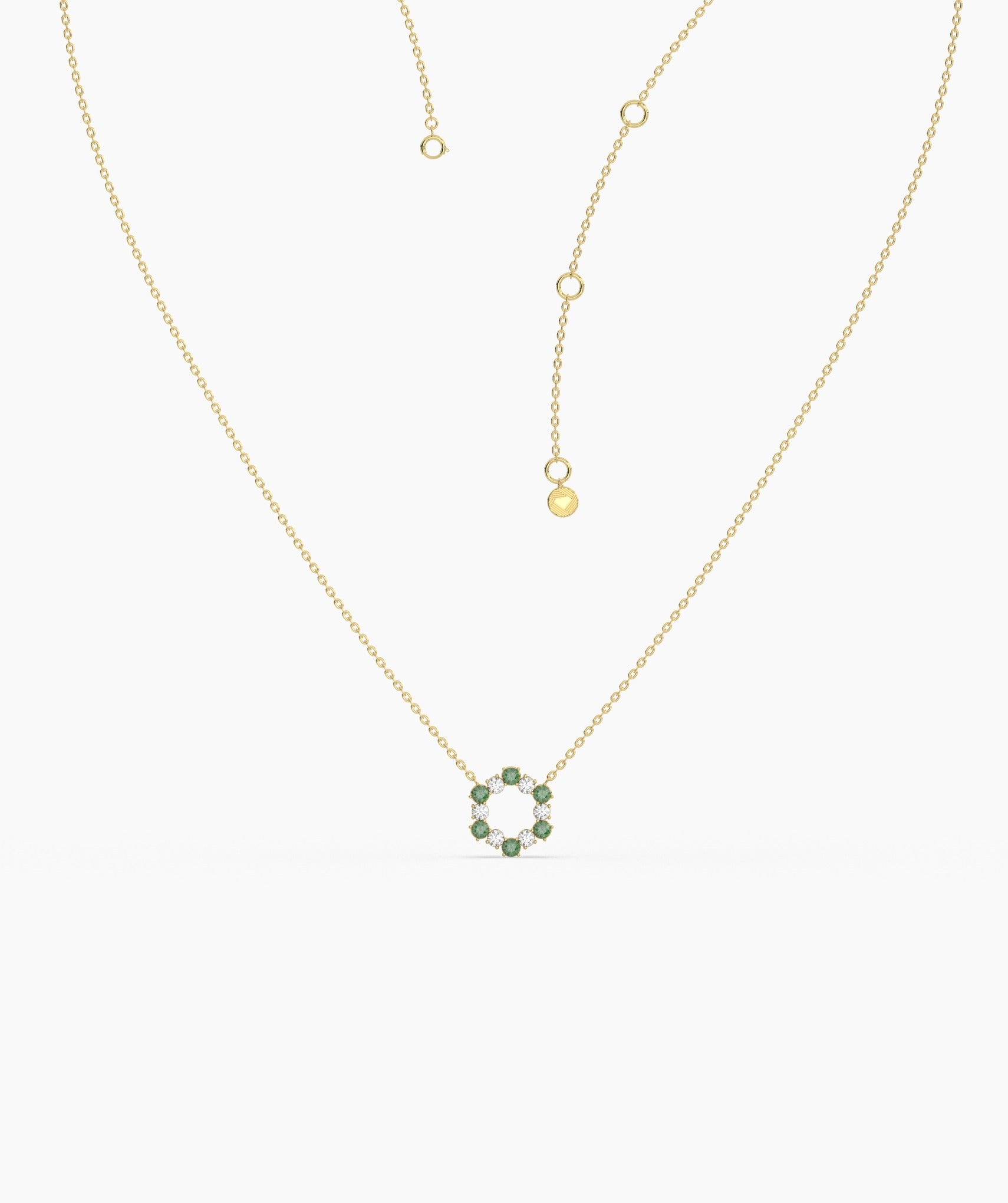 A beautifully crafted gold circle pendant featuring alternating emeralds and diamonds for a timeless, elegant look.
