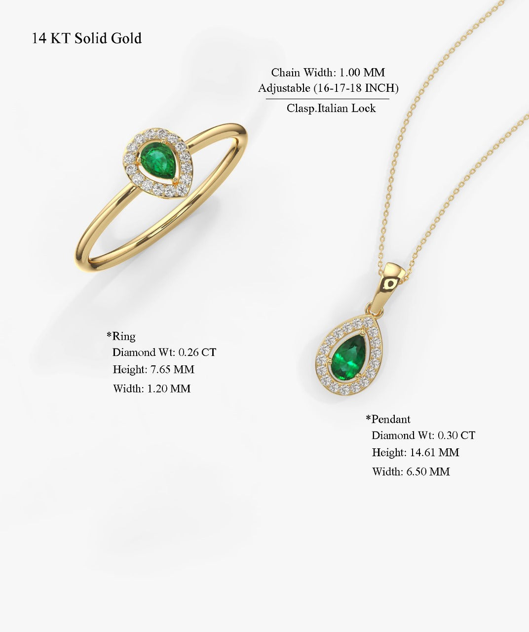 This luxurious jewelry set features a pear-shaped emerald framed by natural round-cut diamonds, set in 14k solid yellow gold. The set includes an adjustable 16–18 inch pendant necklace and a matching ring, each designed for timeless elegance. Perfect for birthdays, anniversaries, or self-gifting, this set blends classic beauty with modern sophistication.
