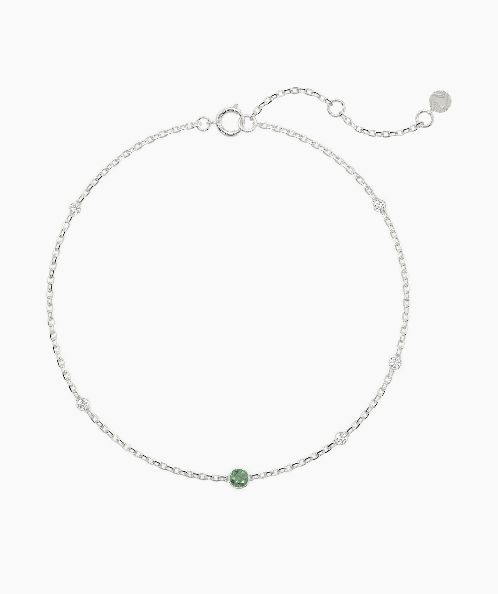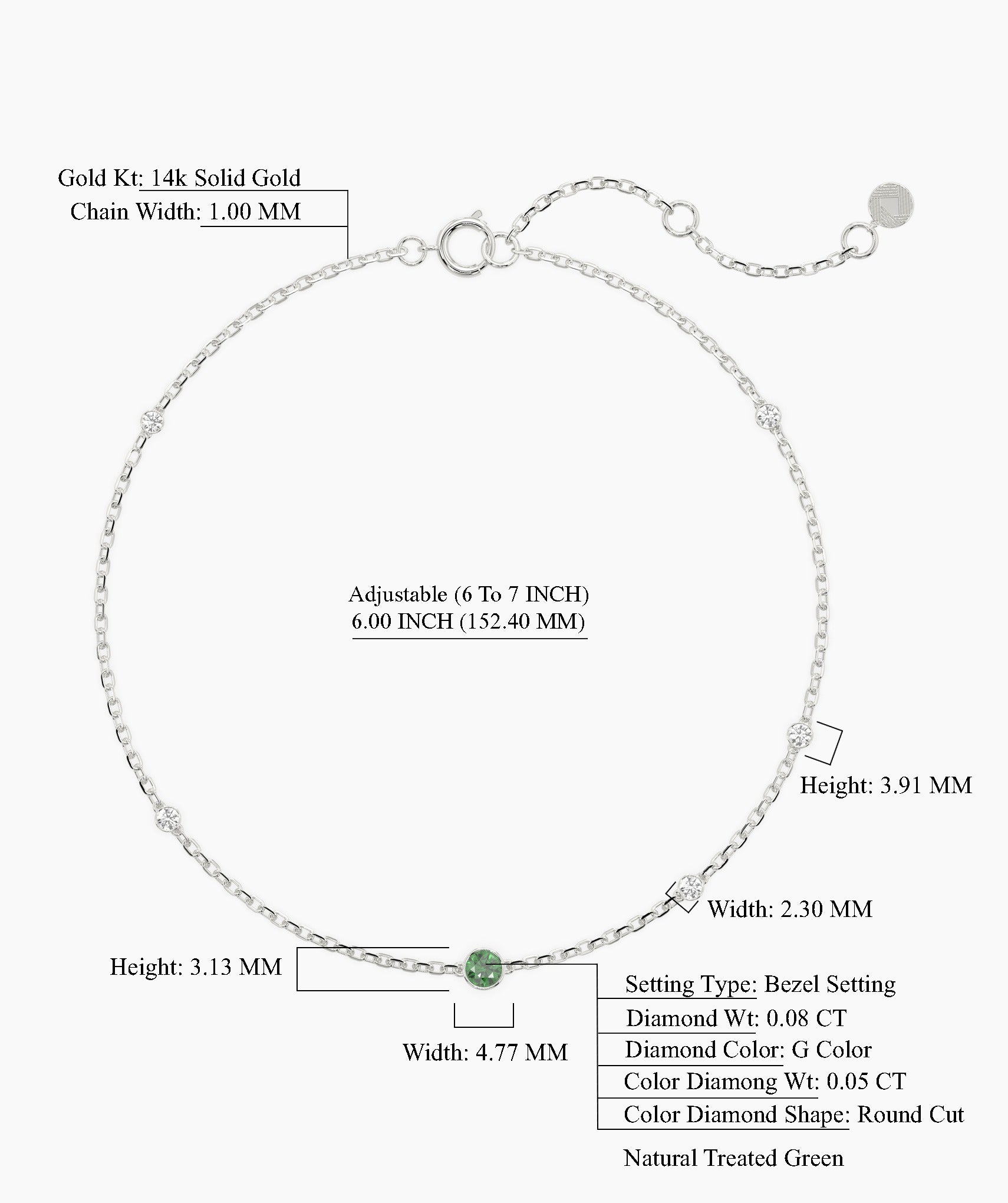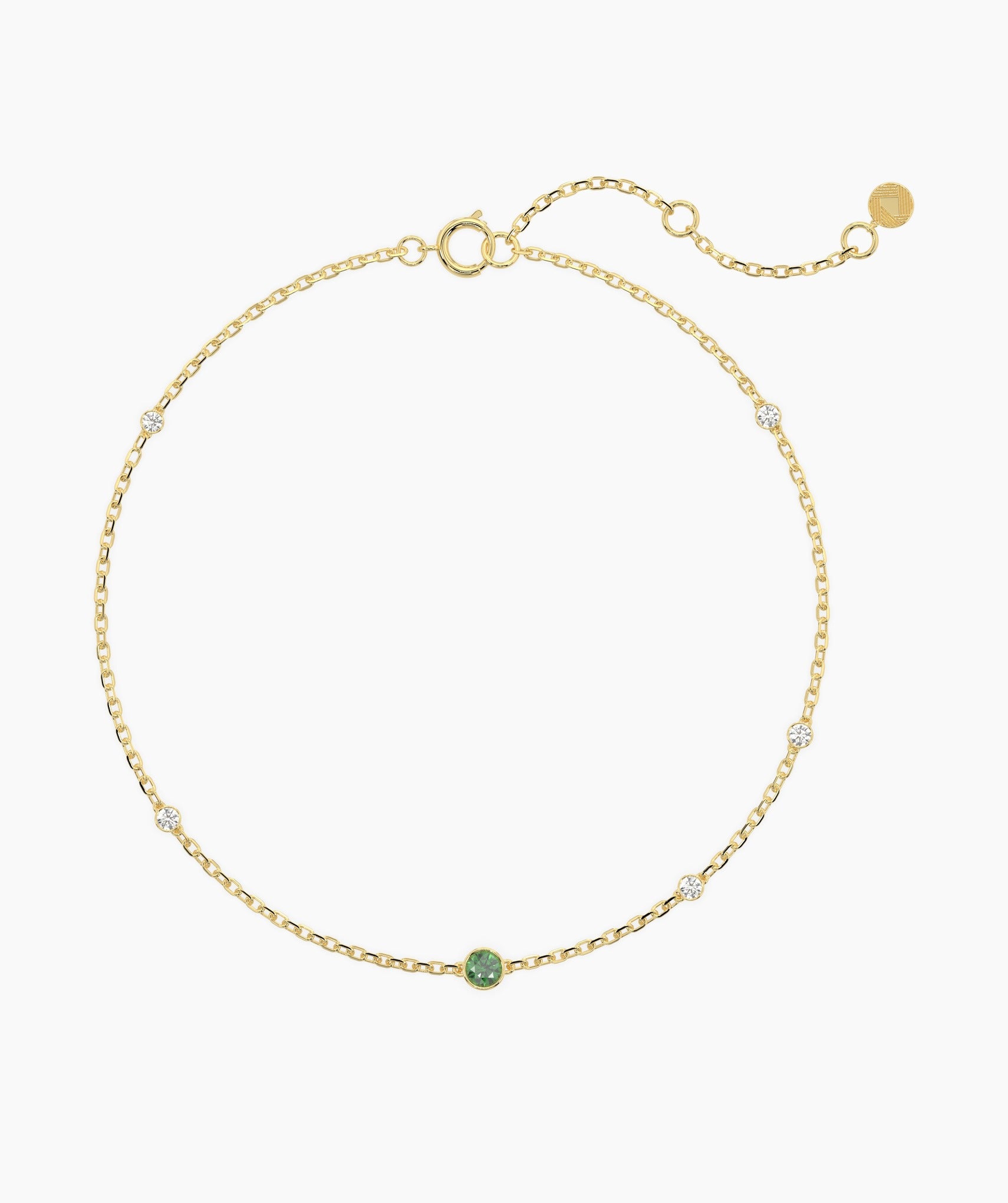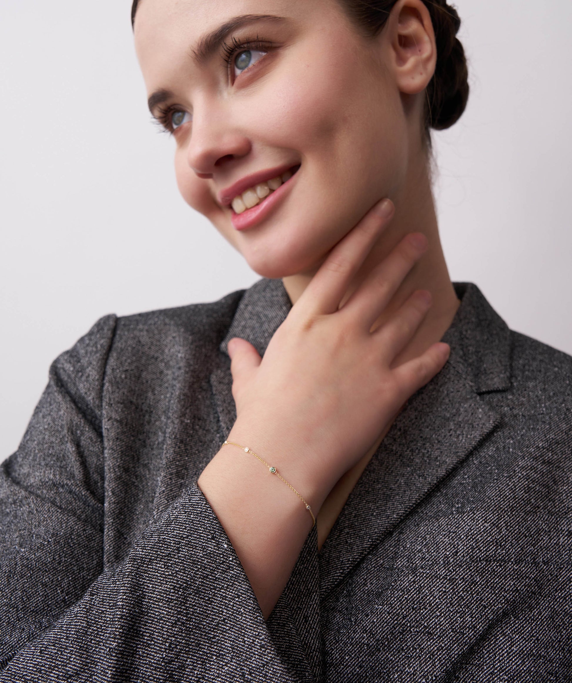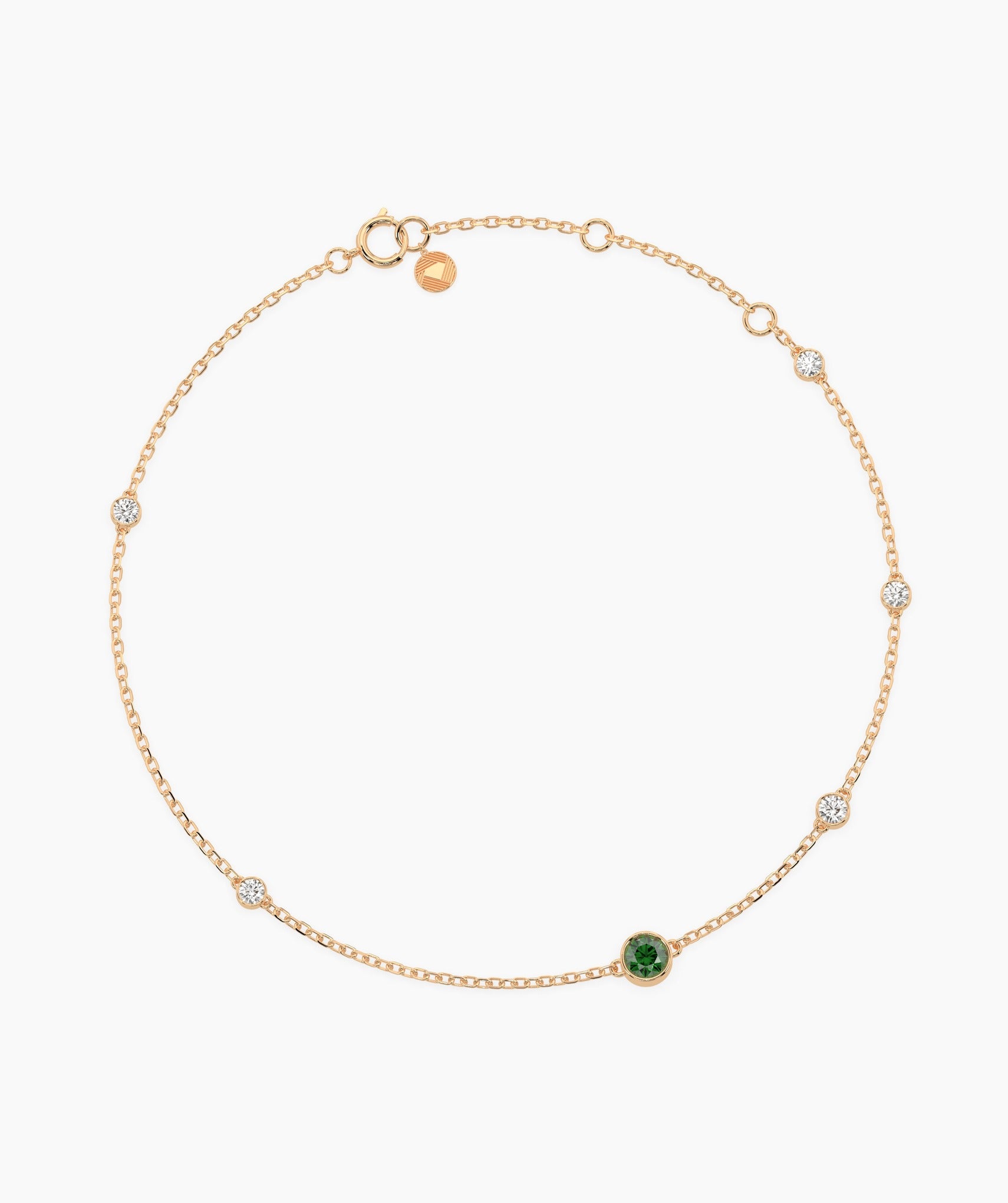 This dainty gold bracelet features bezel-set emerald and diamonds, offering a touch of luxury and sophistication.