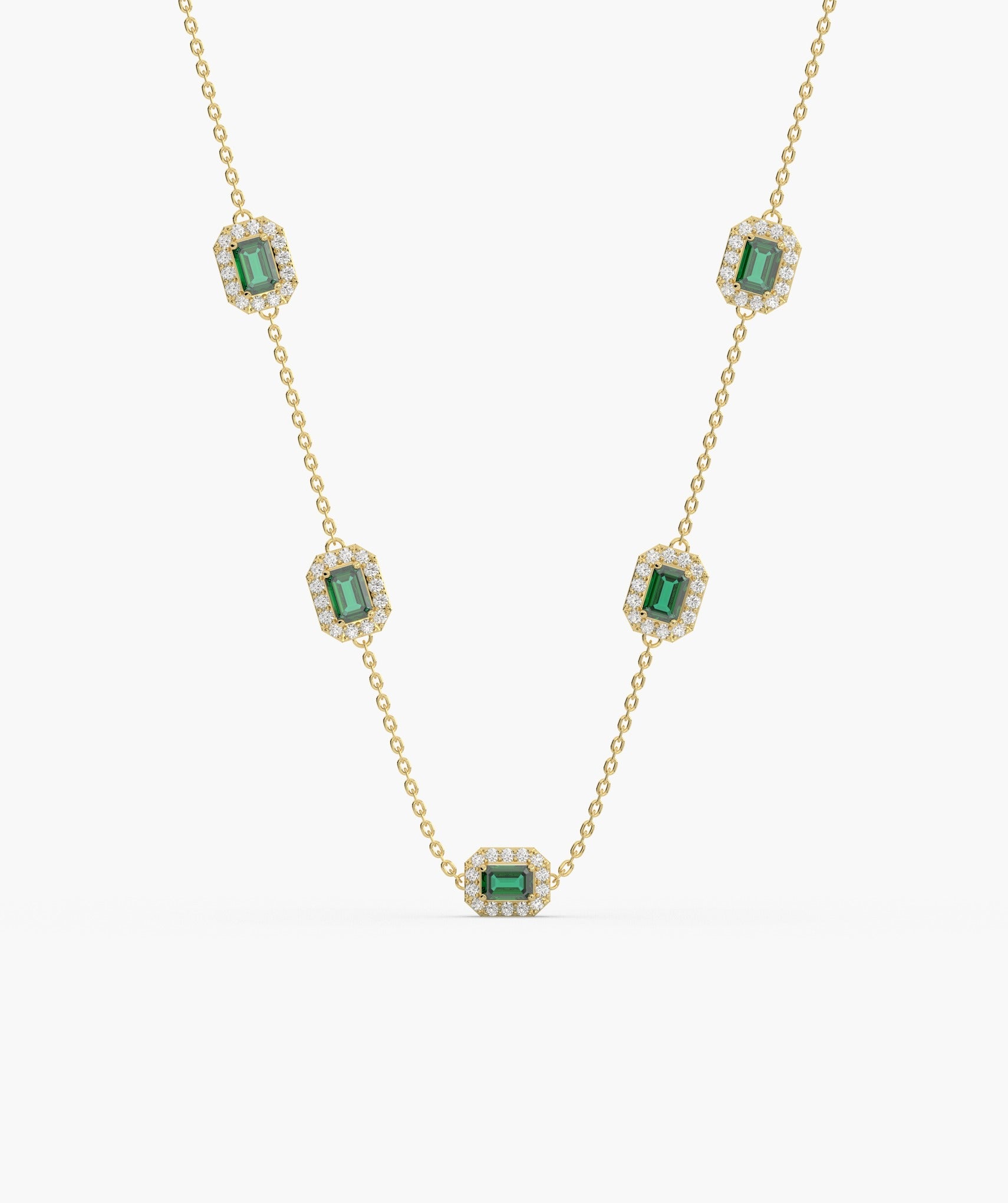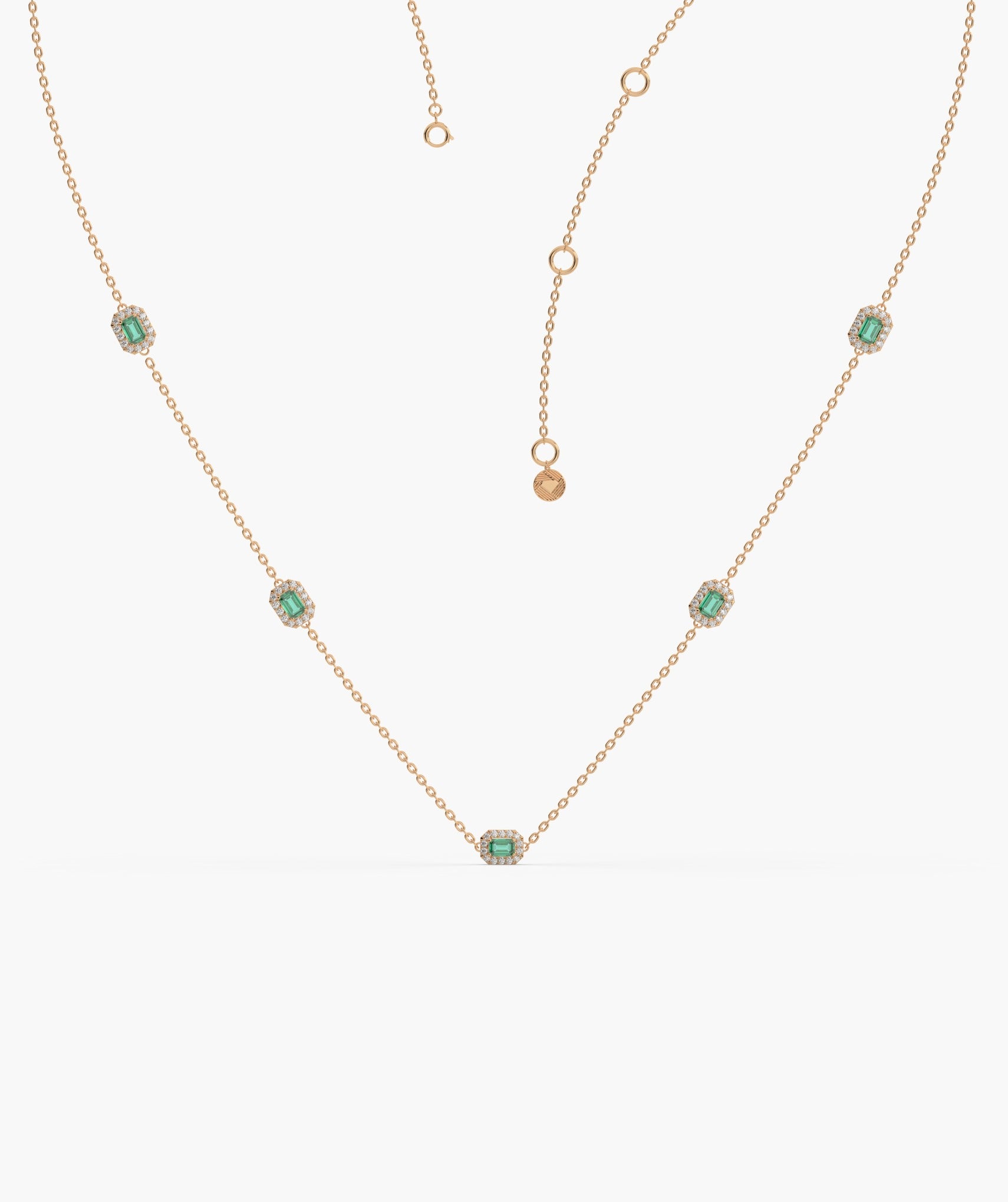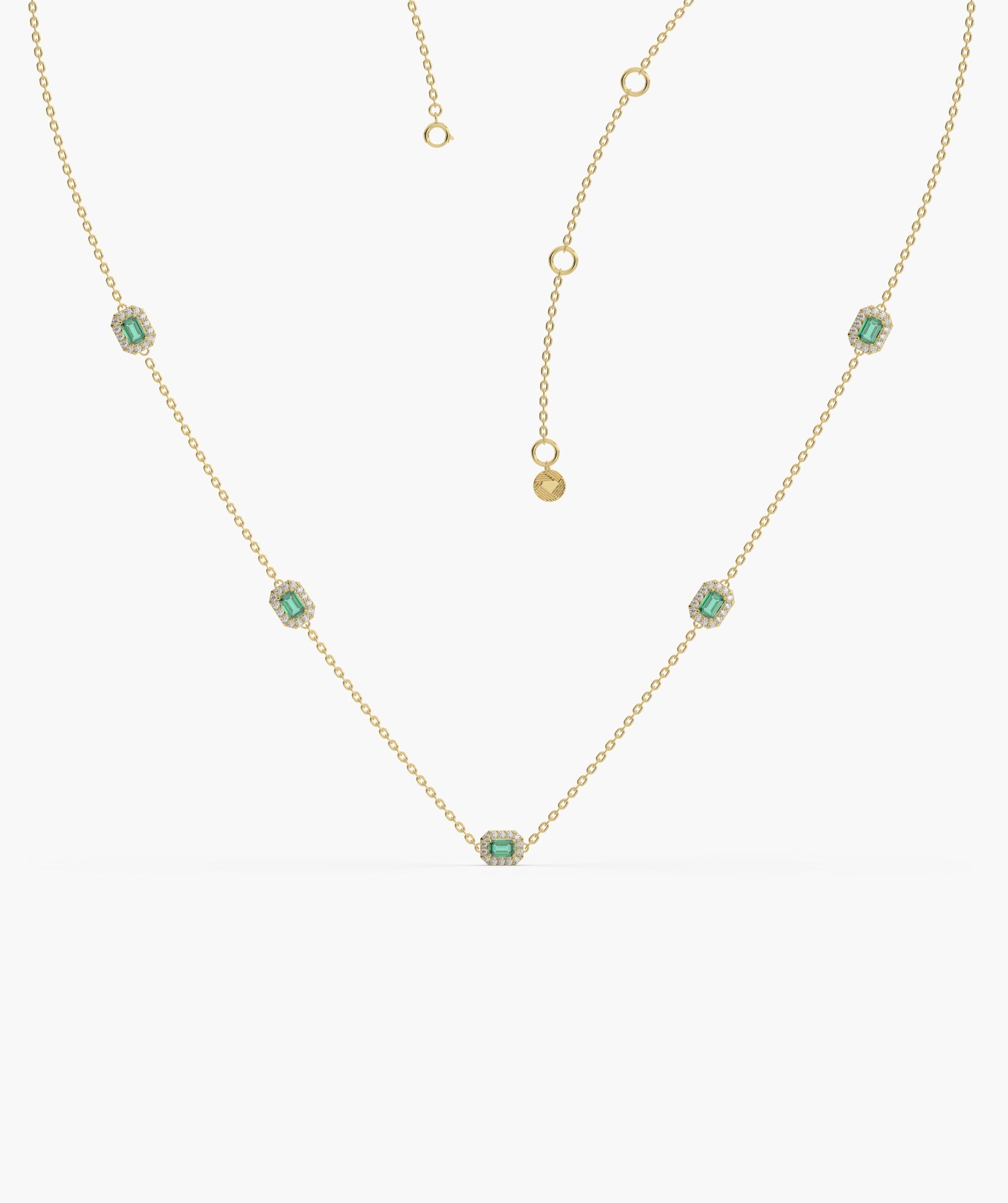 14K gold exquisite necklace features emerald cut diamonds set in diamond halos, evenly spaced along a delicate gold chain.