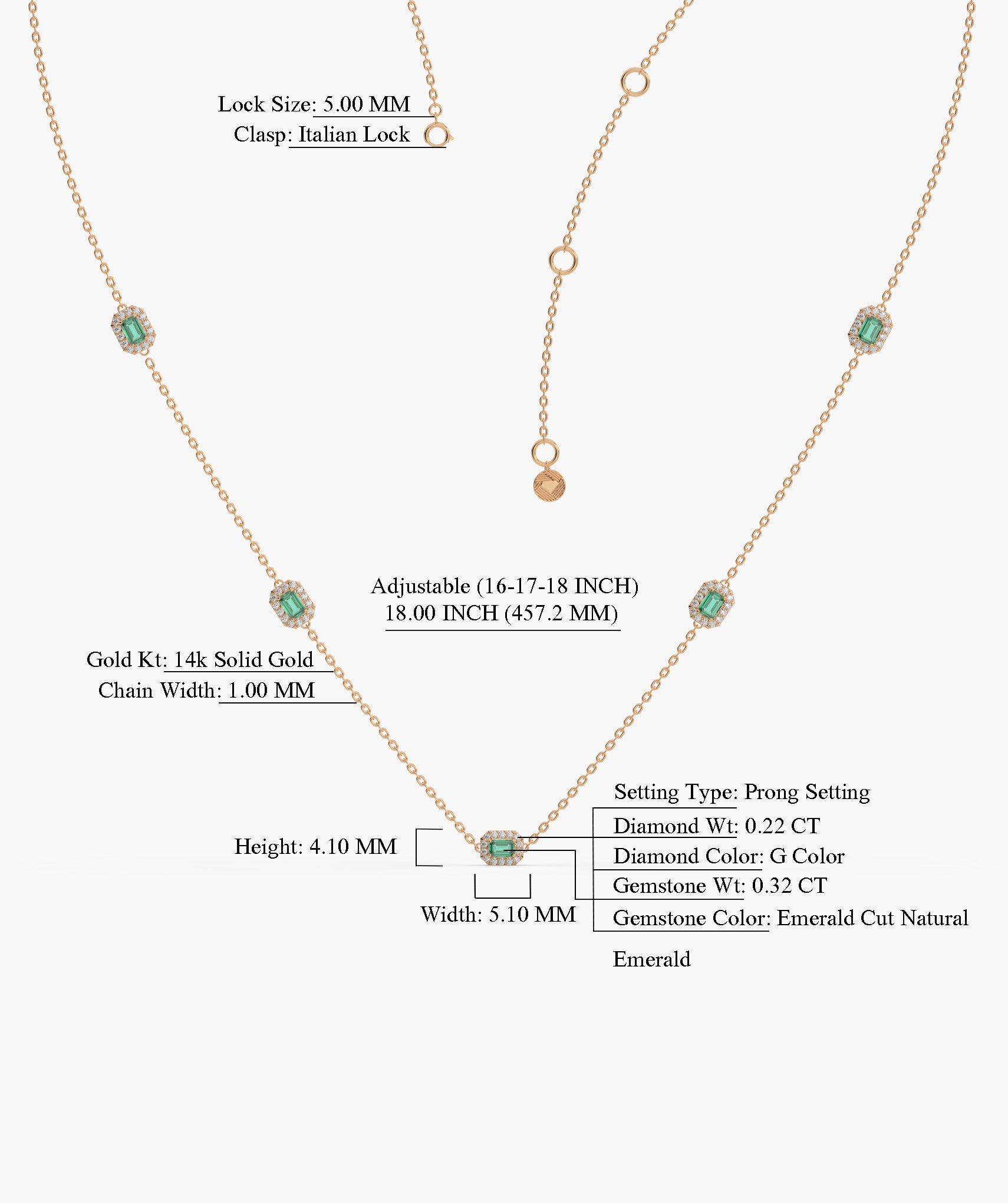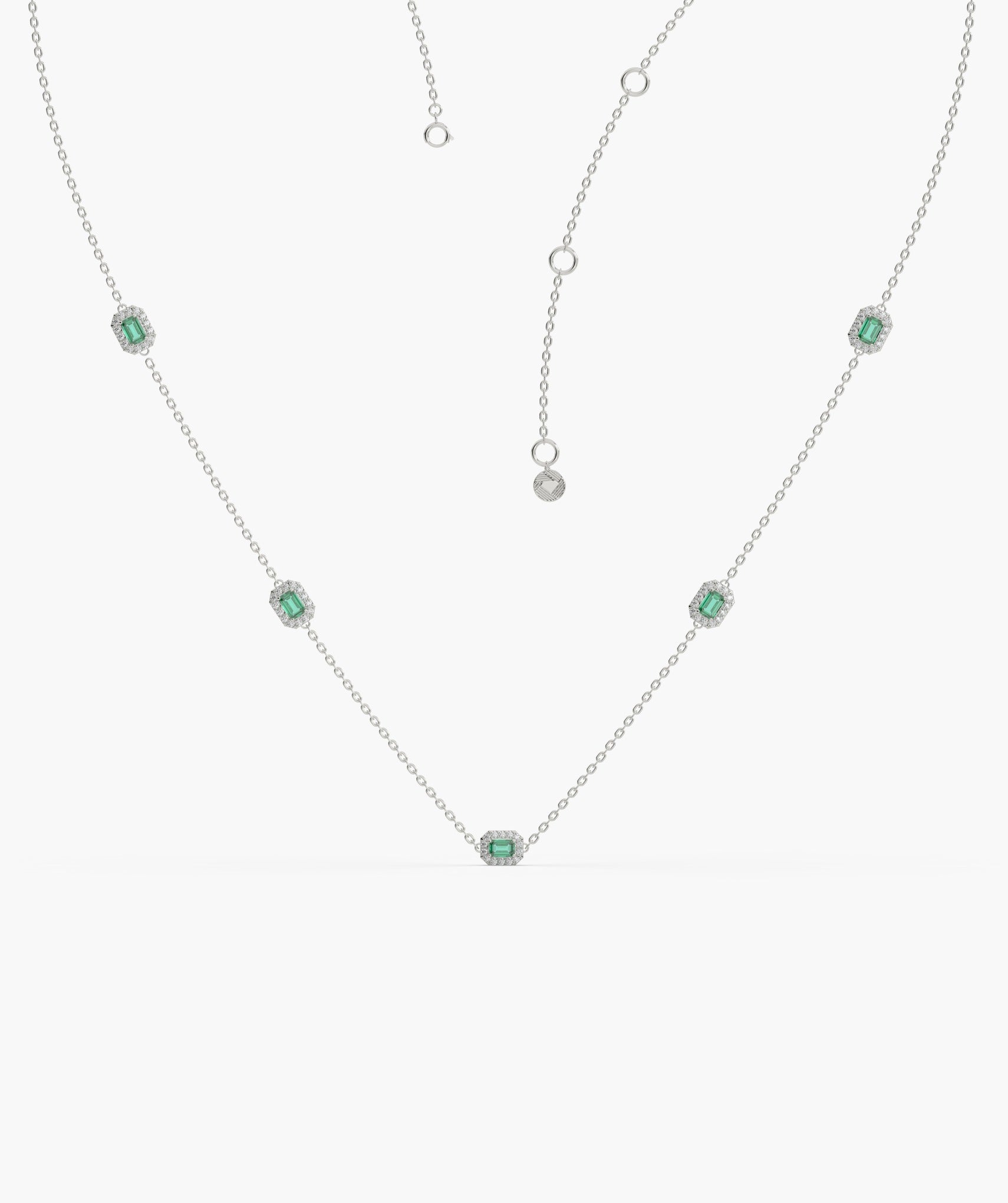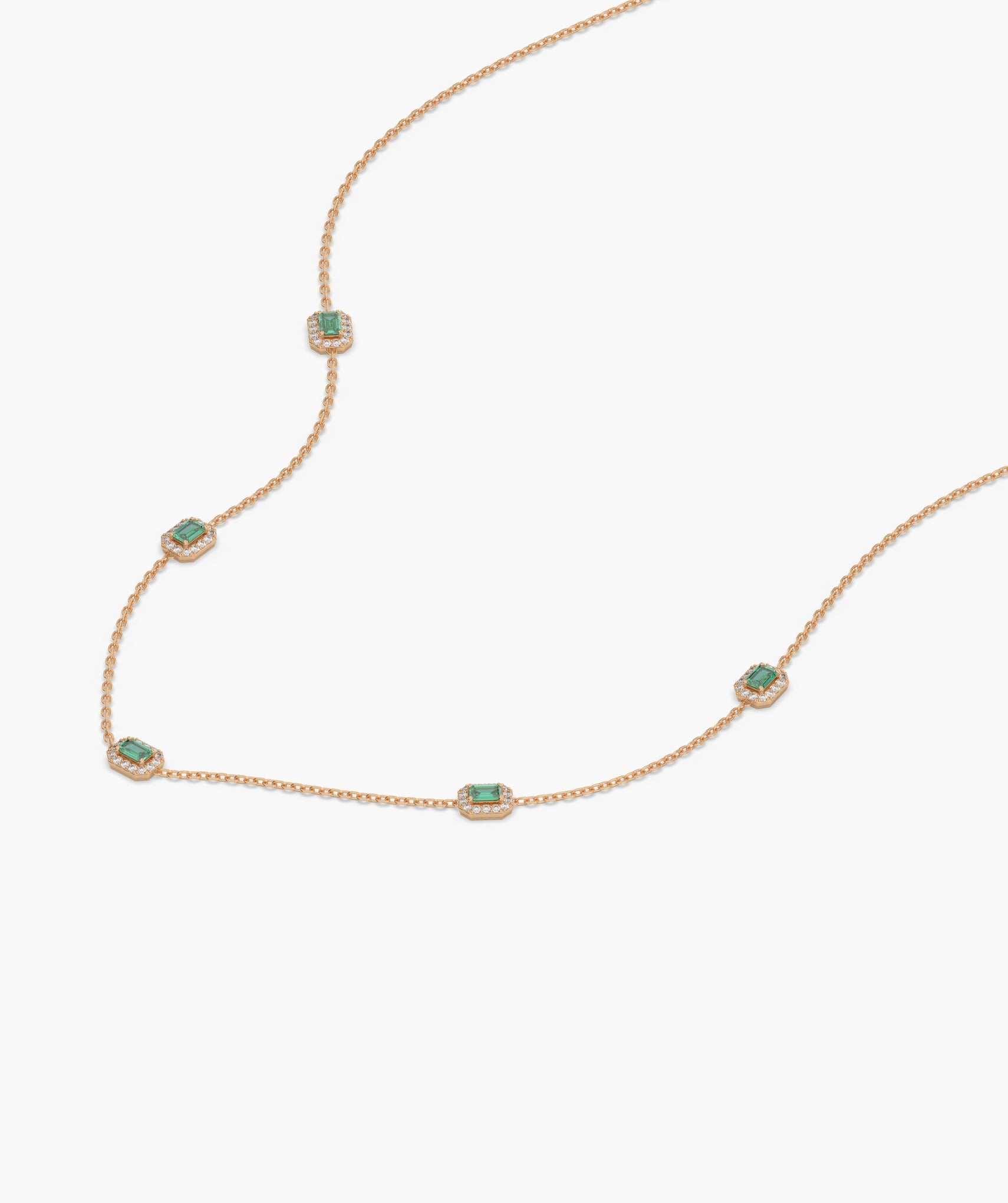 14K gold exquisite necklace features emerald cut diamonds set in diamond halos, evenly spaced along a delicate gold chain.