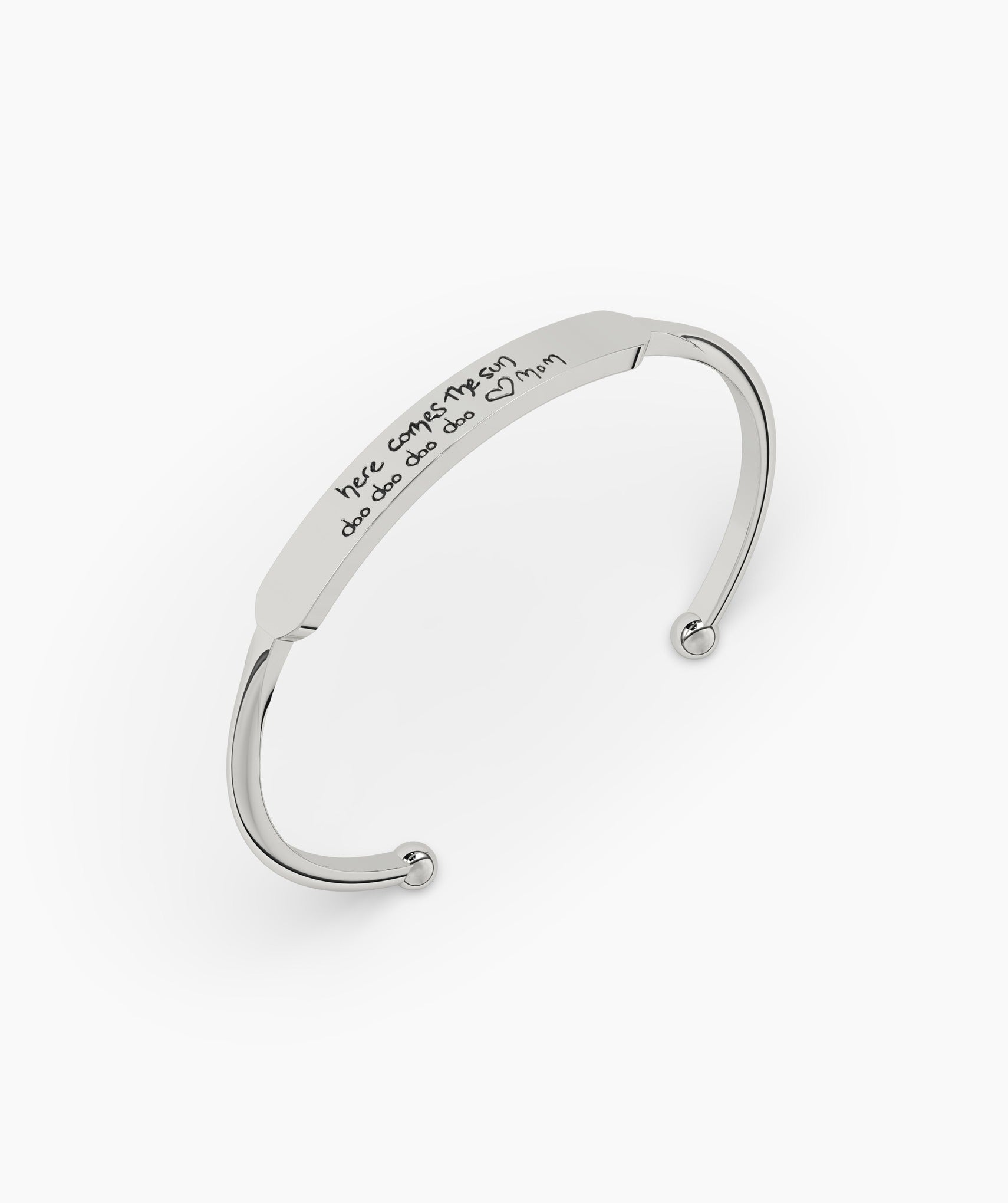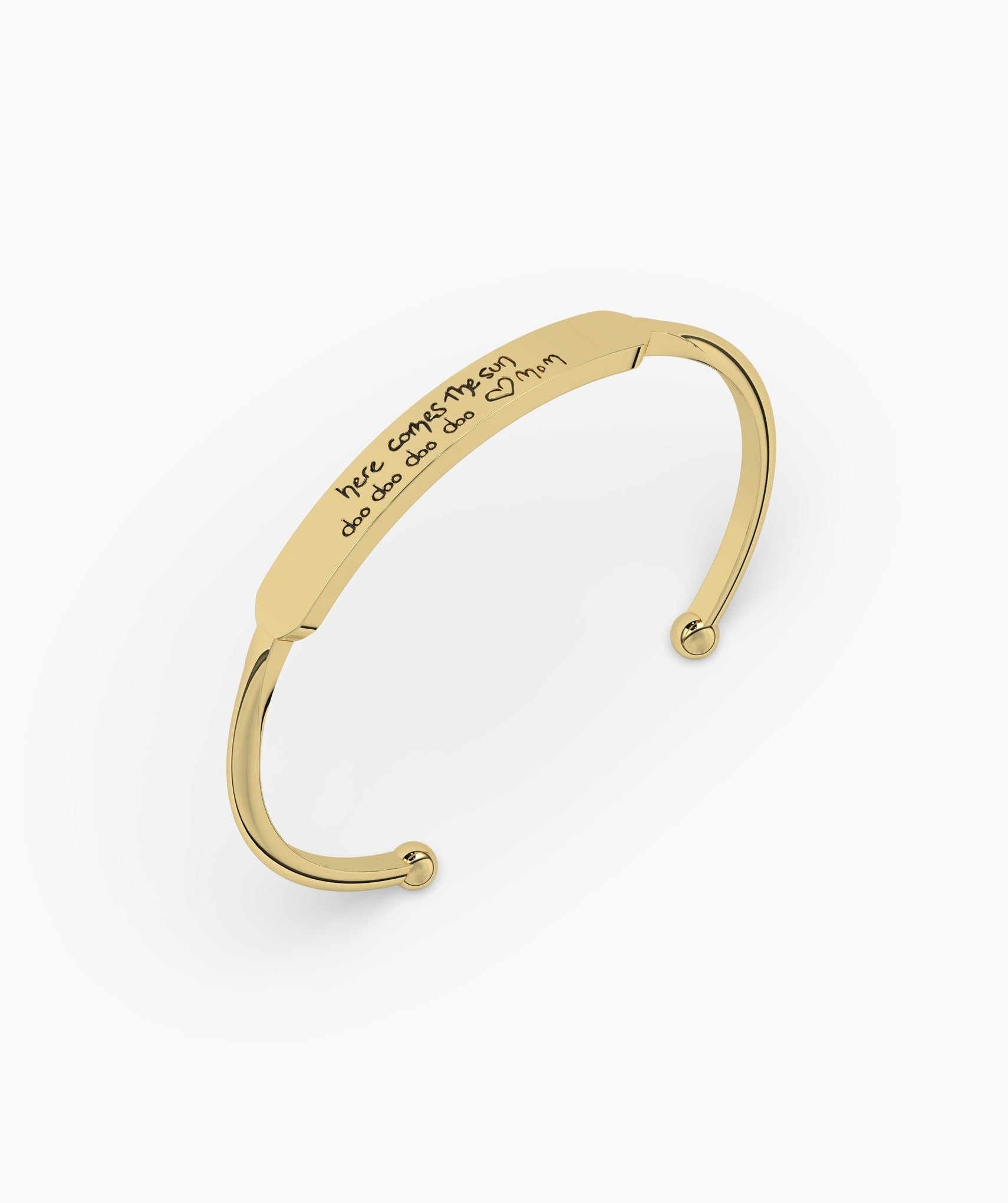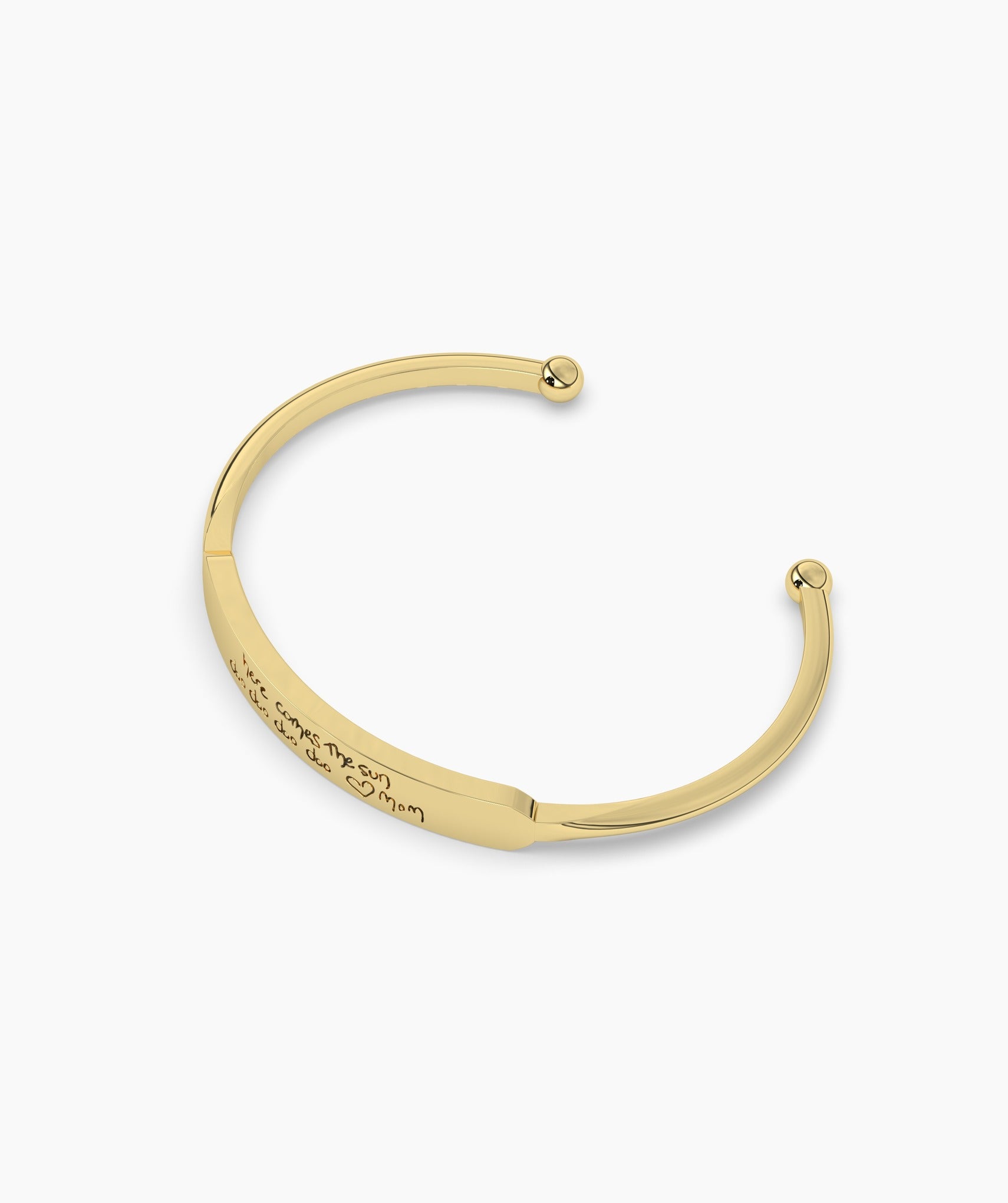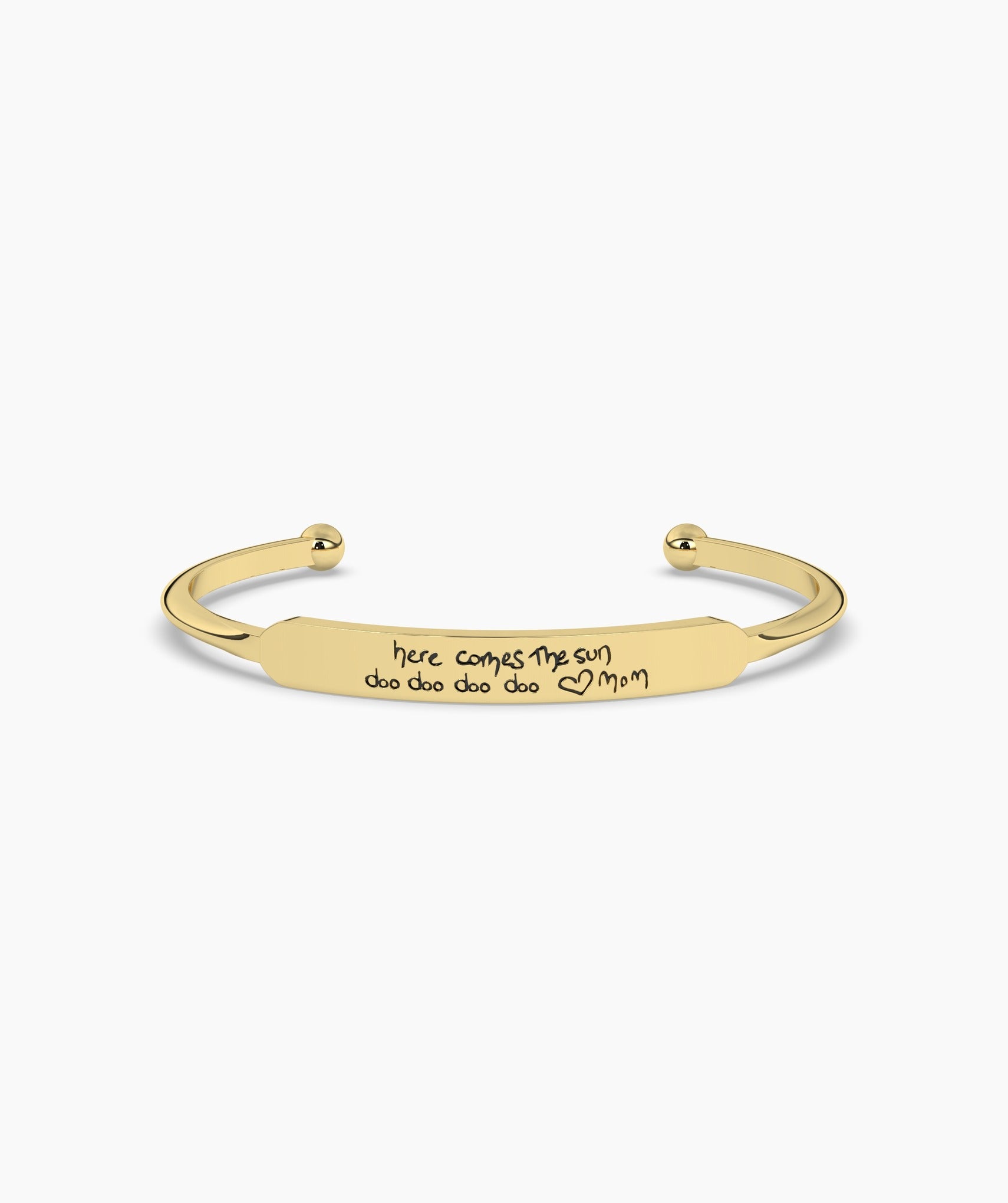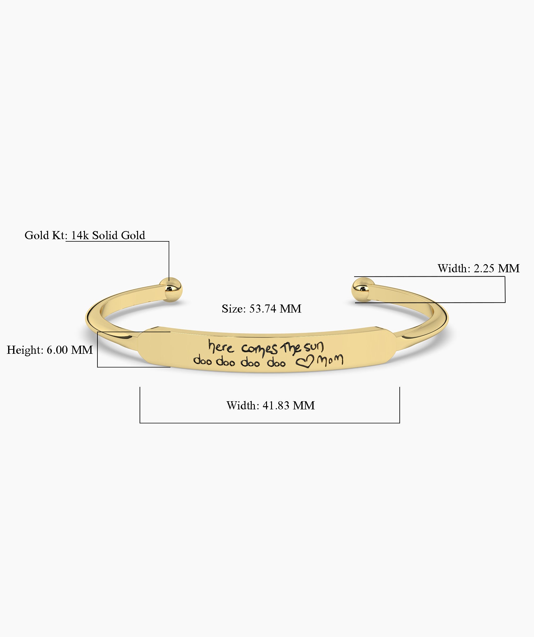 Timeless 14K gold cuff bracelet featuring a customizable engraved message, perfect for preserving heartfelt sentiments and personal memories.