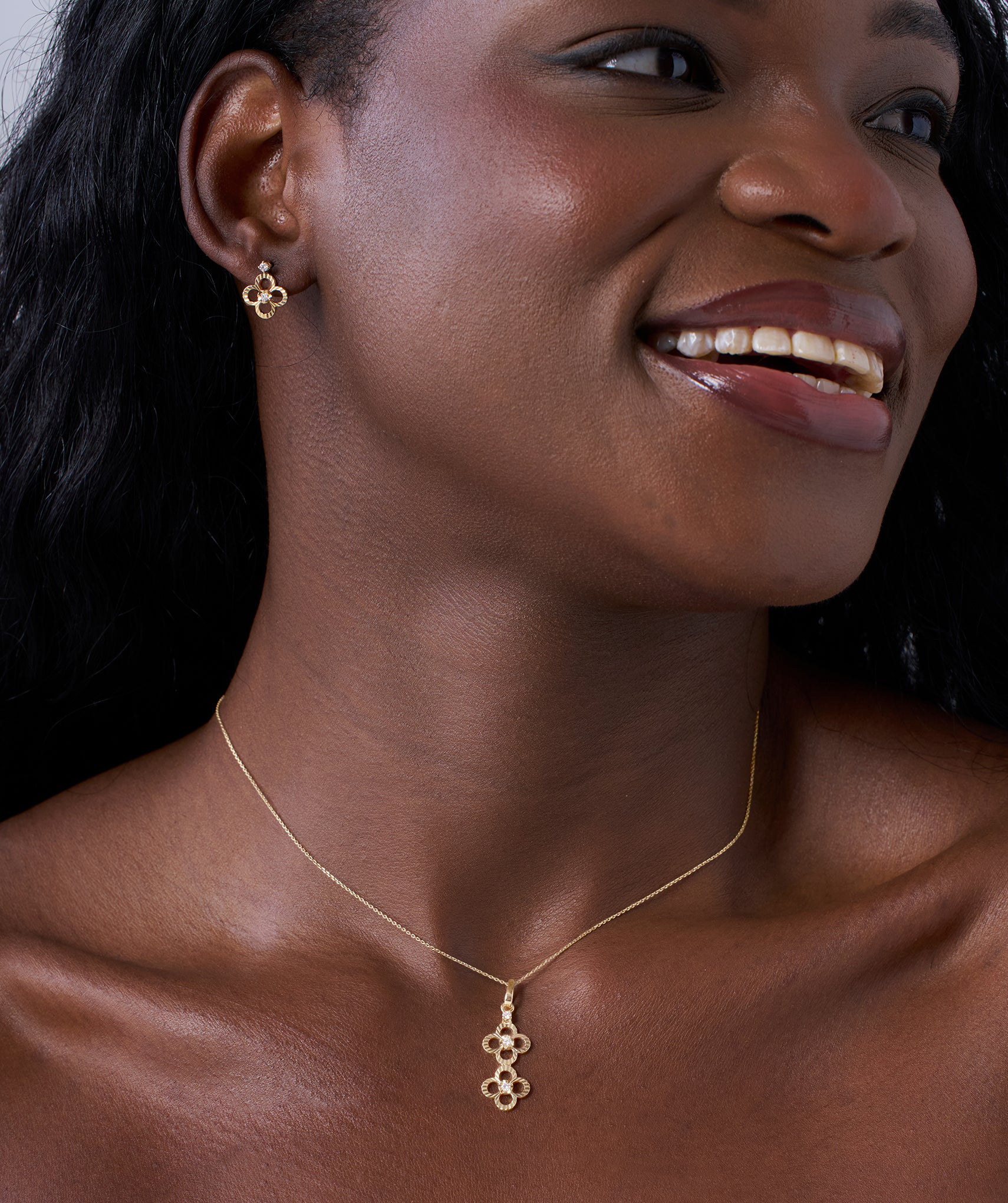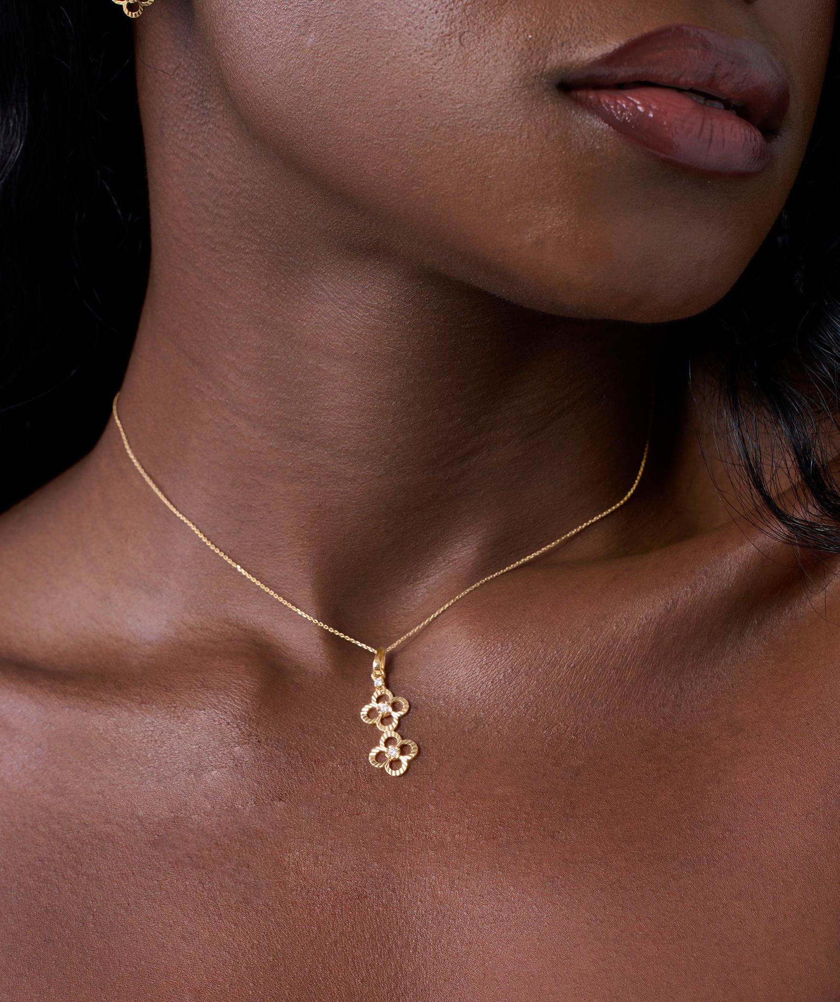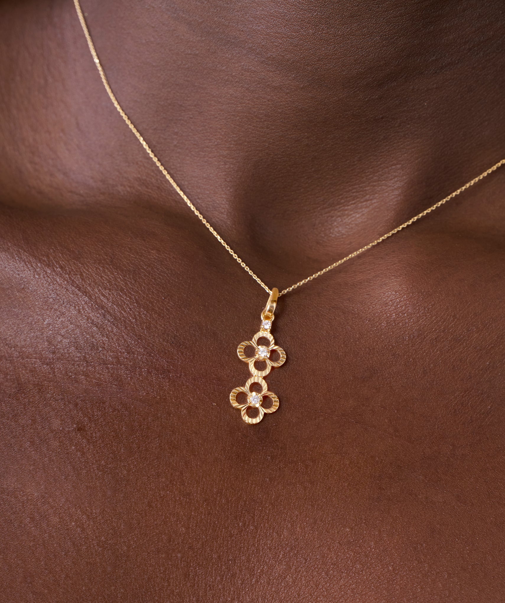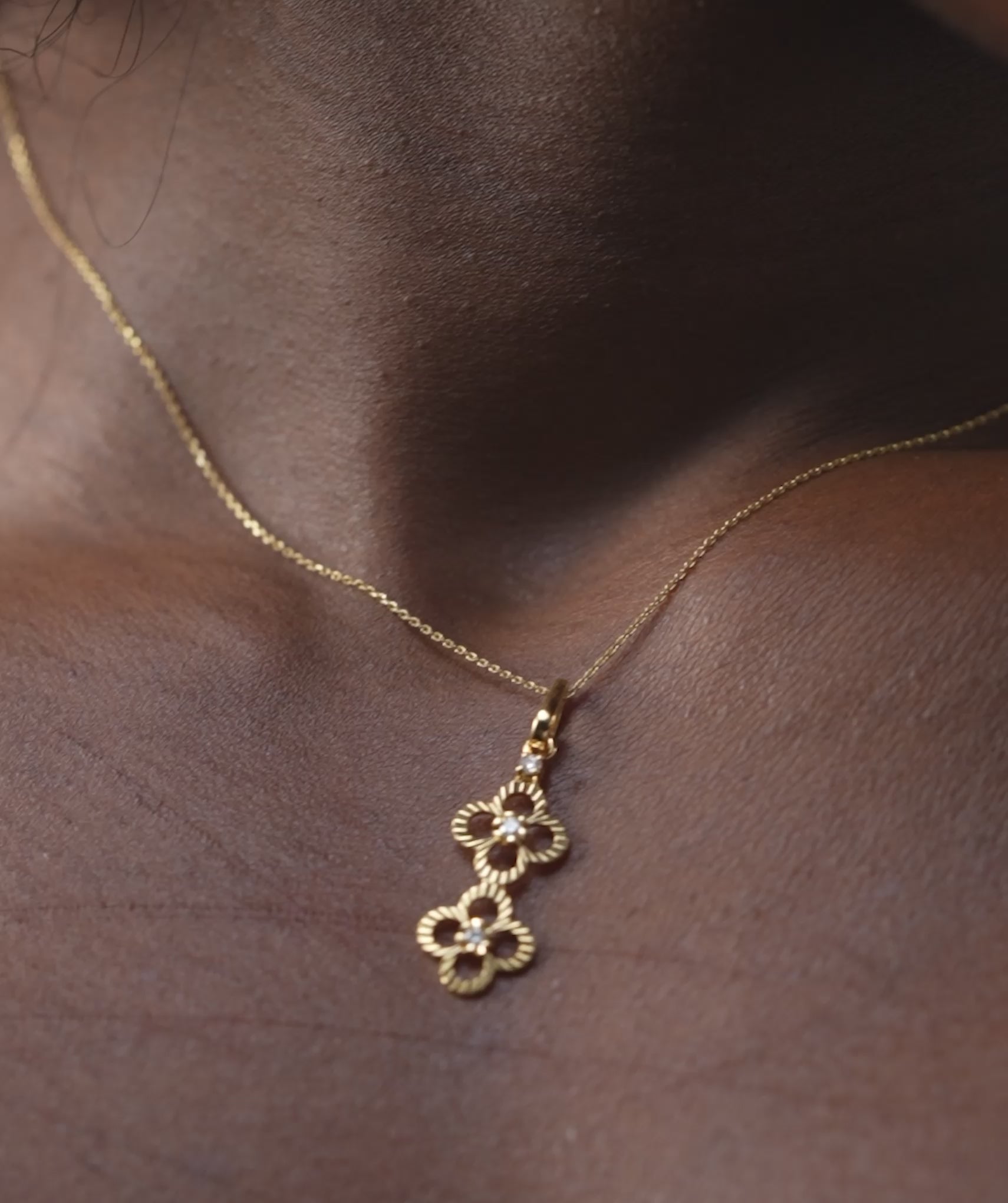 A graceful 14K solid gold necklace featuring a cascading floral pendant adorned with shimmering diamonds.